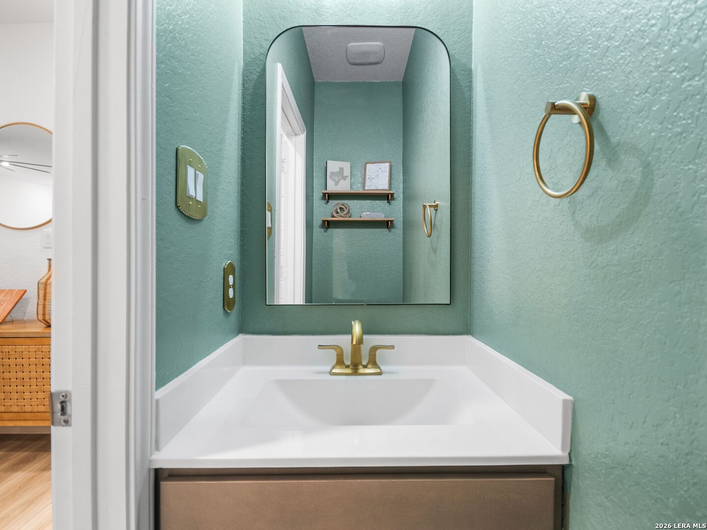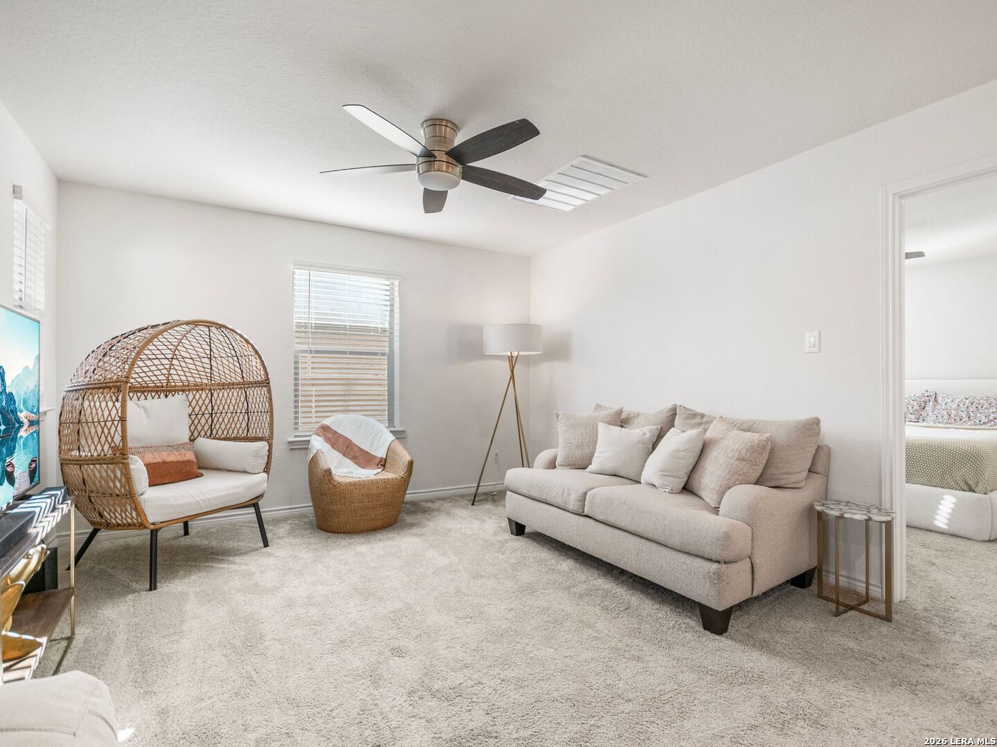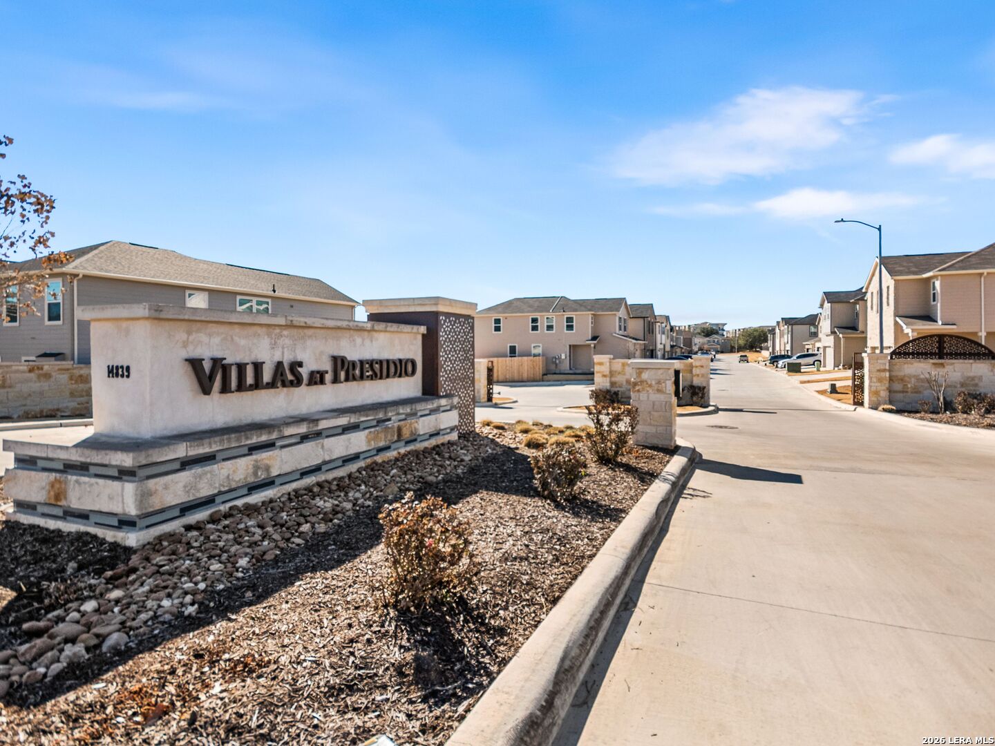 Located in the desirable Villas at Presidio, this beautifully upgraded home offers a refined blend of comfort, style, and functionality. Thoughtfully enhanced with over $30,000 in builder upgrades, the residence showcases elegant finishes and quality details throughout. Interior features include luxury vinyl plank flooring throughout the main living areas, ceramic tile in the laundry room, and carpet in all bedrooms and the loft. Architectural details such as wrought-iron stair and loft railings, 2-inch faux wood blinds, ceiling fans, and a striking custom front door add warmth and sophistication. The upgraded kitchen is appointed with Silestone countertops and enhanced cabinetry, with additional cabinetry extending into the laundry room for added storage and convenience. The primary suite offers a double vanity, 42-inch shower, walk-in closet, large linen closet, and a private water closet. The secondary bath features an extended vanity with knee space, providing added functionality and comfort. Everyday practicality is elevated with an overhead garage storage rack system, plumbing for a soft water system, and a full gutter system. Outdoor living is equally inviting with an extended rear patio, ideal for relaxing or entertaining. Smart-home readiness is seamless with CAT-6 wiring throughout and pre-wiring for indoor and outdoor cameras, offering modern connectivity and peace of mind. Ideally situated with quick access to La Cantera, The Rim, Six Flags, the Medical Center, Downtown San Antonio, and Boerne, this home delivers an exceptional combination of location, upgrades, and lifestyle.