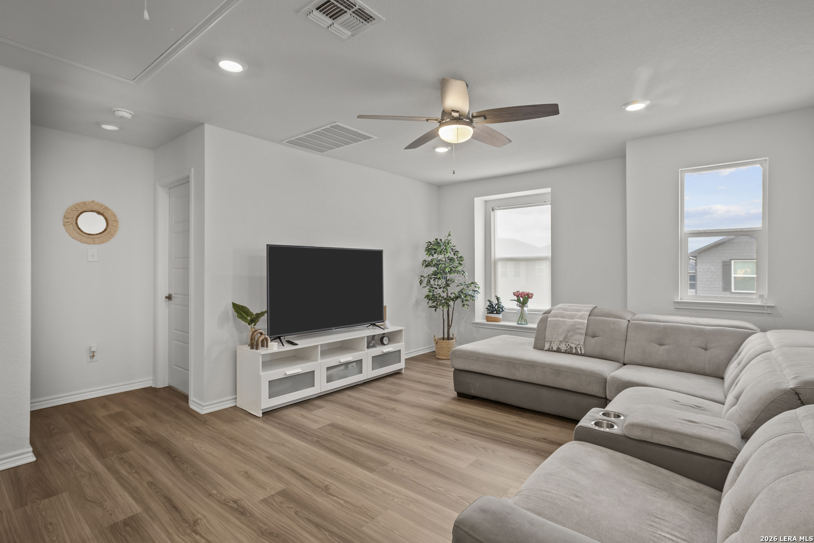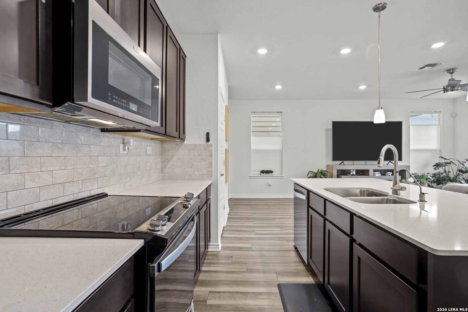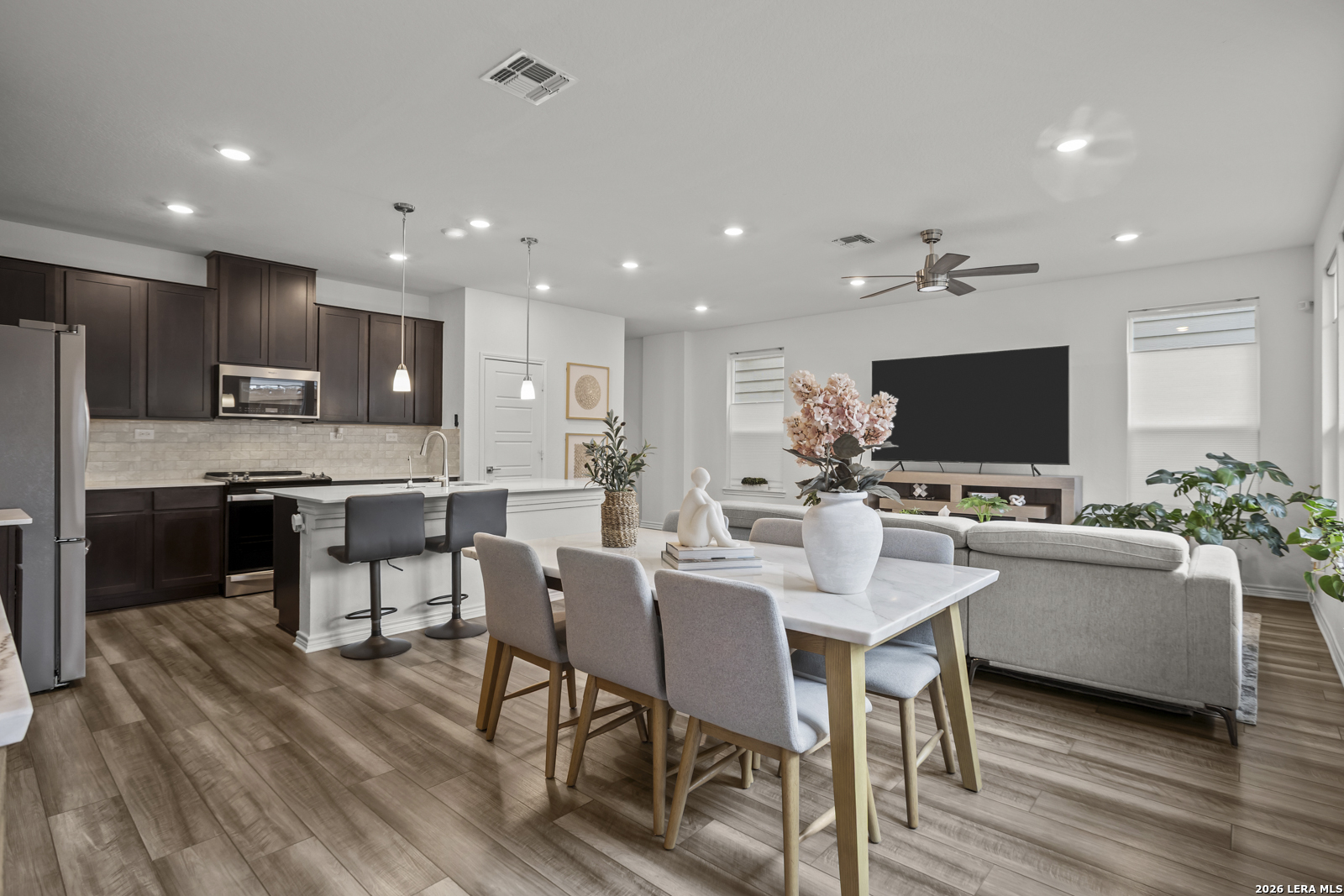 This stunning 5-bedroom, 3-bath home offers an inviting open floor plan designed for both comfort and entertaining, blending style and functionality throughout. The spacious living room flows seamlessly into the kitchen, creating a bright, open main living area perfect for gathering. The chef-inspired kitchen features Woodmont Dakota Shaker-style 42-inch upper cabinets, a sleek Daltile tile backsplash, Silestone countertops for durability and beauty, a large island, an extended breakfast bar, and stainless steel appliances. Upstairs, a versatile loft provides additional living space ideal for a game room, office, or media area. The oversized primary suite offers a relaxing retreat with a full ensuite bath that includes a double vanity and a walk-in shower. The home also includes a wireless security system and an automatic sprinkler system covering the front and side yards. Outside, enjoy a beautifully designed backyard with low-maintenance turf, perfect for year-round enjoyment. The impressive two-story stone exterior adds timeless curb appeal and completes this exceptional home.