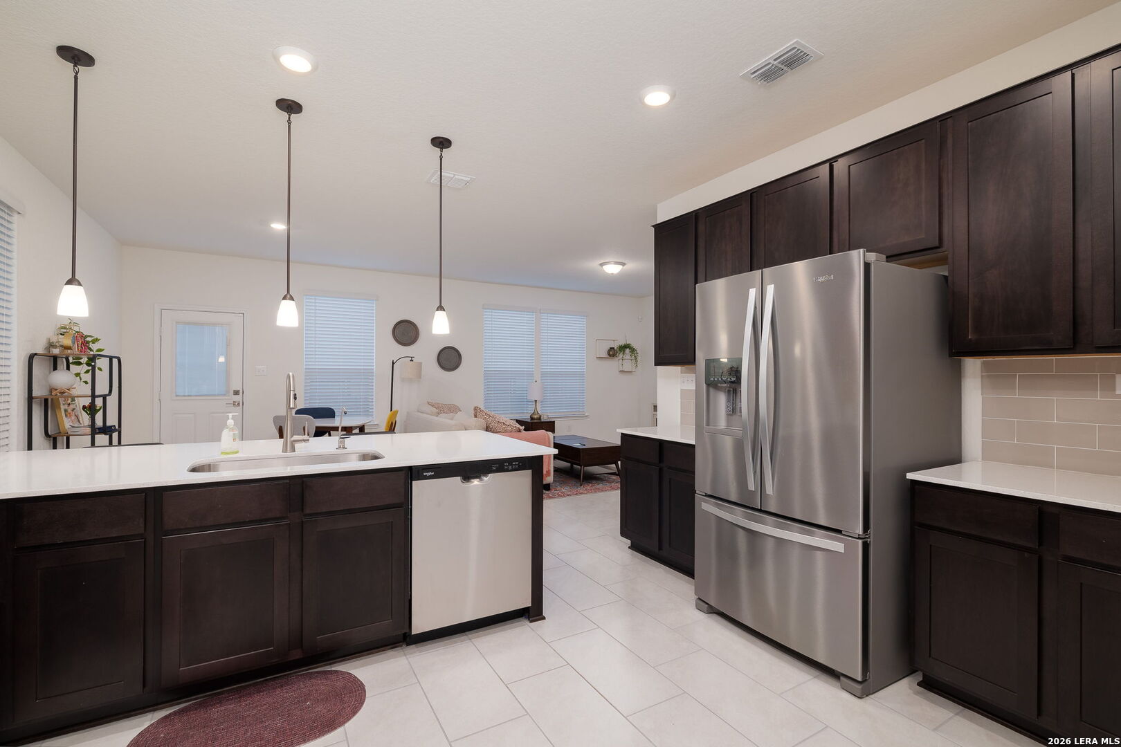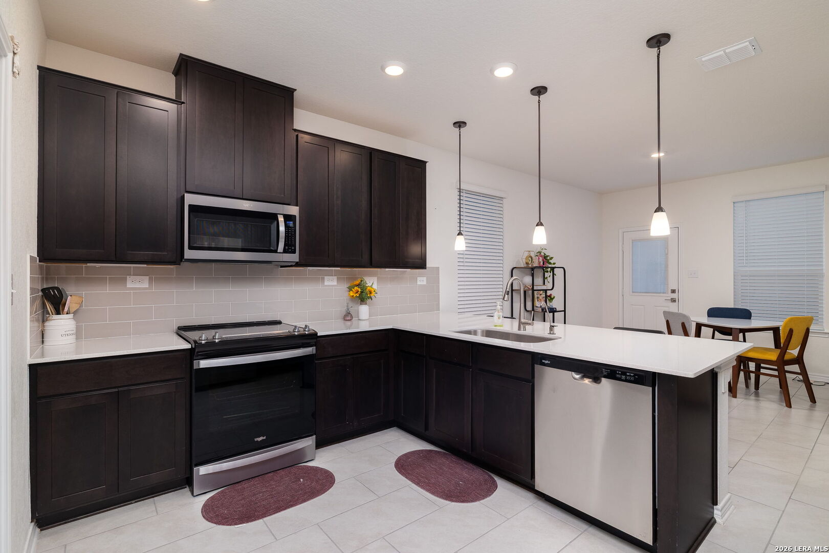 Welcome to this beautifully upgraded home featuring a Monterey-style entry and open floor plan. The kitchen boasts a Whirlpool 7-in-1 Air Fry Oven with microwave/hood, espresso Woodmont Dakota cabinets, Blanco Maple Silestone countertops, Emser Catch backsplash, and Moen Sleek high-arc faucet. The primary suite includes an extended vanity with knee space and a 42-inch tiled shower. Elegant finishes throughout include wrought iron stair rails, Kwikset Ladera hardware, and 2-inch faux wood blinds. Enjoy durable vinyl plank flooring in the bedrooms and loft, with oversized ceramic tile downstairs. Added conveniences such as a garage door opener, textured and painted garage, DuPure soft water system, and full gutter system enhance everyday living. A rear patio completes the home, offering a great space to relax or entertain. Move-in ready with both style and practicality, this home is a must-see.
