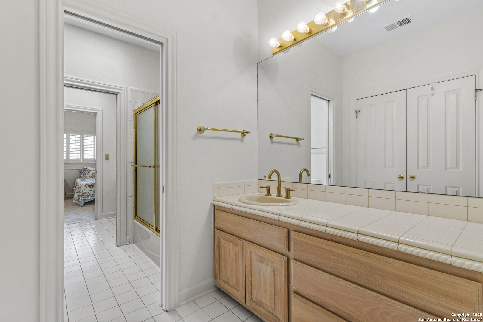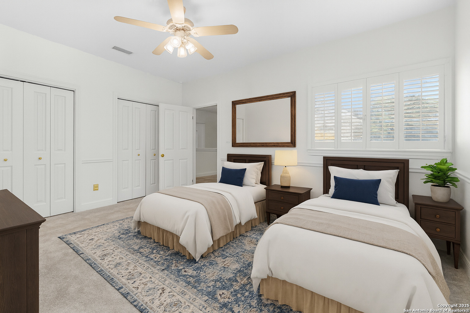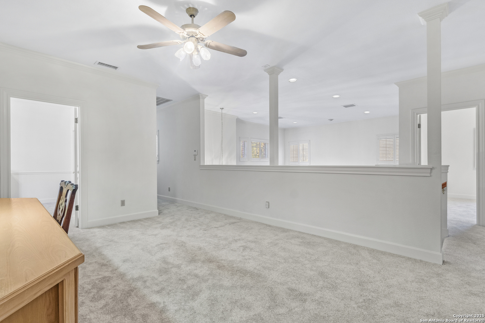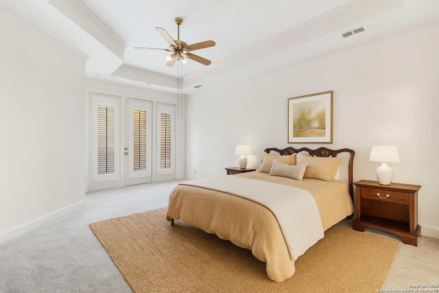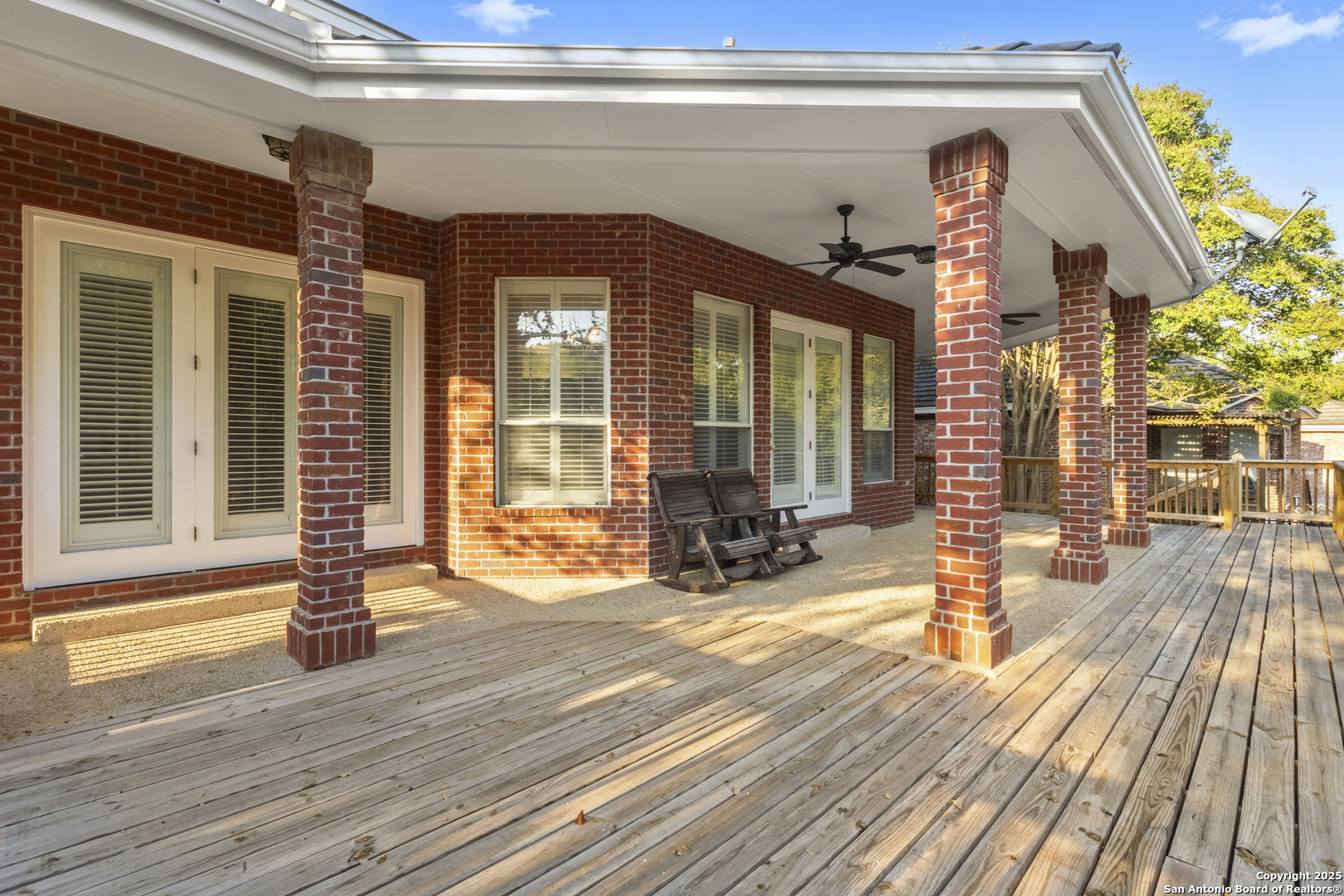 Located in the Garden Home section of Elm Creek, this two-story traditional offers space, privacy, and peace of mind in a secure, 24-hour guard-gated community. Featuring 4 bedrooms, 3.5 baths, 2 living areas, 2 dining areas, a loft with built-in desk, and a separate flex room with walk-in attic access and abundant storage. Primary suite downstairs with sitting area, patio access, and dual walk-in closets. Updates include new HVAC, new interior and exterior paint, new carpet, and a new side-entry garage door and opener. Hardwood floors, plantation shutters, high ceilings, and a gas fireplace add warmth and function. The kitchen offers an island, bar seating, and new stainless-steel appliances (refrigerator conveys). Covered patio and extended deck overlook a private greenbelt with no neighbors behind. Low-maintenance cul-de-sac lot ideal for lock-and-leave living. Quick access to major highways, the Medical Center, USAA, UTSA, Valero, La Cantera, The Rim, and San Antonio International Airport.