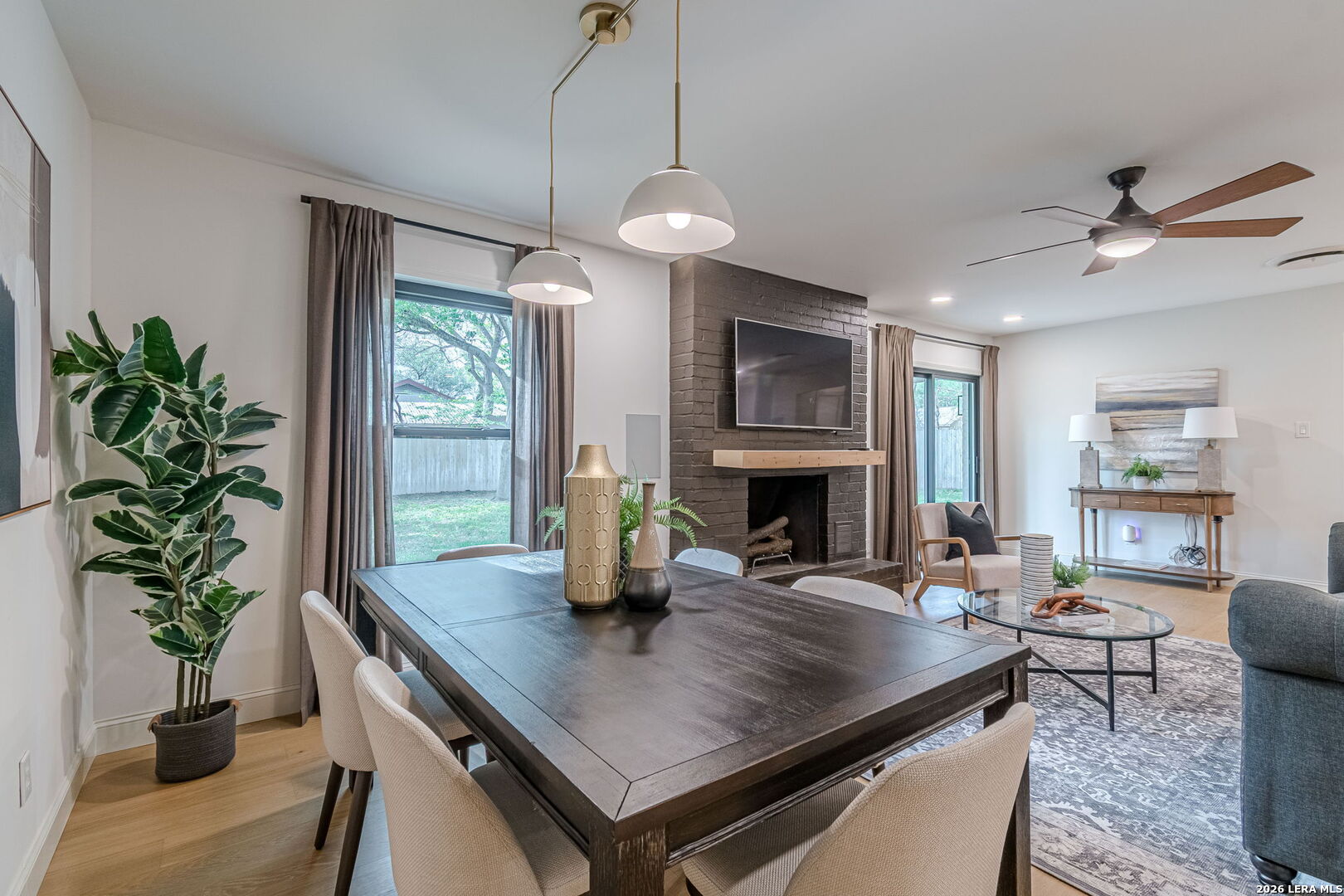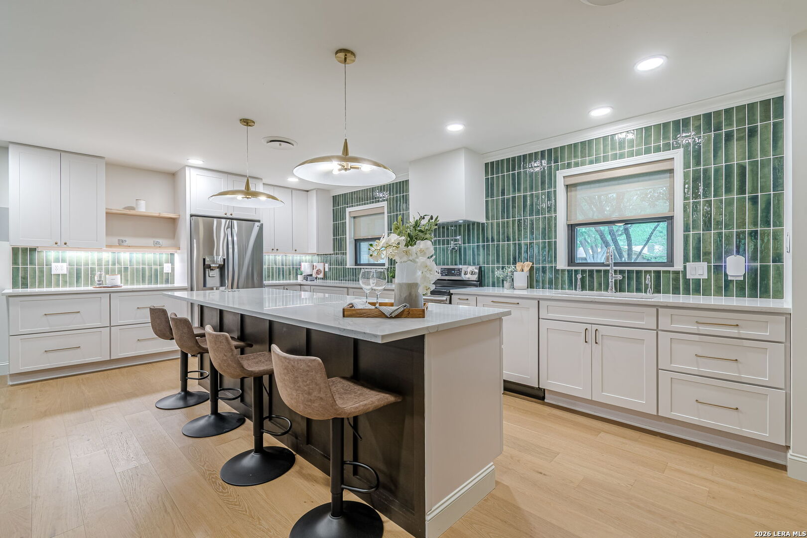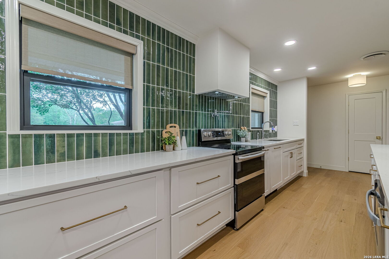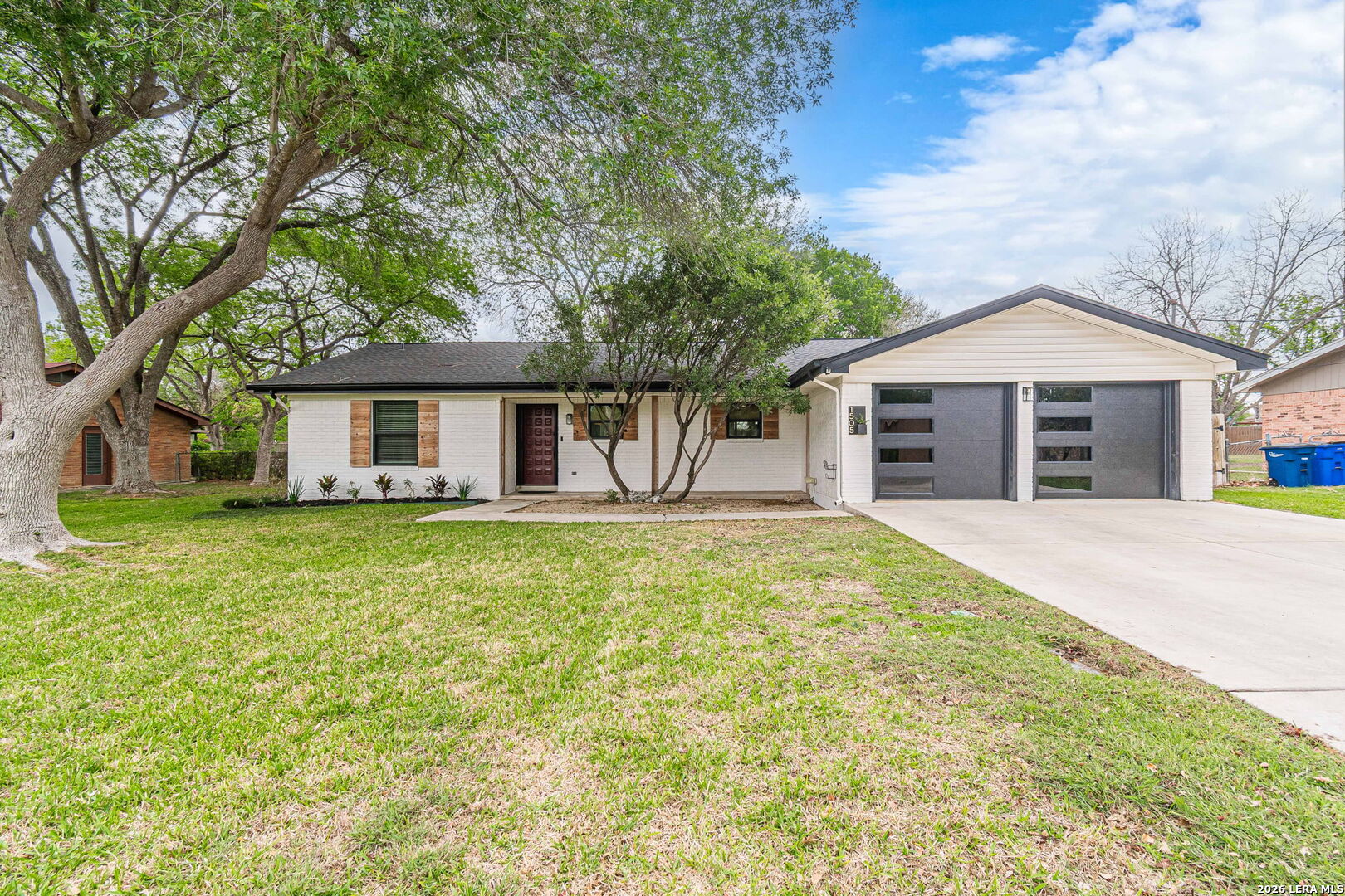 Welcome to this beautifully remodeled home nestled in a well established neighborhood in the heart of New Braunfels. Surrounded by mature trees and set along a quiet, wide, inviting street, this property offers both charm and convenience, just minutes from downtown, Schlitterbahn, Wurstfest, and a variety of dining, shopping, and entertainment options. During the summer months, enjoy floating the Guadalupe and Comal Rivers, a local favorite. Inside, the home has been thoughtfully updated with high end finishes and modern design throughout. Unlike many quick renovations, this home was remodeled with long term living in mind, showcasing a level of craftsmanship and attention to detail that stands apart. The stunning kitchen is a true centerpiece, featuring quartz countertops, a massive island with a built in under counter microwave, a freestanding range with double ovens, a cabinet panel dishwasher, an oversized stainless steel sink, and an abundance of cabinetry and storage drawers made of solid birch, all equipped with soft close features. A pot filler adds both style and function, while high end appliances have been thoughtfully selected throughout, complementing the clean and timeless design. An instant hot water feature at the kitchen sink adds everyday convenience. Waterproof engineered hardwood floors flow throughout the main living areas and primary bedroom, offering both durability and style, while the secondary bedrooms feature comfortable carpet. Built in surround sound and dimmable lighting throughout the main areas, all controllable with Alexa, enhance both comfort and ambiance. Additional upgrades include argon gas filled double pane windows for improved energy efficiency, new insulated garage doors with windows, and a Tesla wall charger in the garage. Washer and dryer are also included, adding even more value and convenience. Situated on a generously sized lot, the property provides plenty of outdoor space while maintaining the peace and quiet of an established community. This move in ready home blends modern updates with lasting quality, offering a level of finish and care that truly sets it apart in the neighborhood.