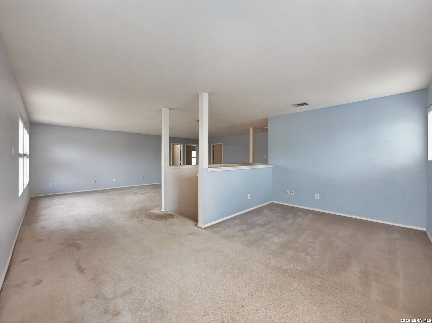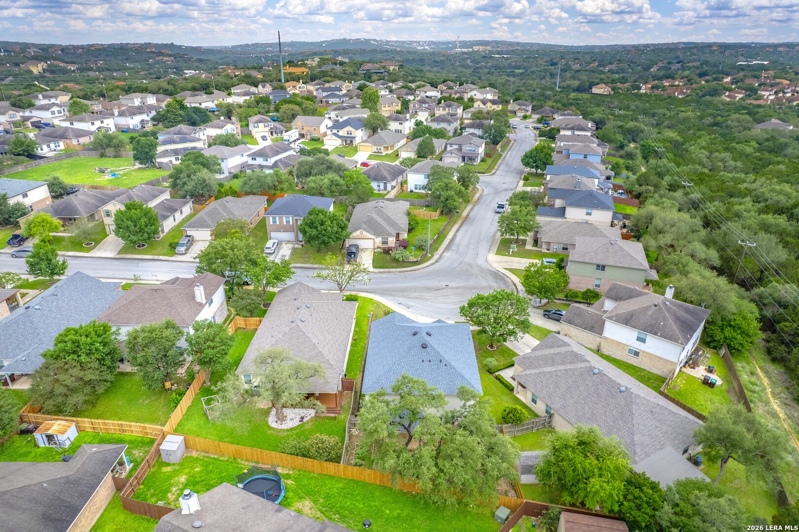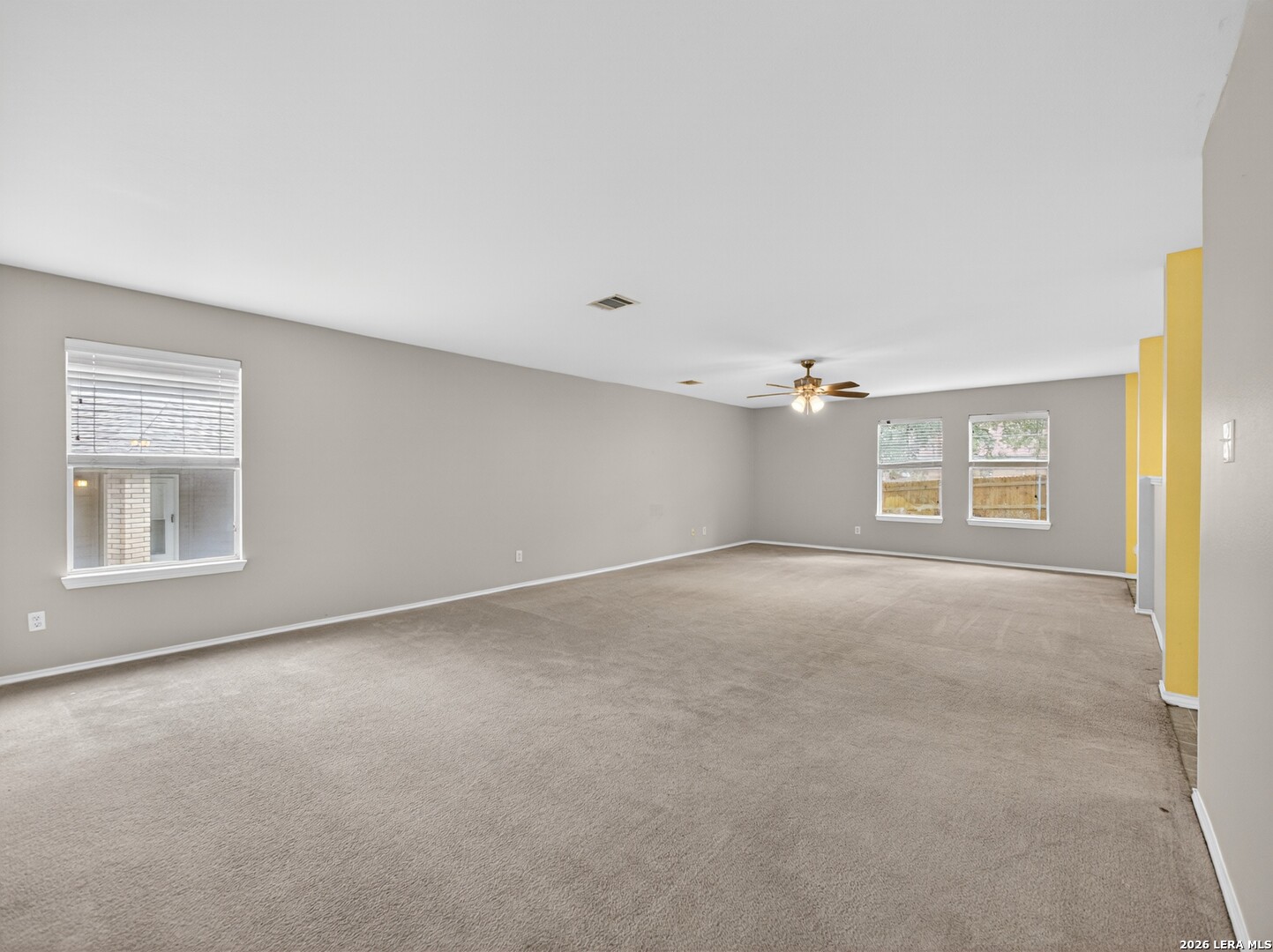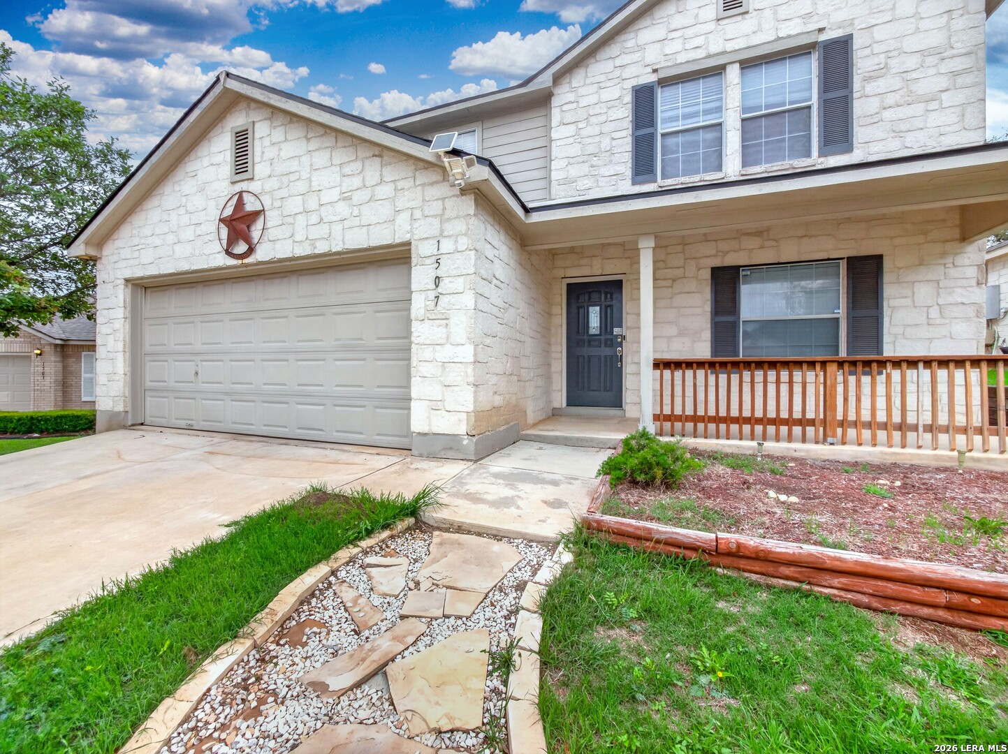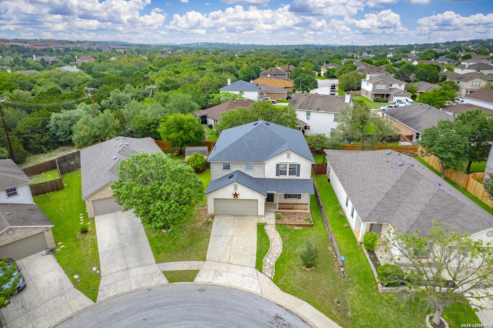 This 3-bedroom, 2.5-bathroom, two-story home offers 3,134 sq ft of functional living space and is situated in a cul-de-sac. The property features a rock-accented lower exterior, with siding throughout the remainder of the home, and a covered front-entry sitting area centered in front of the main window. The main level includes two spacious living areas, providing flexibility for everyday use and entertaining. The front living area offers space for a formal dining setup, while the kitchen includes an eat-in dining area. The kitchen is equipped with an electric stove/oven combination, microwave, and dishwasher. It also features laminate countertops, original light-colored wood cabinetry, and a large walk-in pantry that includes the laundry area. A half bathroom is located off the main living space on the first floor. Upstairs, all three bedrooms are located along with a loft area and an additional office, game room, or bonus space. The primary bedroom includes a tray ceiling with a ceiling fan and a large ensuite bathroom featuring a garden tub, separate walk-in shower, double vanity, and an oversized walk-in closet accessed through the bathroom. Each additional bedroom includes generous closet space, with one offering a sliding-door closet and the other a walk-in closet. The shared upstairs bathroom includes a tub/shower combination. The home includes tile flooring in wet areas, with carpet throughout the remaining living spaces. The carpet is in poor condition and will require full replacement due to visible staining and significant pet-related damage. Additional features include a 2-car garage, covered backyard porch, and fencing on three sides, with two sides recently replaced. Major system updates include a 2023 A/C unit, a 2019 water heater, and a brand-new 50-year roof installed in 2025. And just a few minutes away from Specht Elementary School.