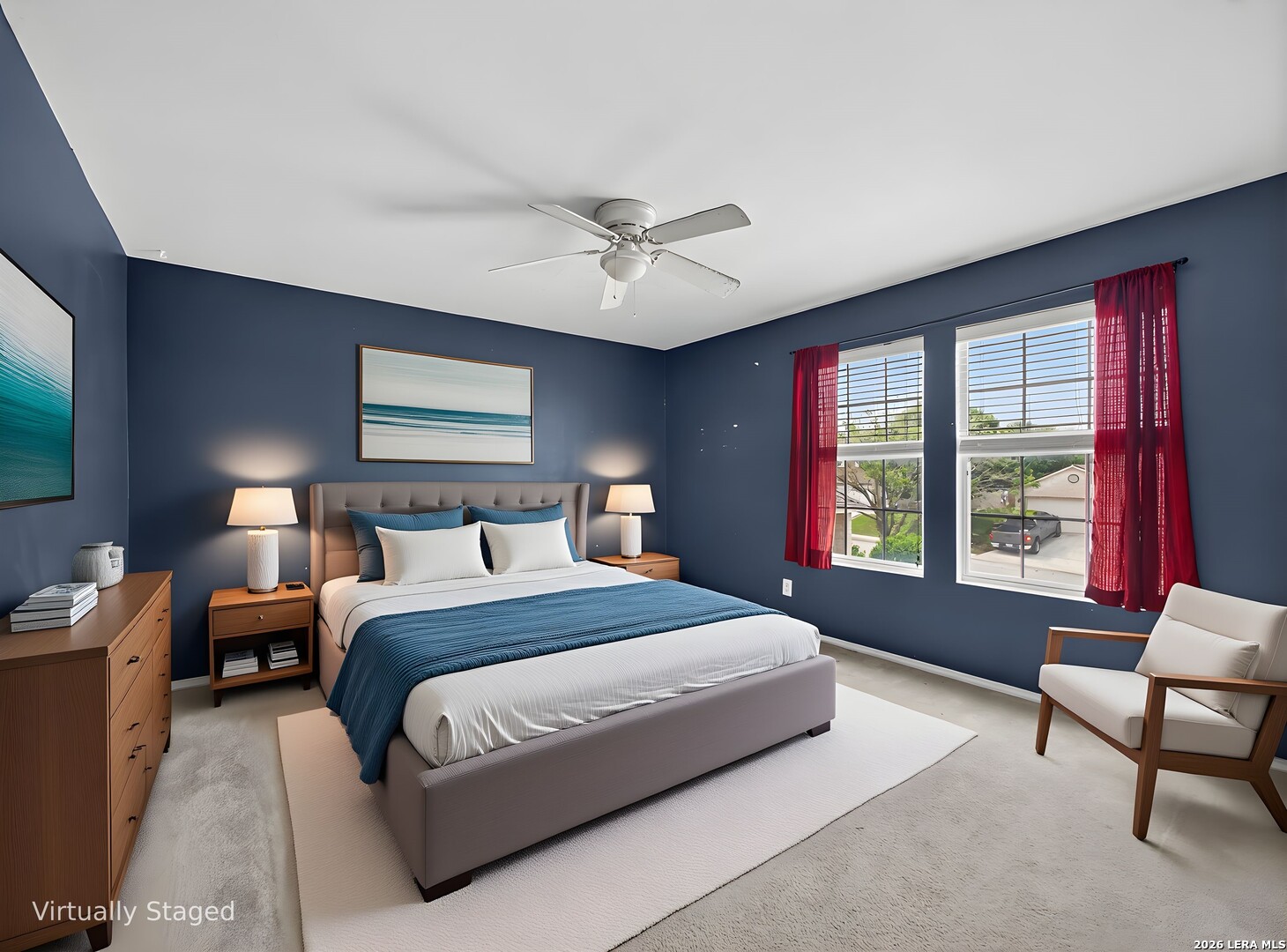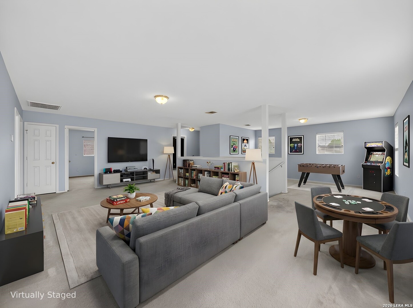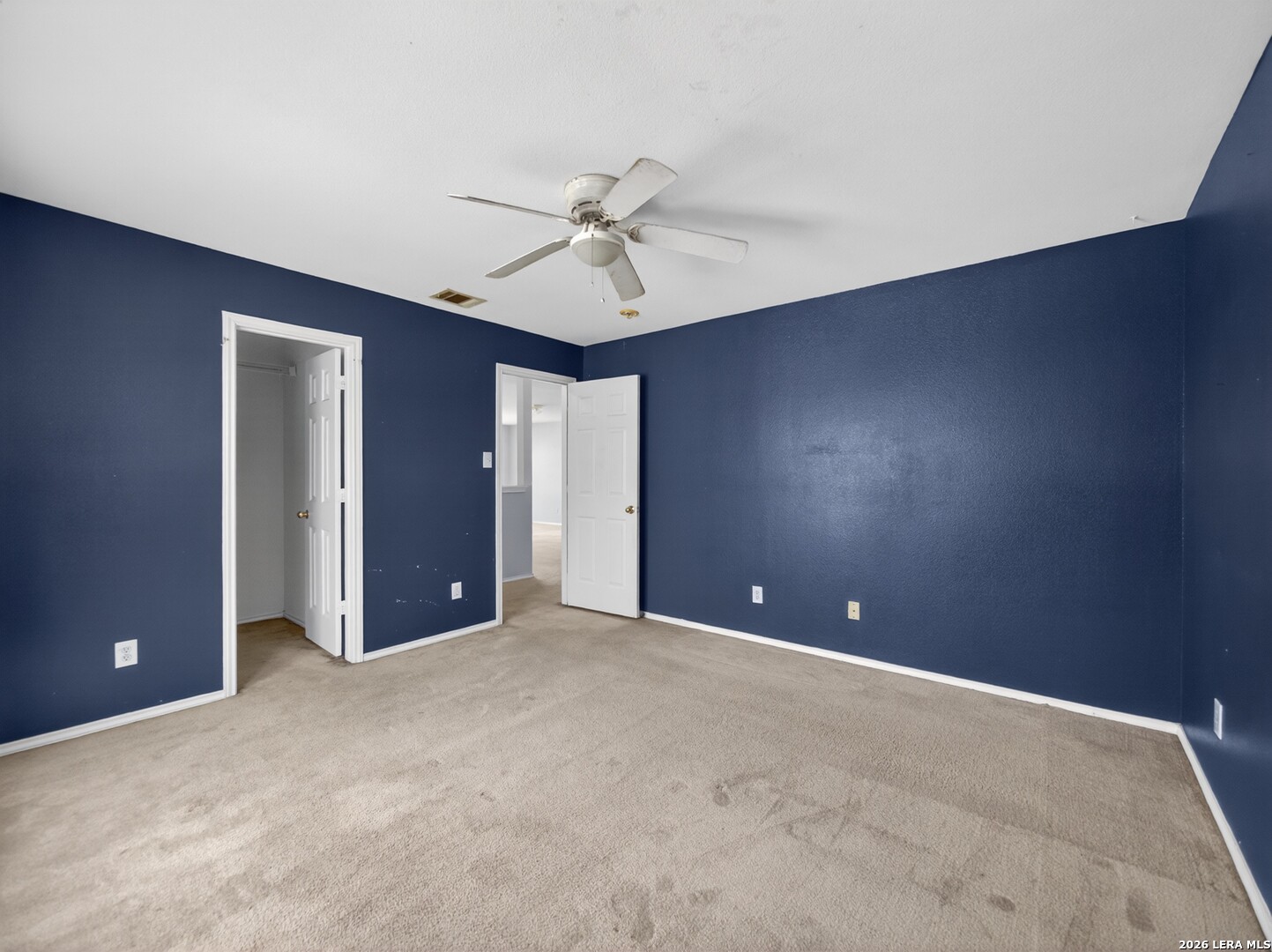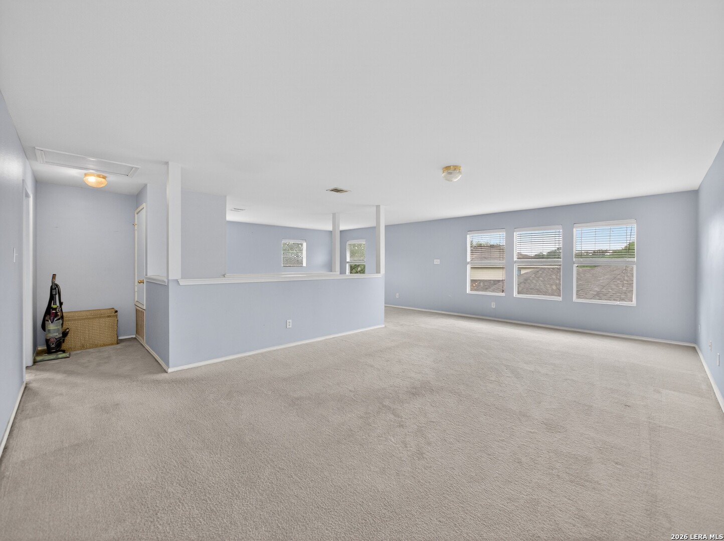 This 3-bedroom, 2.5-bathroom, two-story home offers 3,134 sq ft of functional living space and is situated in a cul-de-sac. The property features a rock-accented lower exterior, with siding throughout the remainder of the home, and a covered front-entry sitting area centered in front of the main window. The main level includes two spacious living areas, providing flexibility for everyday use and entertaining. The front living area offers space for a formal dining setup, while the kitchen includes an eat-in dining area. The kitchen is equipped with an electric stove/oven combination, microwave, and dishwasher. It also features laminate countertops, original light-colored wood cabinetry, and a large walk-in pantry that includes the laundry area. A half bathroom is located off the main living space on the first floor. Upstairs, all three bedrooms are located along with a loft area and an additional office, game room, or bonus space. The primary bedroom includes a tray ceiling with a ceiling fan and a large ensuite bathroom featuring a garden tub, separate walk-in shower, double vanity, and an oversized walk-in closet accessed through the bathroom. Each additional bedroom includes generous closet space, with one offering a sliding-door closet and the other a walk-in closet. The shared upstairs bathroom includes a tub/shower combination. The home includes tile flooring in wet areas, with carpet throughout the remaining living spaces. The carpet is in poor condition and will require full replacement due to visible staining and significant pet-related damage. Additional features include a 2-car garage, covered backyard porch, and fencing on three sides, with two sides recently replaced. Major system updates include a 2023 A/C unit, a 2019 water heater, and a brand-new 50-year roof installed in 2025. And just a few minutes away from Specht Elementary School.