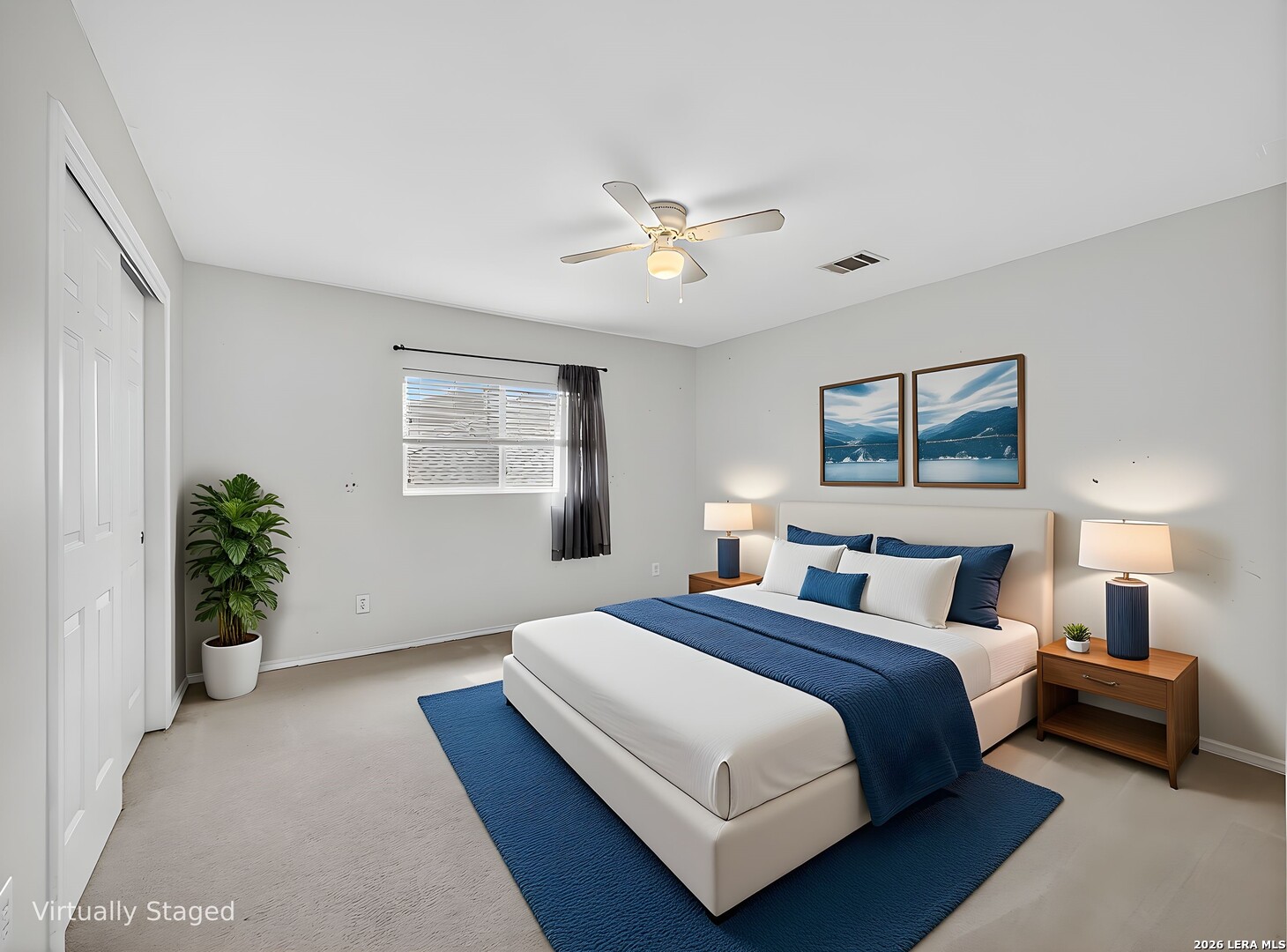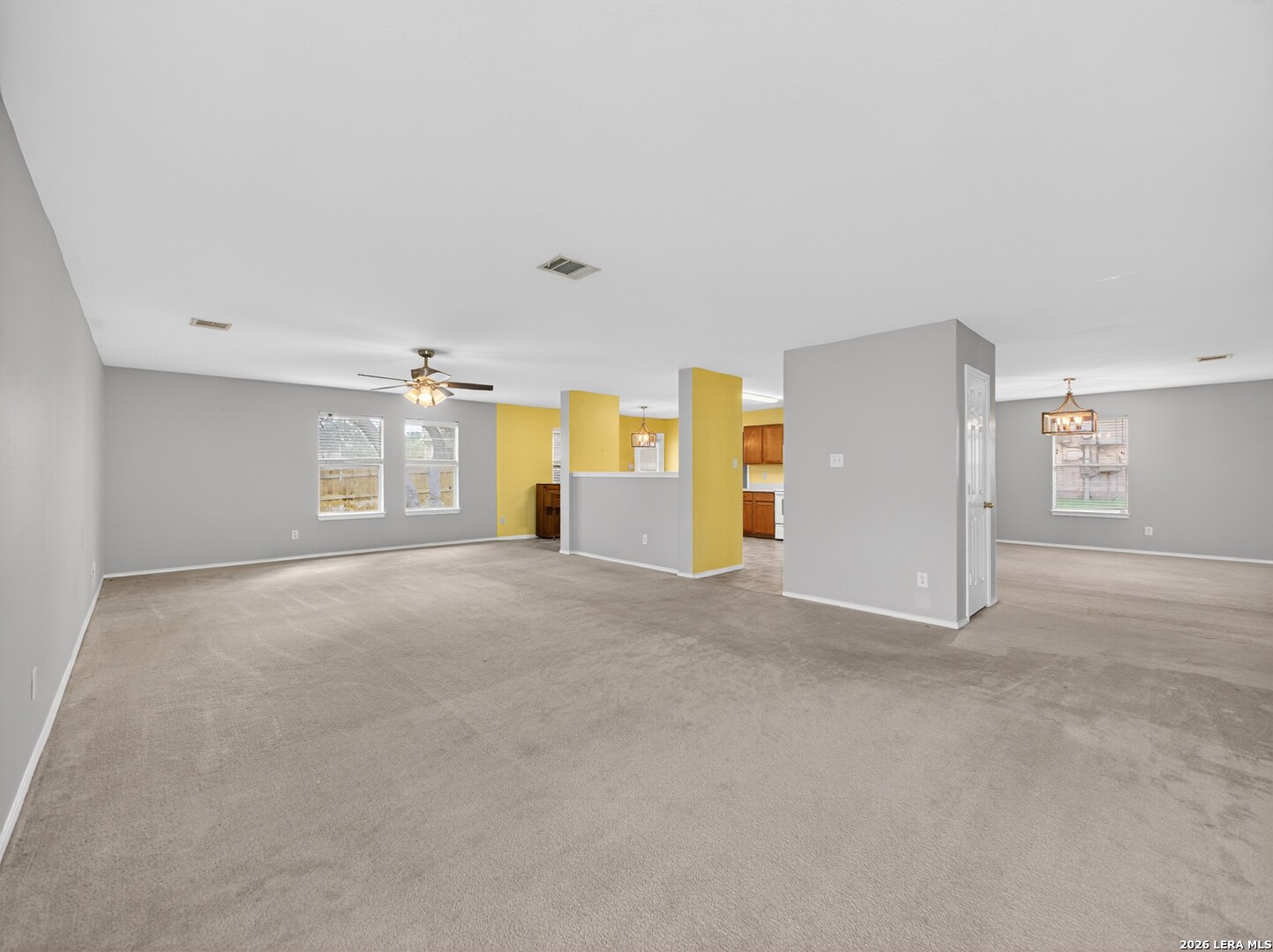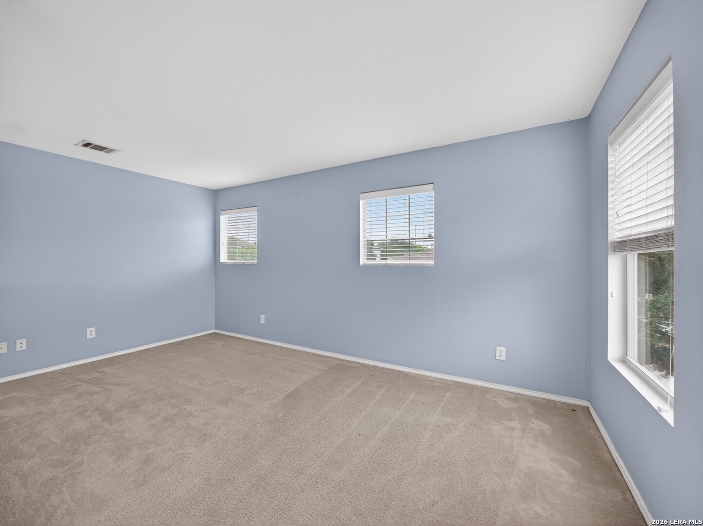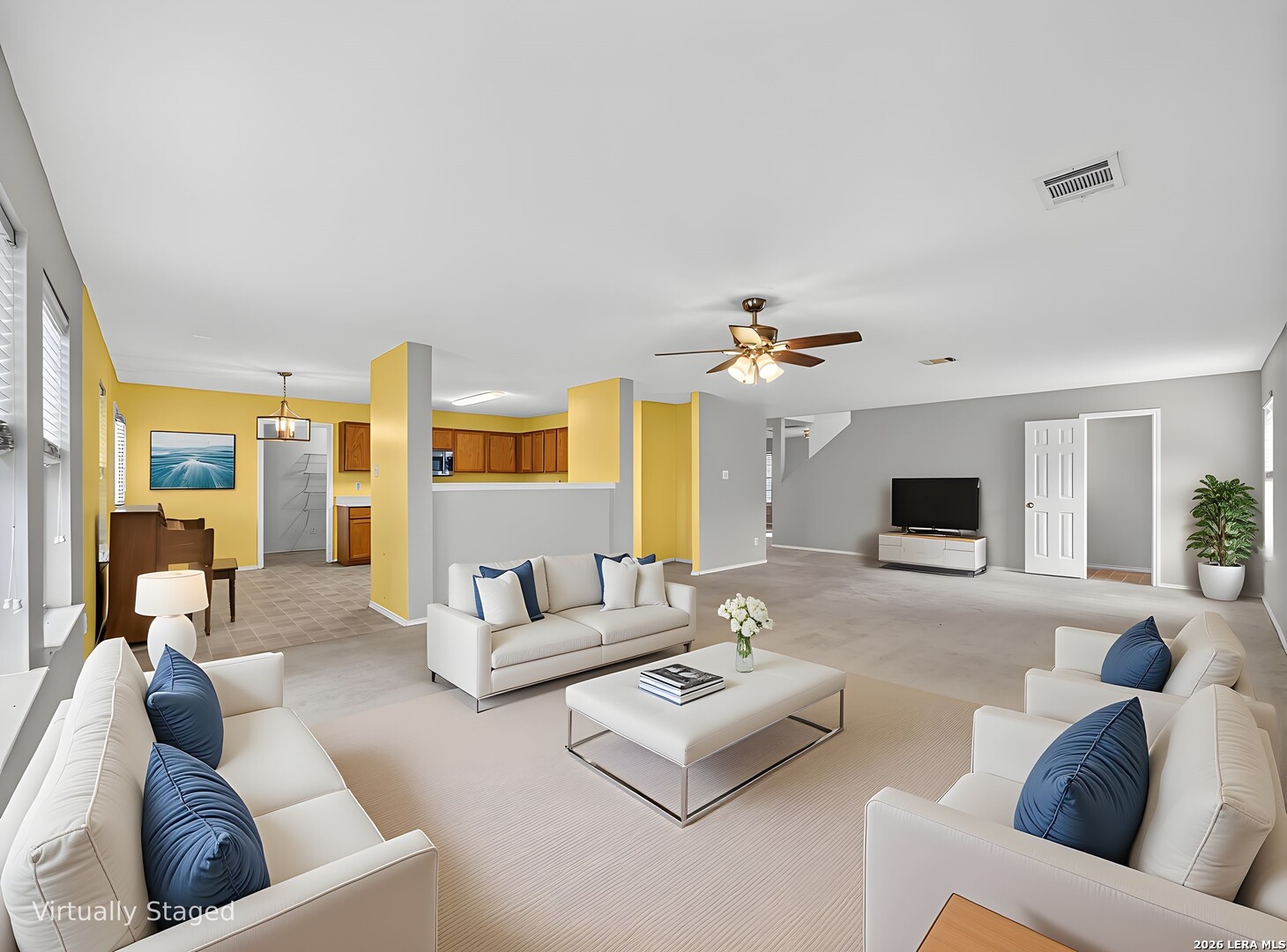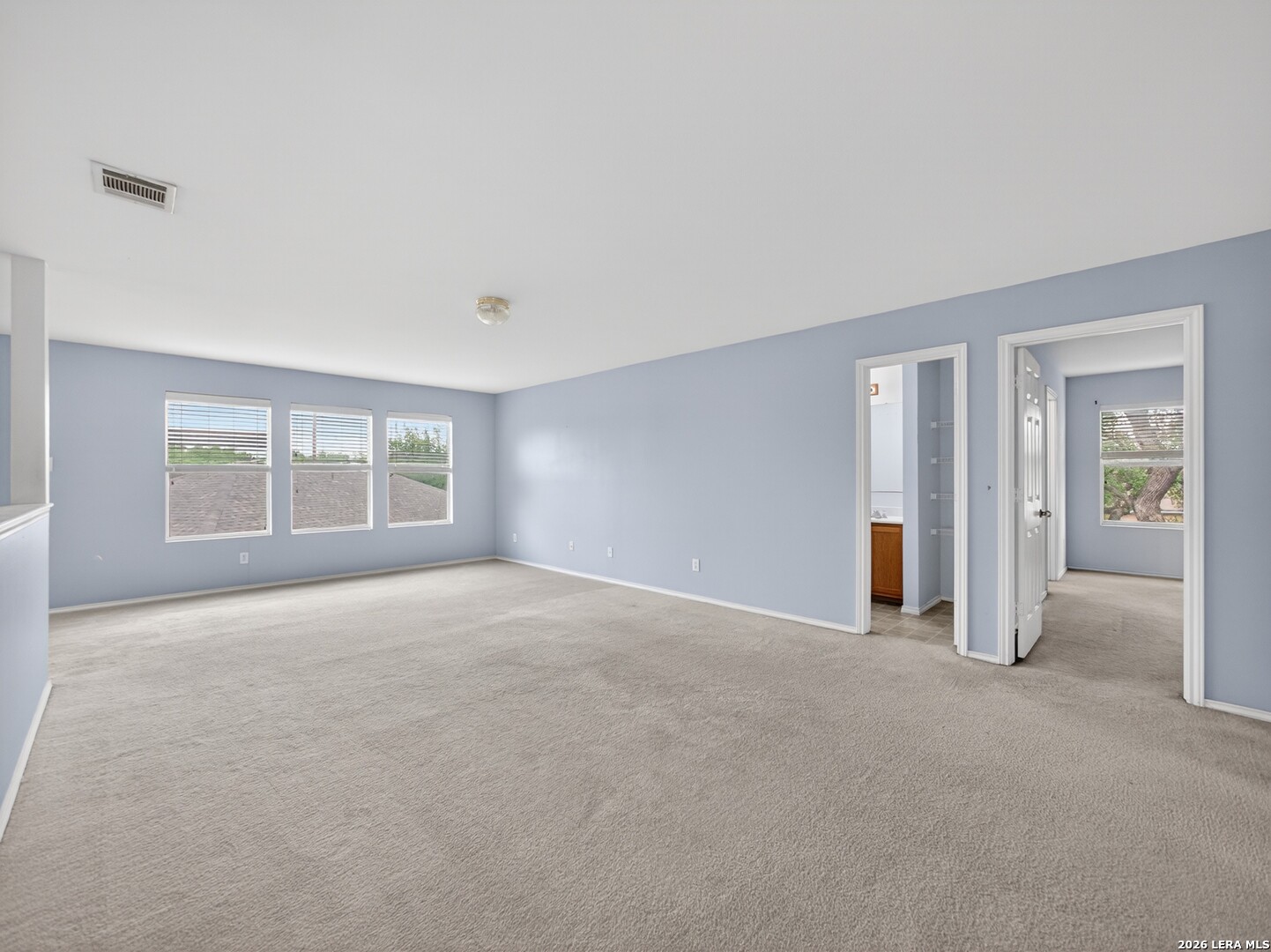 This 3-bedroom, 2.5-bathroom, two-story home offers 3,134 sq ft of functional living space and is situated in a cul-de-sac. The property features a rock-accented lower exterior, with siding throughout the remainder of the home, and a covered front-entry sitting area centered in front of the main window. The main level includes two spacious living areas, providing flexibility for everyday use and entertaining. The front living area offers space for a formal dining setup, while the kitchen includes an eat-in dining area. The kitchen is equipped with an electric stove/oven combination, microwave, and dishwasher. It also features laminate countertops, original light-colored wood cabinetry, and a large walk-in pantry that includes the laundry area. A half bathroom is located off the main living space on the first floor. Upstairs, all three bedrooms are located along with a loft area and an additional office, game room, or bonus space. The primary bedroom includes a tray ceiling with a ceiling fan and a large ensuite bathroom featuring a garden tub, separate walk-in shower, double vanity, and an oversized walk-in closet accessed through the bathroom. Each additional bedroom includes generous closet space, with one offering a sliding-door closet and the other a walk-in closet. The shared upstairs bathroom includes a tub/shower combination. The home includes tile flooring in wet areas, with carpet throughout the remaining living spaces. The carpet is in poor condition and will require full replacement due to visible staining and significant pet-related damage. Additional features include a 2-car garage, covered backyard porch, and fencing on three sides, with two sides recently replaced. Major system updates include a 2023 A/C unit, a 2019 water heater, and a brand-new 50-year roof installed in 2025. And just a few minutes away from Specht Elementary School.