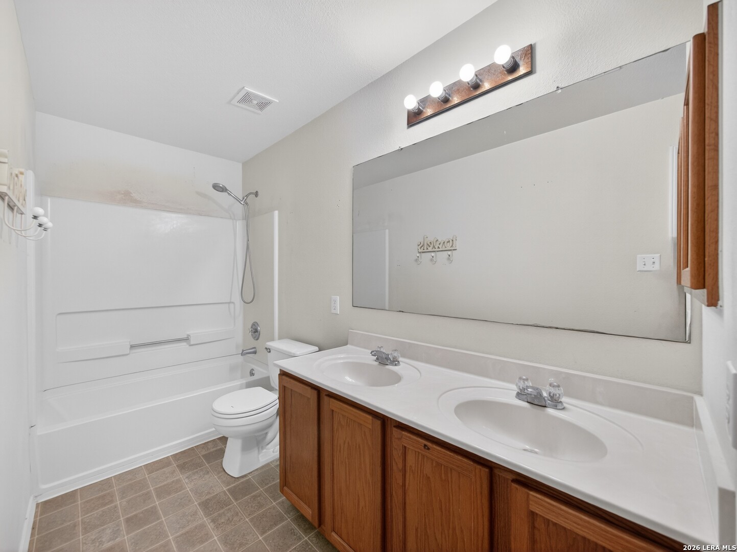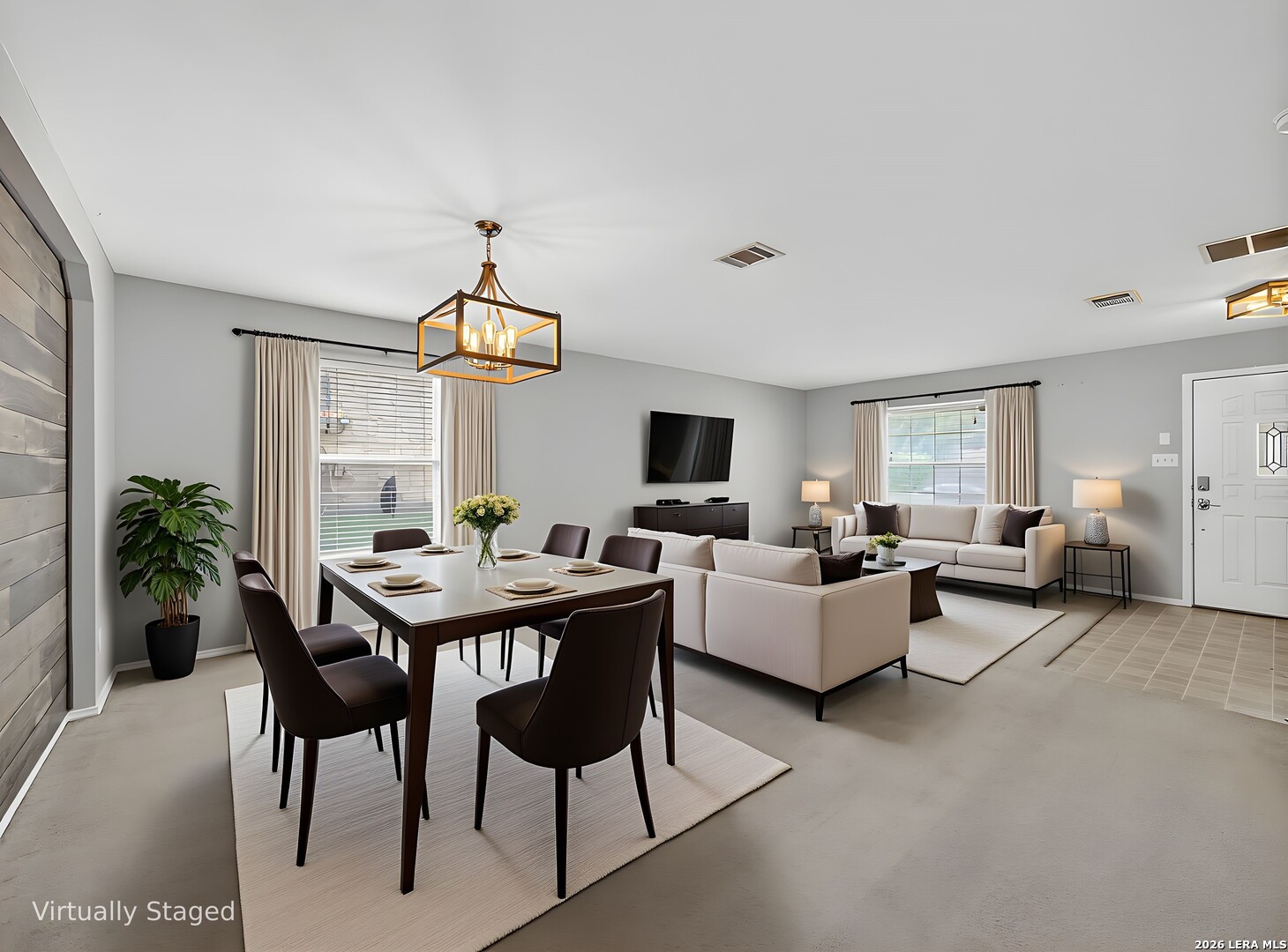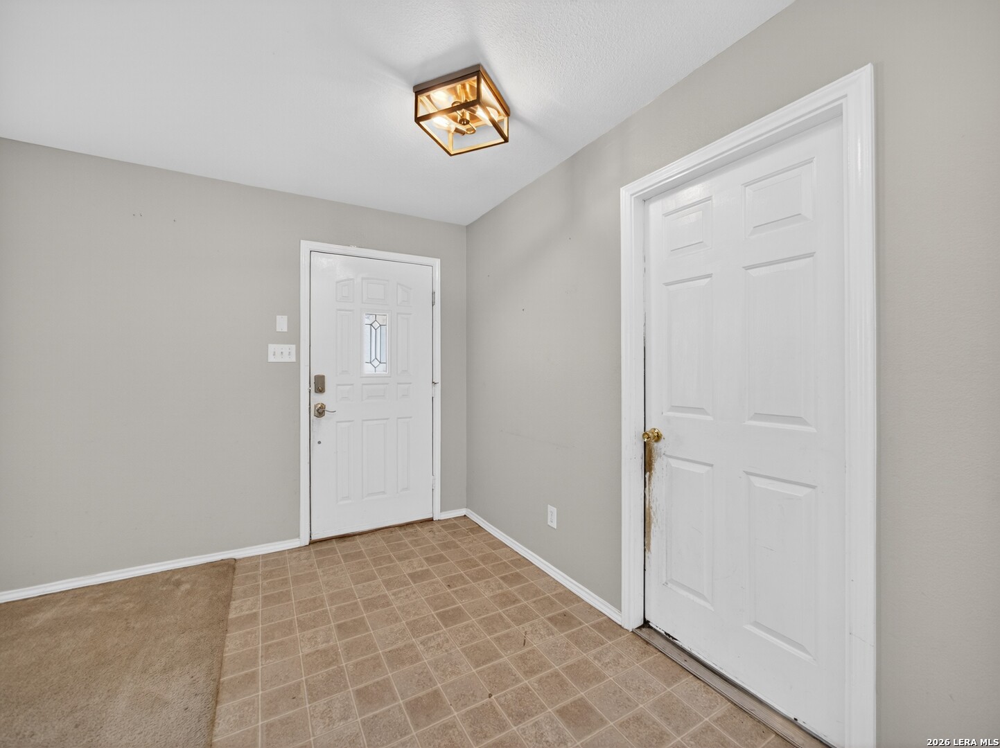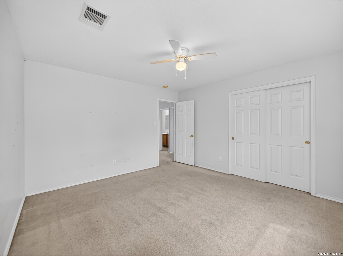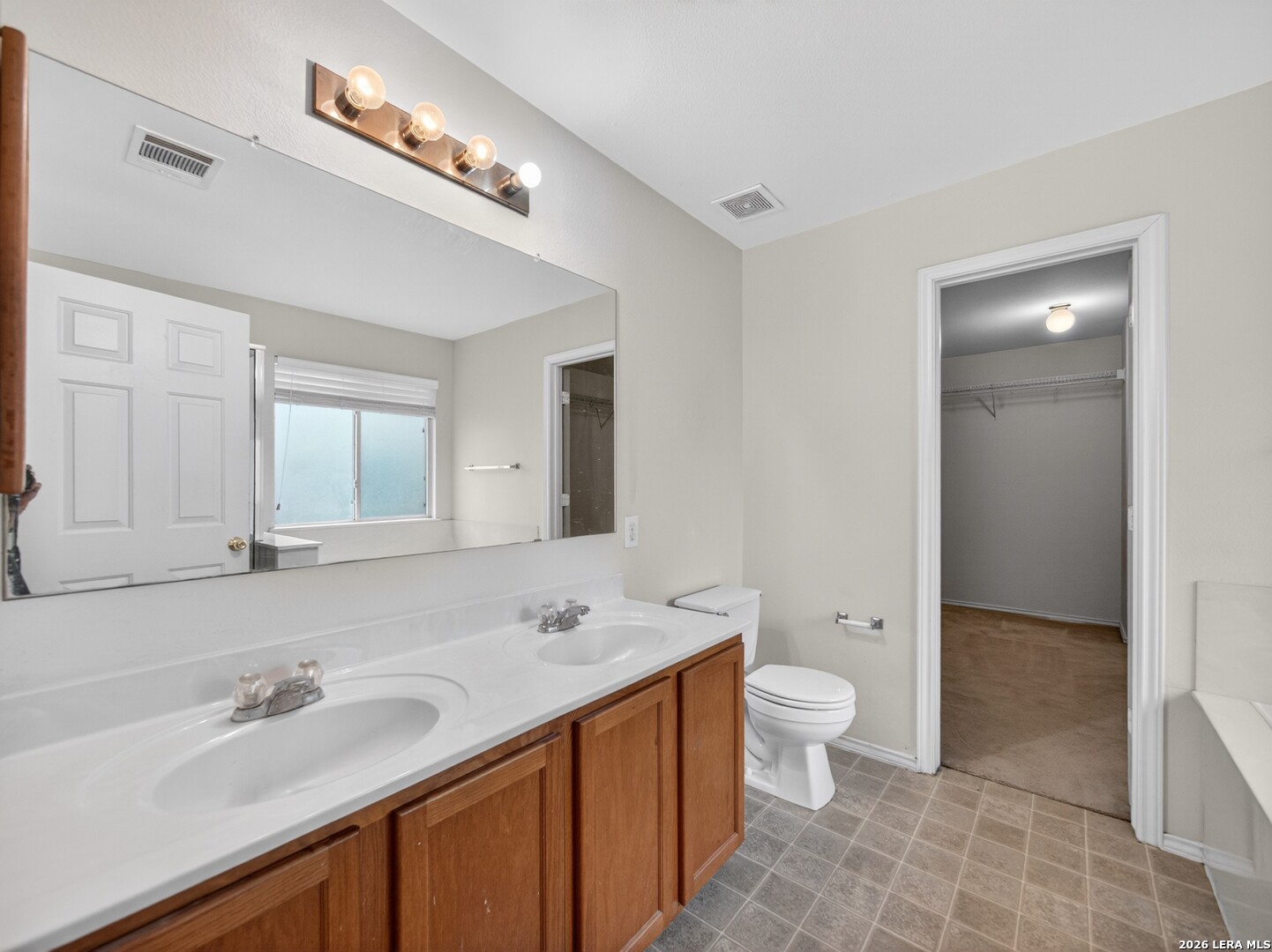 This 3-bedroom, 2.5-bathroom, two-story home offers 3,134 sq ft of functional living space and is situated in a cul-de-sac. The property features a rock-accented lower exterior, with siding throughout the remainder of the home, and a covered front-entry sitting area centered in front of the main window. The main level includes two spacious living areas, providing flexibility for everyday use and entertaining. The front living area offers space for a formal dining setup, while the kitchen includes an eat-in dining area. The kitchen is equipped with an electric stove/oven combination, microwave, and dishwasher. It also features laminate countertops, original light-colored wood cabinetry, and a large walk-in pantry that includes the laundry area. A half bathroom is located off the main living space on the first floor. Upstairs, all three bedrooms are located along with a loft area and an additional office, game room, or bonus space. The primary bedroom includes a tray ceiling with a ceiling fan and a large ensuite bathroom featuring a garden tub, separate walk-in shower, double vanity, and an oversized walk-in closet accessed through the bathroom. Each additional bedroom includes generous closet space, with one offering a sliding-door closet and the other a walk-in closet. The shared upstairs bathroom includes a tub/shower combination. The home includes tile flooring in wet areas, with carpet throughout the remaining living spaces. The carpet is in poor condition and will require full replacement due to visible staining and significant pet-related damage. Additional features include a 2-car garage, covered backyard porch, and fencing on three sides, with two sides recently replaced. Major system updates include a 2023 A/C unit, a 2019 water heater, and a brand-new 50-year roof installed in 2025. And just a few minutes away from Specht Elementary School.