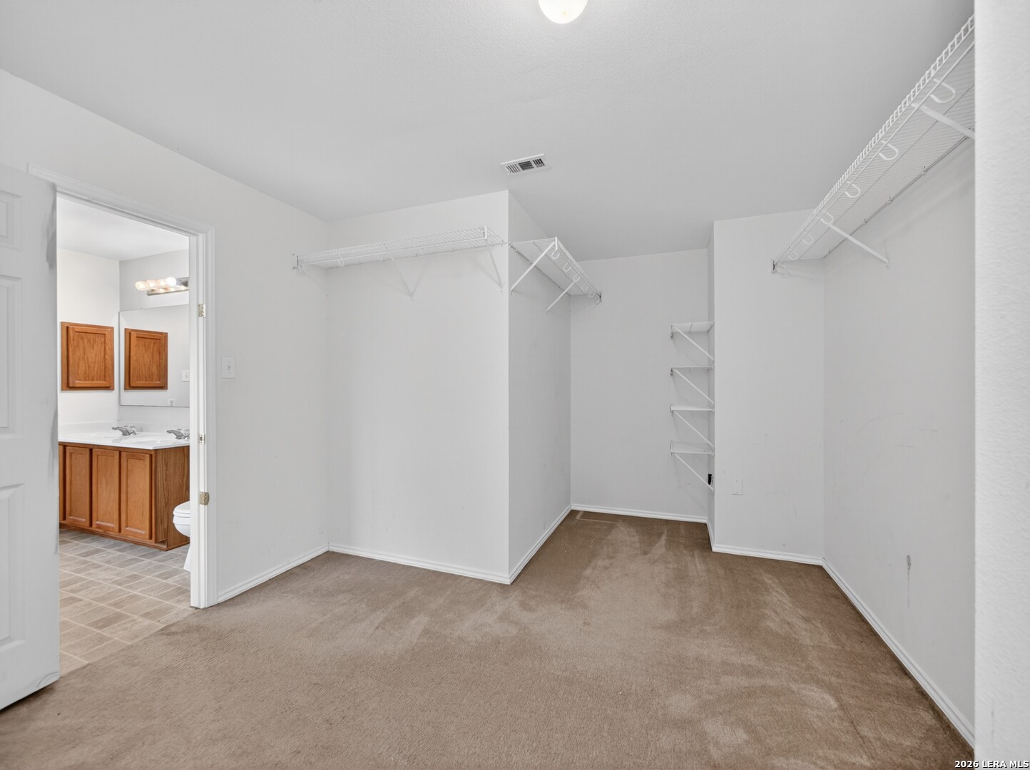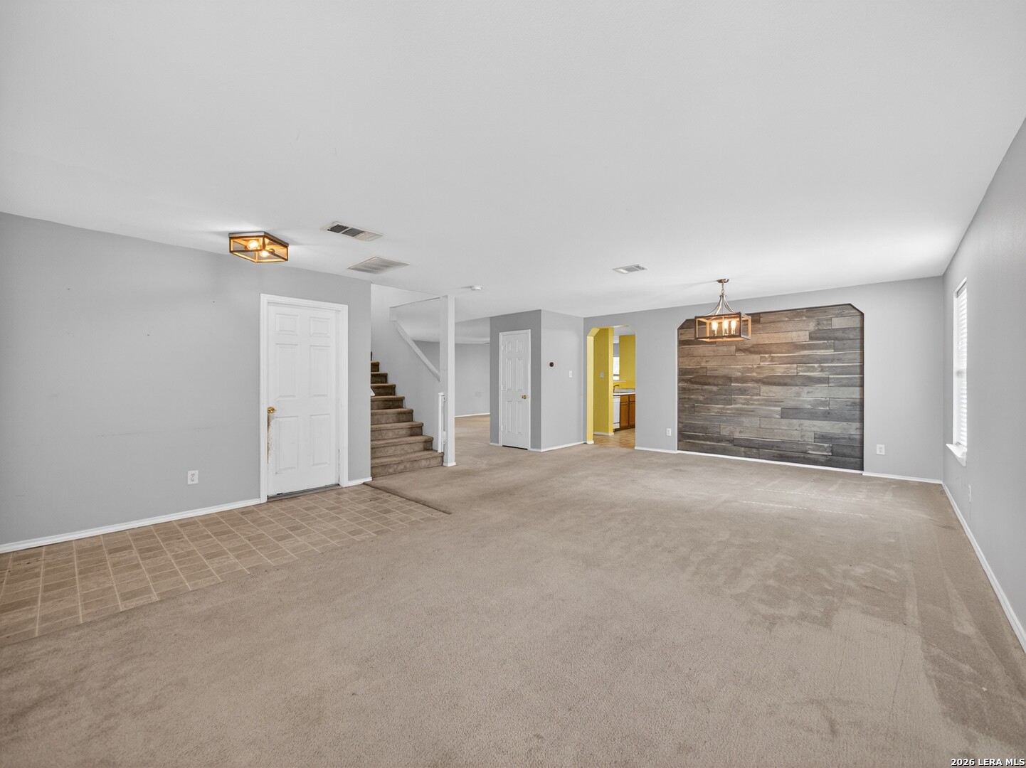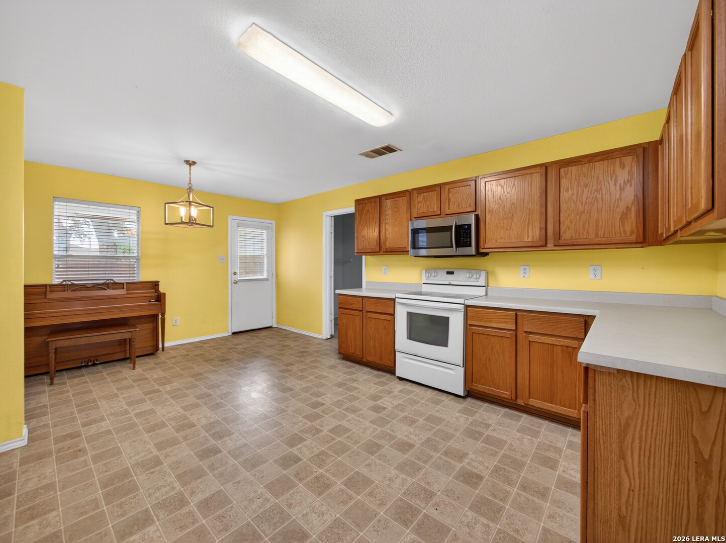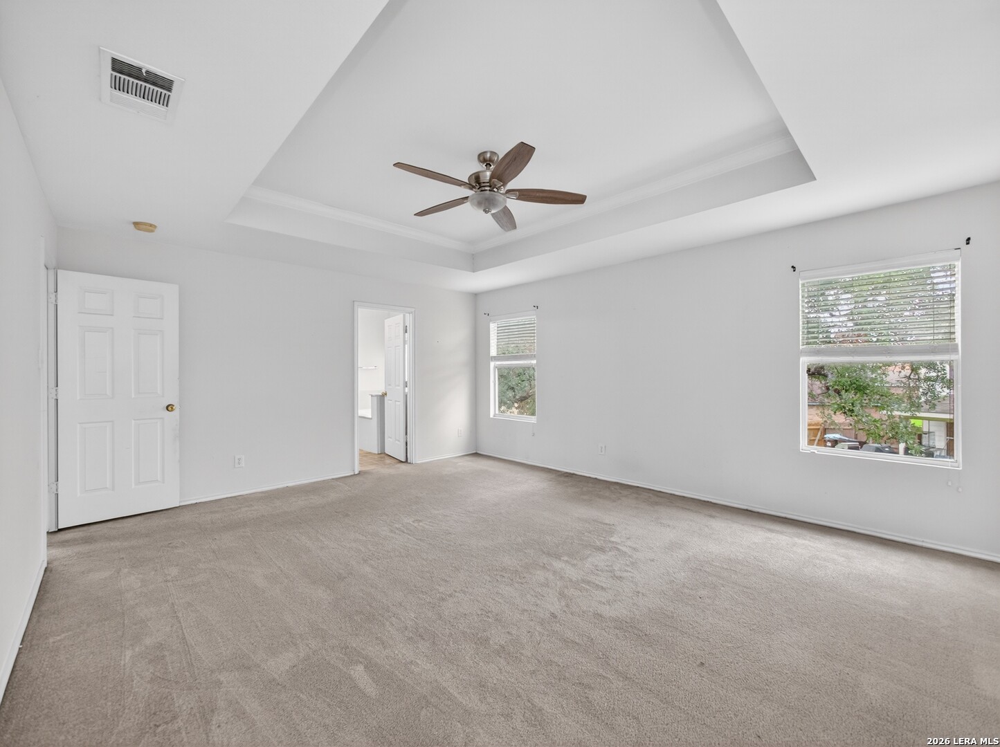 This 3-bedroom, 2.5-bathroom, two-story home offers 3,134 sq ft of functional living space and is situated in a cul-de-sac. The property features a rock-accented lower exterior, with siding throughout the remainder of the home, and a covered front-entry sitting area centered in front of the main window. The main level includes two spacious living areas, providing flexibility for everyday use and entertaining. The front living area offers space for a formal dining setup, while the kitchen includes an eat-in dining area. The kitchen is equipped with an electric stove/oven combination, microwave, and dishwasher. It also features laminate countertops, original light-colored wood cabinetry, and a large walk-in pantry that includes the laundry area. A half bathroom is located off the main living space on the first floor. Upstairs, all three bedrooms are located along with a loft area and an additional office, game room, or bonus space. The primary bedroom includes a tray ceiling with a ceiling fan and a large ensuite bathroom featuring a garden tub, separate walk-in shower, double vanity, and an oversized walk-in closet accessed through the bathroom. Each additional bedroom includes generous closet space, with one offering a sliding-door closet and the other a walk-in closet. The shared upstairs bathroom includes a tub/shower combination. The home includes tile flooring in wet areas, with carpet throughout the remaining living spaces. The carpet is in poor condition and will require full replacement due to visible staining and significant pet-related damage. Additional features include a 2-car garage, covered backyard porch, and fencing on three sides, with two sides recently replaced. Major system updates include a 2023 A/C unit, a 2019 water heater, and a brand-new 50-year roof installed in 2025. And just a few minutes away from Specht Elementary School.