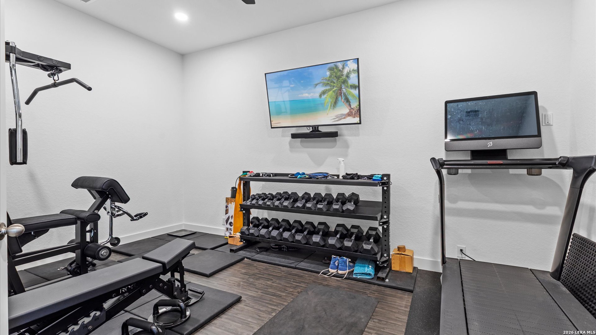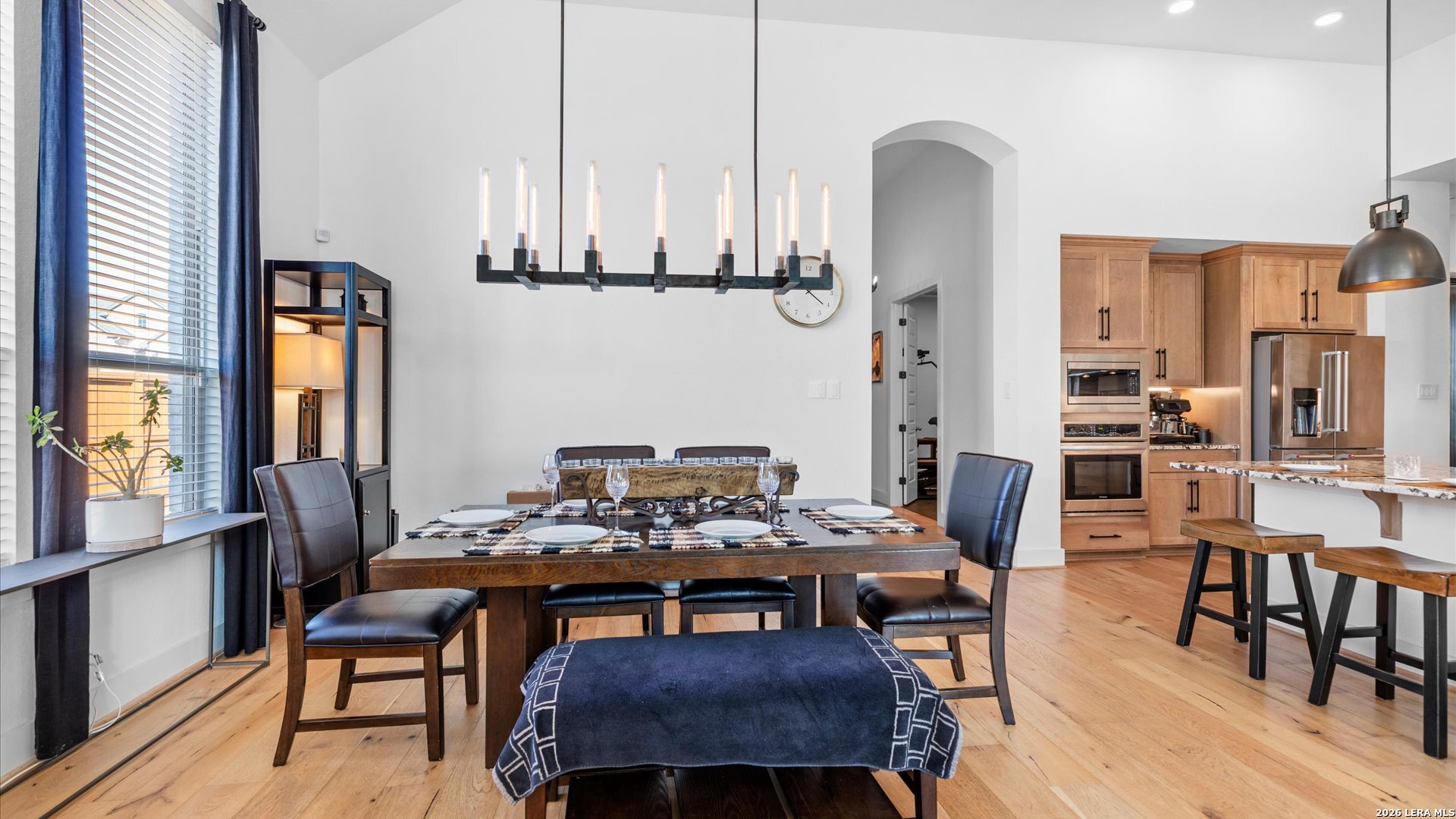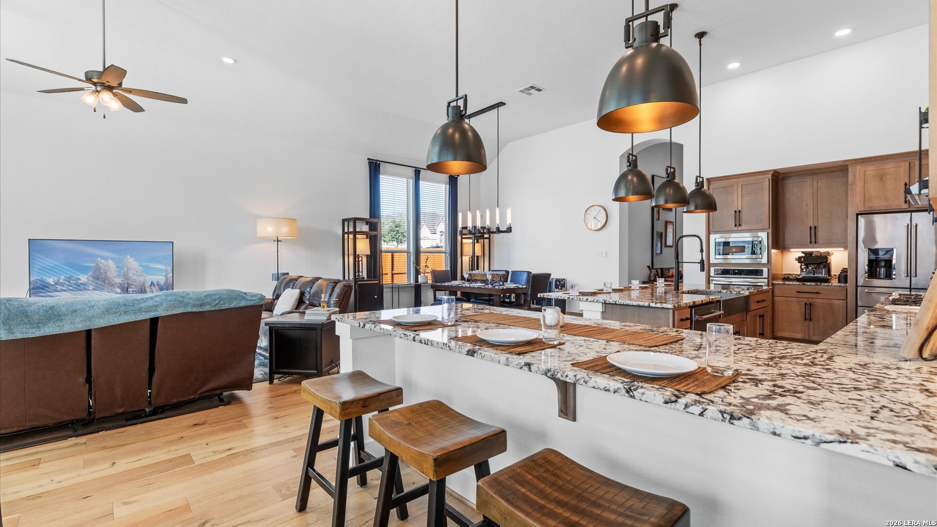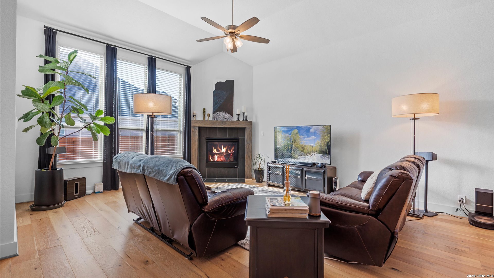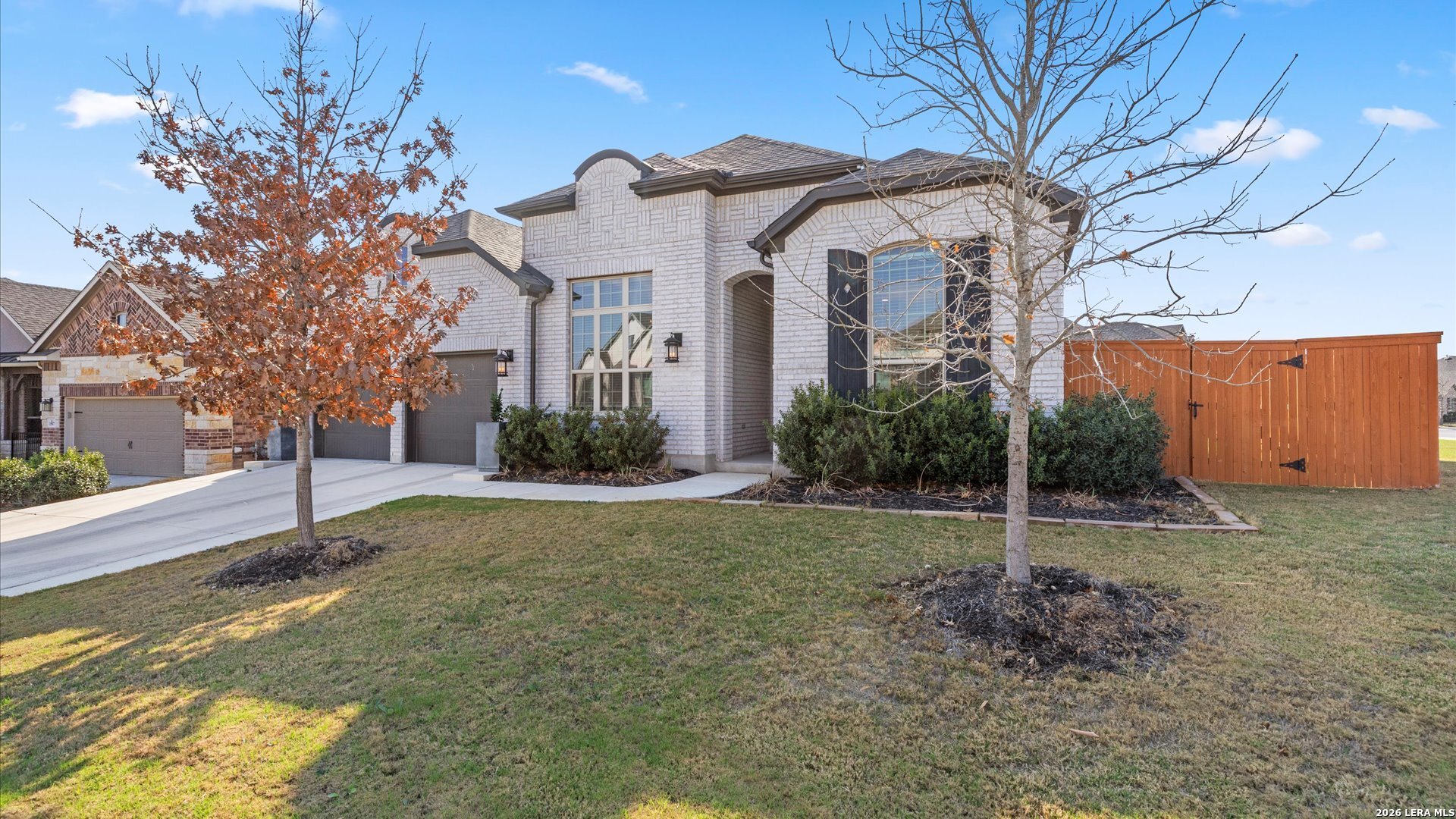Stunning 4 year old highland-built home on a desirable corner lot! This 4 bedroom, 3.5 bath residence boasts 3,073 square feet of elegant living space with soaring high ceilings. The gourmet kitchen features a large island, pendant lighting, 5 burner gas cooktop, granite countertops, pot filler, and a breakfast bar perfect for entertaining. The spacious living area includes a cozy gas log fireplace, while the office showcases beautiful built in shelving. Additional highlights include French oak wood floors elegant restoration hardware lighting and cabinet hardware throughout, dual water heaters, and a charcoal osmosis water softener. The primary suite offers a luxurious bath with a separate garden tub, large wall in shower and closet, double vanity with a make sitting area. A versatile flex space is currently being used as a gym but could easily serve as a media or game room. VA buyers can take advantage of a 2.99% assumable rate, subject to qualification. Ideally located near Lackland AFB, the new hospital, SeaWorld, and a variety of shopping and dining options, this home combines modern luxury with unbeatable convenience.