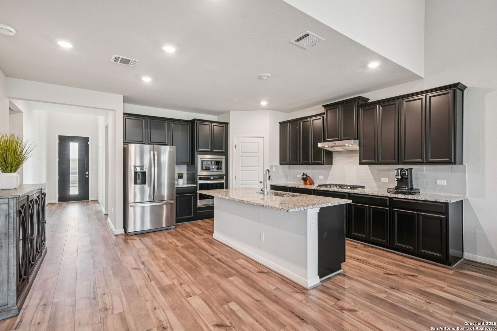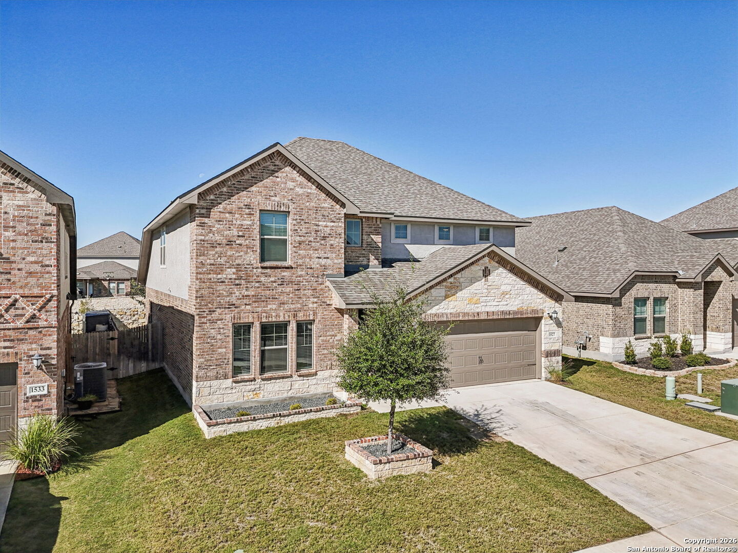 Welcome to this beautifully appointed 4-bedroom, 3.5-bath, two-story home showcasing an open-concept design and soaring ceilings that create a bright, airy atmosphere throughout. Thoughtfully upgraded and meticulously maintained, this residence blends modern functionality with timeless elegance. The gourmet kitchen is a true centerpiece, featuring granite countertops, a gas cooktop, built-in microwave and oven, dishwasher and a complete appliance package including refrigerator, washer, and dryer-making this home truly move-in ready. Engineered vinyl plank flooring flows through the main living areas, while tile accents in all wet areas add both durability and style. Retreat to the spacious primary suite, highlighted by bay windows, a spa-inspired bathroom with separate garden tub and walk-in shower, dual vanities, and a generous walk-in closet. Secondary bedrooms are well-sized, offering comfort and versatility. An expansive loft provides endless possibilities-perfect for a second living area, game room, or creative space-while the study/flex room adds even more adaptability for today's lifestyle. Additional features include ceiling fans throughout, a water softener, sprinkler system and a dedicated electric vehicle charging station. Outside, enjoy the curb appeal of custom-built brick/stone flower beds, adding a refined touch to the home's exterior. With its impressive upgrades, functional layout, and modern conveniences, this exceptional home offers comfort, style, and flexibility to suit a wide range of living needs. Approximately 13 miles to JBSA Lackland, 19 miles to Six Flags Fiesta Texas and very close various shopping, restaurants and entertainment. Move in Ready!