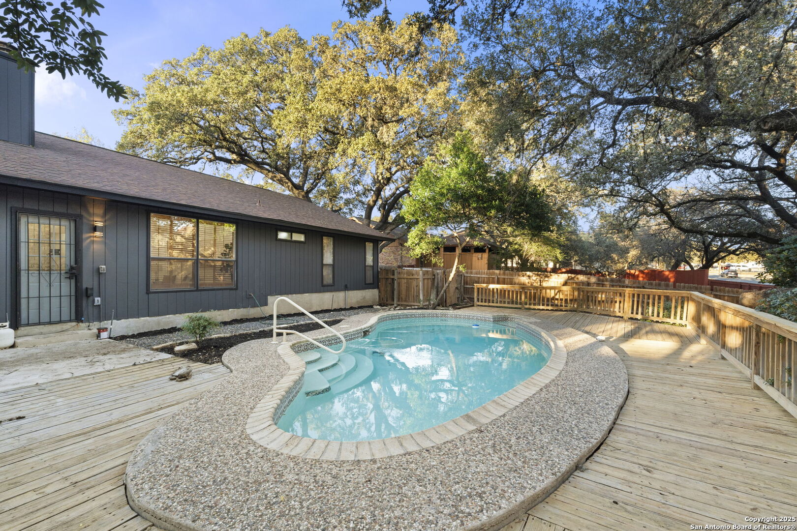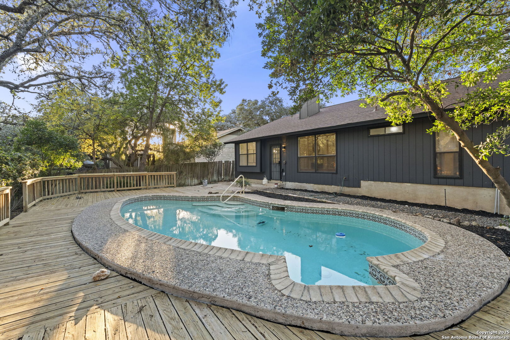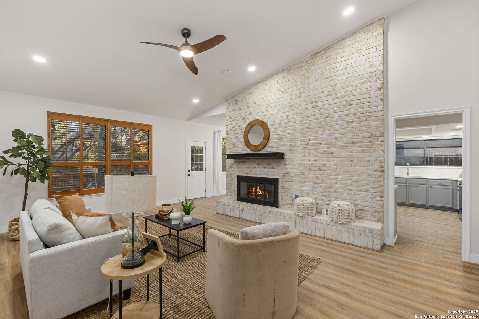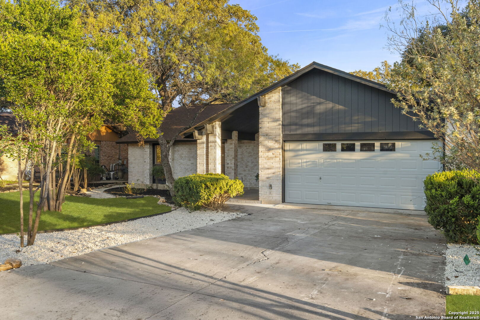 Welcome to 15314 Artesian Oaks, a beautifully updated 3-bedroom, 2-bath brick home offering timeless curb appeal, modern interior finishes, a POOL, and NO HOA. The classic light-toned brick exterior paired with dark accents creates a clean, contemporary look while maintaining durability and low maintenance - a rare and valuable combination. Inside, the home features updated flooring, recessed lighting, and a spacious living area anchored by a stunning floor-to-ceiling painted brick fireplace, adding warmth and architectural interest. The kitchen has been refreshed with quartz countertops, stainless steel appliances, modern cabinetry, and generous prep space, making it ideal for everyday living or entertaining. Both bathrooms showcase contemporary upgrades, including a walk-in shower with designer tile and sleek, modern fixtures. Natural light flows throughout the home, enhancing the bright, airy feel. Step outside to a huge backyard shaded by mature trees, offering privacy and flexibility. The outdoor space includes a deck and pool, perfect for entertaining, relaxing, or adding future value. The brick exterior continues throughout, providing long-term durability and strong resale appeal. With no HOA restrictions, this property is an excellent opportunity for investors seeking rental potential, as well as families looking for space, privacy, and character. Conveniently located near shopping, dining, and major roadways, this home offers both lifestyle and opportunity.