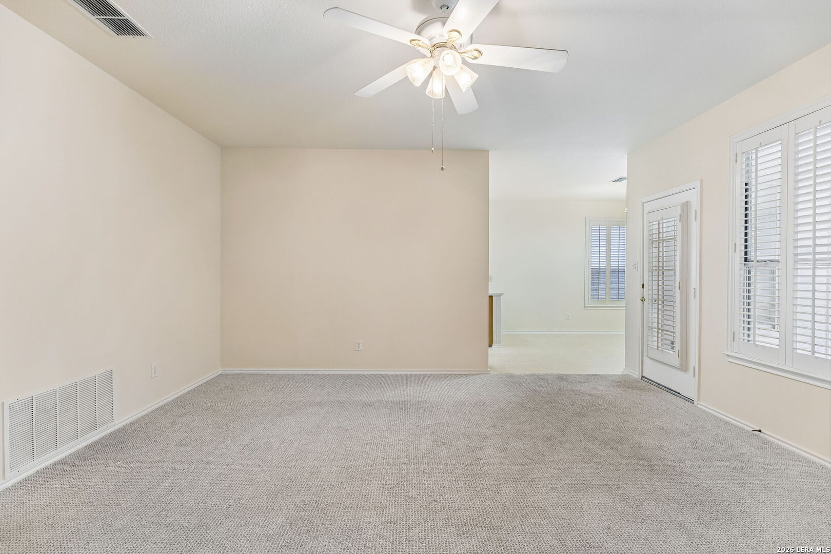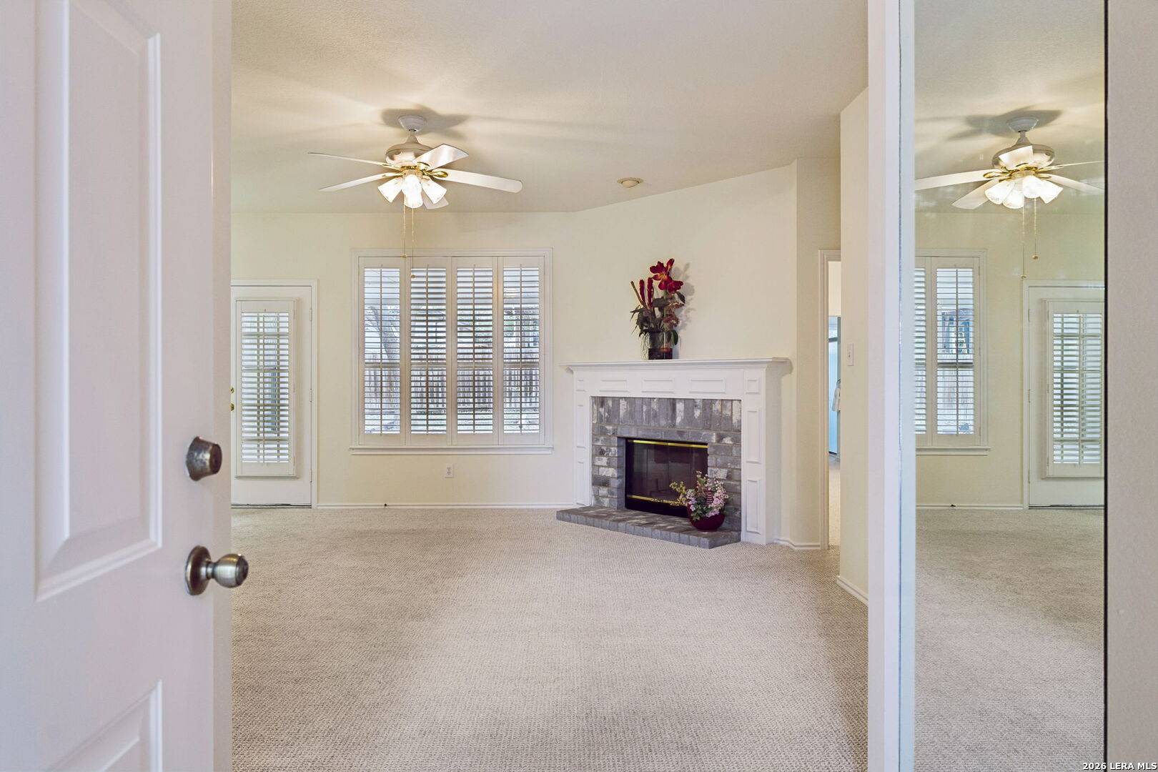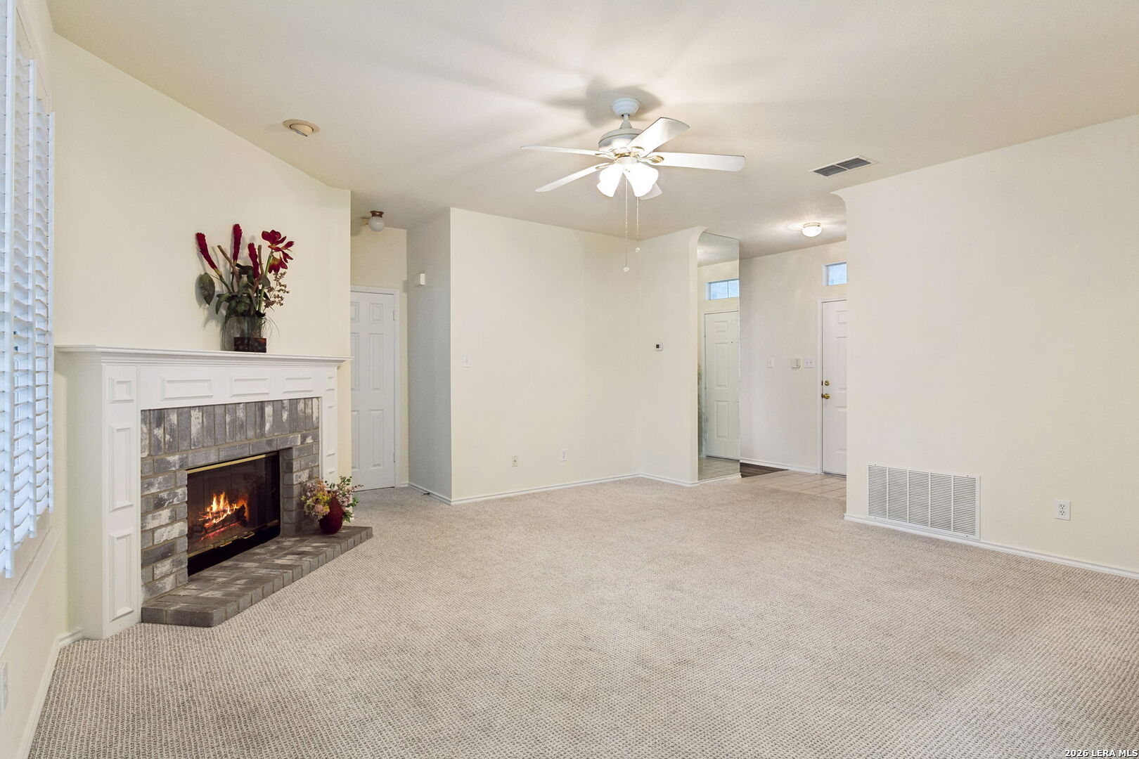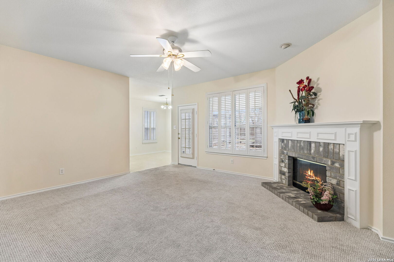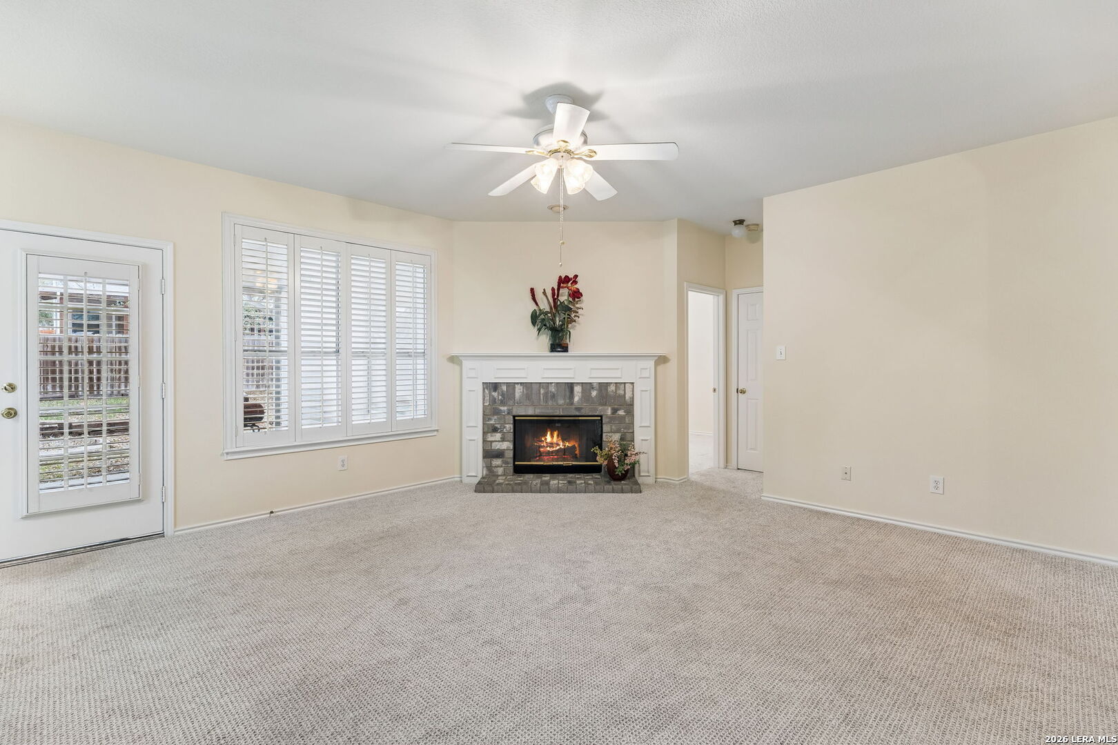 Welcome to this charming single-story home in the desirable Spring Creek Forest community. Built by Centex, this inviting residence offers the perfect opportunity to imagine the next season of your life with a fresh canvas ready for your personal touch. This well-maintained 3-bedroom, 2-bath home features new carpet and fresh paint throughout, creating a bright and refreshed feel from the moment you walk in. The spacious living area is centered around a cozy fireplace, perfect for relaxing evenings at home. Plantation shutters add both style and functionality, while the thoughtful layout offers comfortable living and easy flow. The primary bathroom has been updated with a newer walk-in shower, providing modern comfort and convenience. Additional features include a water softener, privacy fence, and a storage shed for extra space and organization. Step outside to enjoy the covered patio-an ideal spot for morning coffee, outdoor dining, or relaxing evenings while overlooking the backyard. The flower beds are ready to be planted, offering a wonderful opportunity to create your own colorful garden retreat. This home offers comfort, charm, and the opportunity to make it truly your own in the welcoming neighborhood of Spring Creek Forest.