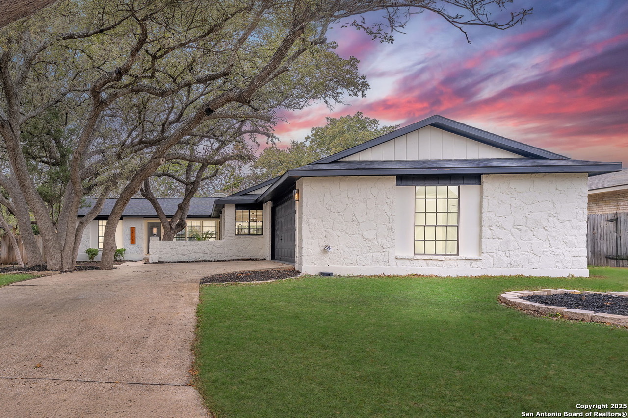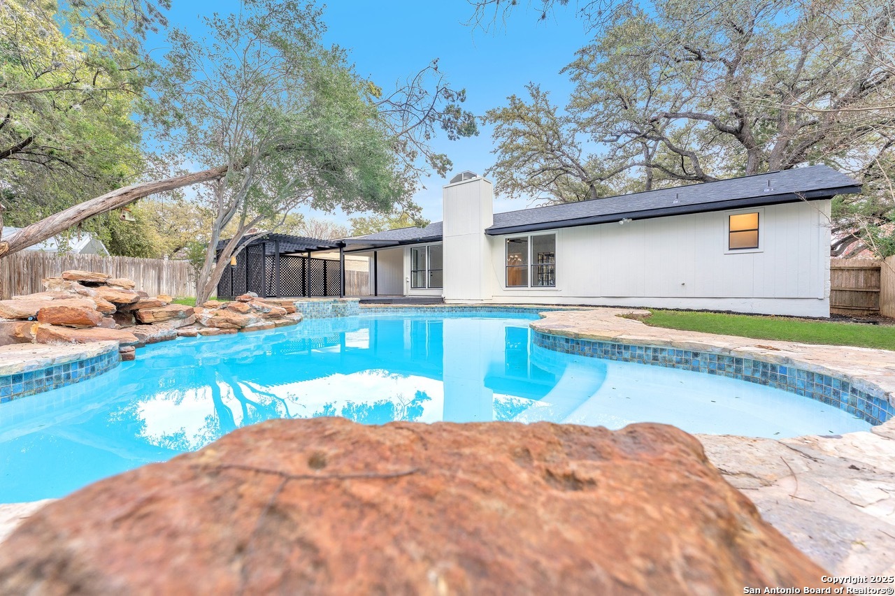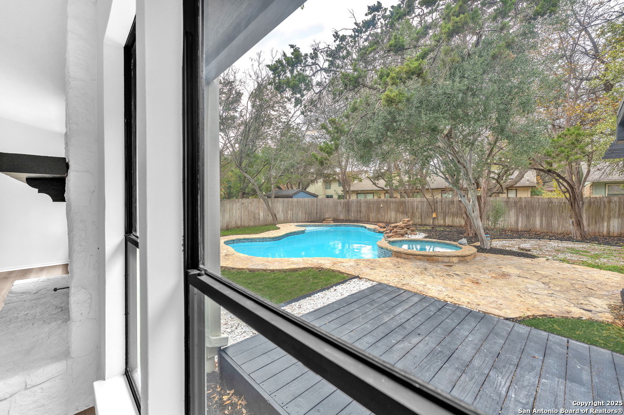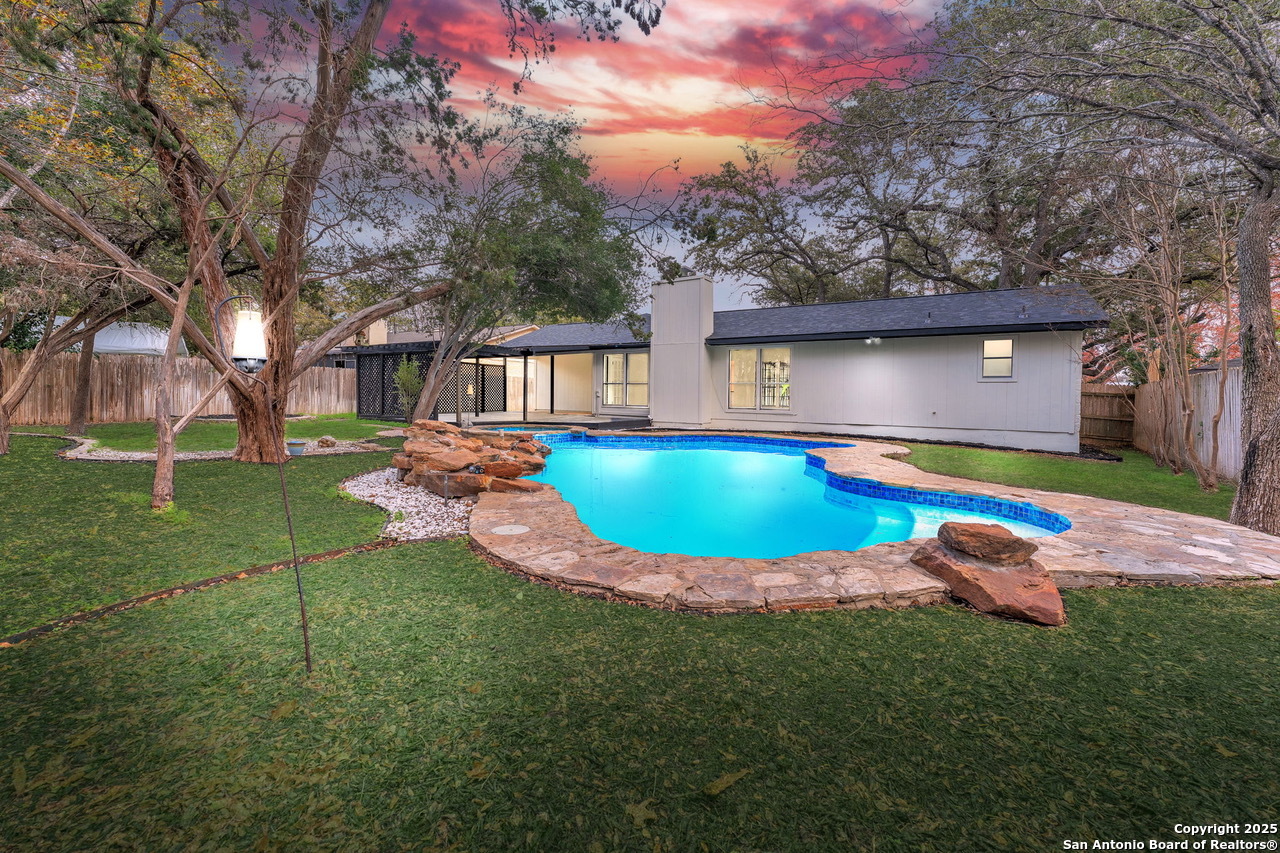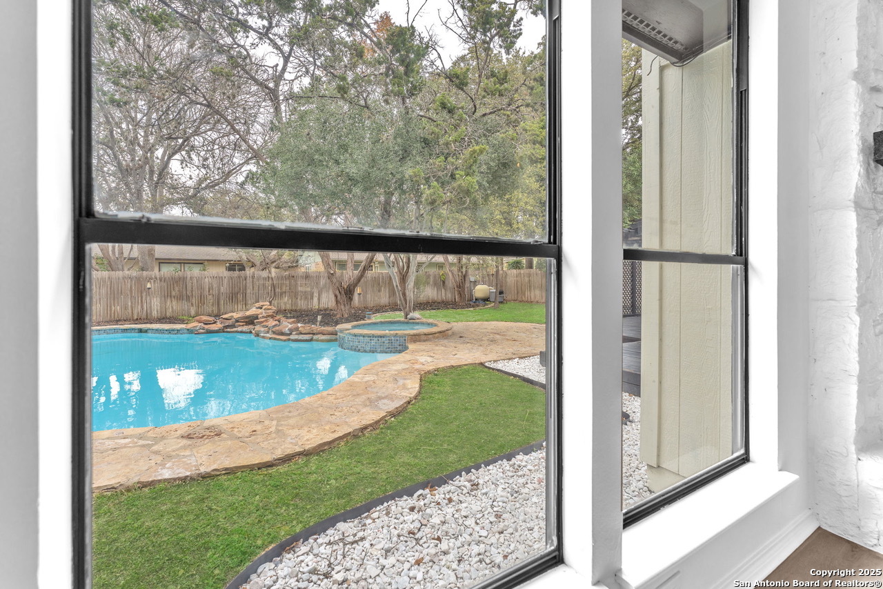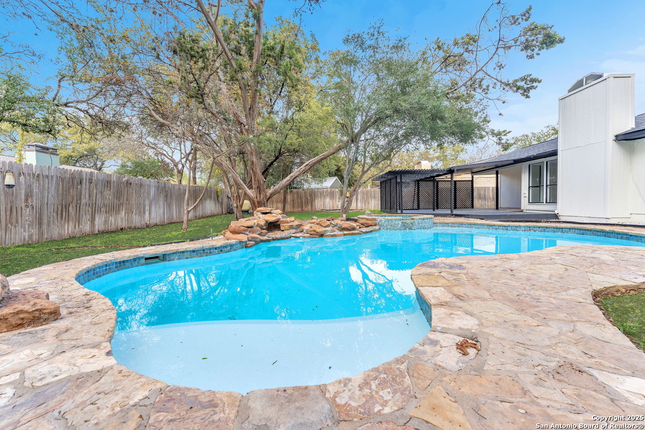 Luxurious 3 bed /2 bath dream home with gorgeous in-ground pool and waterfall spa. Stunningly renovated, this modern, light-filled showcase has an open living layout with breathtaking scenic windows. Dramatic living room is the perfect entertaining space with gas fireplace and pool views. Focal point is the beautifully sleek monochromatic kitchen with large island. Kitchen features include quartz countertops, marbleized backsplash, floor to ceiling custom cabinetry, statement chandelier, and stainless-steel appliances. Relax in style in glamorous primary bedroom suite with vaulted ceiling and walk-in closet. Spa inspired bathroom has black marble tiled walk-in shower and dual vanities. Designer touches throughout home include black and gold light fixtures, black matte hardware, and oversized ceiling fans. Luxury laminate flooring throughout. Heated backyard swimming pool with waterfall spa provides a year-round oasis. Covered patio in the lush backyard is ideal for alfresco dining. Renovation improvements include new roof, electrical, plumbing, HVAC, and water heater. Conveniently located in the oak-lined, idyllic Oak Hollow neighborhood, near airport, parks, and shopping. NEISD Schools & No HOA. Fully renovated houses like this rarely come on the market in this neighborhood. Book your showing today!