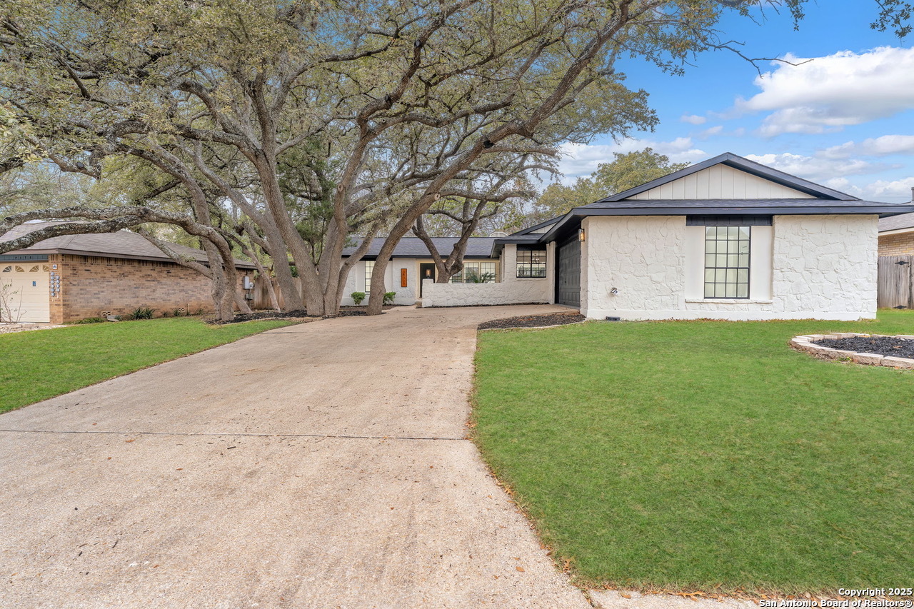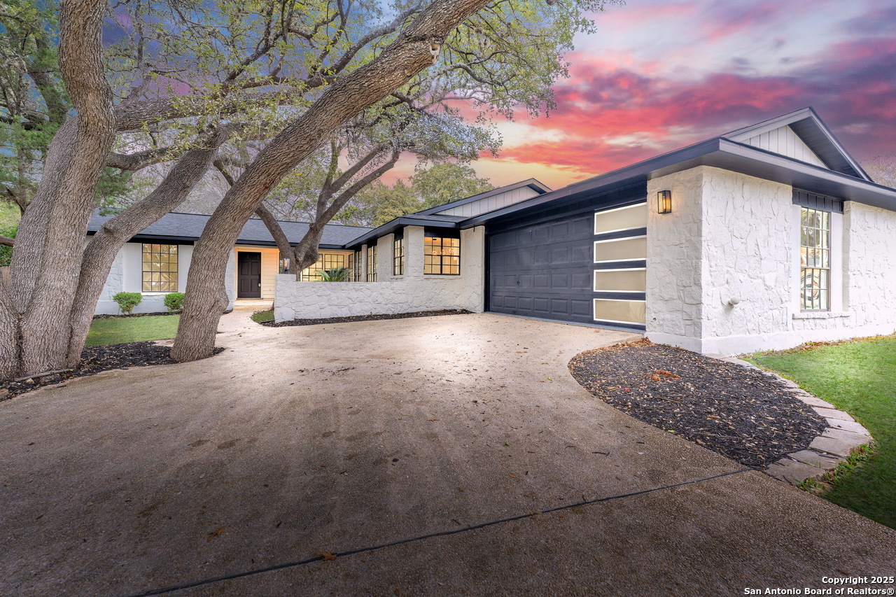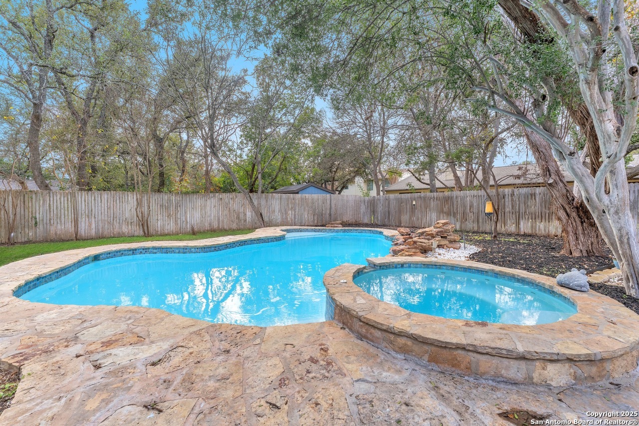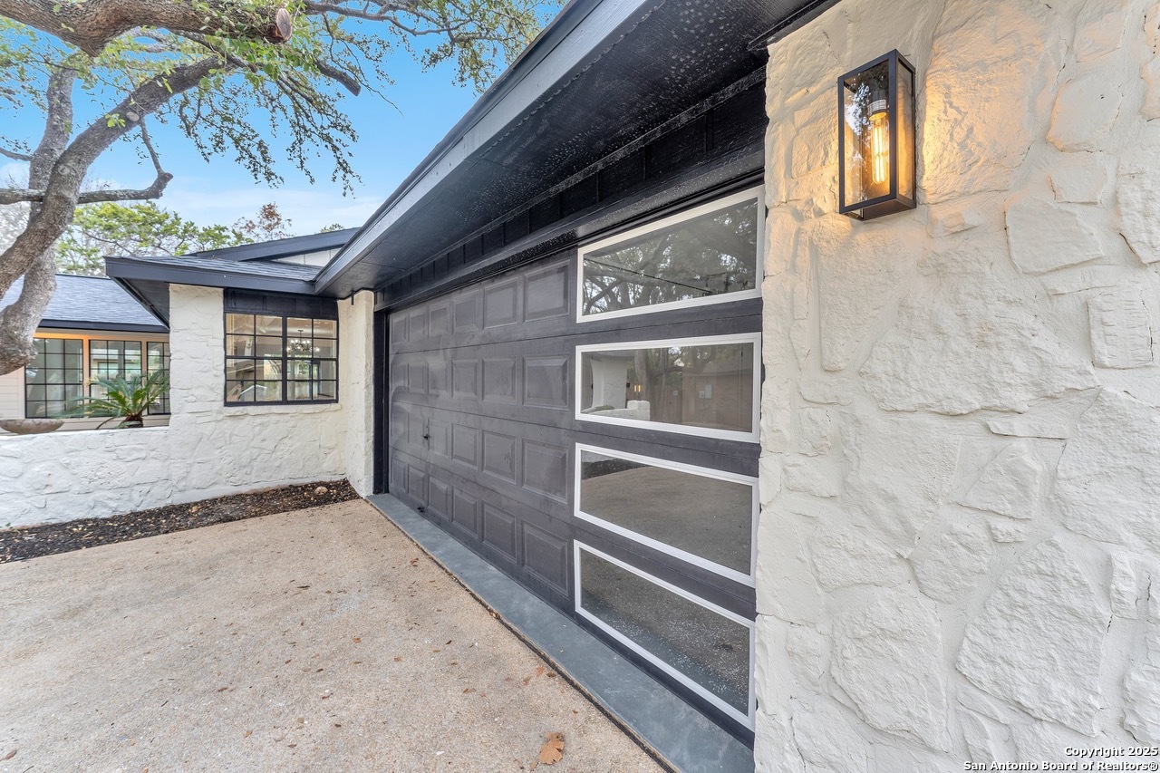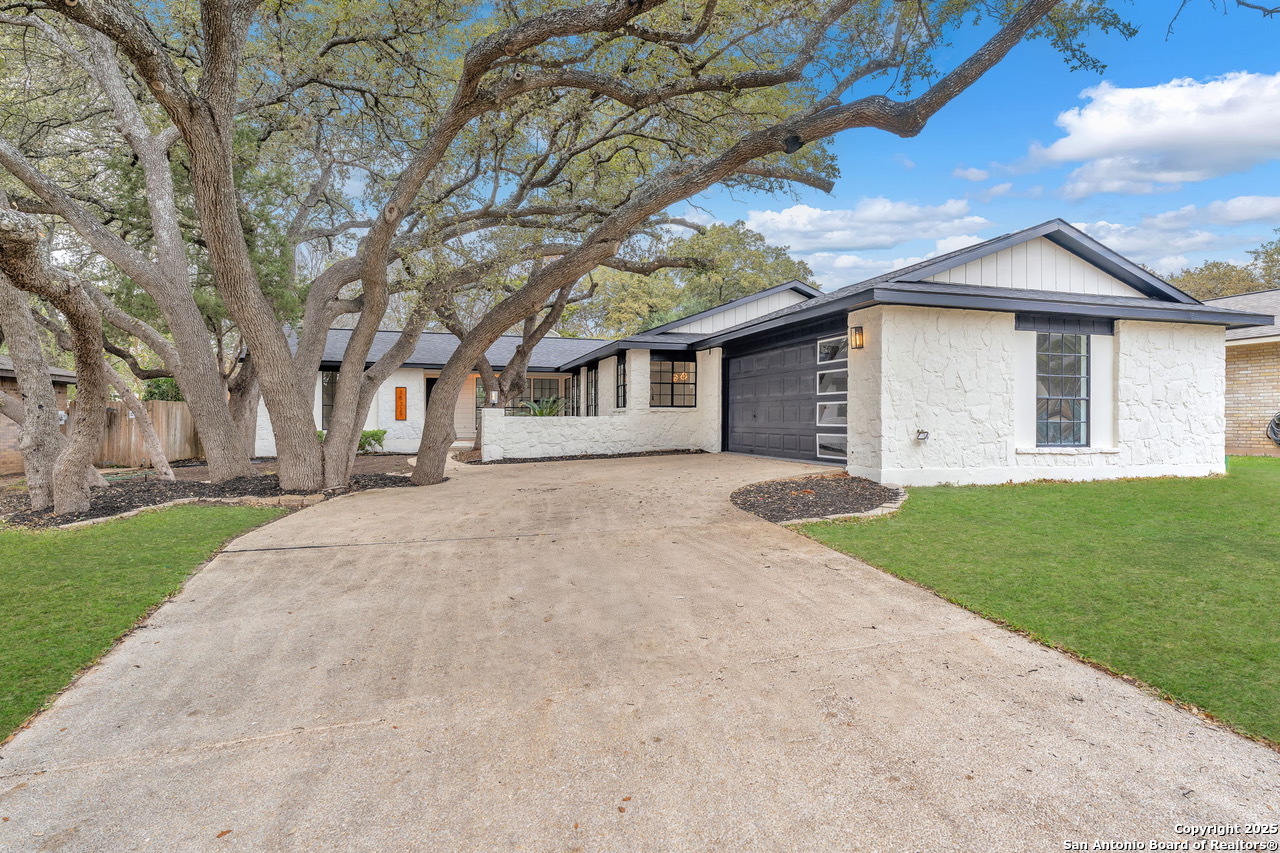 Luxurious 3 bed /2 bath dream home with gorgeous in-ground pool and waterfall spa. Stunningly renovated, this modern, light-filled showcase has an open living layout with breathtaking scenic windows. Dramatic living room is the perfect entertaining space with gas fireplace and pool views. Focal point is the beautifully sleek monochromatic kitchen with large island. Kitchen features include quartz countertops, marbleized backsplash, floor to ceiling custom cabinetry, statement chandelier, and stainless-steel appliances. Relax in style in glamorous primary bedroom suite with vaulted ceiling and walk-in closet. Spa inspired bathroom has black marble tiled walk-in shower and dual vanities. Designer touches throughout home include black and gold light fixtures, black matte hardware, and oversized ceiling fans. Luxury laminate flooring throughout. Heated backyard swimming pool with waterfall spa provides a year-round oasis. Covered patio in the lush backyard is ideal for alfresco dining. Renovation improvements include new roof, electrical, plumbing, HVAC, and water heater. Conveniently located in the oak-lined, idyllic Oak Hollow neighborhood, near airport, parks, and shopping. NEISD Schools & No HOA. Fully renovated houses like this rarely come on the market in this neighborhood. Book your showing today!
