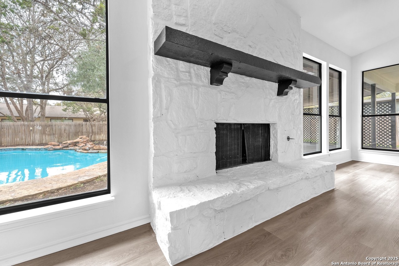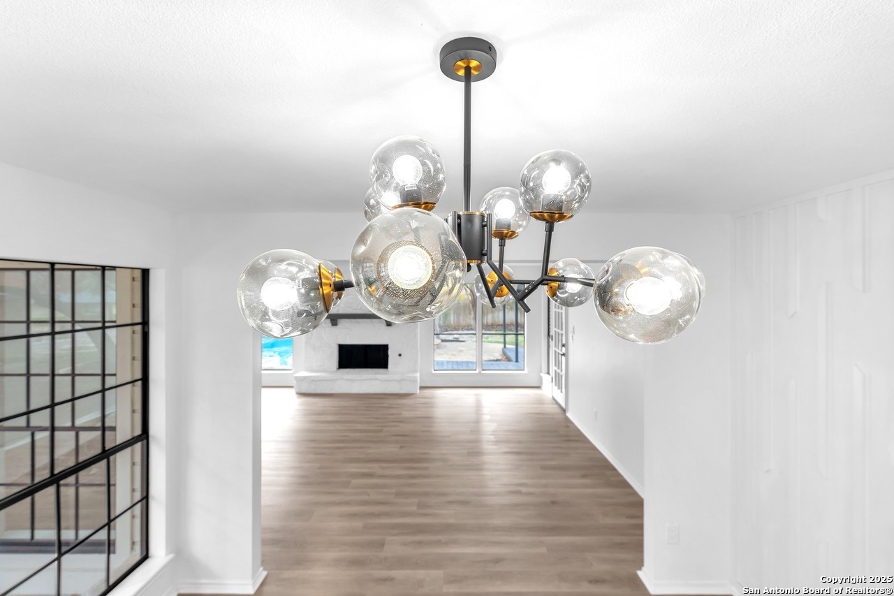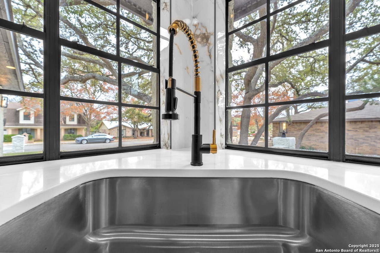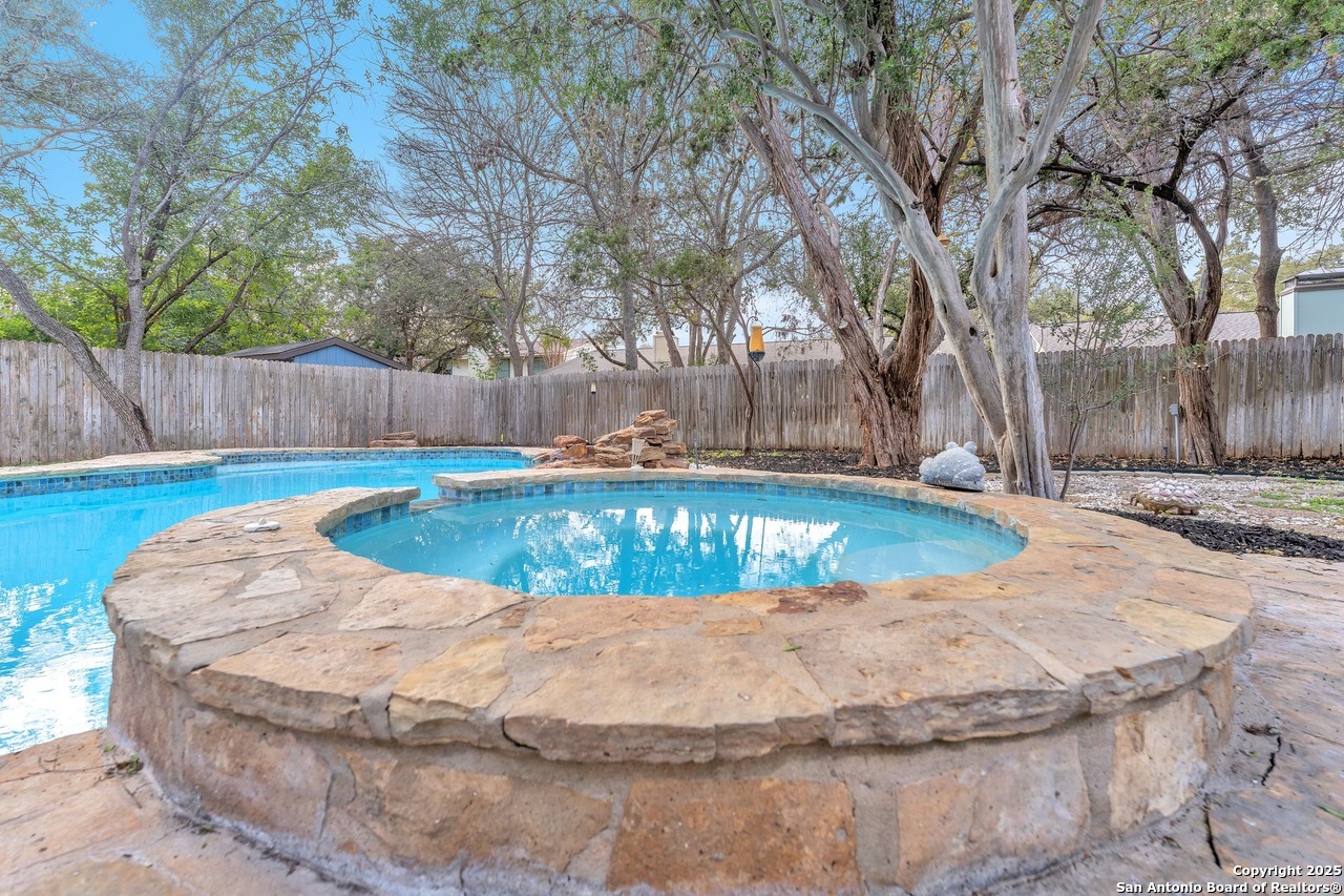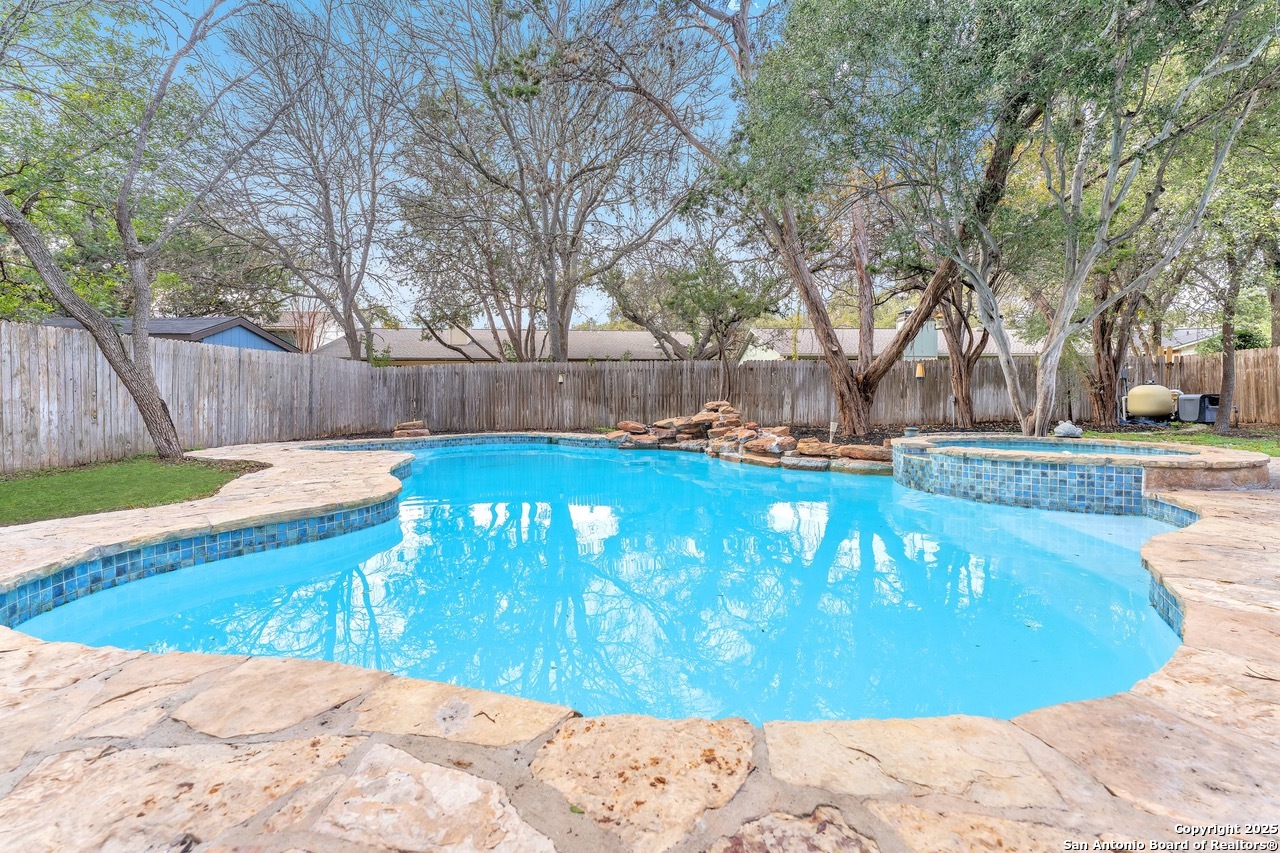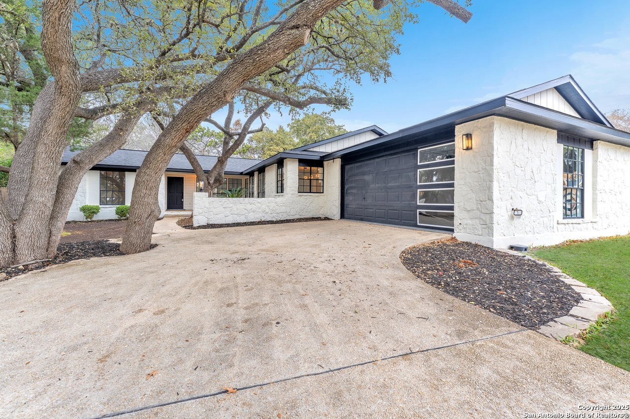 Luxurious 3 bed /2 bath dream home with gorgeous in-ground pool and waterfall spa. Stunningly renovated, this modern, light-filled showcase has an open living layout with breathtaking scenic windows. Dramatic living room is the perfect entertaining space with gas fireplace and pool views. Focal point is the beautifully sleek monochromatic kitchen with large island. Kitchen features include quartz countertops, marbleized backsplash, floor to ceiling custom cabinetry, statement chandelier, and stainless-steel appliances. Relax in style in glamorous primary bedroom suite with vaulted ceiling and walk-in closet. Spa inspired bathroom has black marble tiled walk-in shower and dual vanities. Designer touches throughout home include black and gold light fixtures, black matte hardware, and oversized ceiling fans. Luxury laminate flooring throughout. Heated backyard swimming pool with waterfall spa provides a year-round oasis. Covered patio in the lush backyard is ideal for alfresco dining. Renovation improvements include new roof, electrical, plumbing, HVAC, and water heater. Conveniently located in the oak-lined, idyllic Oak Hollow neighborhood, near airport, parks, and shopping. NEISD Schools & No HOA. Fully renovated houses like this rarely come on the market in this neighborhood. Book your showing today!