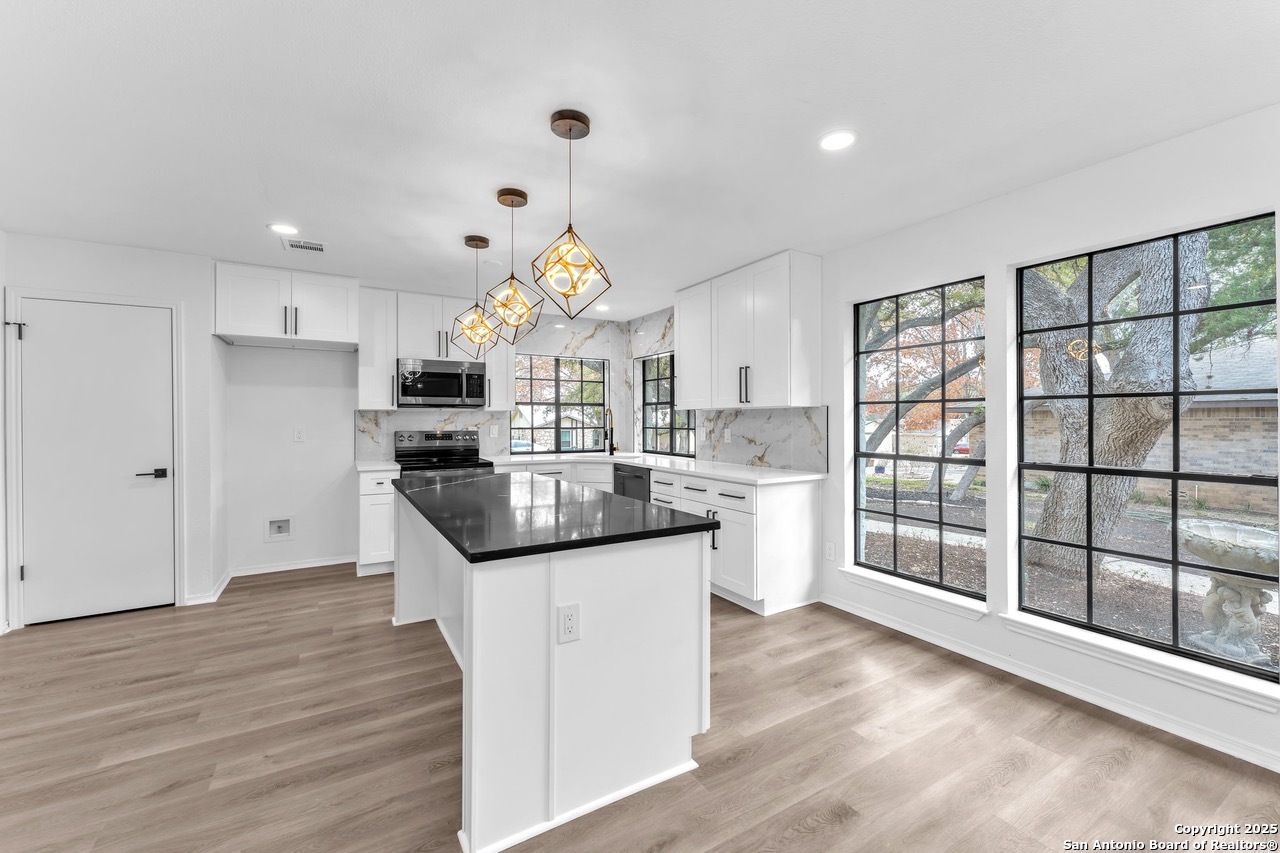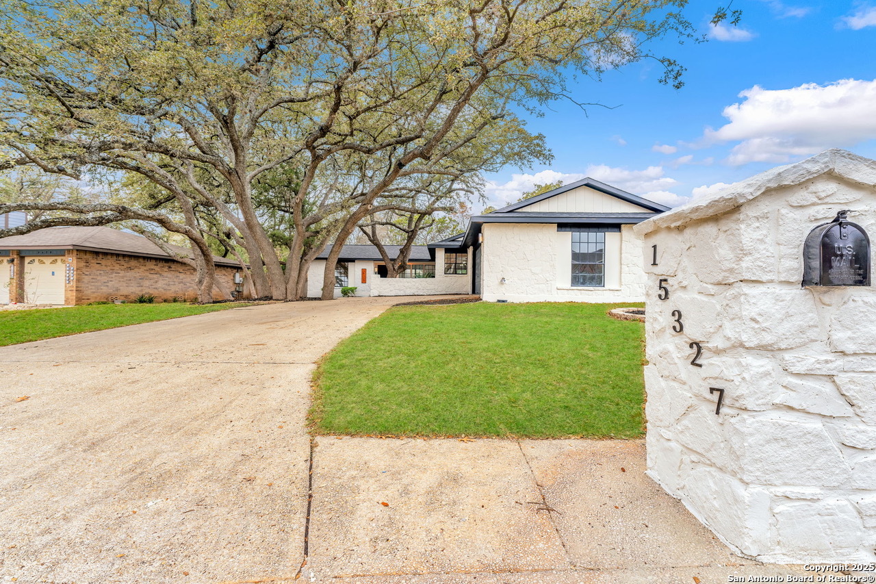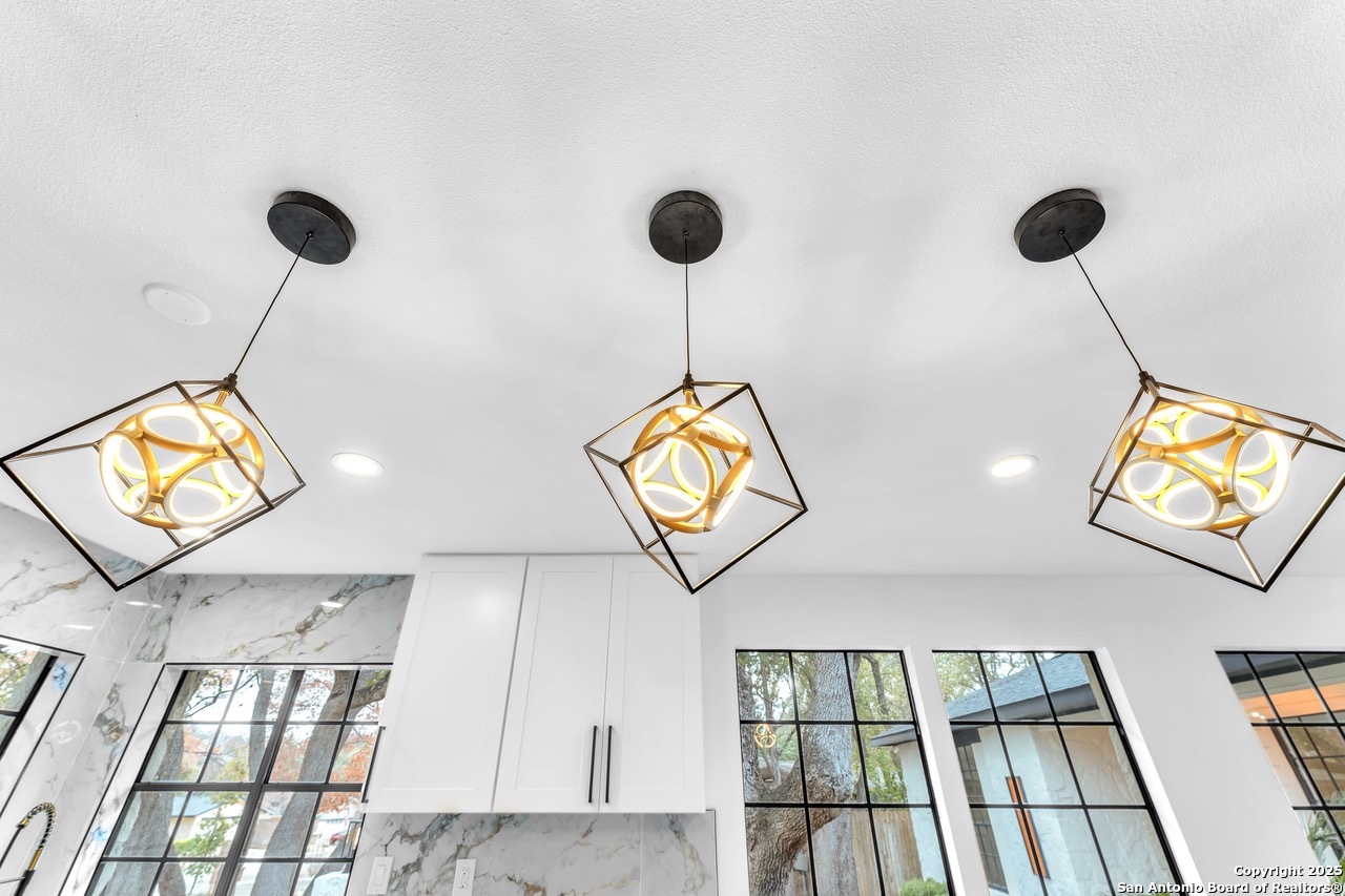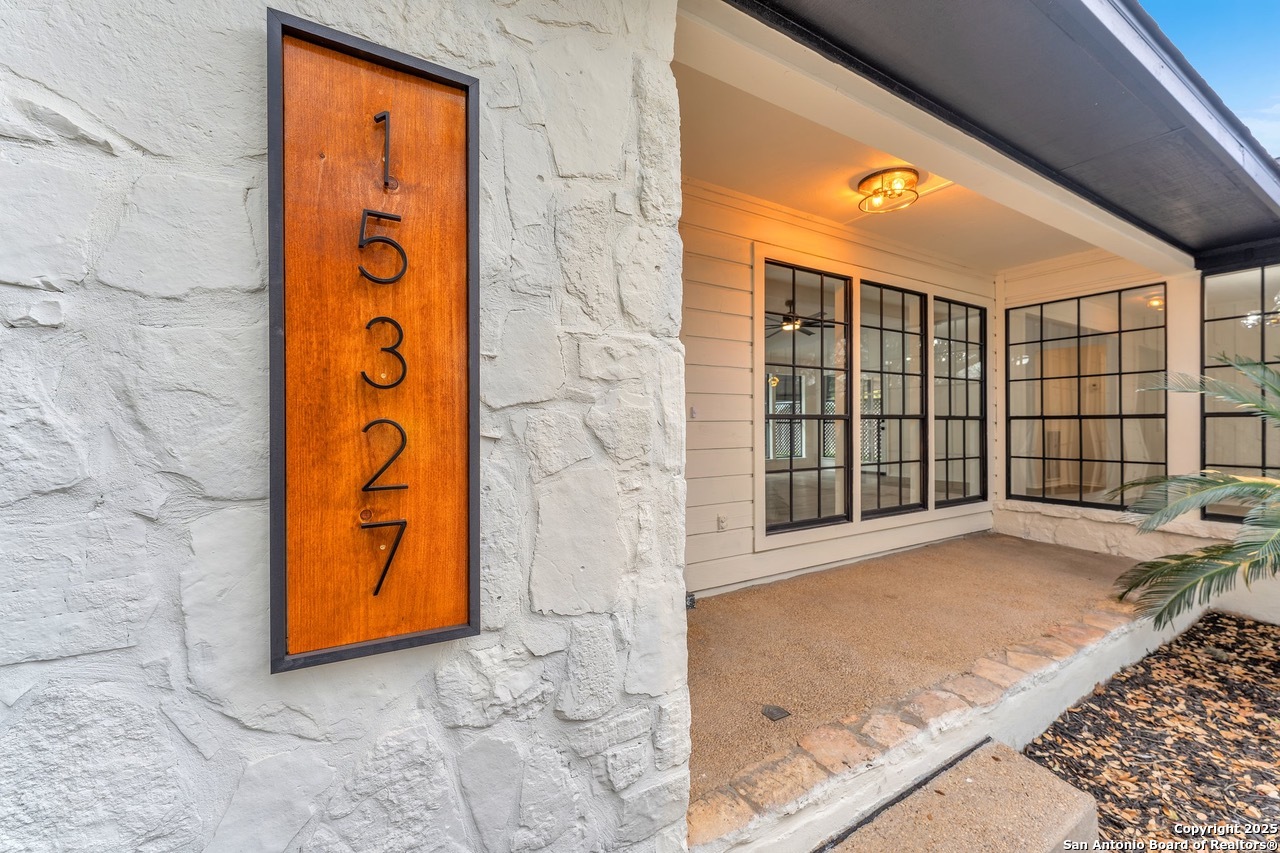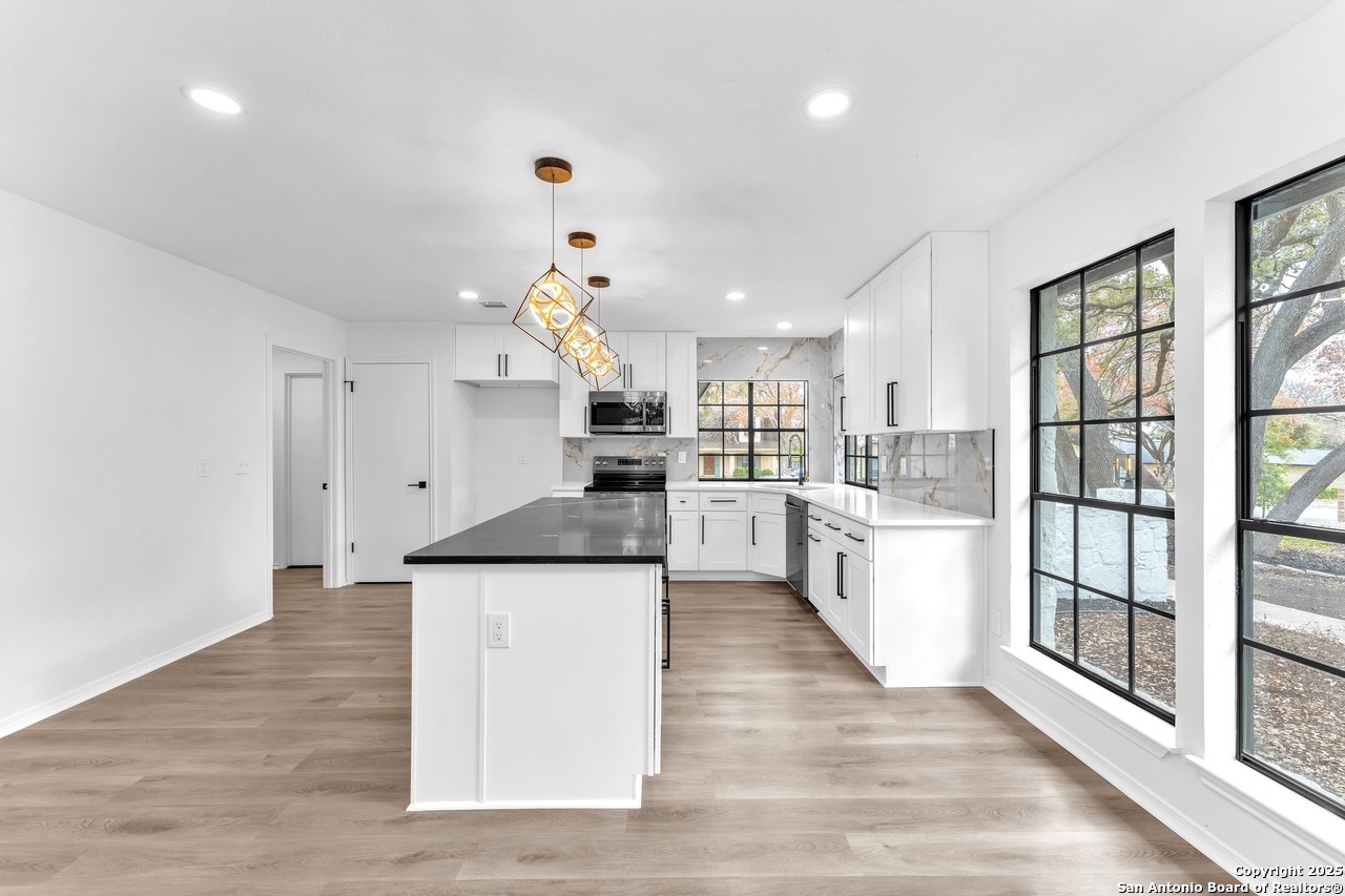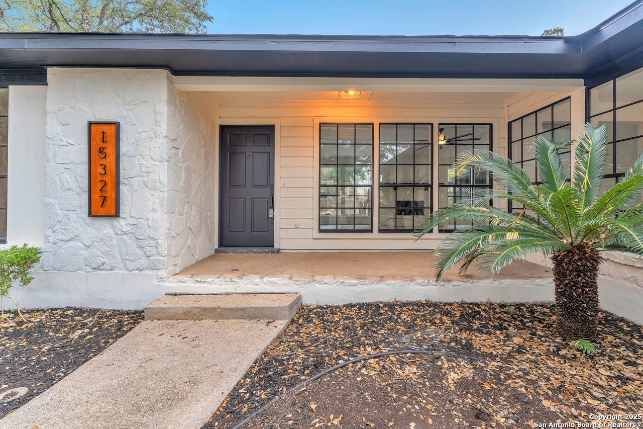 Luxurious 3 bed /2 bath dream home with gorgeous in-ground pool and waterfall spa. Stunningly renovated, this modern, light-filled showcase has an open living layout with breathtaking scenic windows. Dramatic living room is the perfect entertaining space with gas fireplace and pool views. Focal point is the beautifully sleek monochromatic kitchen with large island. Kitchen features include quartz countertops, marbleized backsplash, floor to ceiling custom cabinetry, statement chandelier, and stainless-steel appliances. Relax in style in glamorous primary bedroom suite with vaulted ceiling and walk-in closet. Spa inspired bathroom has black marble tiled walk-in shower and dual vanities. Designer touches throughout home include black and gold light fixtures, black matte hardware, and oversized ceiling fans. Luxury laminate flooring throughout. Heated backyard swimming pool with waterfall spa provides a year-round oasis. Covered patio in the lush backyard is ideal for alfresco dining. Renovation improvements include new roof, electrical, plumbing, HVAC, and water heater. Conveniently located in the oak-lined, idyllic Oak Hollow neighborhood, near airport, parks, and shopping. NEISD Schools & No HOA. Fully renovated houses like this rarely come on the market in this neighborhood. Book your showing today!