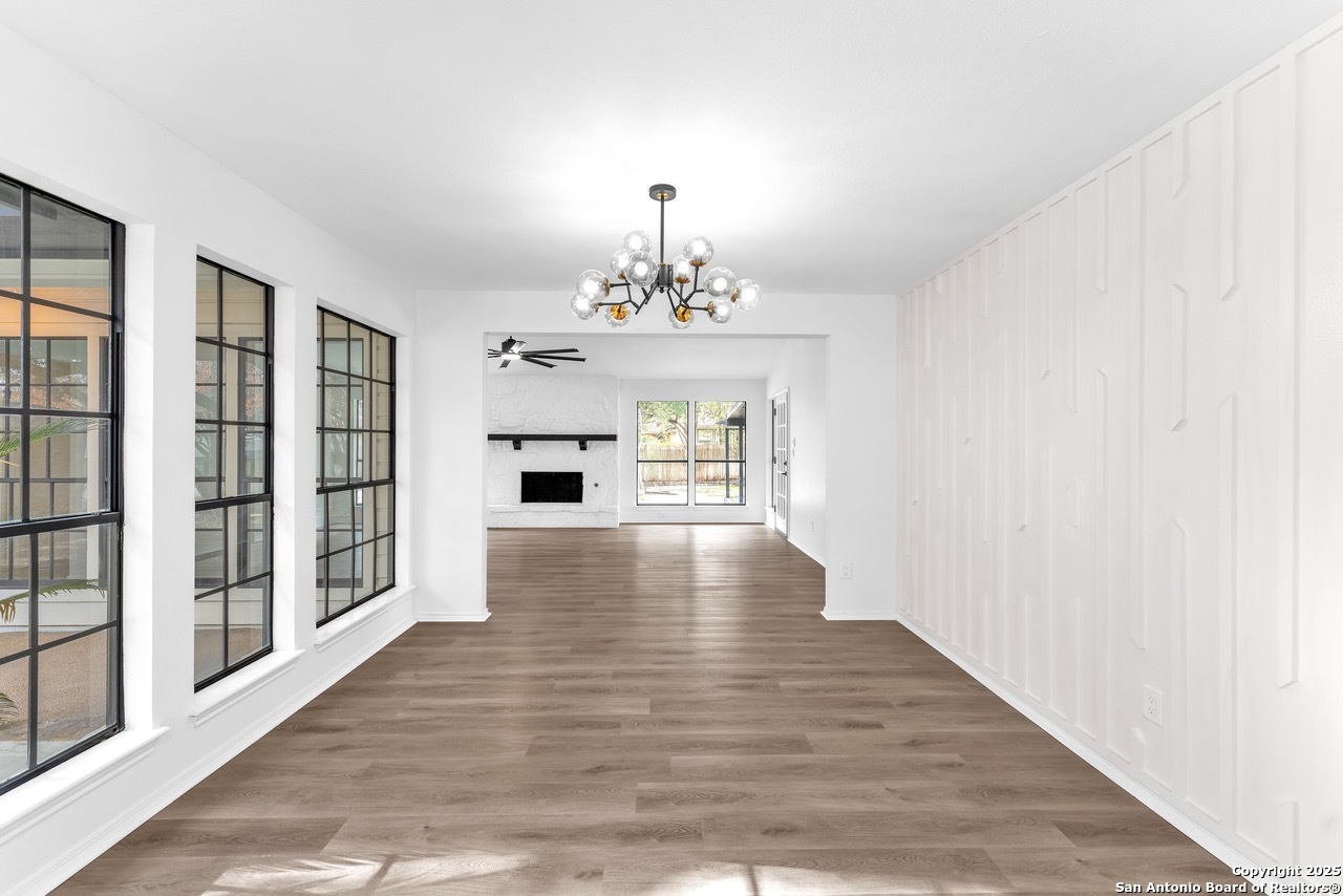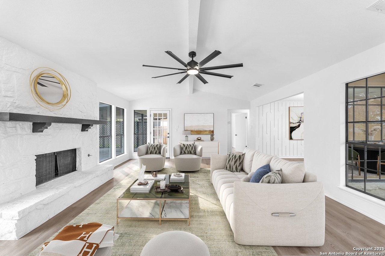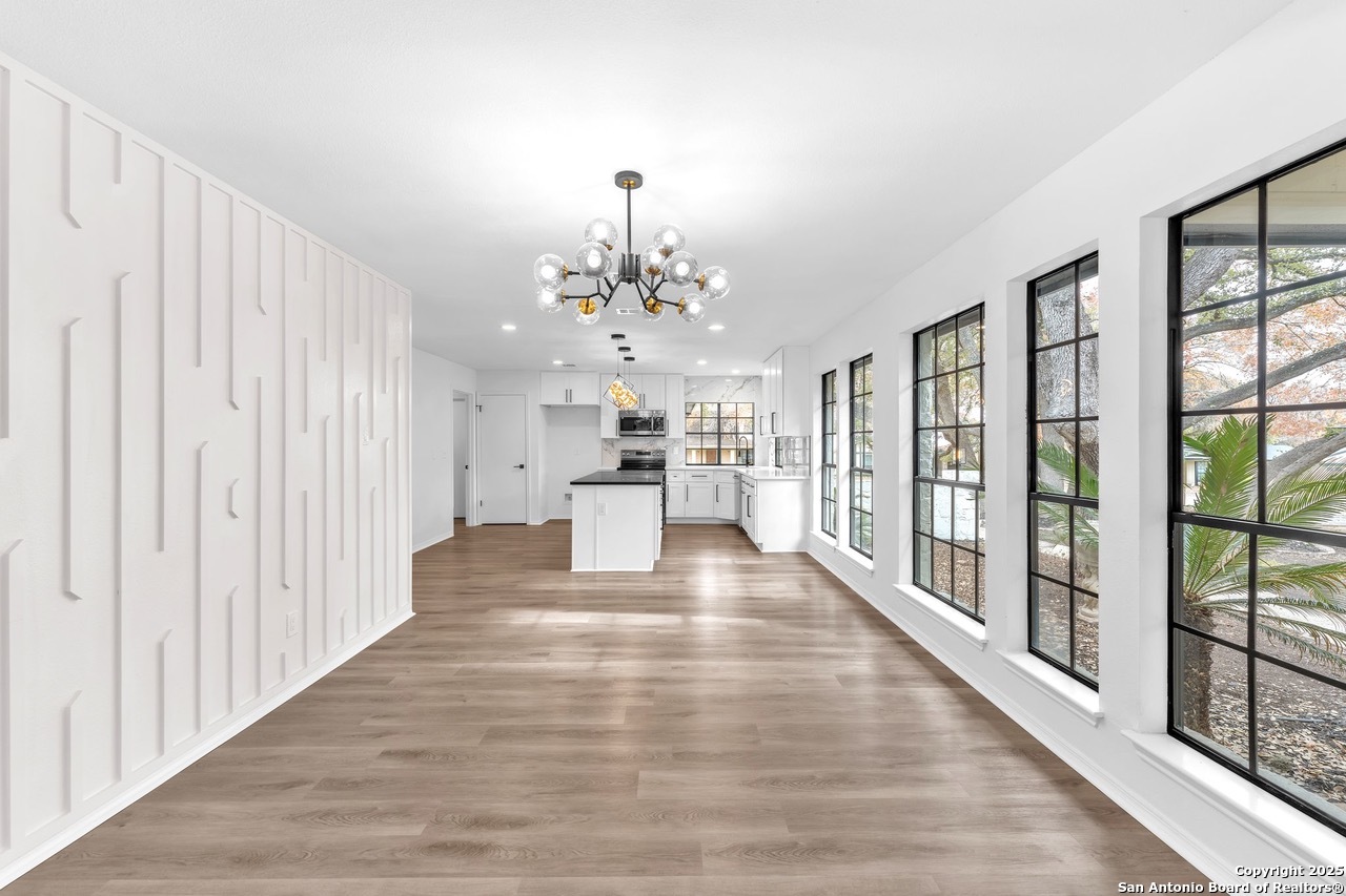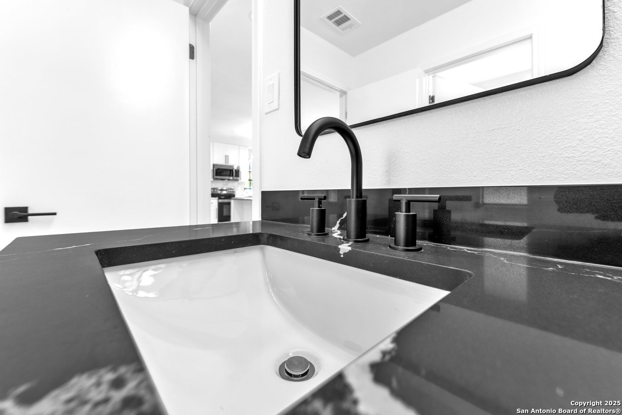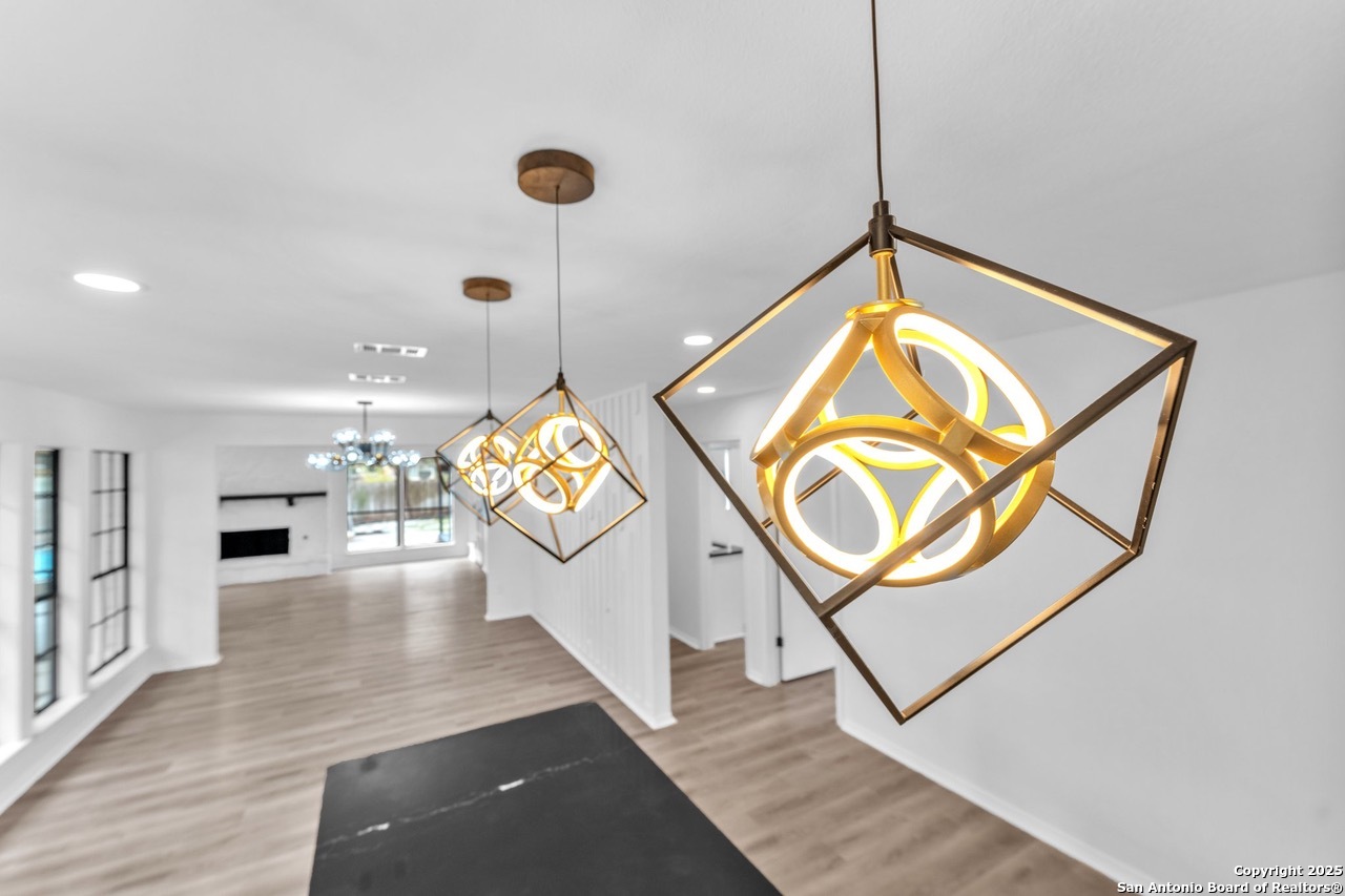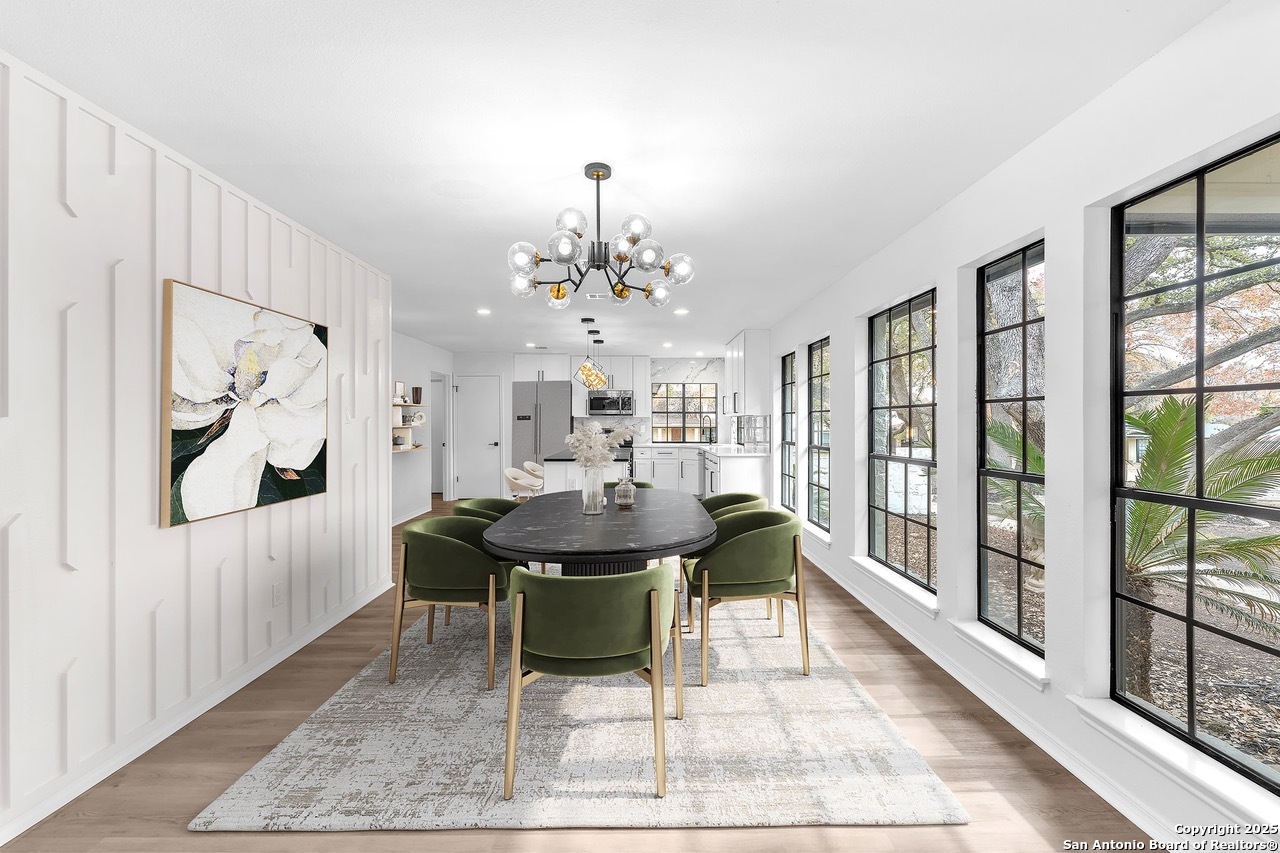 Luxurious 3 bed /2 bath dream home with gorgeous in-ground pool and waterfall spa. Stunningly renovated, this modern, light-filled showcase has an open living layout with breathtaking scenic windows. Dramatic living room is the perfect entertaining space with gas fireplace and pool views. Focal point is the beautifully sleek monochromatic kitchen with large island. Kitchen features include quartz countertops, marbleized backsplash, floor to ceiling custom cabinetry, statement chandelier, and stainless-steel appliances. Relax in style in glamorous primary bedroom suite with vaulted ceiling and walk-in closet. Spa inspired bathroom has black marble tiled walk-in shower and dual vanities. Designer touches throughout home include black and gold light fixtures, black matte hardware, and oversized ceiling fans. Luxury laminate flooring throughout. Heated backyard swimming pool with waterfall spa provides a year-round oasis. Covered patio in the lush backyard is ideal for alfresco dining. Renovation improvements include new roof, electrical, plumbing, HVAC, and water heater. Conveniently located in the oak-lined, idyllic Oak Hollow neighborhood, near airport, parks, and shopping. NEISD Schools & No HOA. Fully renovated houses like this rarely come on the market in this neighborhood. Book your showing today!