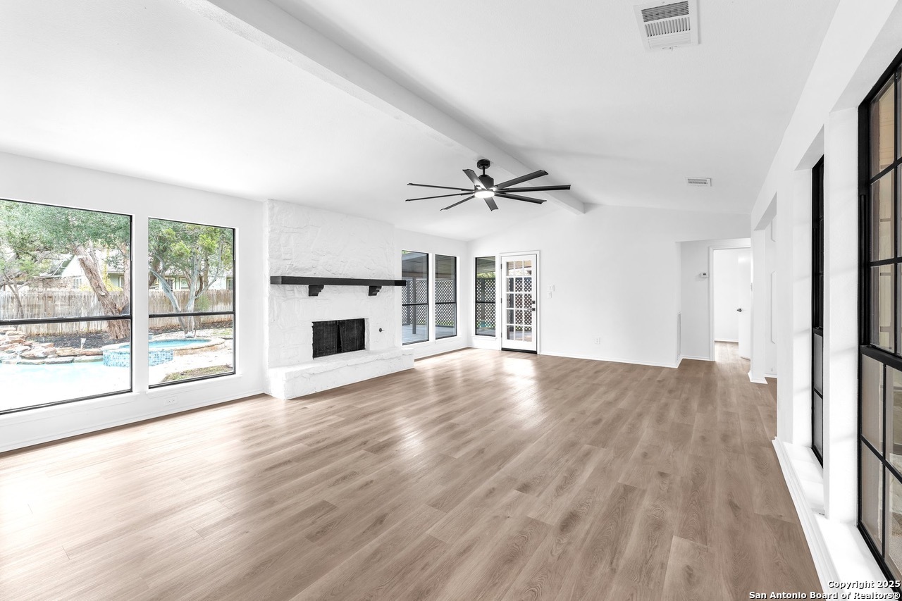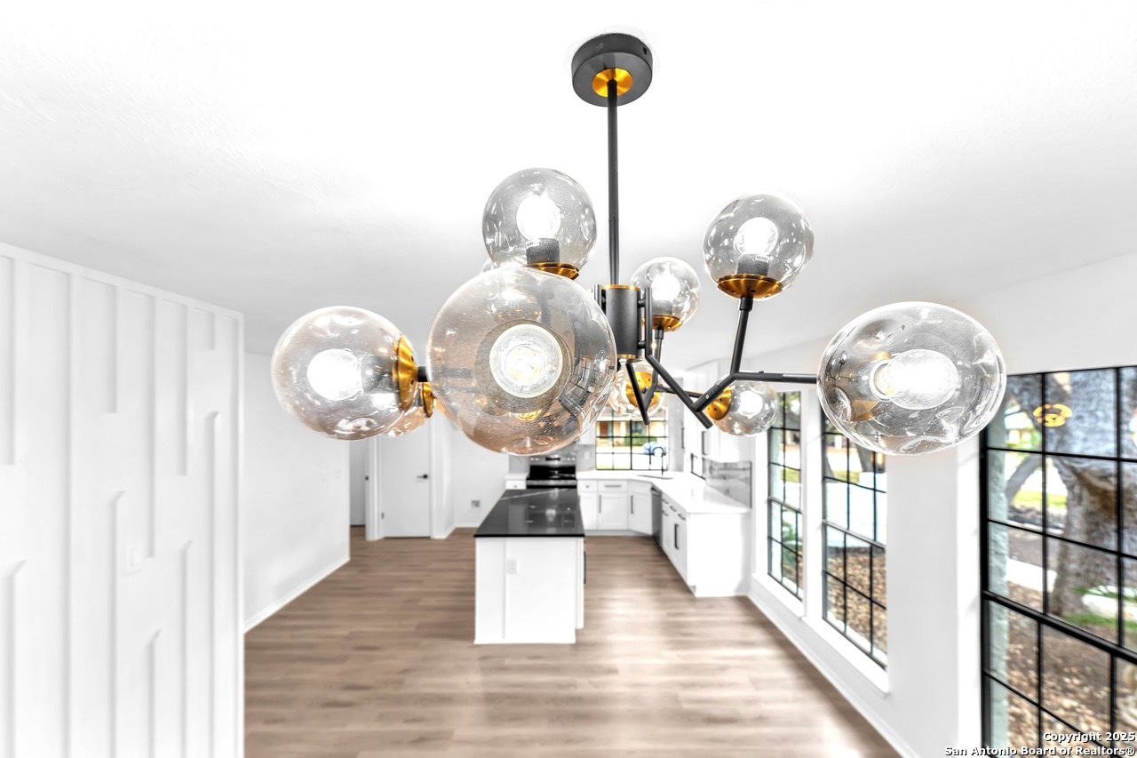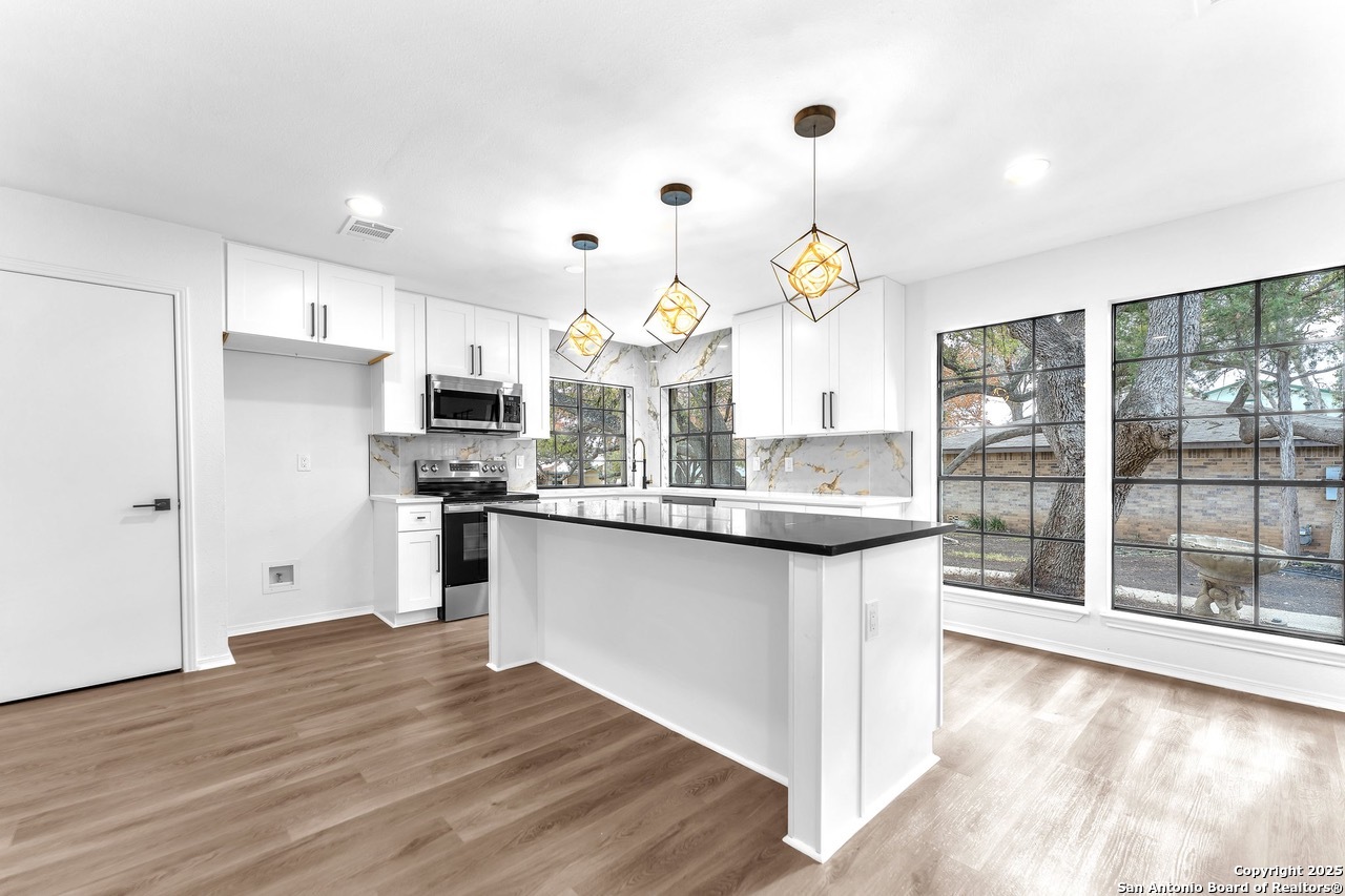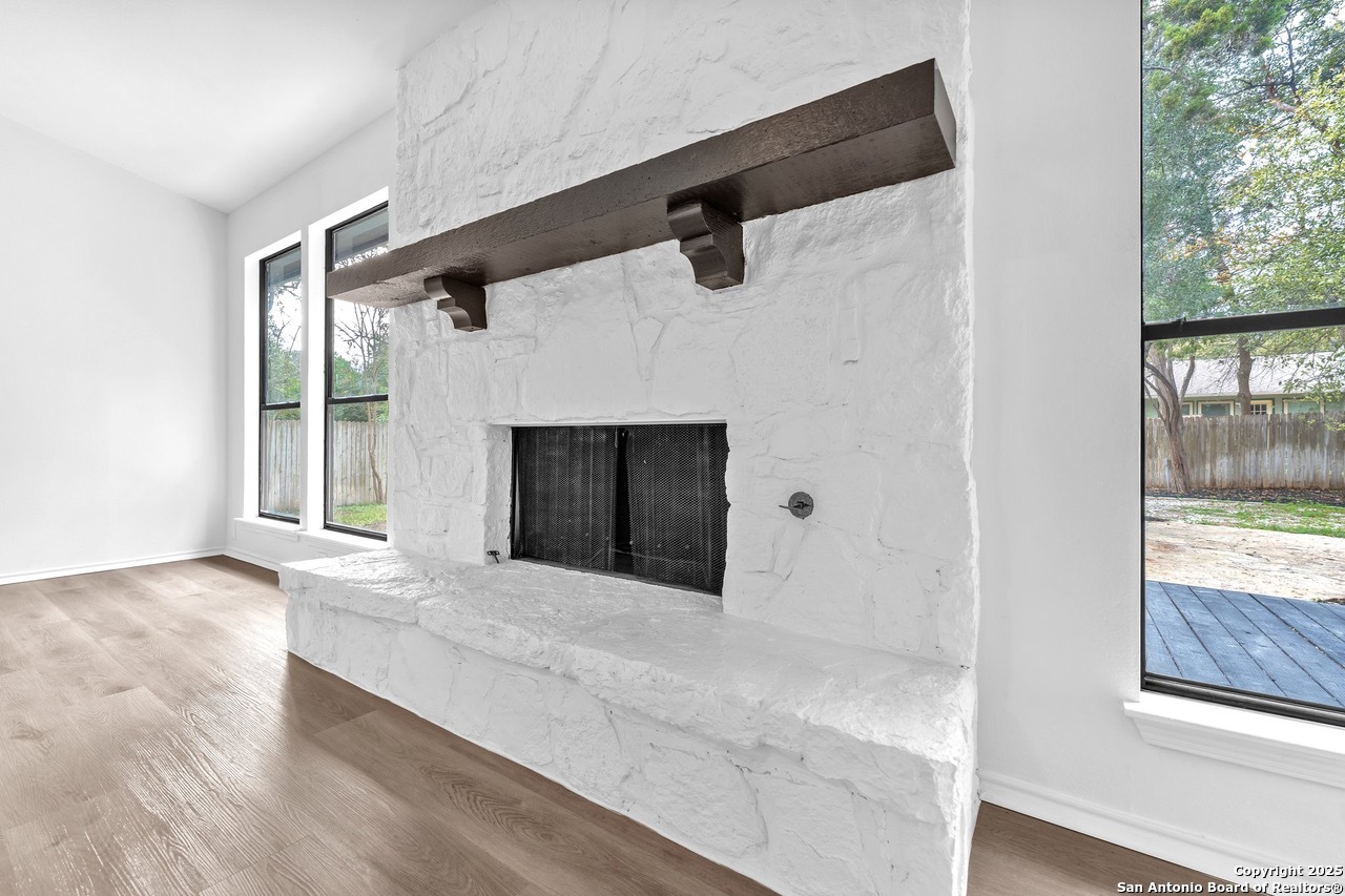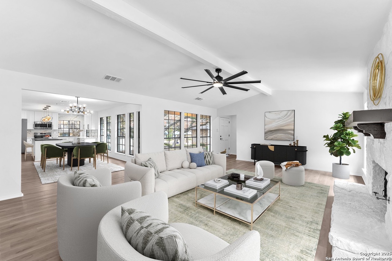 Luxurious 3 bed /2 bath dream home with gorgeous in-ground pool and waterfall spa. Stunningly renovated, this modern, light-filled showcase has an open living layout with breathtaking scenic windows. Dramatic living room is the perfect entertaining space with gas fireplace and pool views. Focal point is the beautifully sleek monochromatic kitchen with large island. Kitchen features include quartz countertops, marbleized backsplash, floor to ceiling custom cabinetry, statement chandelier, and stainless-steel appliances. Relax in style in glamorous primary bedroom suite with vaulted ceiling and walk-in closet. Spa inspired bathroom has black marble tiled walk-in shower and dual vanities. Designer touches throughout home include black and gold light fixtures, black matte hardware, and oversized ceiling fans. Luxury laminate flooring throughout. Heated backyard swimming pool with waterfall spa provides a year-round oasis. Covered patio in the lush backyard is ideal for alfresco dining. Renovation improvements include new roof, electrical, plumbing, HVAC, and water heater. Conveniently located in the oak-lined, idyllic Oak Hollow neighborhood, near airport, parks, and shopping. NEISD Schools & No HOA. Fully renovated houses like this rarely come on the market in this neighborhood. Book your showing today!