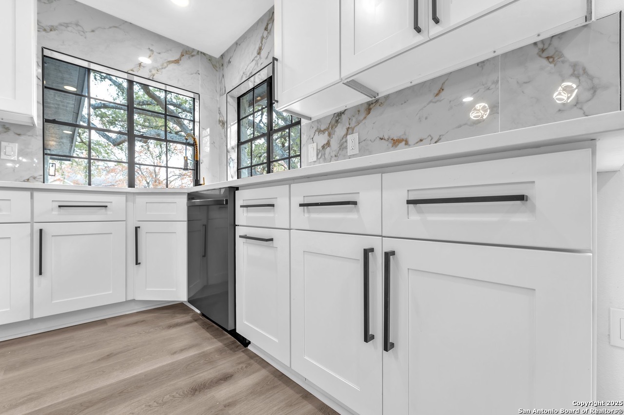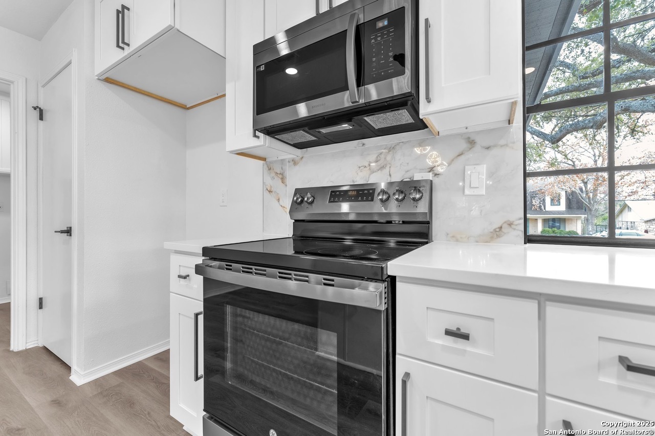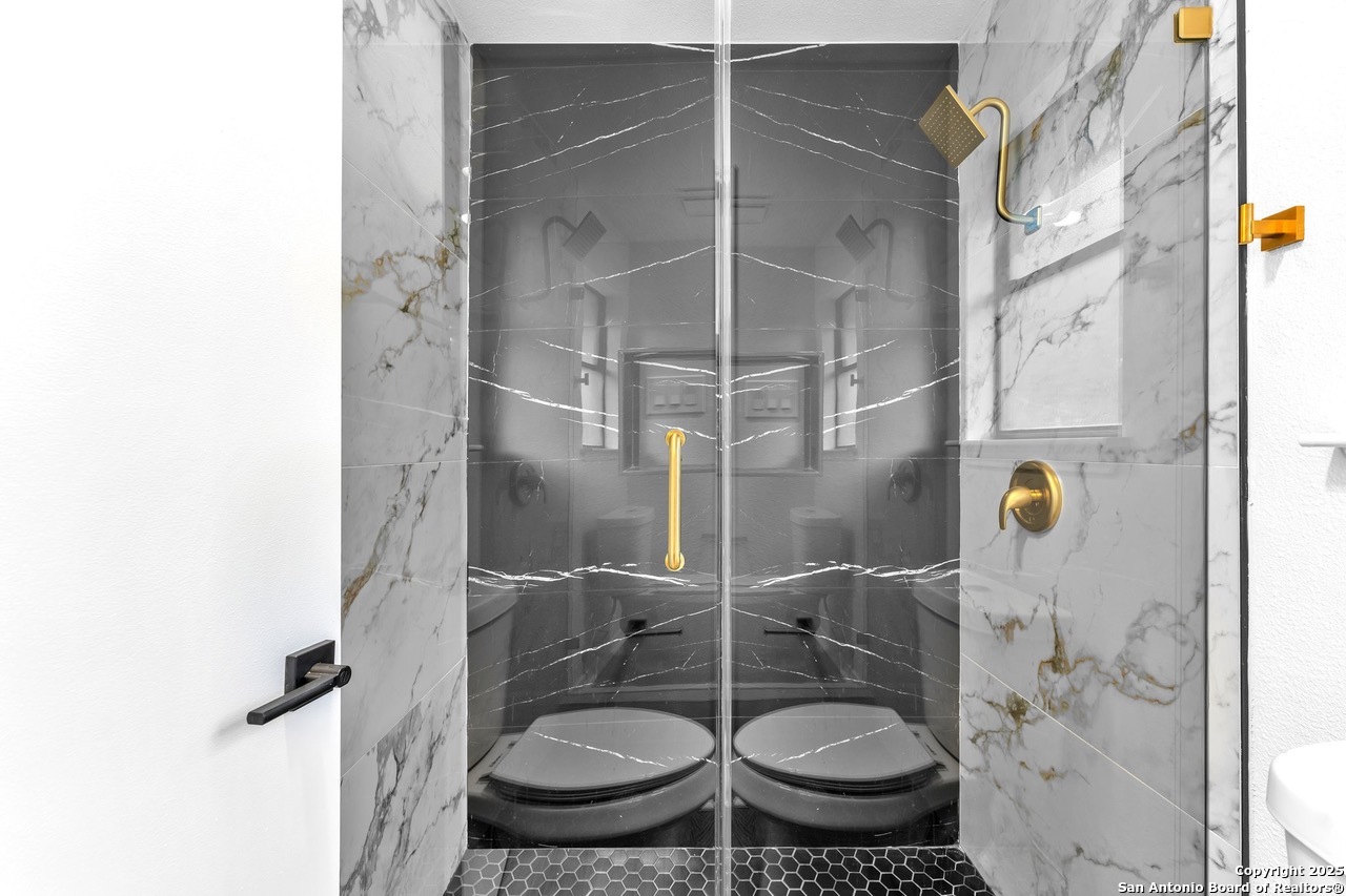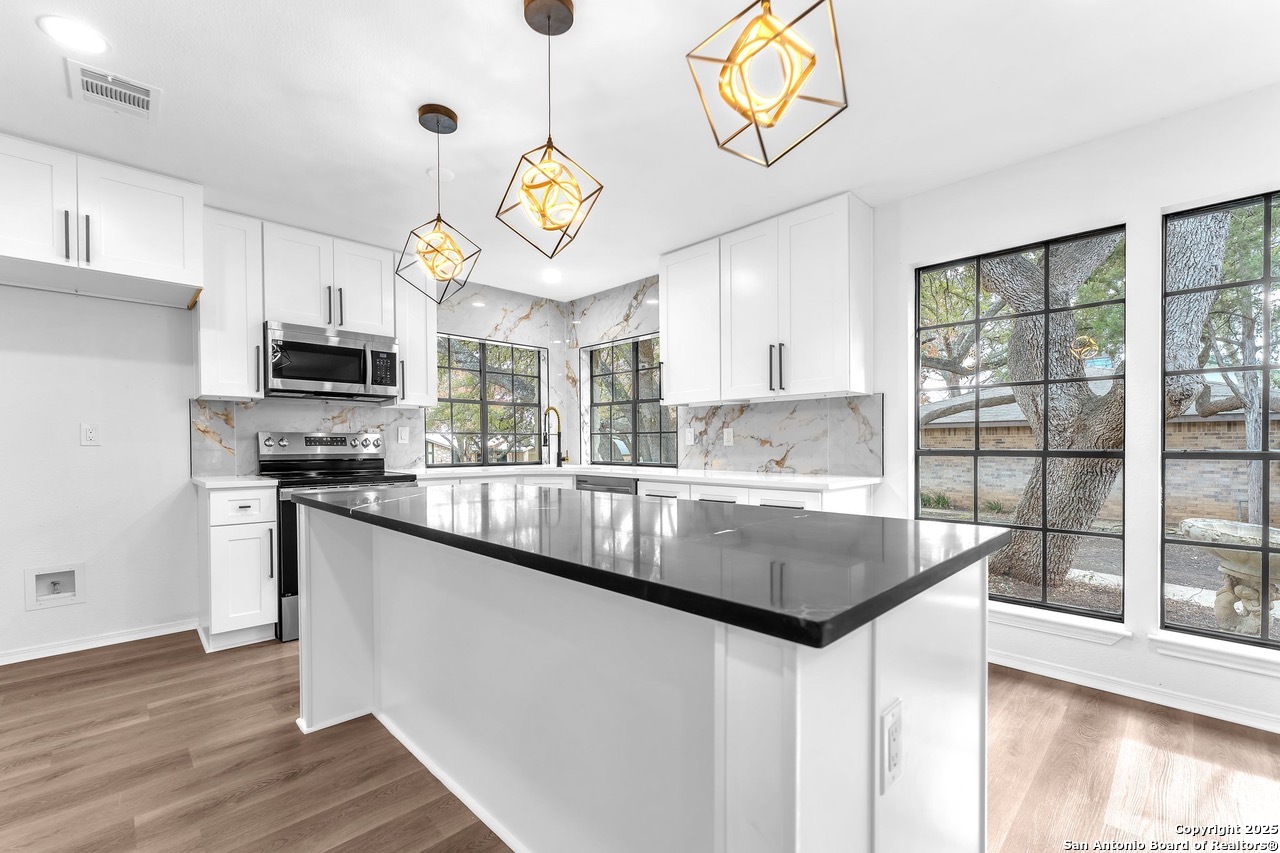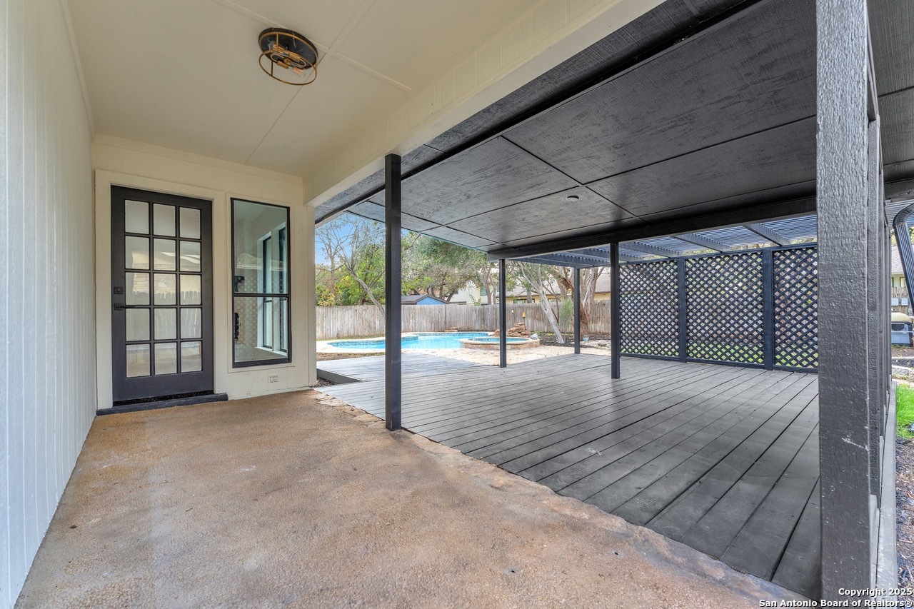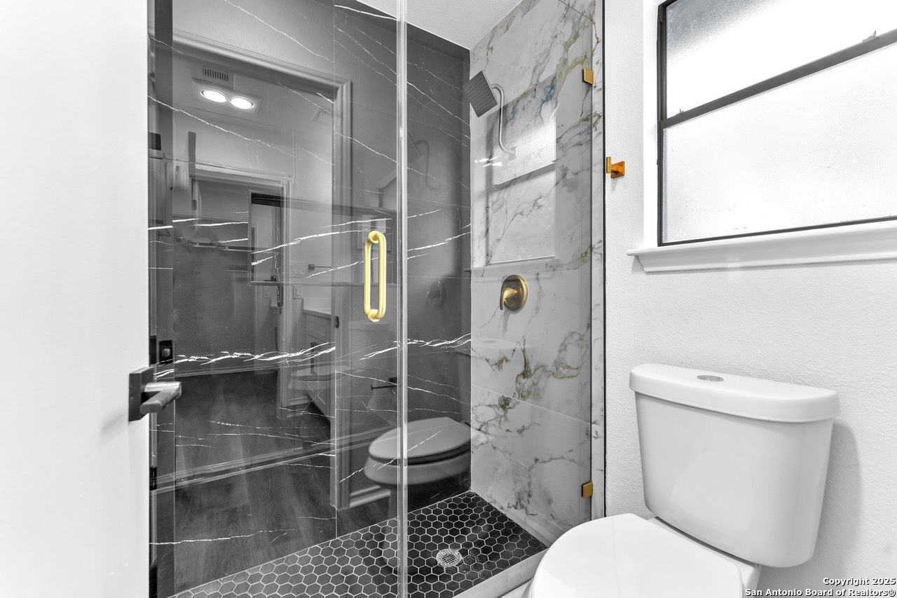 Luxurious 3 bed /2 bath dream home with gorgeous in-ground pool and waterfall spa. Stunningly renovated, this modern, light-filled showcase has an open living layout with breathtaking scenic windows. Dramatic living room is the perfect entertaining space with gas fireplace and pool views. Focal point is the beautifully sleek monochromatic kitchen with large island. Kitchen features include quartz countertops, marbleized backsplash, floor to ceiling custom cabinetry, statement chandelier, and stainless-steel appliances. Relax in style in glamorous primary bedroom suite with vaulted ceiling and walk-in closet. Spa inspired bathroom has black marble tiled walk-in shower and dual vanities. Designer touches throughout home include black and gold light fixtures, black matte hardware, and oversized ceiling fans. Luxury laminate flooring throughout. Heated backyard swimming pool with waterfall spa provides a year-round oasis. Covered patio in the lush backyard is ideal for alfresco dining. Renovation improvements include new roof, electrical, plumbing, HVAC, and water heater. Conveniently located in the oak-lined, idyllic Oak Hollow neighborhood, near airport, parks, and shopping. NEISD Schools & No HOA. Fully renovated houses like this rarely come on the market in this neighborhood. Book your showing today!