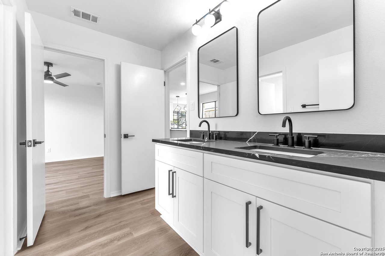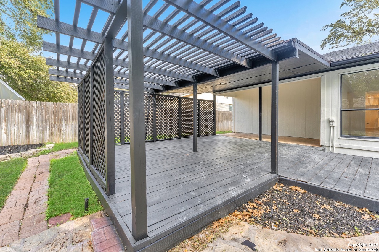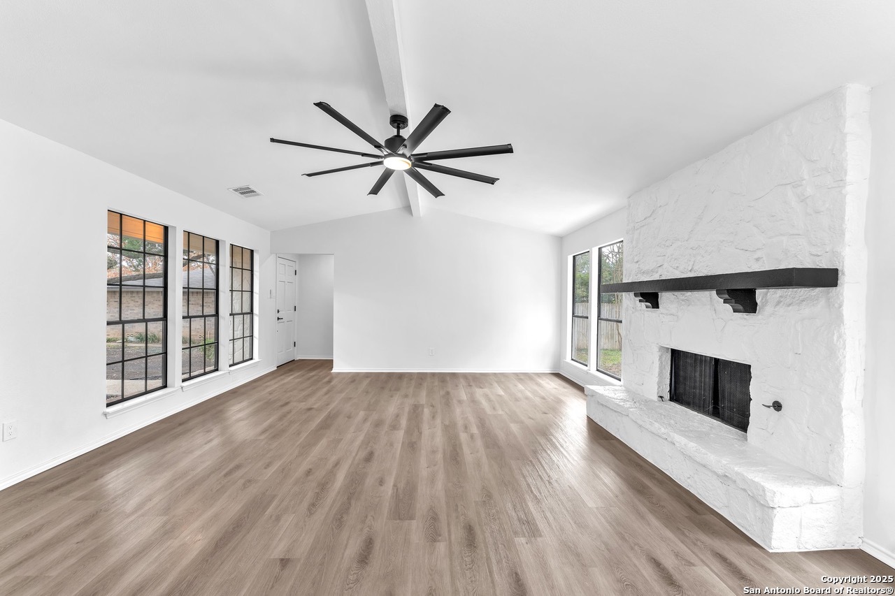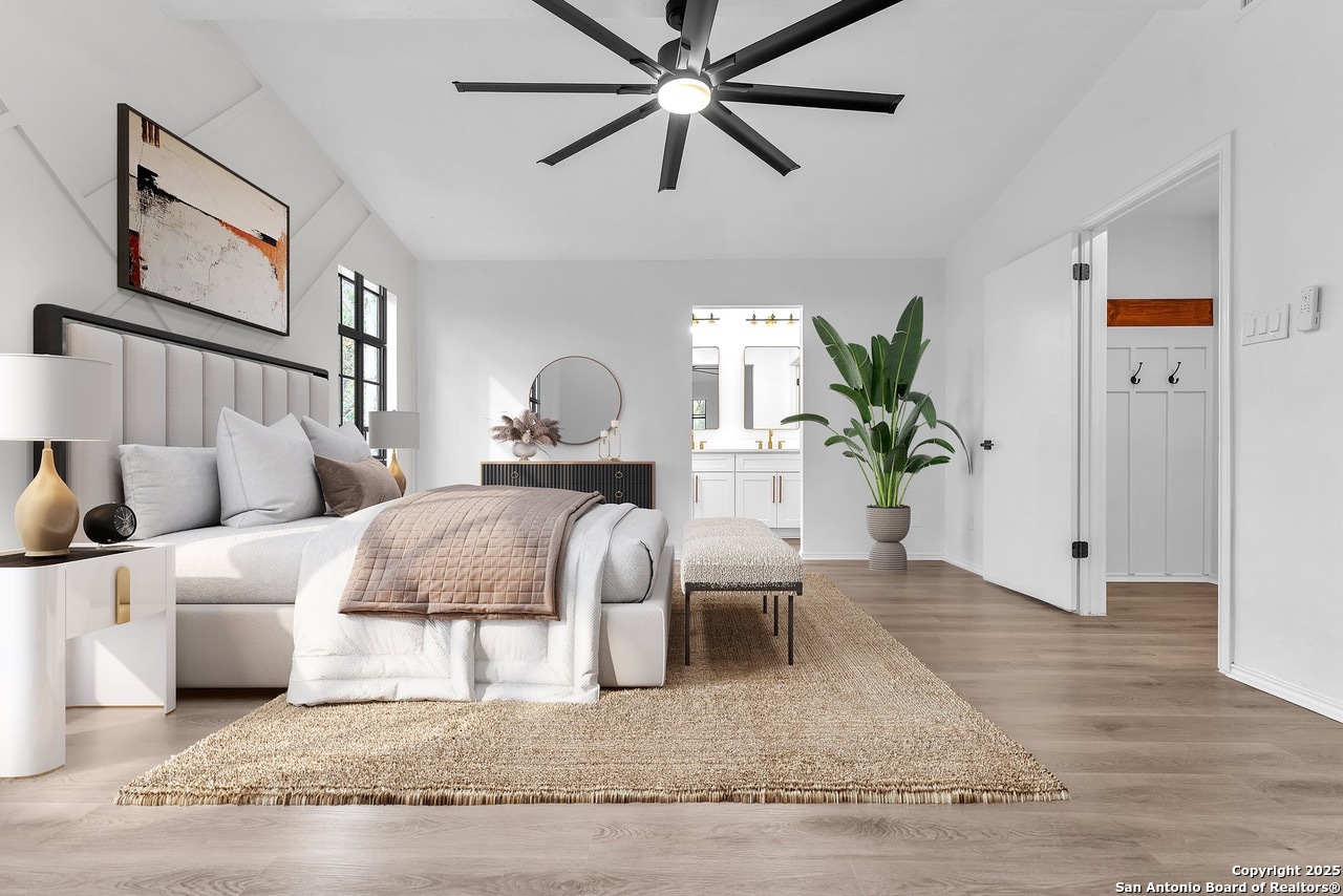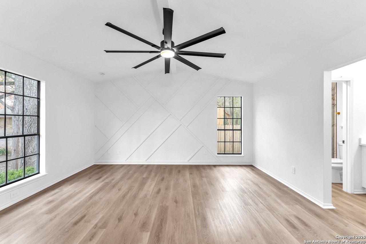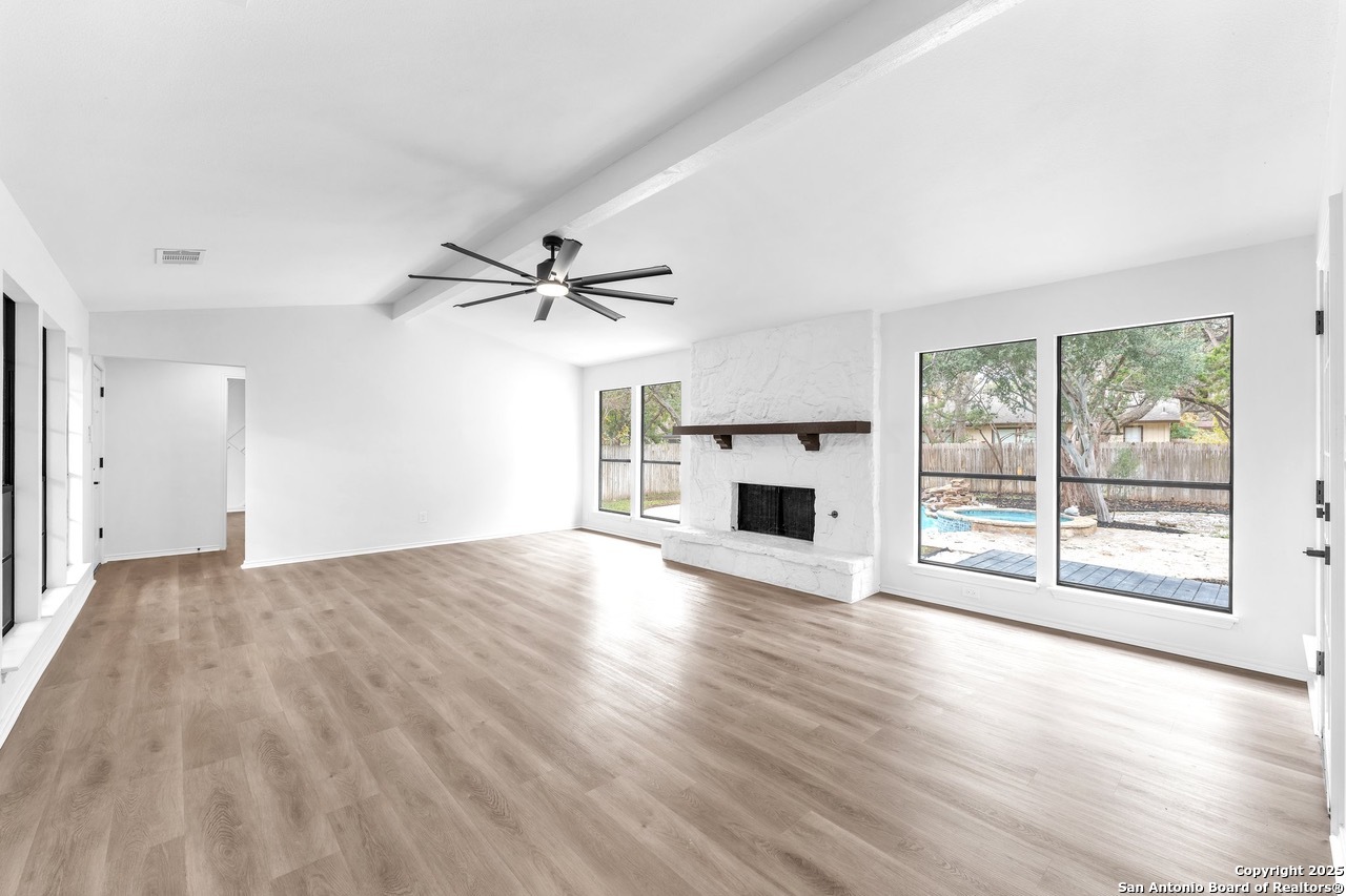Luxurious 3 bed /2 bath dream home with gorgeous in-ground pool and waterfall spa. Stunningly renovated, this modern, light-filled showcase has an open living layout with breathtaking scenic windows. Dramatic living room is the perfect entertaining space with gas fireplace and pool views. Focal point is the beautifully sleek monochromatic kitchen with large island. Kitchen features include quartz countertops, marbleized backsplash, floor to ceiling custom cabinetry, statement chandelier, and stainless-steel appliances. Relax in style in glamorous primary bedroom suite with vaulted ceiling and walk-in closet. Spa inspired bathroom has black marble tiled walk-in shower and dual vanities. Designer touches throughout home include black and gold light fixtures, black matte hardware, and oversized ceiling fans. Luxury laminate flooring throughout. Heated backyard swimming pool with waterfall spa provides a year-round oasis. Covered patio in the lush backyard is ideal for alfresco dining. Renovation improvements include new roof, electrical, plumbing, HVAC, and water heater. Conveniently located in the oak-lined, idyllic Oak Hollow neighborhood, near airport, parks, and shopping. NEISD Schools & No HOA. Fully renovated houses like this rarely come on the market in this neighborhood. Book your showing today!