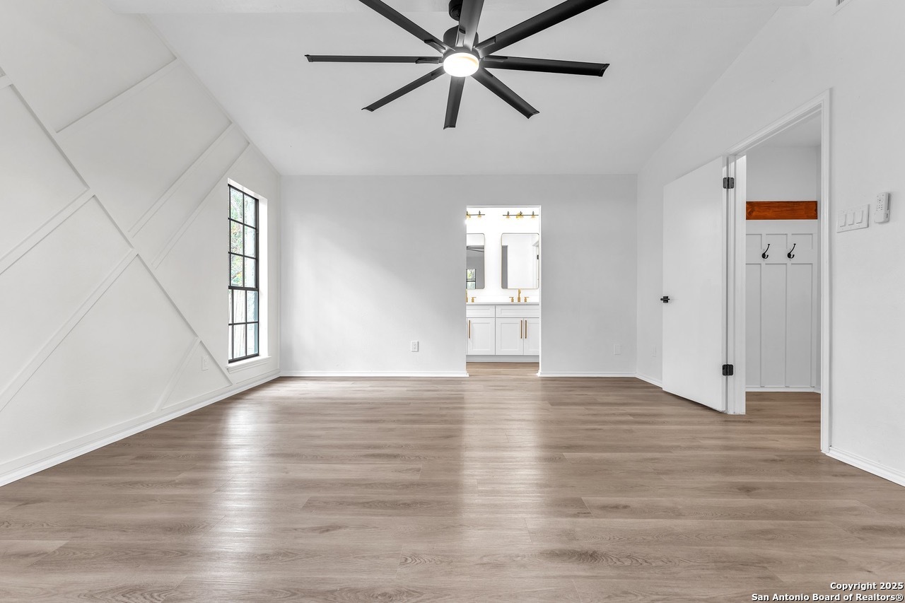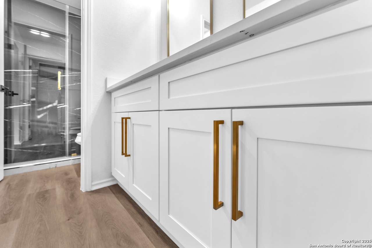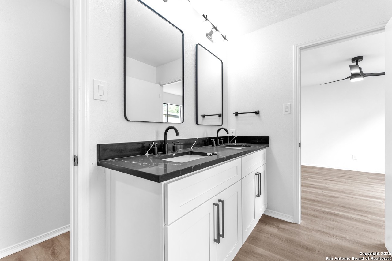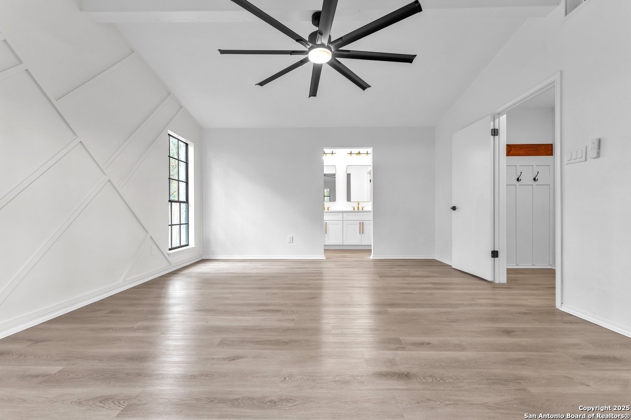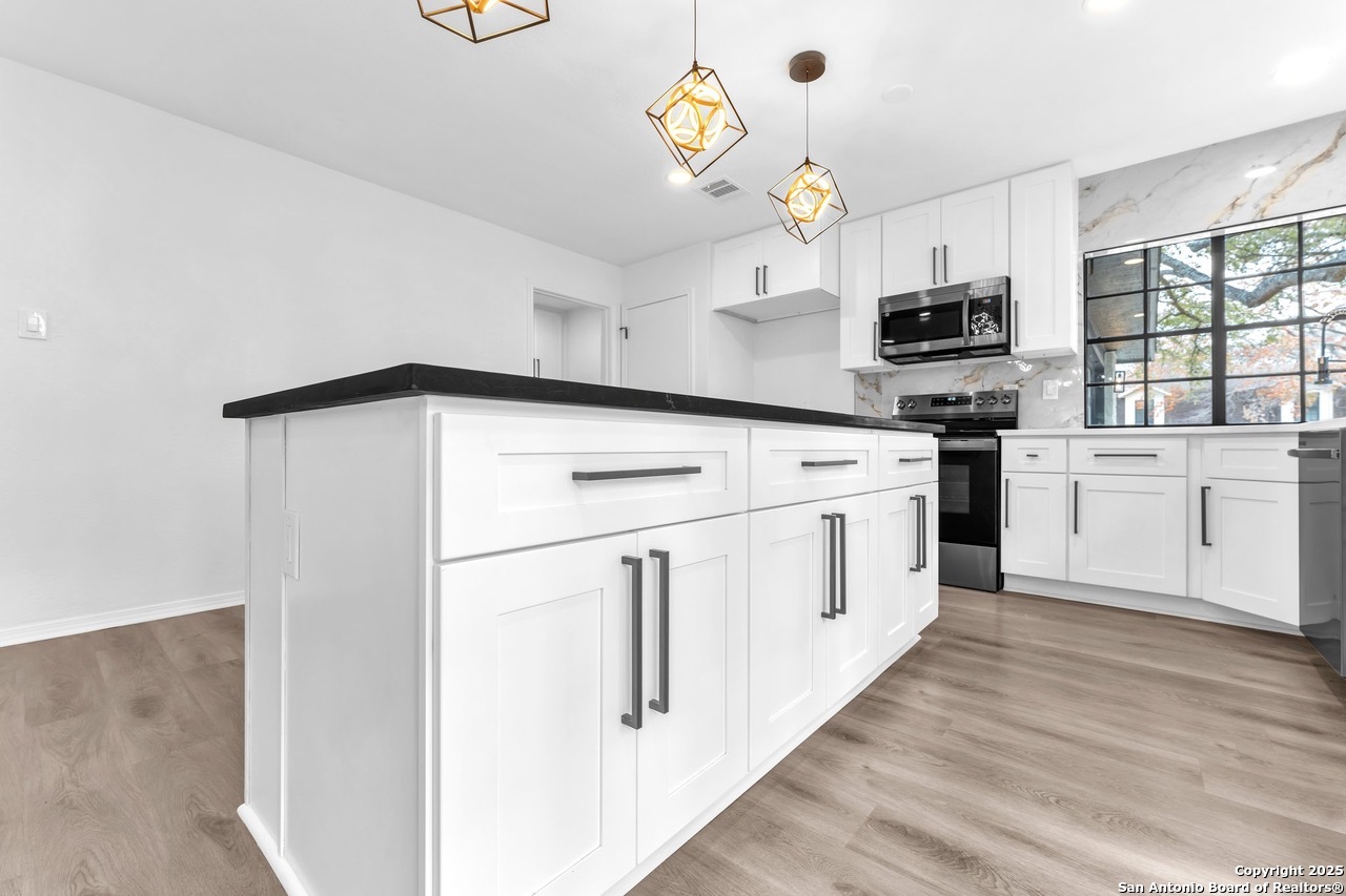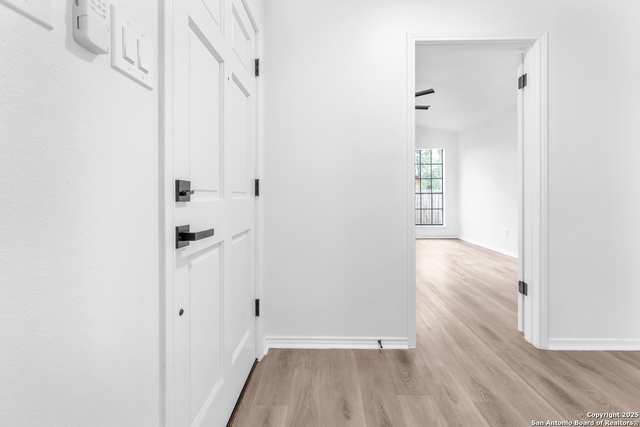 Luxurious 3 bed /2 bath dream home with gorgeous in-ground pool and waterfall spa. Stunningly renovated, this modern, light-filled showcase has an open living layout with breathtaking scenic windows. Dramatic living room is the perfect entertaining space with gas fireplace and pool views. Focal point is the beautifully sleek monochromatic kitchen with large island. Kitchen features include quartz countertops, marbleized backsplash, floor to ceiling custom cabinetry, statement chandelier, and stainless-steel appliances. Relax in style in glamorous primary bedroom suite with vaulted ceiling and walk-in closet. Spa inspired bathroom has black marble tiled walk-in shower and dual vanities. Designer touches throughout home include black and gold light fixtures, black matte hardware, and oversized ceiling fans. Luxury laminate flooring throughout. Heated backyard swimming pool with waterfall spa provides a year-round oasis. Covered patio in the lush backyard is ideal for alfresco dining. Renovation improvements include new roof, electrical, plumbing, HVAC, and water heater. Conveniently located in the oak-lined, idyllic Oak Hollow neighborhood, near airport, parks, and shopping. NEISD Schools & No HOA. Fully renovated houses like this rarely come on the market in this neighborhood. Book your showing today!