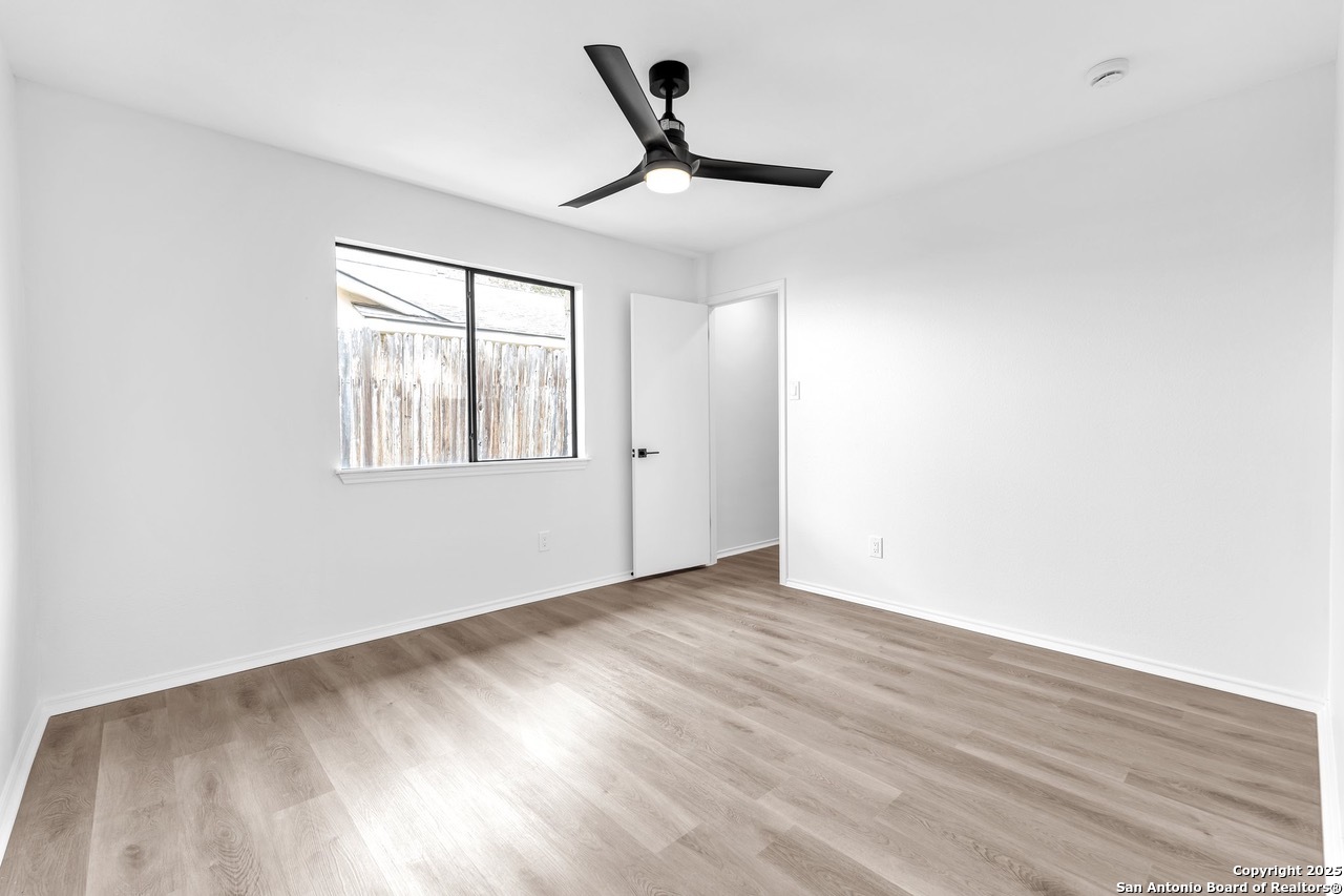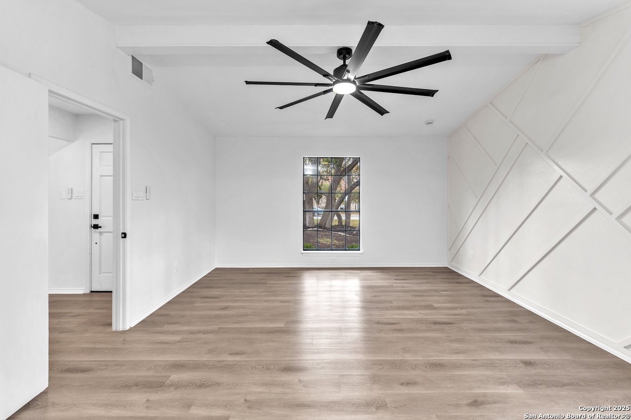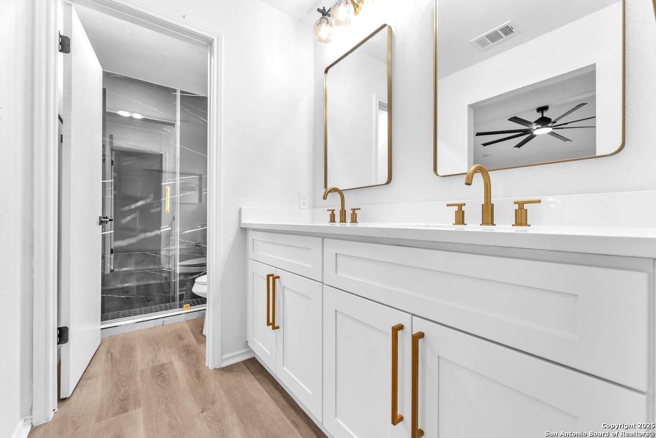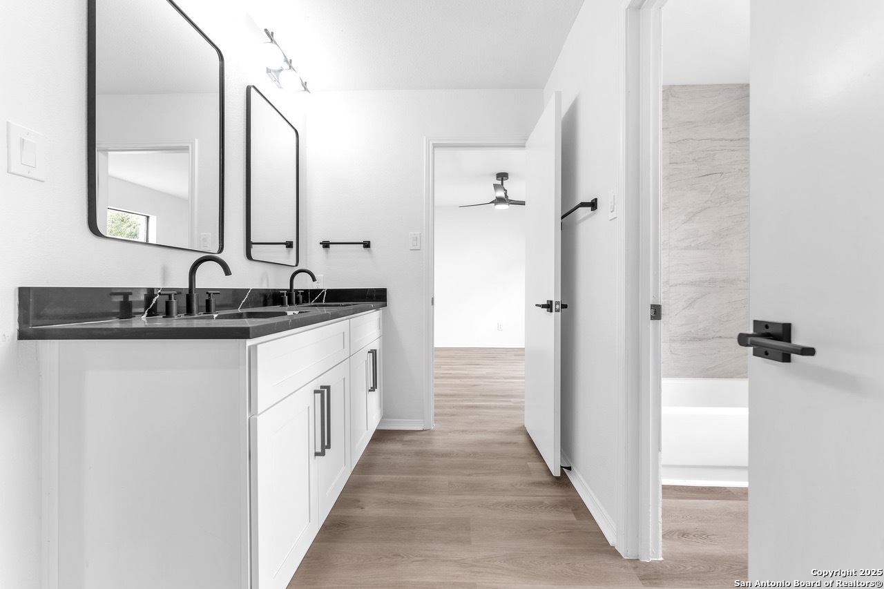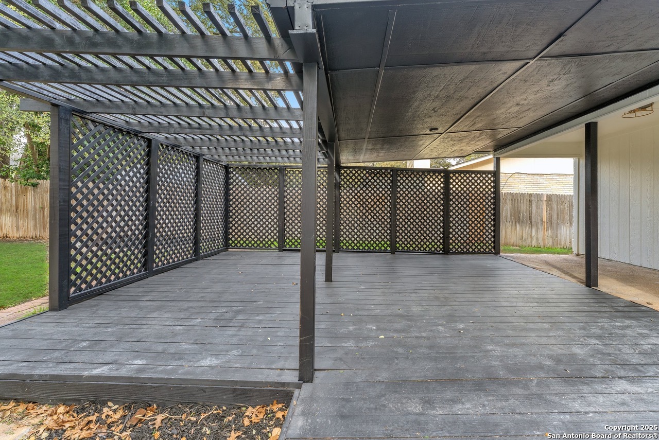 Luxurious 3 bed /2 bath dream home with gorgeous in-ground pool and waterfall spa. Stunningly renovated, this modern, light-filled showcase has an open living layout with breathtaking scenic windows. Dramatic living room is the perfect entertaining space with gas fireplace and pool views. Focal point is the beautifully sleek monochromatic kitchen with large island. Kitchen features include quartz countertops, marbleized backsplash, floor to ceiling custom cabinetry, statement chandelier, and stainless-steel appliances. Relax in style in glamorous primary bedroom suite with vaulted ceiling and walk-in closet. Spa inspired bathroom has black marble tiled walk-in shower and dual vanities. Designer touches throughout home include black and gold light fixtures, black matte hardware, and oversized ceiling fans. Luxury laminate flooring throughout. Heated backyard swimming pool with waterfall spa provides a year-round oasis. Covered patio in the lush backyard is ideal for alfresco dining. Renovation improvements include new roof, electrical, plumbing, HVAC, and water heater. Conveniently located in the oak-lined, idyllic Oak Hollow neighborhood, near airport, parks, and shopping. NEISD Schools & No HOA. Fully renovated houses like this rarely come on the market in this neighborhood. Book your showing today!