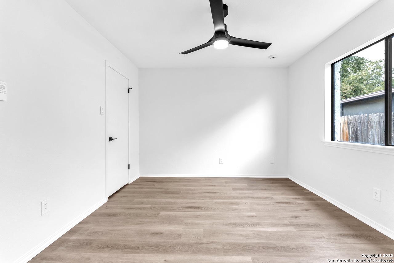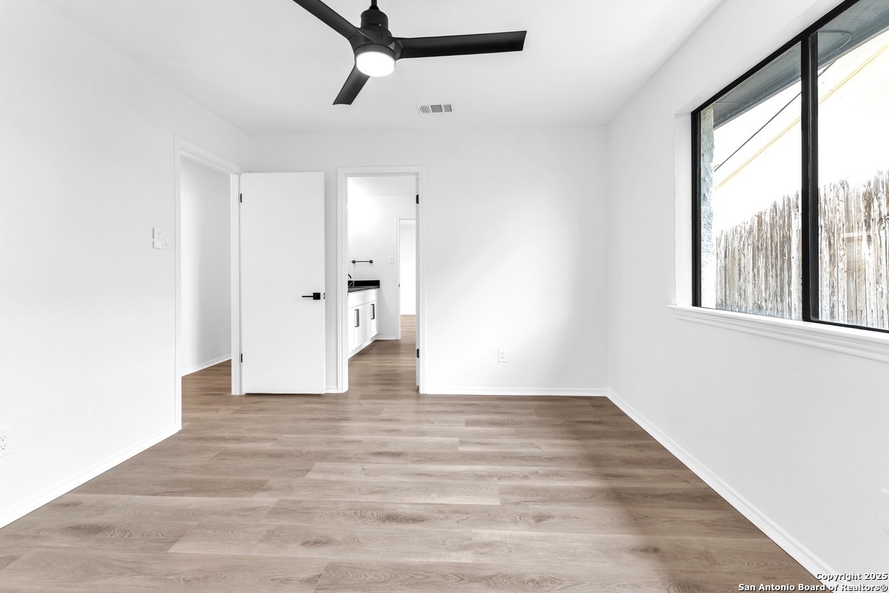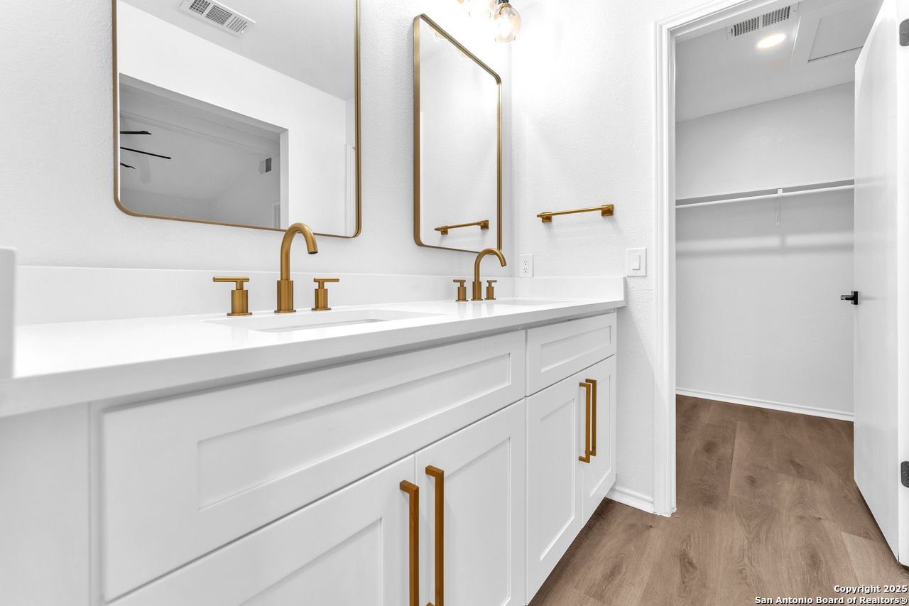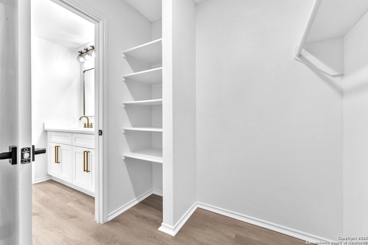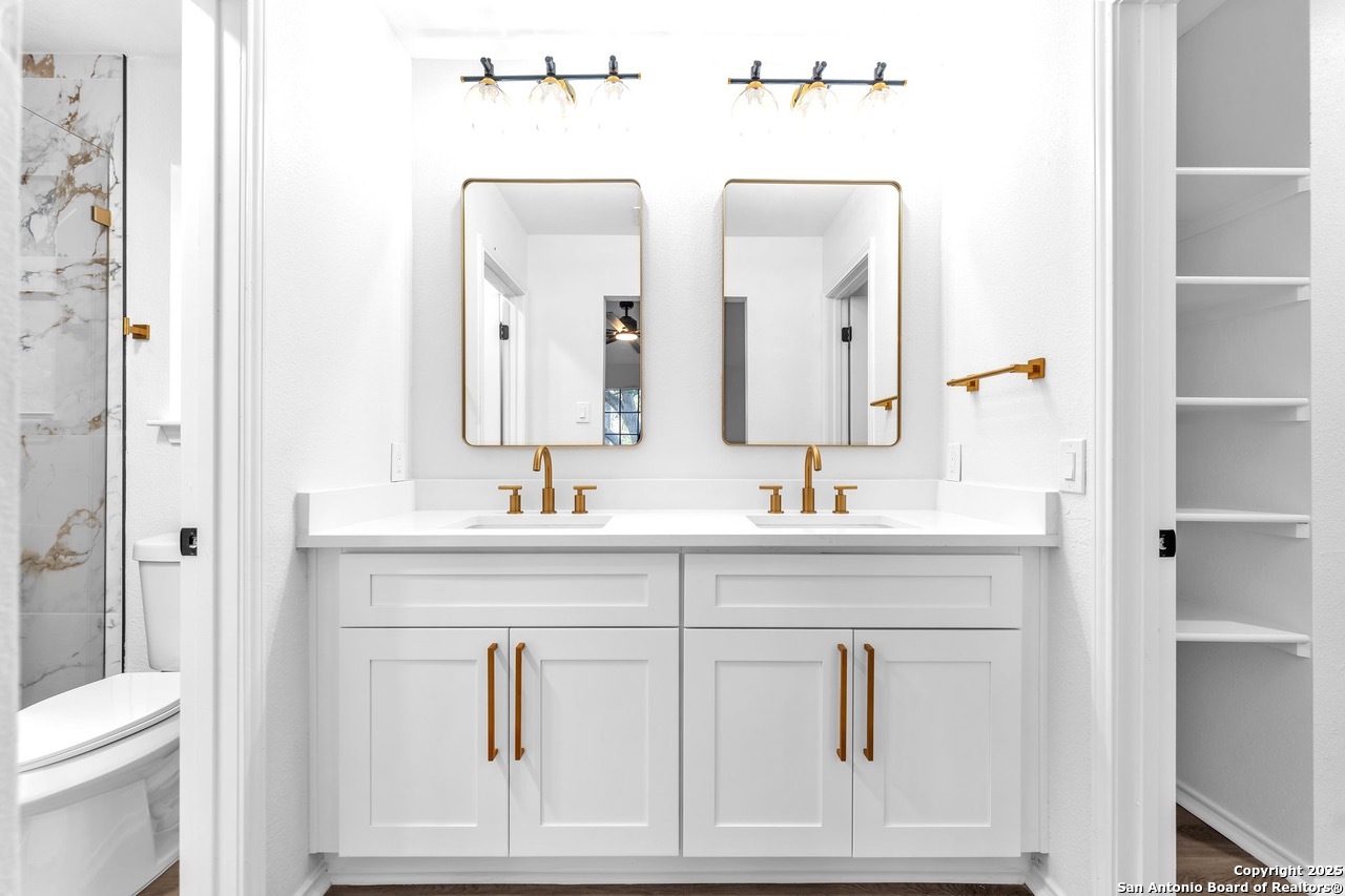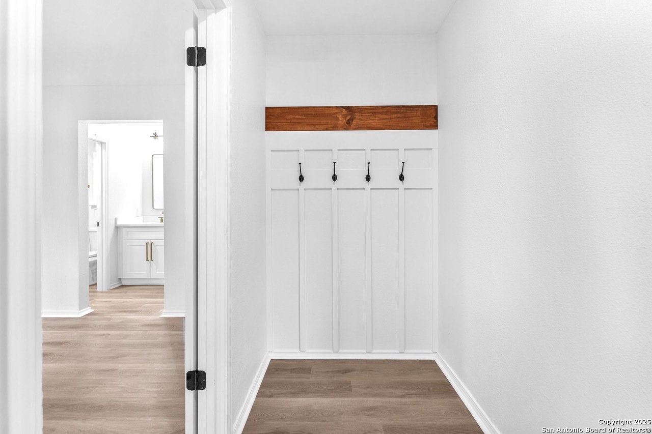 Luxurious 3 bed /2 bath dream home with gorgeous in-ground pool and waterfall spa. Stunningly renovated, this modern, light-filled showcase has an open living layout with breathtaking scenic windows. Dramatic living room is the perfect entertaining space with gas fireplace and pool views. Focal point is the beautifully sleek monochromatic kitchen with large island. Kitchen features include quartz countertops, marbleized backsplash, floor to ceiling custom cabinetry, statement chandelier, and stainless-steel appliances. Relax in style in glamorous primary bedroom suite with vaulted ceiling and walk-in closet. Spa inspired bathroom has black marble tiled walk-in shower and dual vanities. Designer touches throughout home include black and gold light fixtures, black matte hardware, and oversized ceiling fans. Luxury laminate flooring throughout. Heated backyard swimming pool with waterfall spa provides a year-round oasis. Covered patio in the lush backyard is ideal for alfresco dining. Renovation improvements include new roof, electrical, plumbing, HVAC, and water heater. Conveniently located in the oak-lined, idyllic Oak Hollow neighborhood, near airport, parks, and shopping. NEISD Schools & No HOA. Fully renovated houses like this rarely come on the market in this neighborhood. Book your showing today!