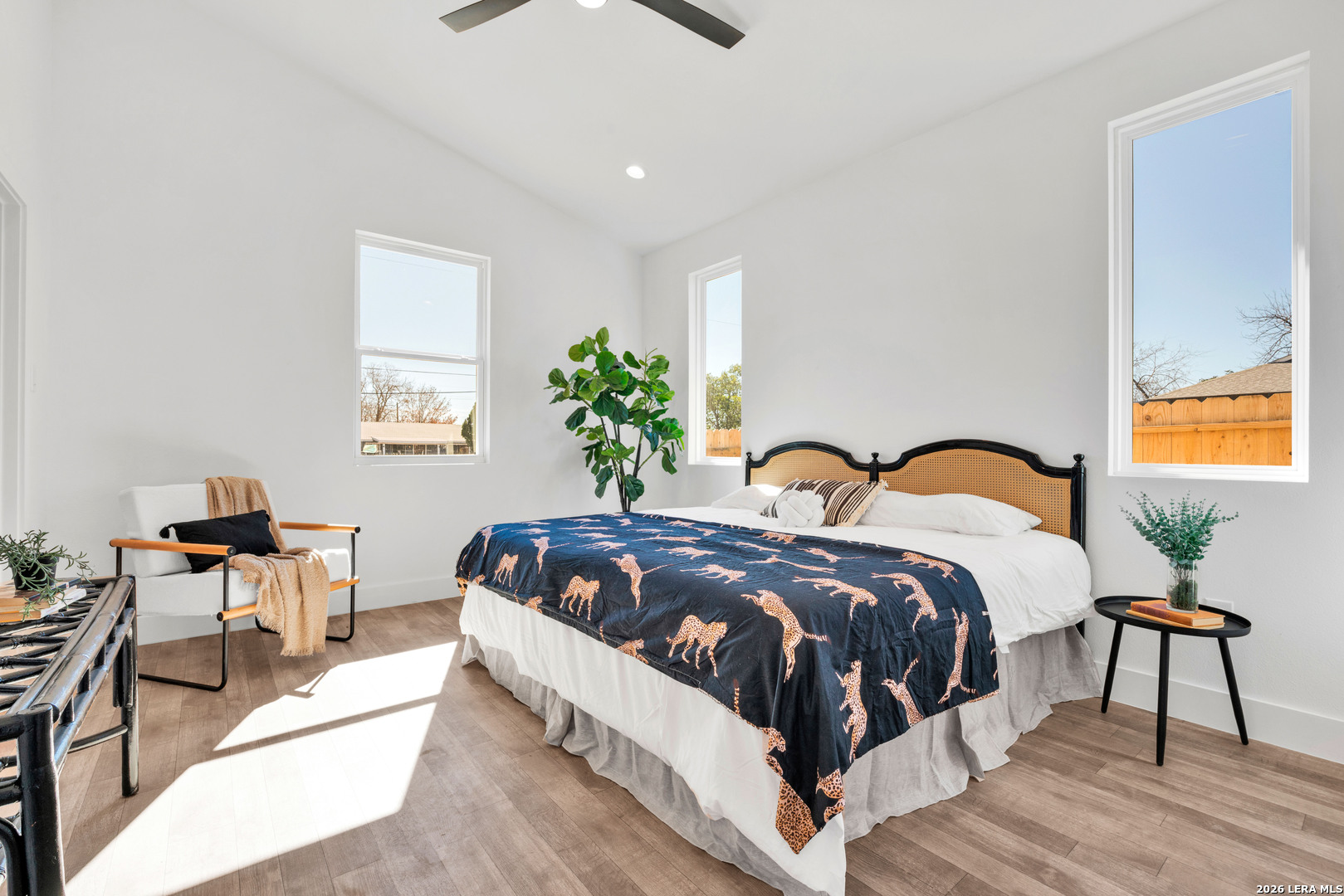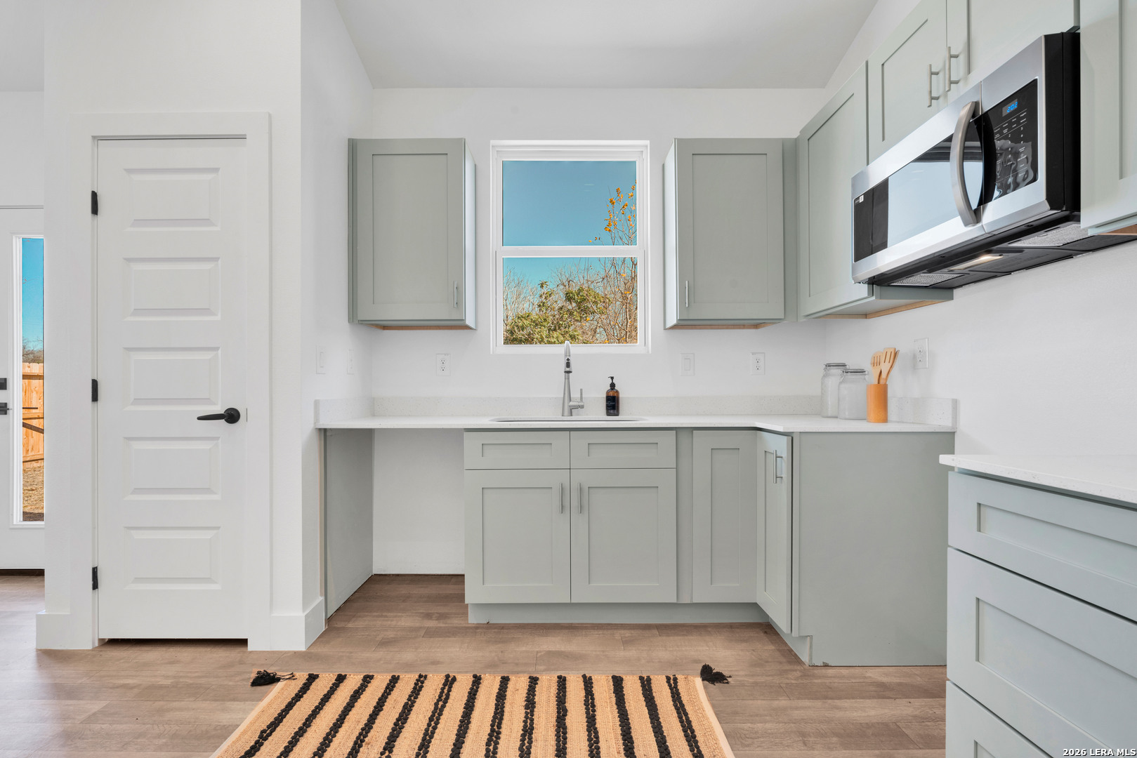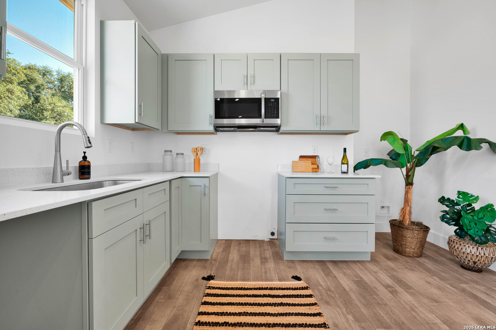 Stunning one-story new construction in the historic Hot Wells neighborhood, showcasing a well-designed open floor plan with vaulted living room ceilings and clean, modern architecture. This home features 2 bedrooms and 2 full bathrooms, including a generous primary suite with an impressive walk-in closet. The kitchen is highlighted by elegant quartz countertops, and the fully fenced backyard will be finished with newly installed sod. Ideally located near SE Military Drive shopping and dining, a short walk to the Mission Reach section of the River Walk, and the newly reopened historic Hot Wells Springs. The home includes a 10-year structural and framing warranty along with a 1-year comprehensive workmanship warranty. First of six homes in this exciting new development-an exceptional opportunity you won't want to miss.