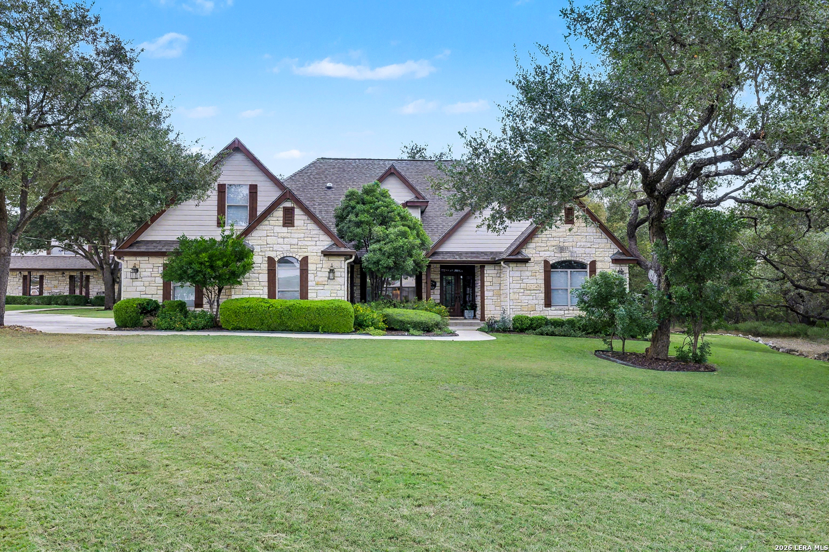 This one of a kind single family home located in the Texas hill country sits on 1.7 beautifully landscaped acres. This property is also set up for multigenerational living. The main house has 3,110 sq/ft of heated living space, 4 bedrooms, three bathrooms, an office, large laundry room, and open living space with high ceilings. The upstairs includes an additional family room/media room with a bedroom and full bathroom. The property also boasts a separate oversized garage/workshop that has an upstairs apartment with 1080 sq/ft of living space including a full kitchen/living area, two bedrooms, one bath, and plenty of storage. The yard is well maintained and fully landscaped with an in-ground sprinkling system. There are dozens of oak and cedar elms on the property as well as 1400 sq/ft of wood decks. This home has many updates and is located about one mile from the Hoffmann Ln Elementary School.