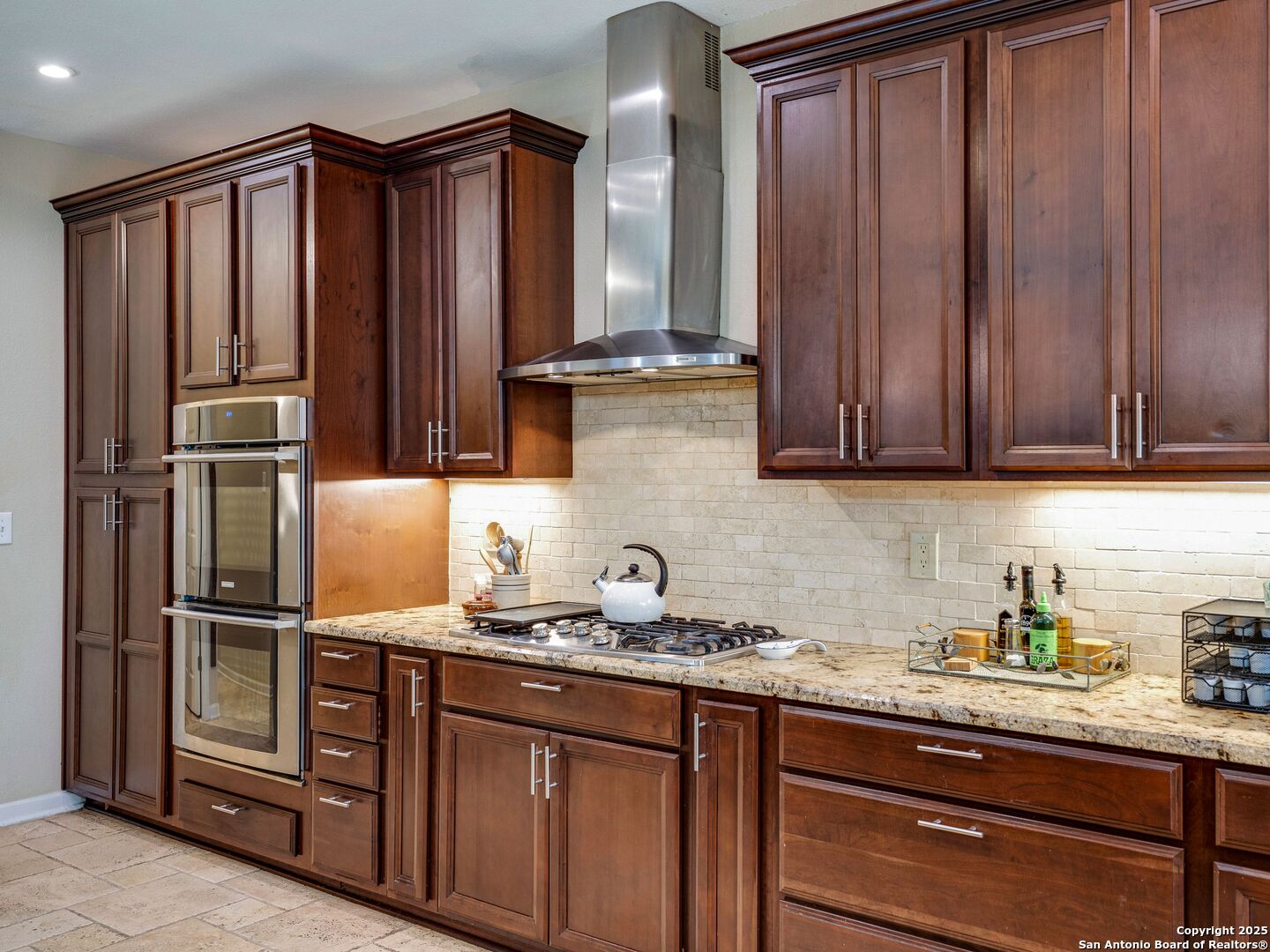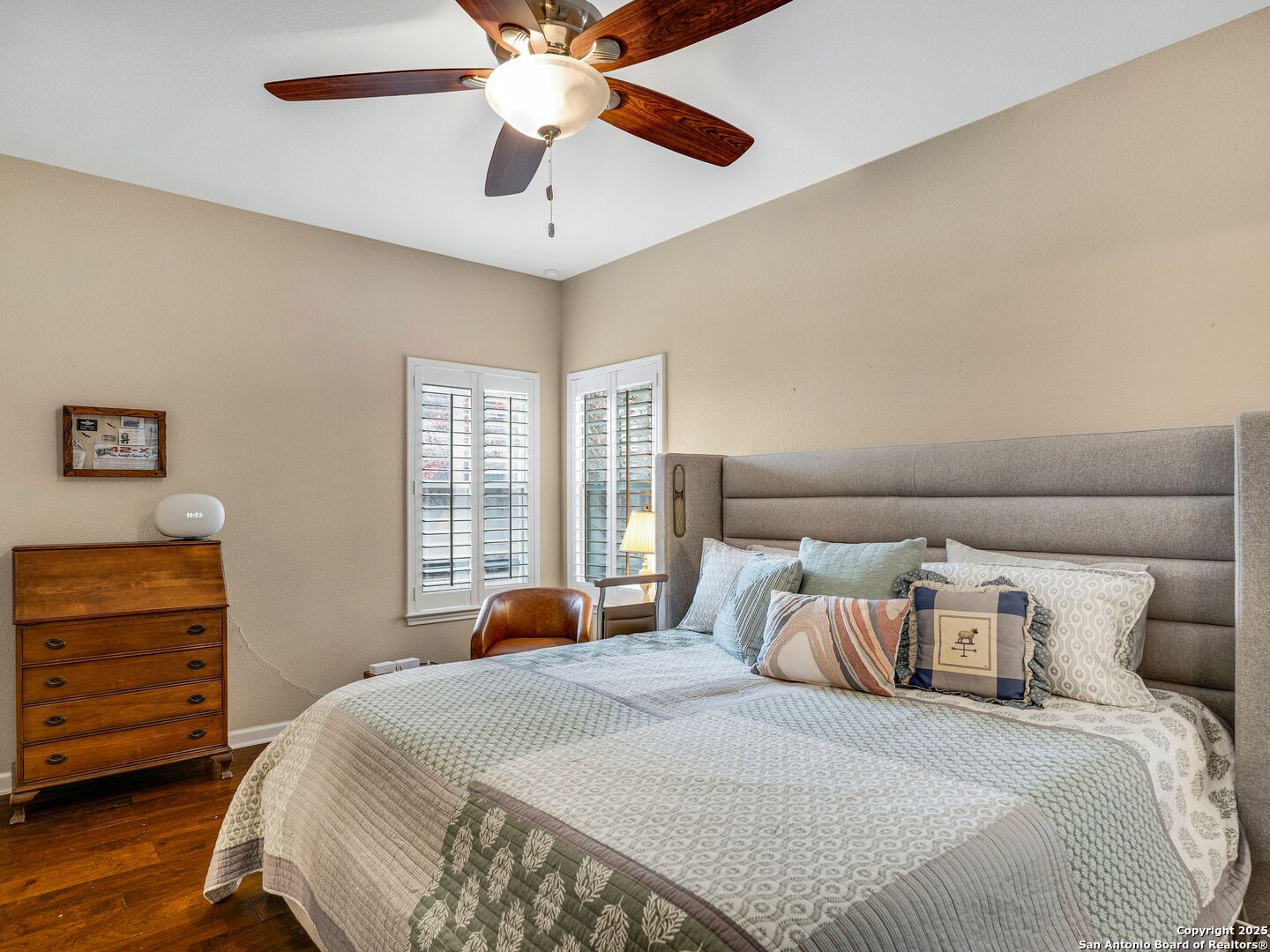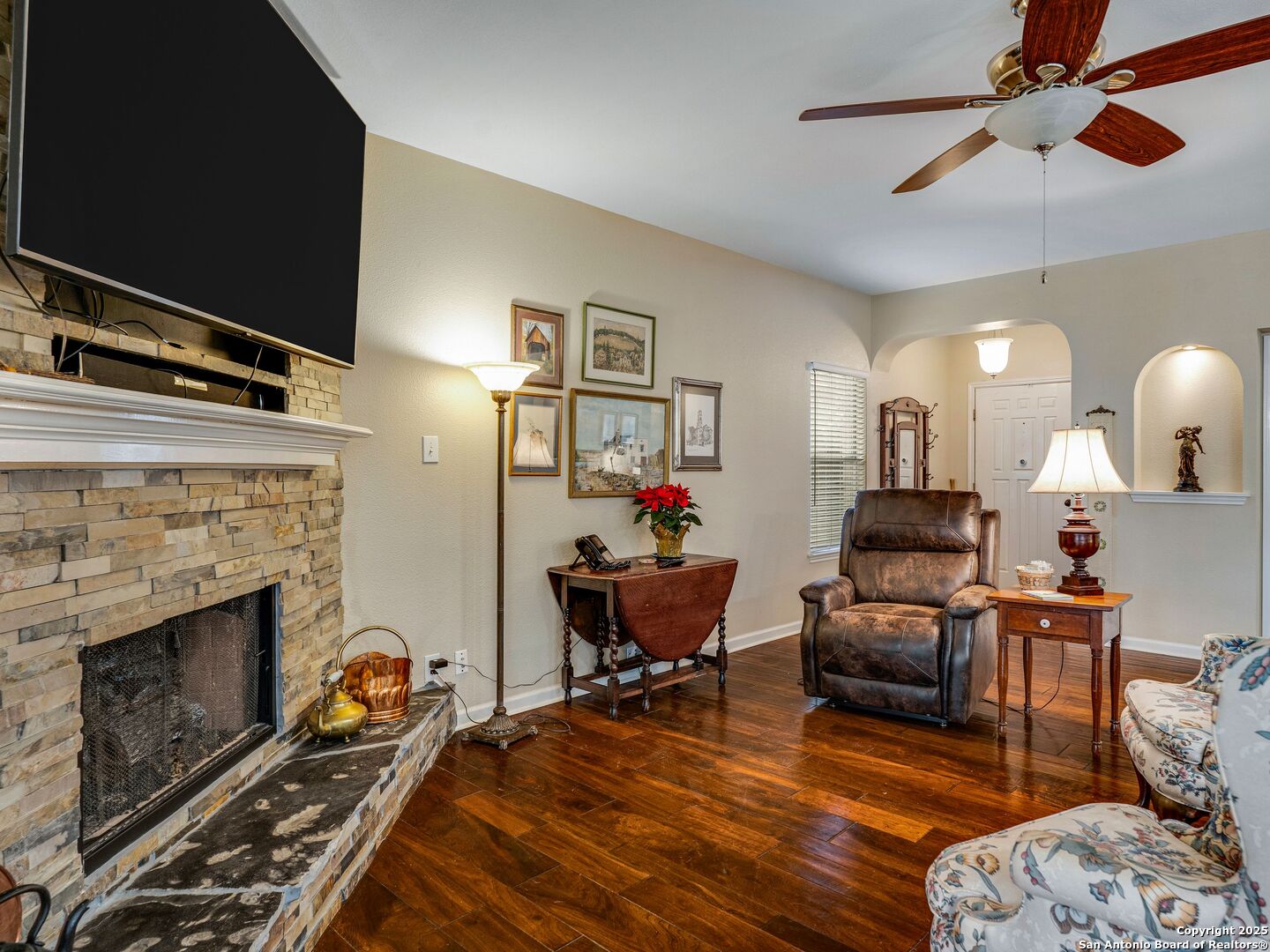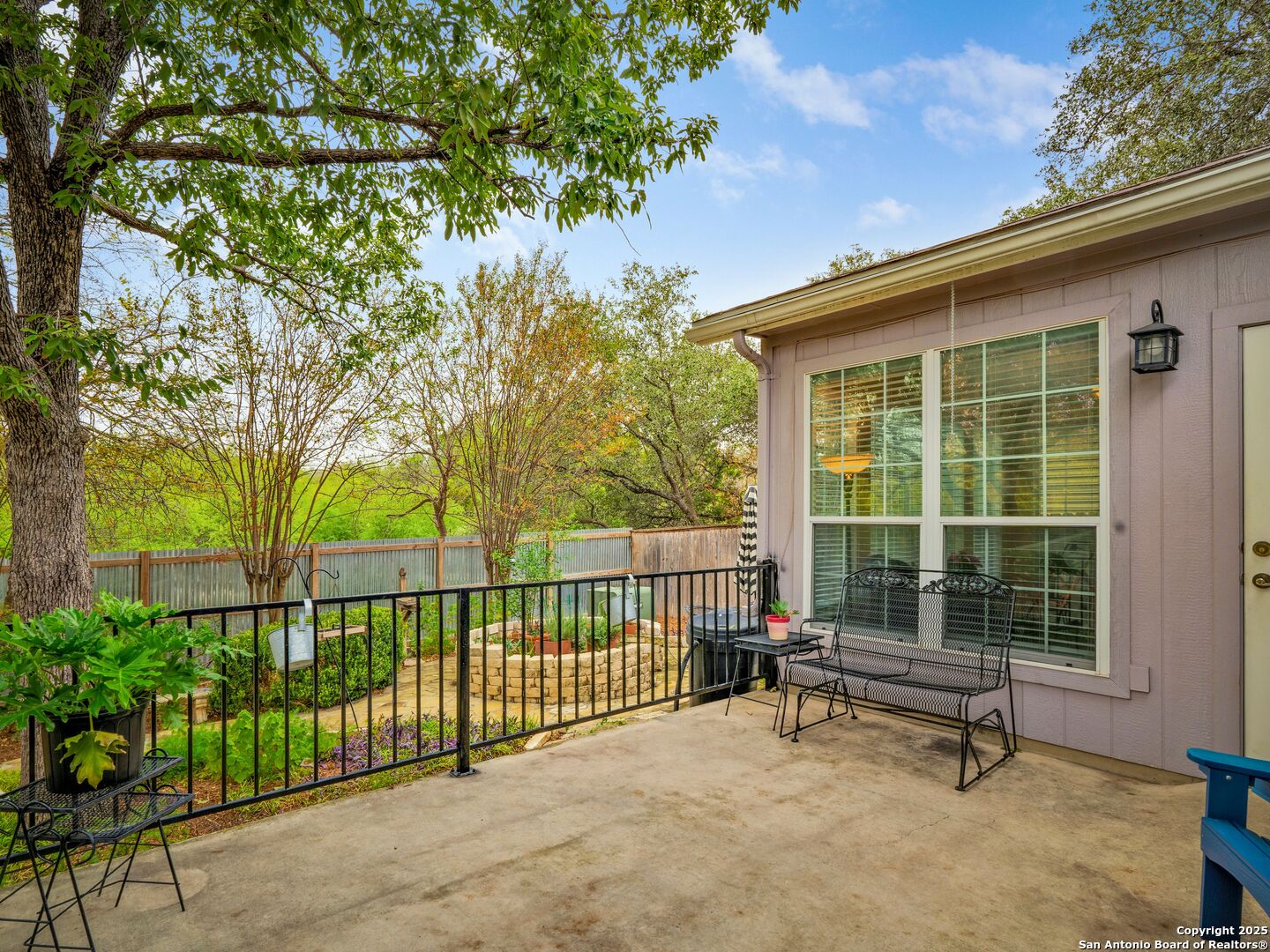 Located in the sweet, gated community of Bluffs of Henderson Pass, this inviting single-story home offers a thoughtful layout with 3 bedrooms, 2 baths, and a 2-car garage. Upon entering the foyer, you're welcomed by wood floors, a striking slate brick fireplace, and beautifully lit art niches that set a warm, elegant tone. The spacious living room opens seamlessly to the well-appointed kitchen, featuring a large island, gas cooking, granite countertops, recessed lighting, and travertine tile floors, along with a charming breakfast nook. A generous sunroom overlooks the backyard and patio, providing a light-filled space ideal for relaxing or entertaining. The split primary suite offers privacy and comfort with wood floors, custom built-in cabinetry, double sinks, a stone walk-in shower, and a walk-in closet. Secondary bedrooms feature ceiling fans, carpet, and walk-in closets. A dedicated office with built-in bookshelves and pocket glass French doors provides an ideal work-from-home space. Out back, enjoy a peaceful retreat with a patio, stone walkways, mature trees, a storage shed, and the added privacy of greenbelt views. Ideally located near McAllister Park, the Greenway trails, Stone Oak, and major freeways, this home offers both serenity and convenience. Come see this sweet home and make it yours.