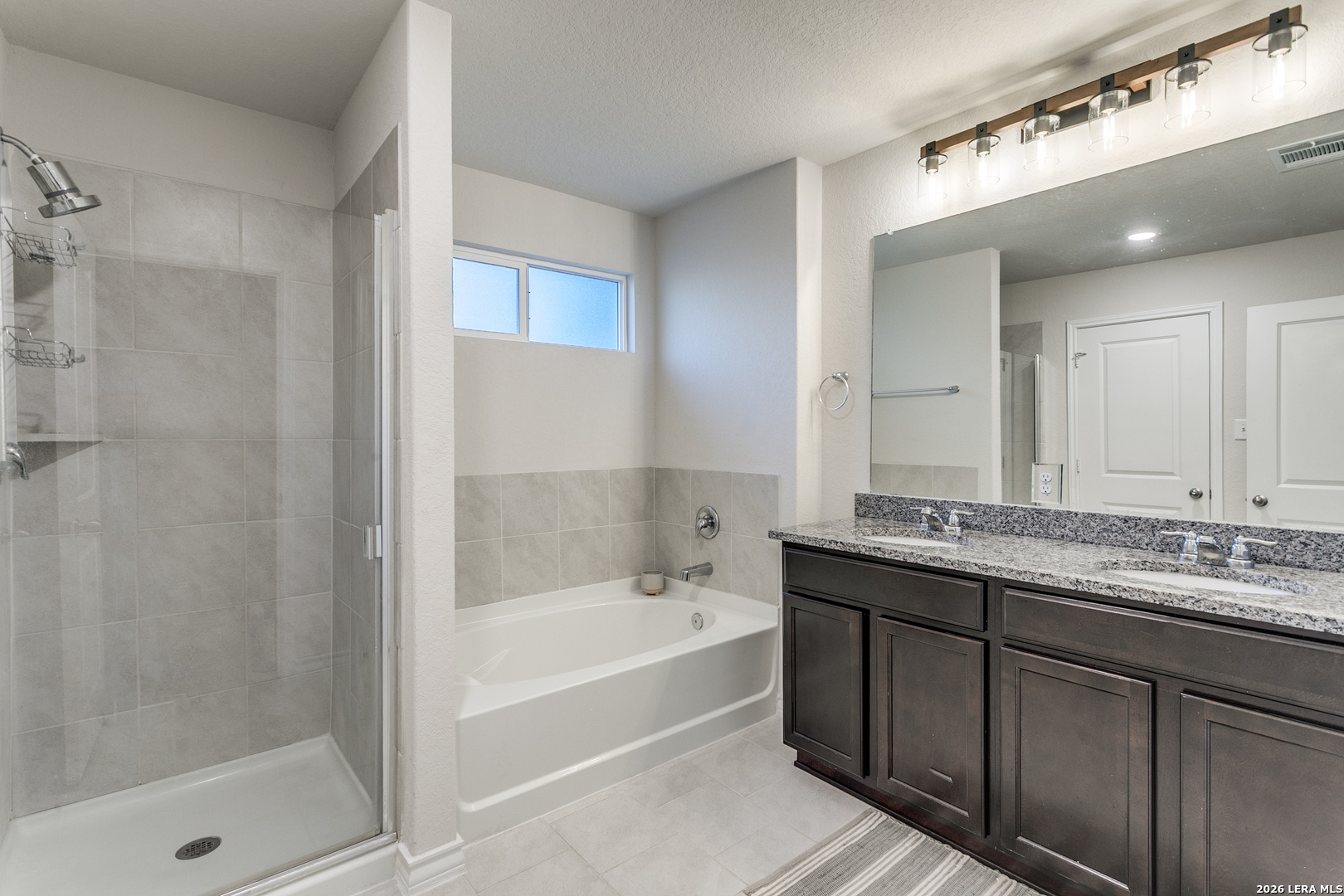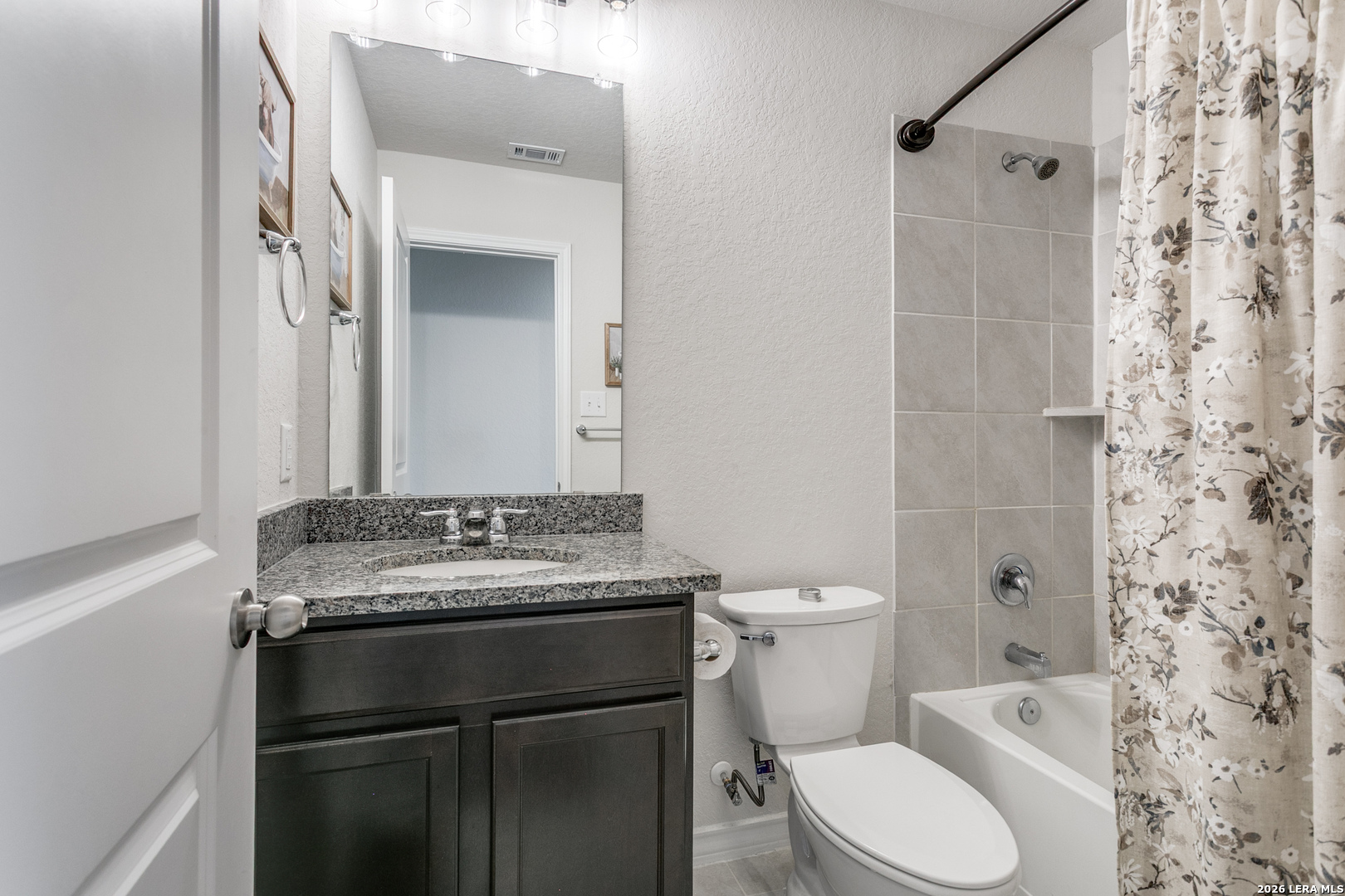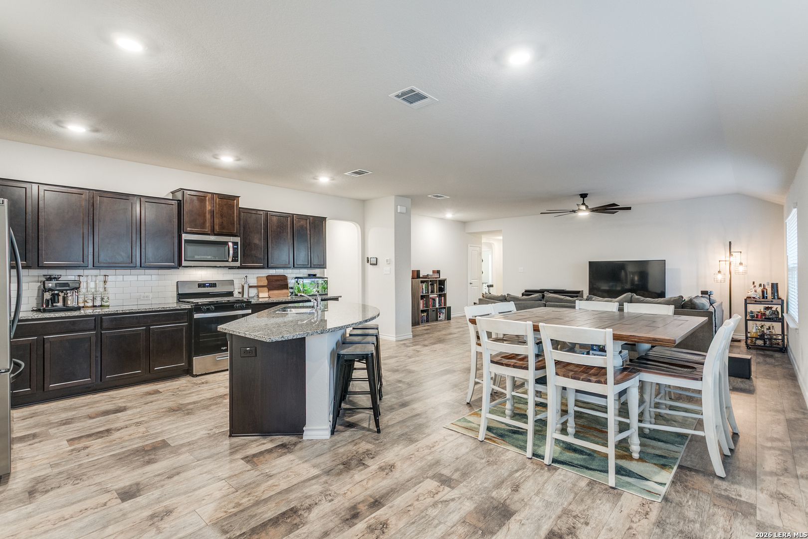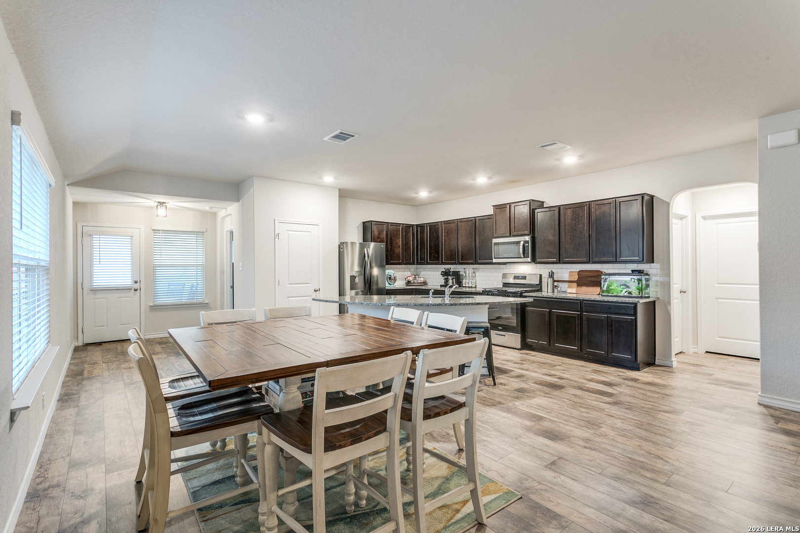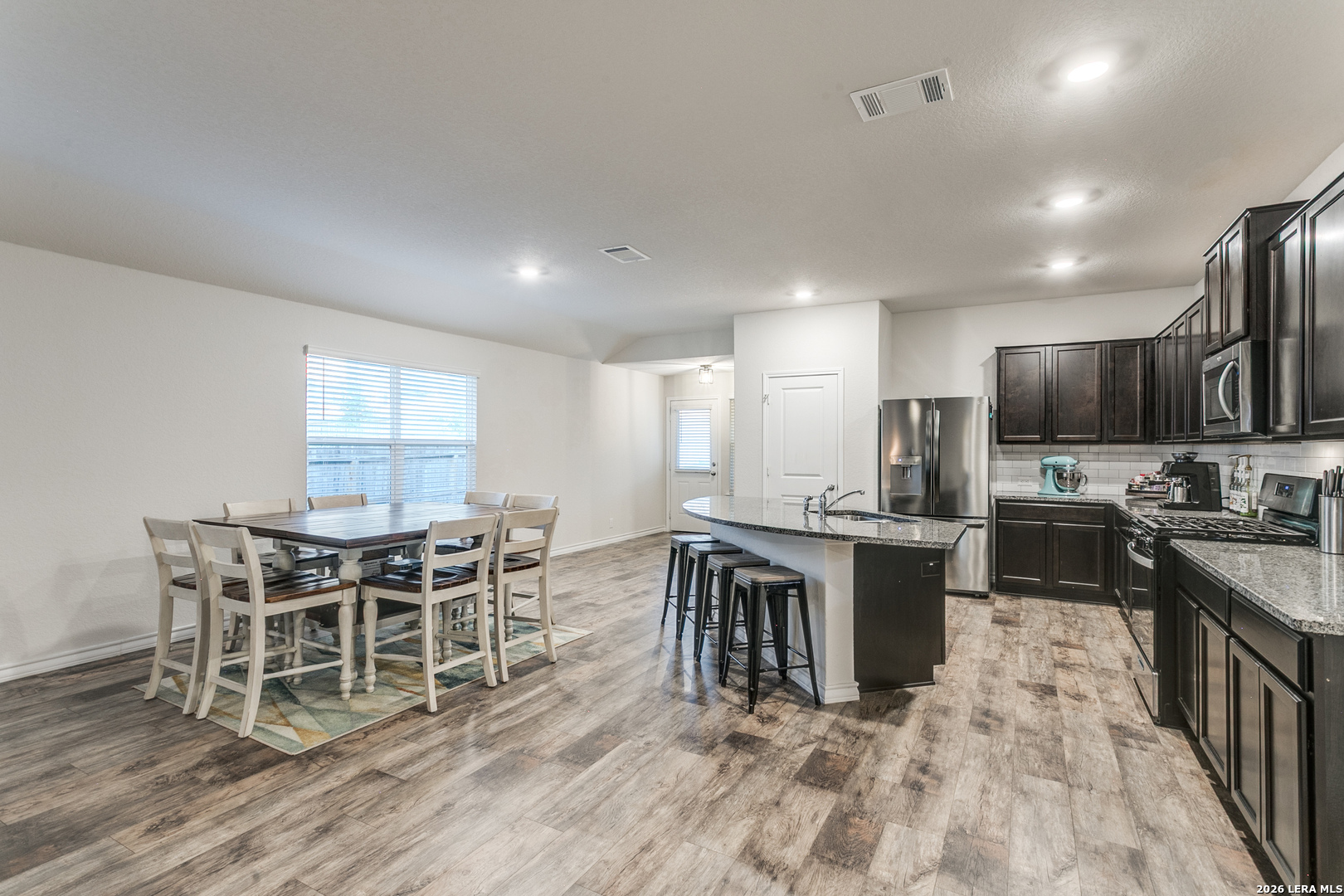 This beautifully maintained single-story home in Redbird Ranch offers a well-designed layout with 4 bedrooms, 2 bathrooms, and 1,898 square feet of comfortable living space. The open-concept floor plan creates a natural flow between the living, dining, and kitchen areas, enhanced by high ceilings and luxury vinyl plank flooring throughout the main living spaces. The kitchen is both functional and inviting, featuring an oversized island with breakfast bar seating, granite countertops, subway tile backsplash, stainless steel appliances, and gas cooking. The primary suite is privately positioned at the back of the home and includes a spacious walk-in closet and an ensuite bath with dual vanities, a garden tub, separate walk-in shower, and private water closet. Secondary bedrooms are well-sized and offer flexibility for a variety of needs. Additional features include a dedicated laundry room, attached 2-car garage, water softener, refrigerator, full sprinkler system, and ceiling fans in select areas to enhance comfort. The covered patio overlooks a generously sized backyard with ample space for outdoor enjoyment, entertaining, or personal customization. Located within Medina Valley ISD with convenient access to Potranco Rd and SH-211, the home is near shopping, dining, and major employers including Lackland Air Force Base. Redbird Ranch offers a variety of community amenities including pools, parks, playgrounds, sports courts, and walking and biking trails. The home also includes the remaining builder 10-year structural warranty, providing added peace of mind.
