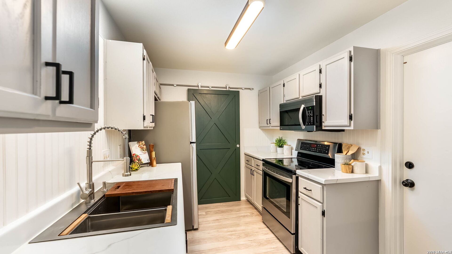 Welcome to this beautifully updated home at 15527 Knollglade in San Antonio! This charming 2-bedroom, 1.5-bath residence offers a perfect blend of modern upgrades and comfortable living. Step inside to find durable wood laminate flooring throughout, creating a warm and inviting atmosphere. The recently updated kitchen features stainless steel appliances, sleek finishes, and a clean, modern design-perfect for both everyday living and entertaining. Both bathrooms have been thoughtfully renovated with luxurious touches, offering a spa-like feel. Enjoy generously sized bedrooms with ample space and natural light. The home also features a newer roof, providing peace of mind for years to come. Outside, you'll find a large backyard with plenty of room for relaxing, entertaining, or future customization. Conveniently located with easy access to major highways and nearby military installations, this home is also less than two miles from HEB, shopping, dining, and everyday essentials. A perfect combination of style, comfort, and location-don't miss this opportunity!