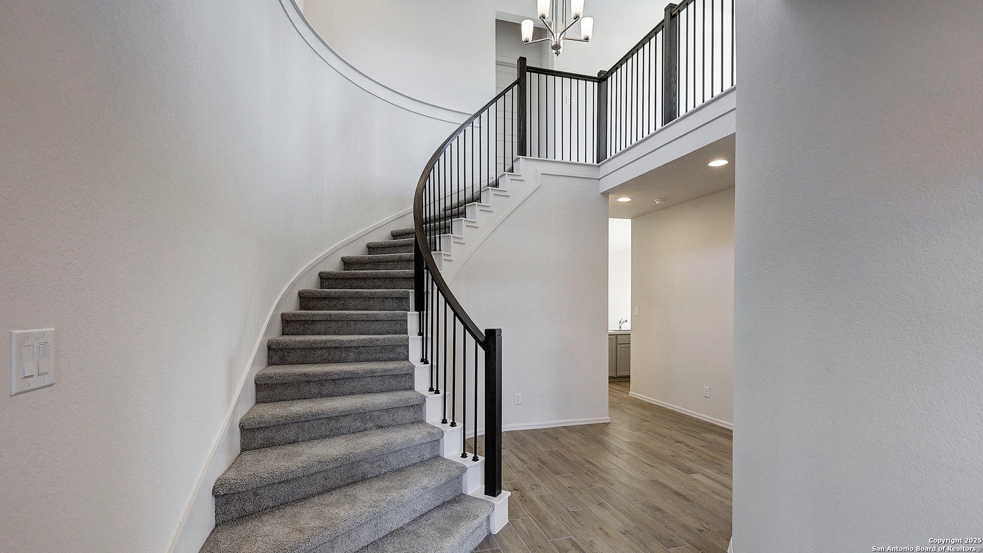 Entryway opens into a curved staircase that is embraced by a grand ceiling. A secondary bedroom is right off the main hallway and has access to a full private bathroom and walk-in closet. As you enter the kitchen you are greeted by the island that features built-in seating, 5-burner gas cooktop, and a walk-in pantry. The dining area connects to the family room which boasts a wall of windows and access to the covered backyard patio. The primary bedroom is off the main living areas and allows ample natural light with its three large windows. Double doors lead into the primary bathroom which has dual vanities, a linen closet, large glass enclosed shower, and an oversized walk-in closet. It also allows dual access to the utility room for added convenience. Upstairs you are greeted by a game room which features a wall of windows. Completing the space are three bedrooms and two full bathrooms. The mud room is off the two-car garage.