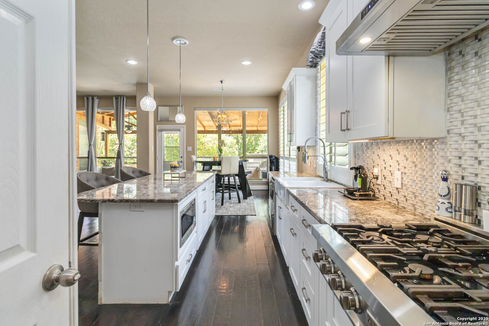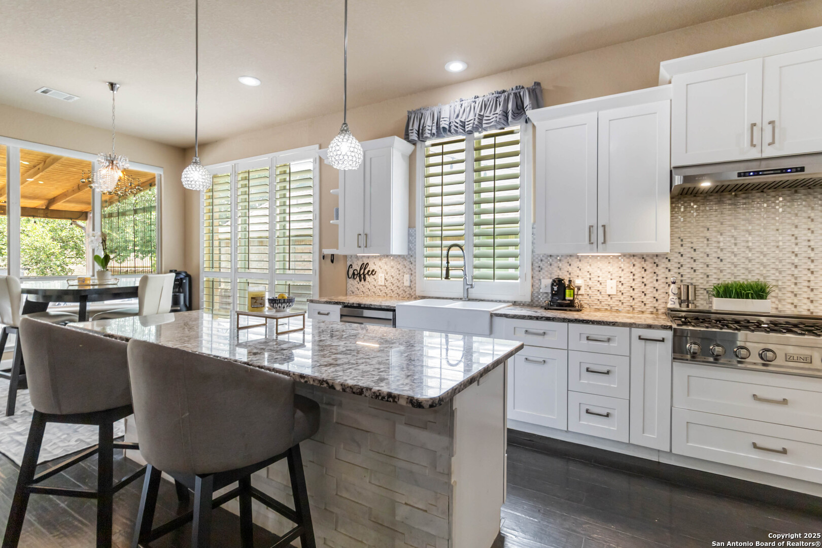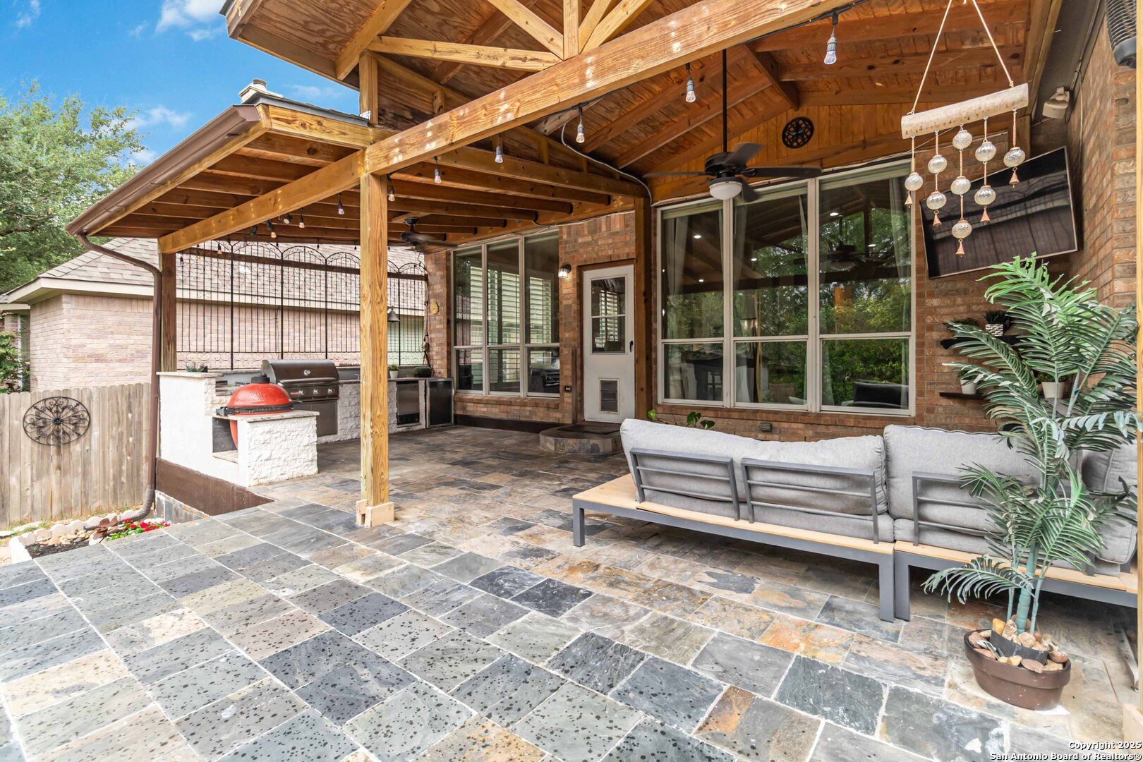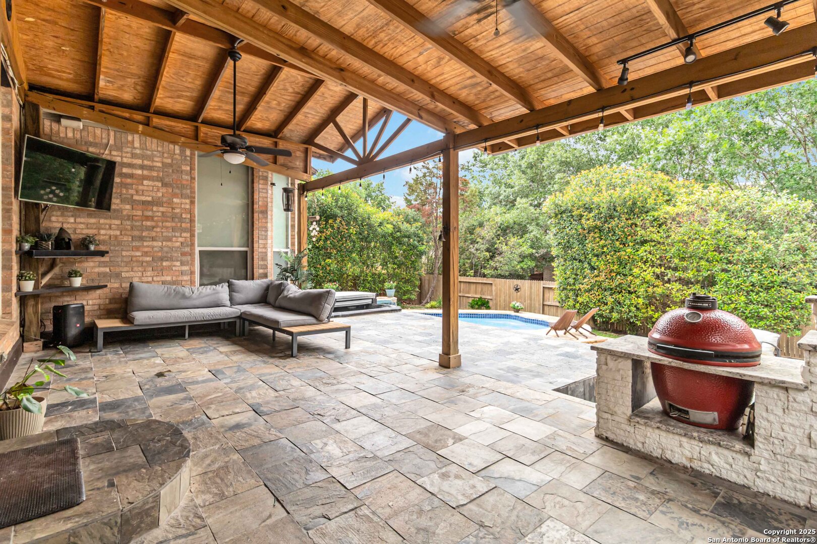 This stunning home is an entertainer's dream inside and out! The backyard retreat offers total privacy with a sparkling pool, relaxing hot tub, well appointed outdoor kitchen, and a covered entertaining space perfect for gatherings year-round. Inside, a gorgeous wall of windows bathes the living spaces in filtered natural light & creates seamless indoor-outdoor flow for effortless entertaining. The stunning kitchen boasts an entertainer's island, six burner gas cooktop, double ovens, walk-in pantry, custom finishes, & abundant storage. The spacious primary retreat overlooks the pool and features a recently renovated, spa-worthy bath with a soaking tub, walk-in shower, and dual vanity. Upstairs, a versatile game and media room with full bath is ready for movie nights or makes a great luxury apartment as shown today. A stylish study with barn doors adds charm and flexibility. Both eat-in kitchen & formal dining. This is the lifestyle you've been waiting for!