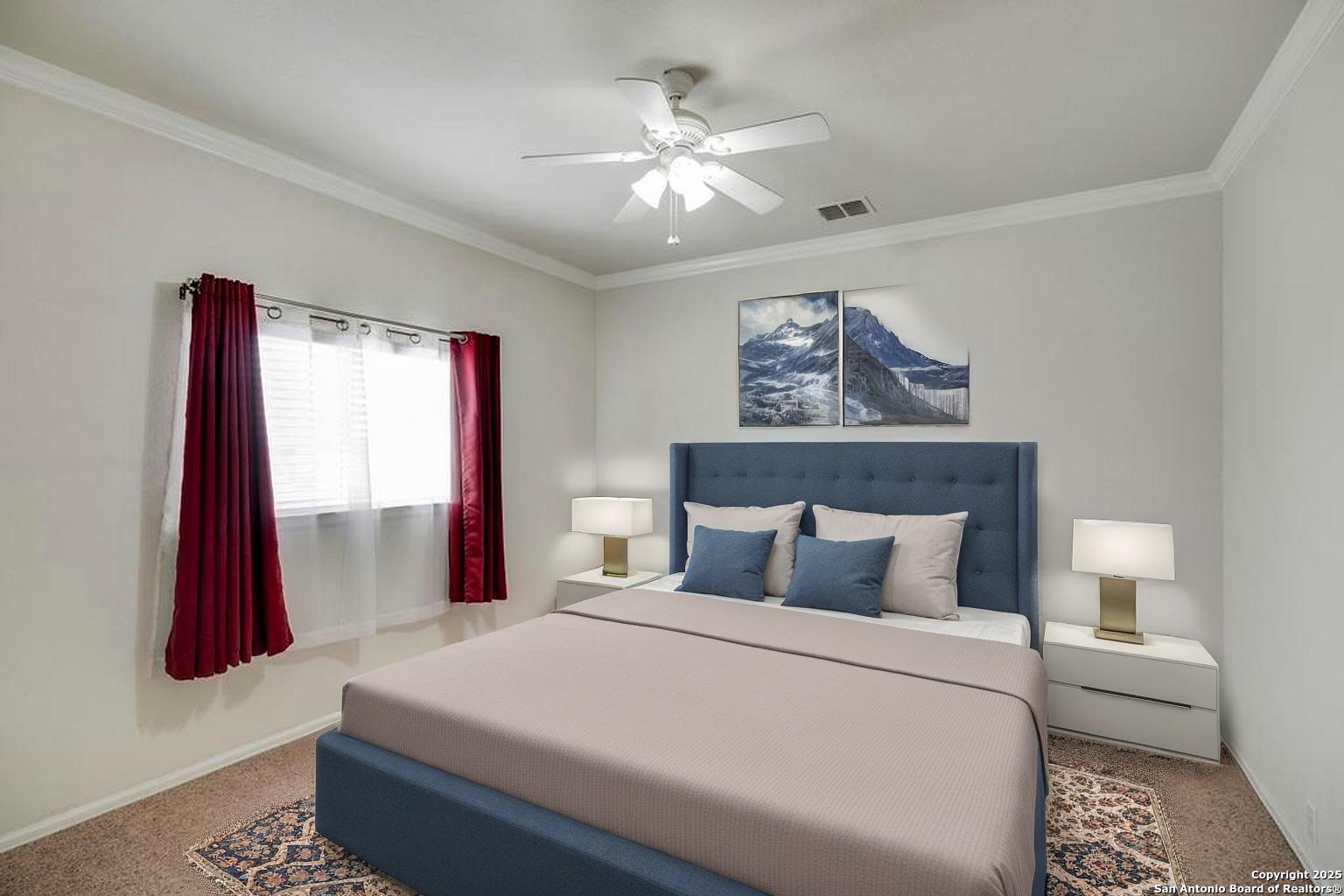 Exceptional price, $45K below market value! This gorgeous brick home on nearly 1/4 acre with adjacent green space offers style, space, and thoughtful upgrades throughout. The open layout features fresh paint, custom lighting, and a family room with a gas log fireplace that flows into the updated eat-in kitchen with stainless appliances, a new backsplash, and a refrigerator that conveys. A private study and full guest suite are downstairs, while the upstairs boasts an oversized primary suite with a custom walk-in closet, a spacious game room with wall-mounted TV, and large secondary bedrooms. Enjoy outdoor living on the covered deck overlooking the expansive backyard with a new privacy fence. Additional highlights include dual-zone HVAC, epoxy garage floors, gutters, a water softener, and a 2020 roof. This home truly has it all!