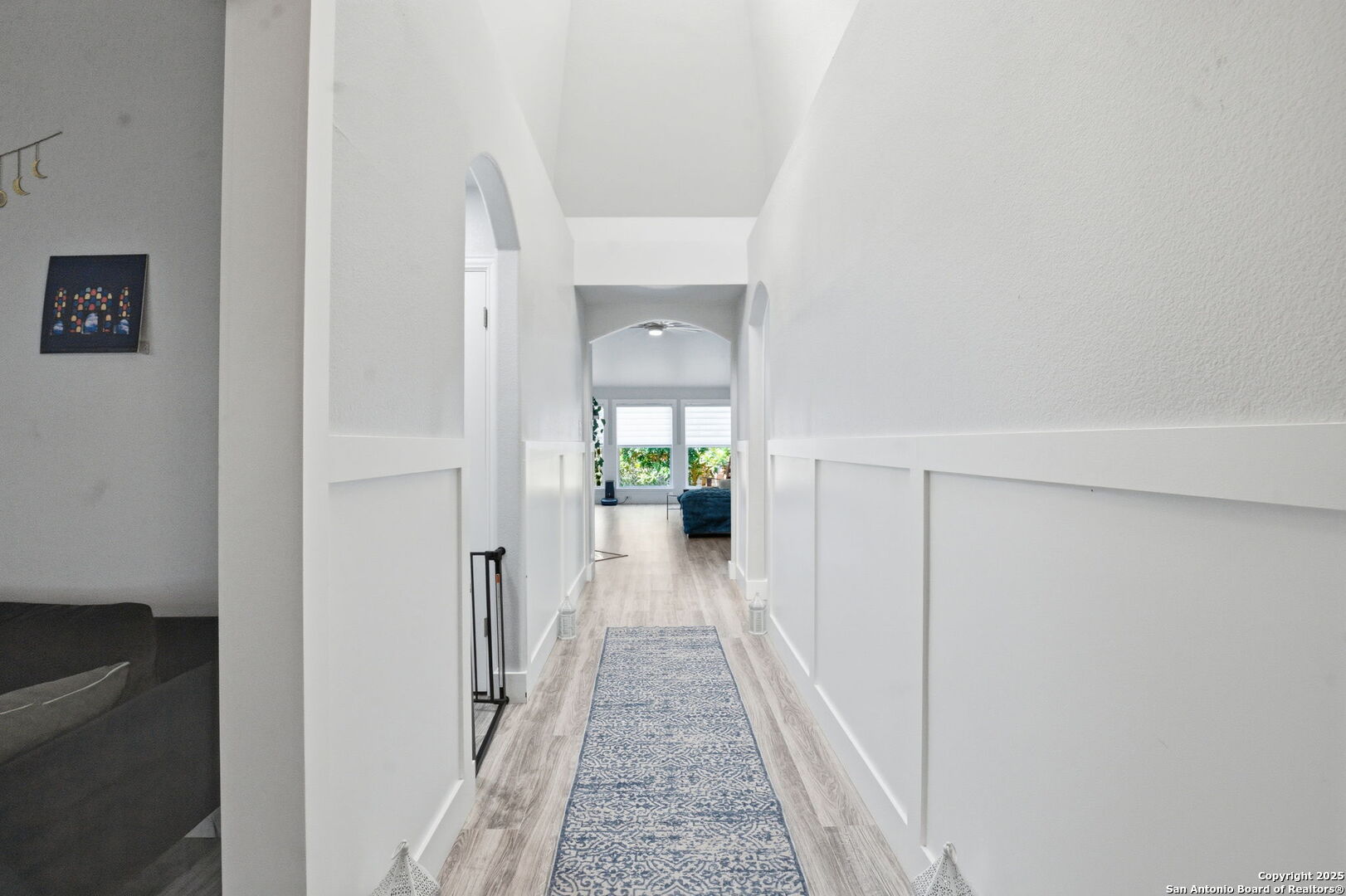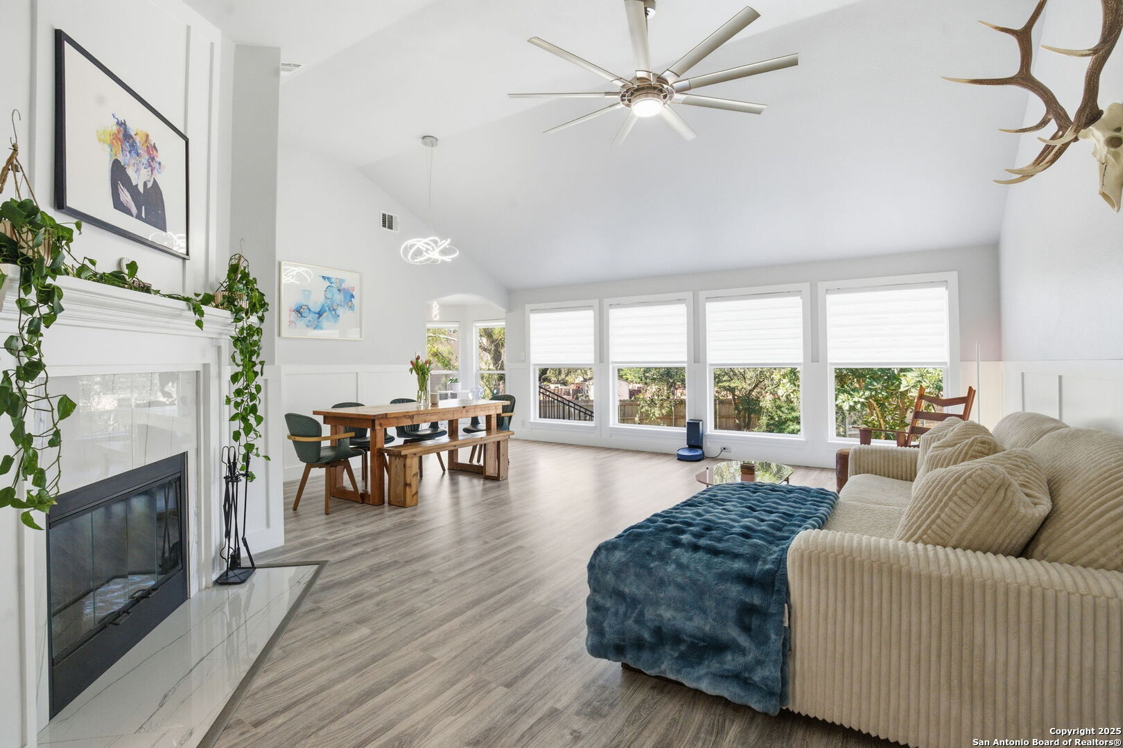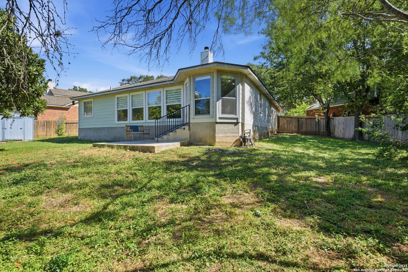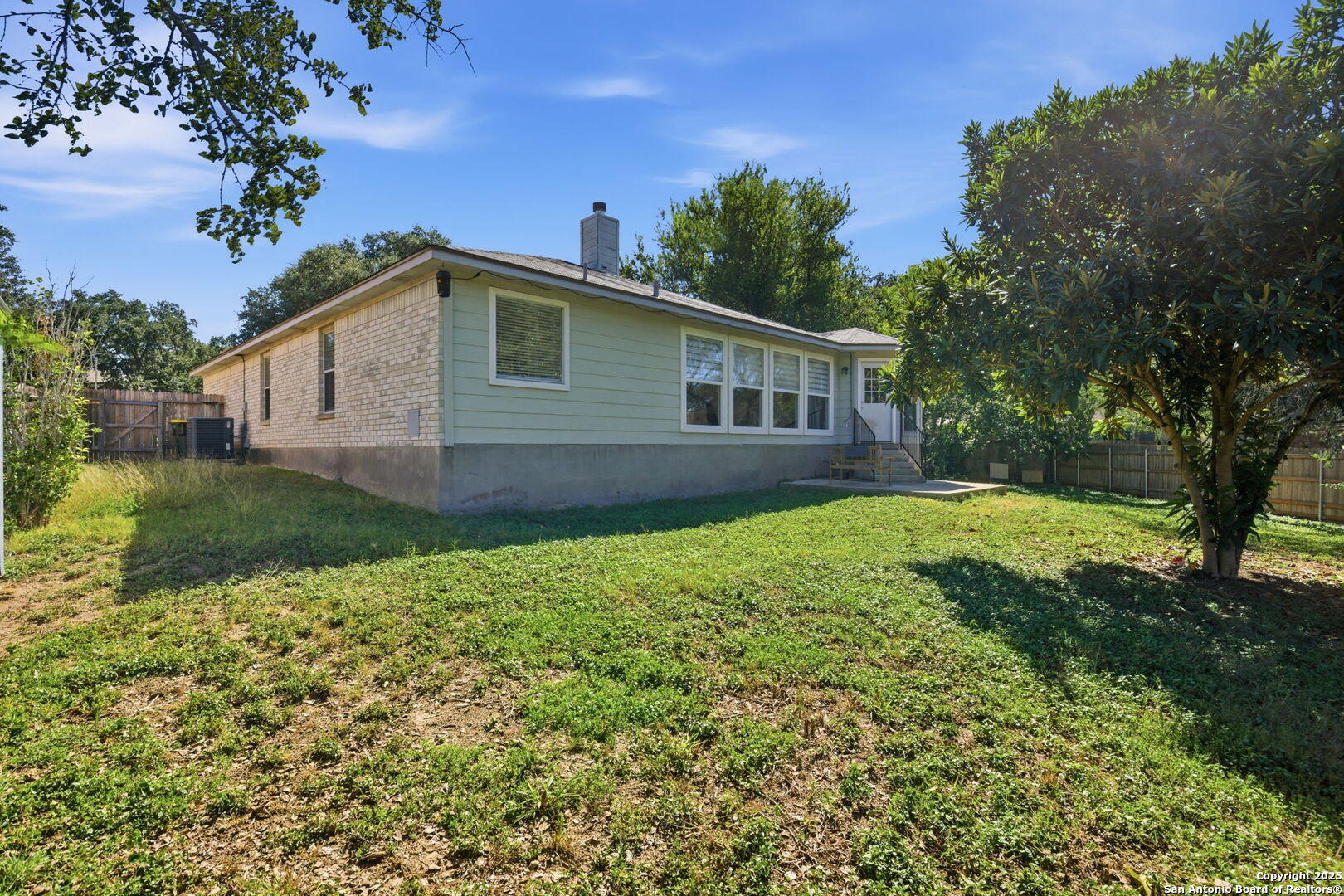 Nestled in the desirable Greenshire neighborhood, this beautifully renovated home blends classic charm with modern elegance. The inviting interior features wainscoting accents, a cozy fireplace, and abundant natural light. The chef-inspired kitchen boasts sleek countertops, stainless steel appliances, and a spacious walk-in pantry-perfect for entertaining or everyday living. The luxurious primary suite offers a spa-like retreat with a garden tub, separate shower, and generous closet space. Enjoy peaceful outdoor living on the private patio surrounded by mature trees on an oversized lot. Conveniently located near shopping, dining, major highways, and RAFB. This home combines comfort, style, and location in one of Schertz's most sought-after communities.