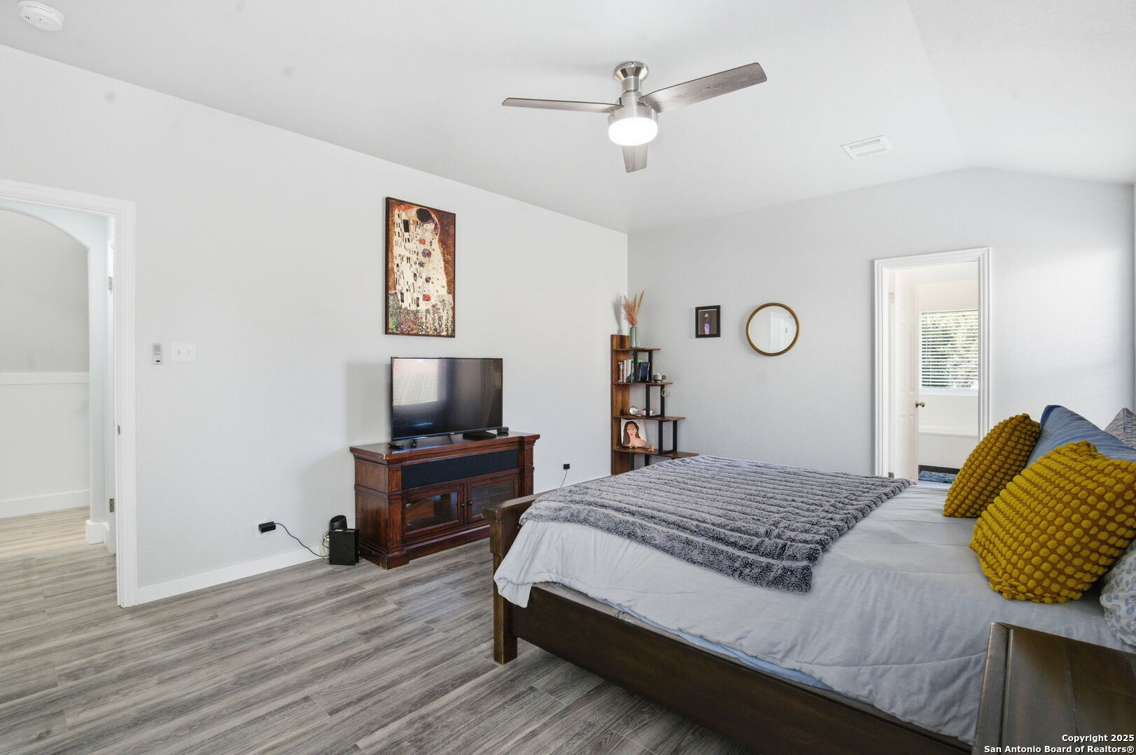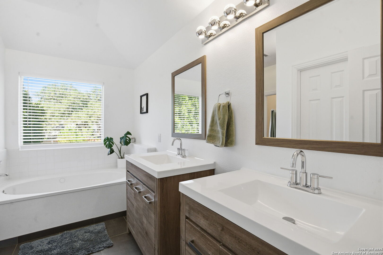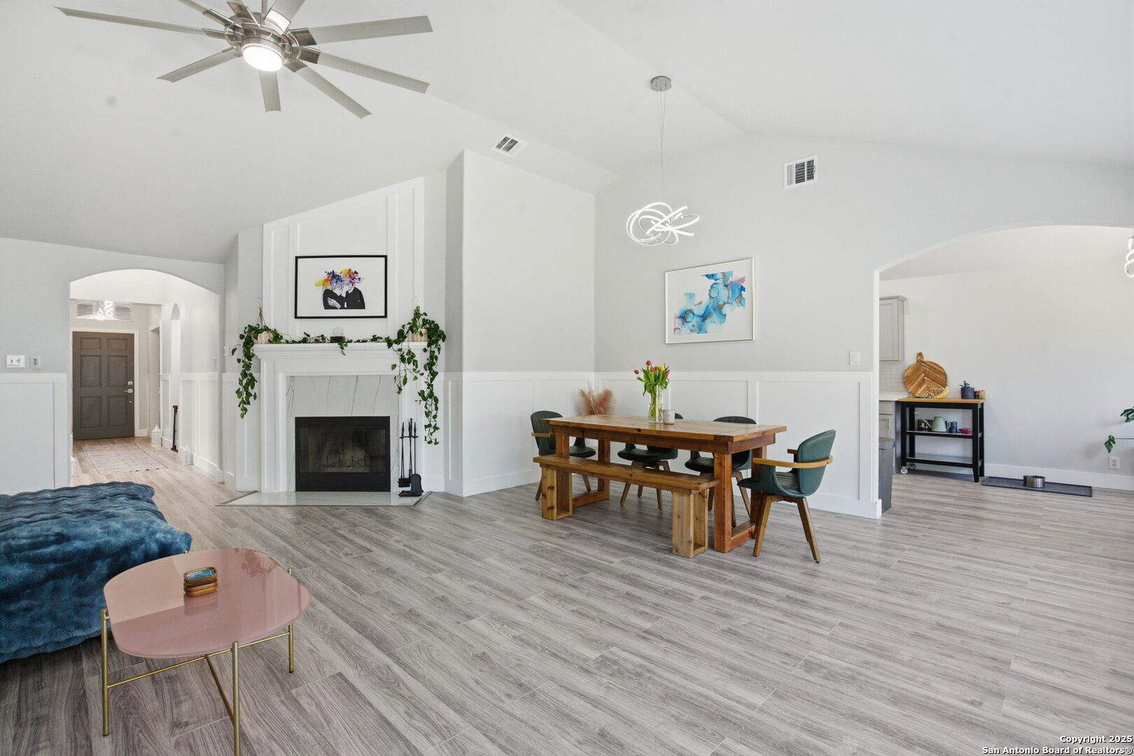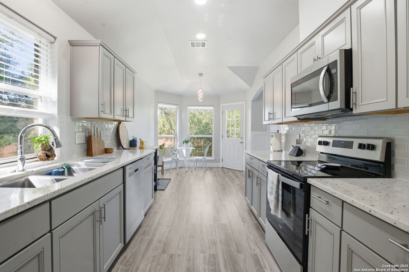 Nestled in the desirable Greenshire neighborhood, this beautifully renovated home blends classic charm with modern elegance. The inviting interior features wainscoting accents, a cozy fireplace, and abundant natural light. The chef-inspired kitchen boasts sleek countertops, stainless steel appliances, and a spacious walk-in pantry-perfect for entertaining or everyday living. The luxurious primary suite offers a spa-like retreat with a garden tub, separate shower, and generous closet space. Enjoy peaceful outdoor living on the private patio surrounded by mature trees on an oversized lot. Conveniently located near shopping, dining, major highways, and RAFB. This home combines comfort, style, and location in one of Schertz's most sought-after communities.