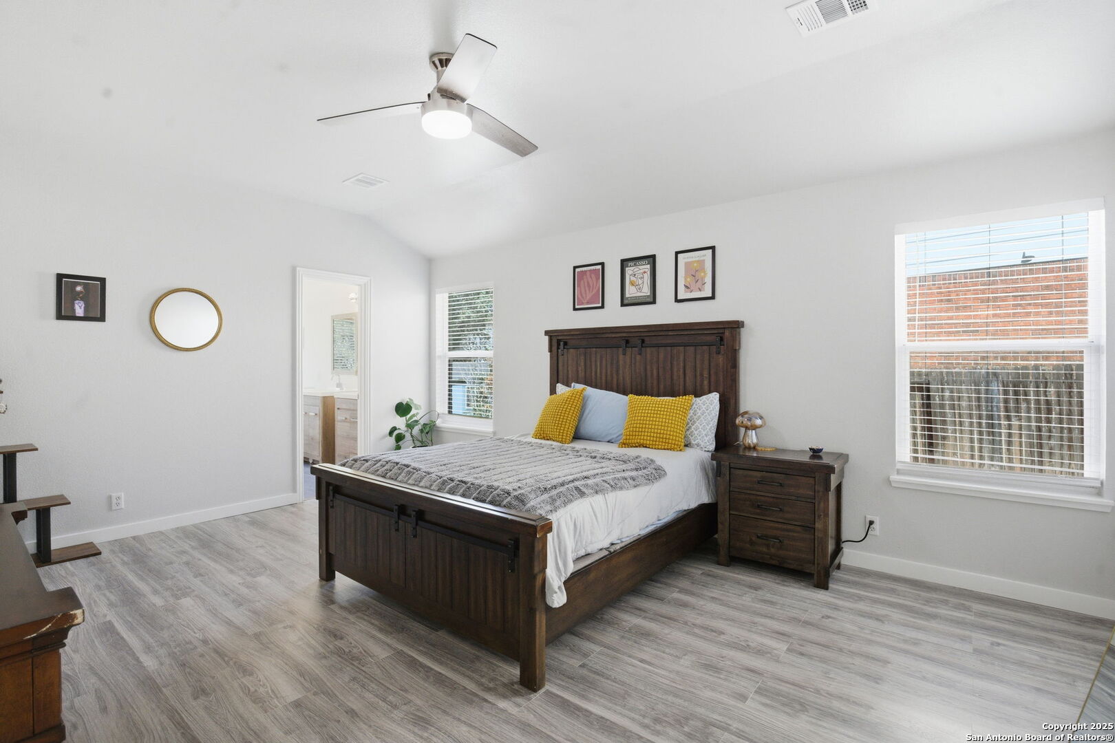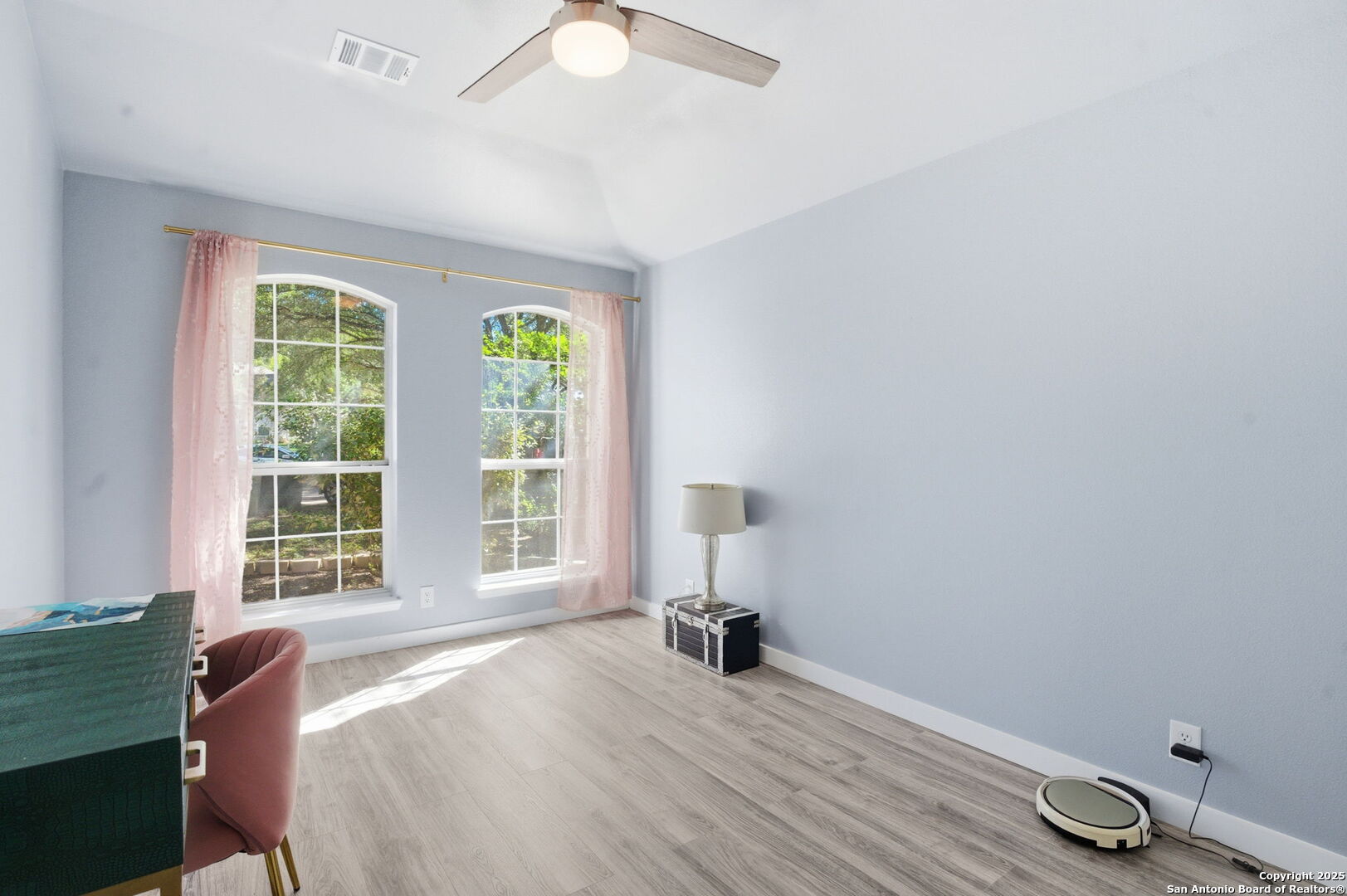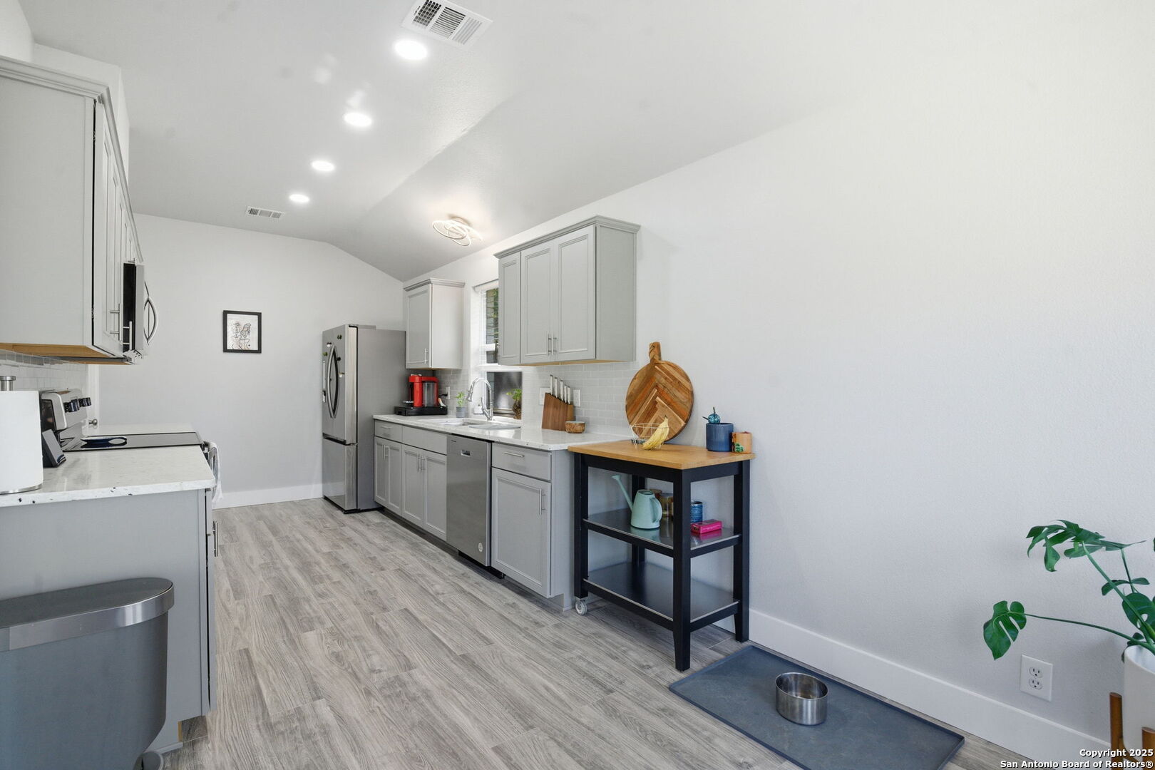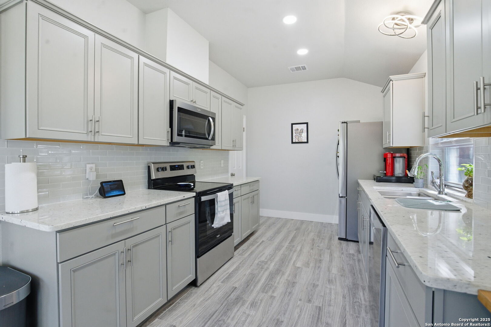 Nestled in the desirable Greenshire neighborhood, this beautifully renovated home blends classic charm with modern elegance. The inviting interior features wainscoting accents, a cozy fireplace, and abundant natural light. The chef-inspired kitchen boasts sleek countertops, stainless steel appliances, and a spacious walk-in pantry-perfect for entertaining or everyday living. The luxurious primary suite offers a spa-like retreat with a garden tub, separate shower, and generous closet space. Enjoy peaceful outdoor living on the private patio surrounded by mature trees on an oversized lot. Conveniently located near shopping, dining, major highways, and RAFB. This home combines comfort, style, and location in one of Schertz's most sought-after communities.