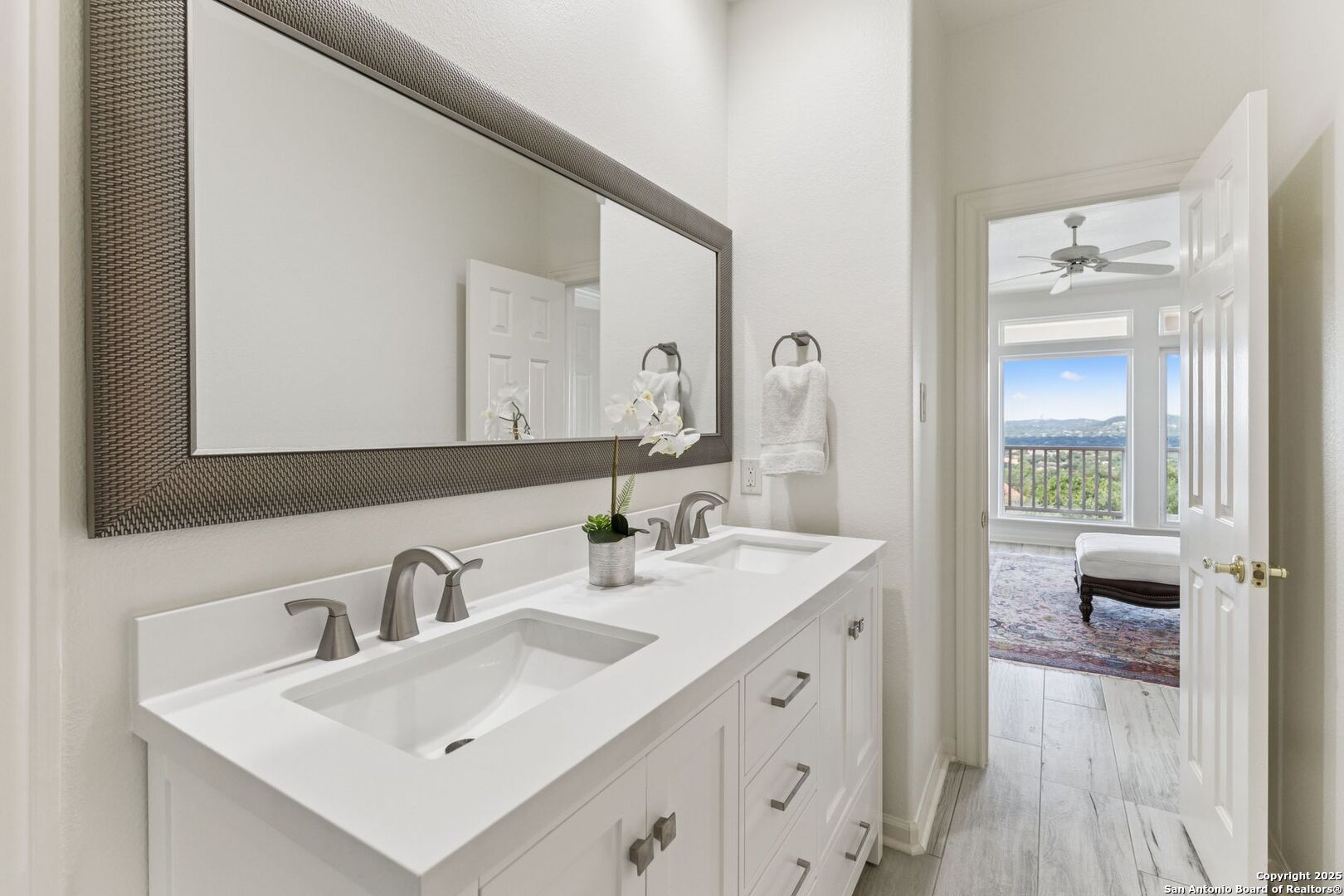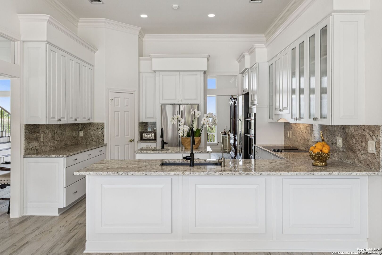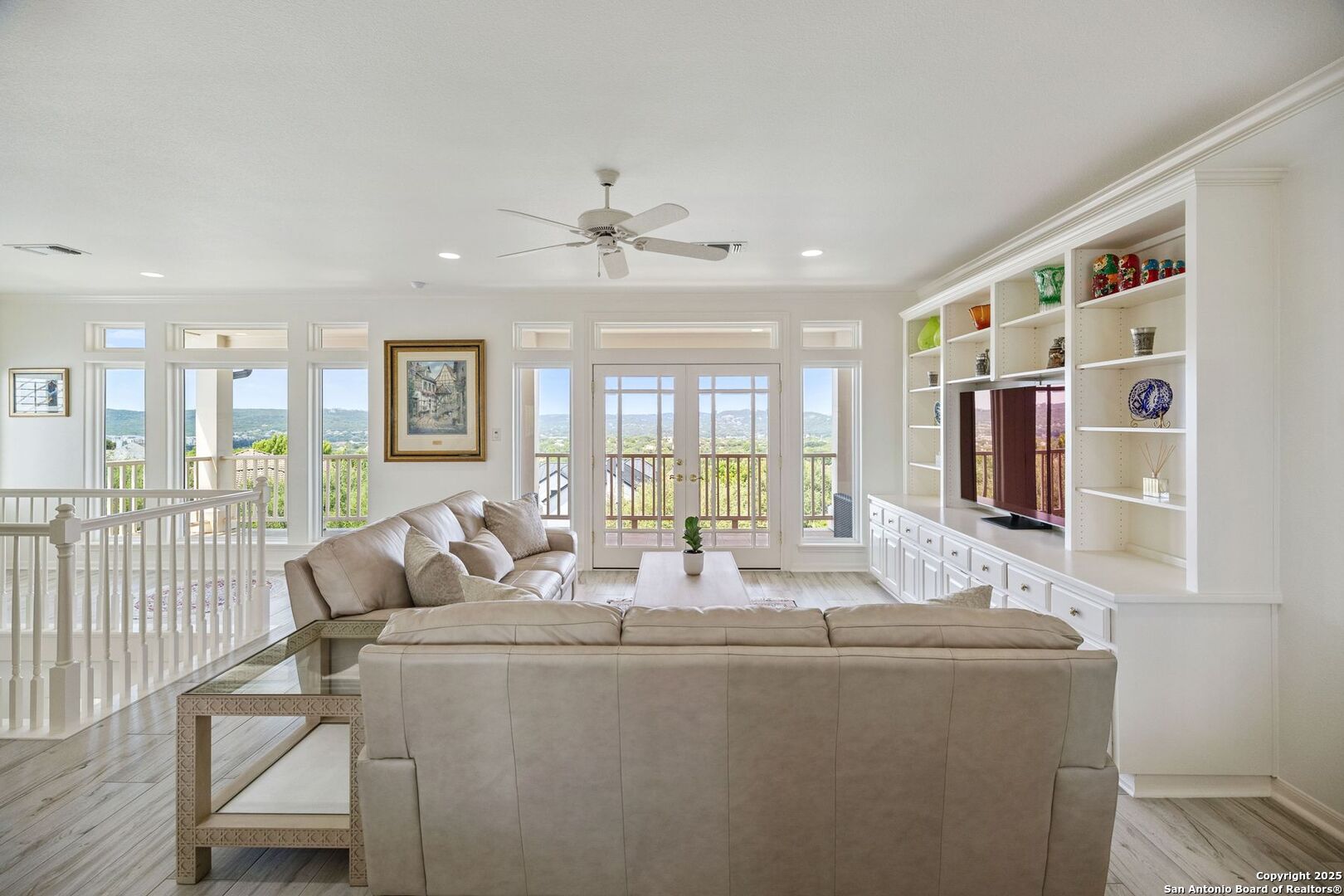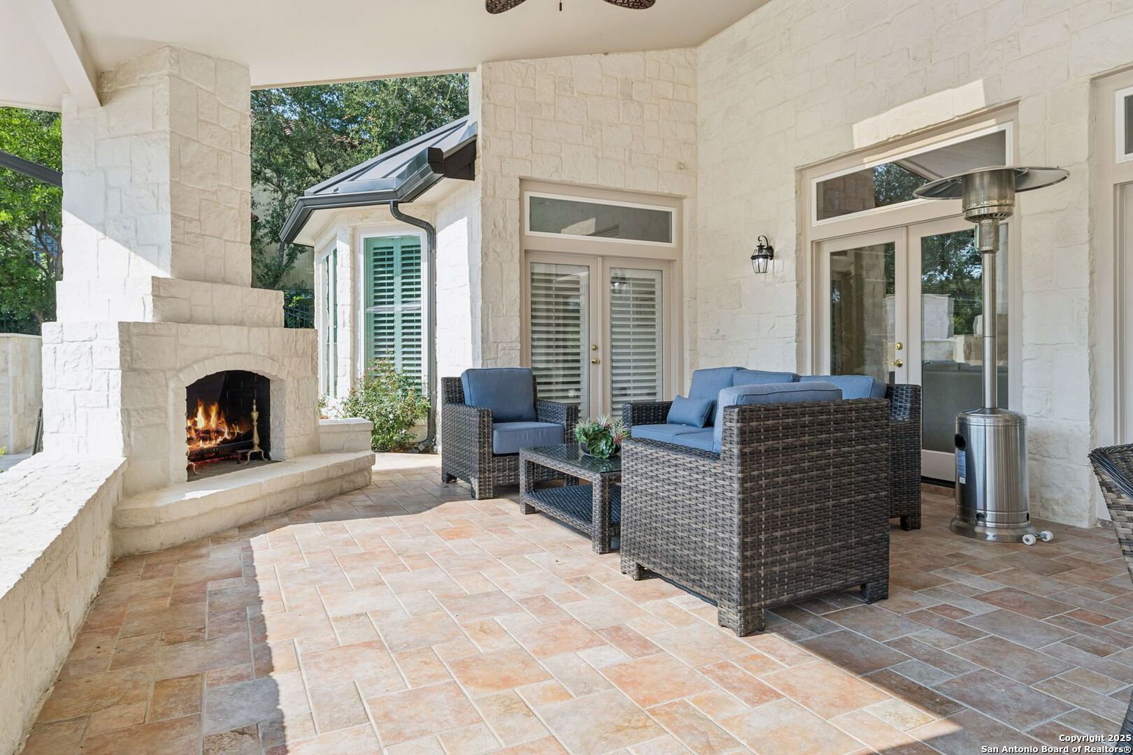 Welcome to this meticulously transformed home, perfectly situated in the heart of The Dominion. Designed for both grand entertaining and a private retreat, this residence blends modern sophistication with timeless elegance. Step inside to soaring ceilings, abundant natural light & immediate views of the outdoors. Walls of glass open seamlessly to a resort-style living space featuring an outdoor fireplace, covered patios & panoramic city views. Anchoring the property is an award-nominated 40' x 20' Cody lap pool with elegant travertine decking & dramatic lighting, a true center piece for entertaining day or night. The modern kitchen offers custom cabinetry, granite countertops & updated appliances, while Italian porcelain tile flooring flows throughout. Every bathroom has been elegantly redesigned with timeless finishes. Fresh paint, enhanced architectural lighting inside and out & energy-efficient Low-E Pella windows add comfort and peace of mind. Terraced balconies span over 700 square feet on two levels, providing the perfect setting for phenomenal views for sunset gatherings or quiet morning sunrises. A versatile 705 sq. ft. guest apartment with full bath, set privately above the garage, is ideal for family, an executive office, or an au pair suite. Designed by top-rated landscape architect Bronson Blue, the tree-lined grounds offer fabulous curb appeal and unmatched privacy, with direct adjacency to Camp Bullis & sweeping hilltop views. This is a rare opportunity to own a home that is move-in-ready, balancing prestige, craftsmanship & a lock-and-leave lifestyle in The Dominion.