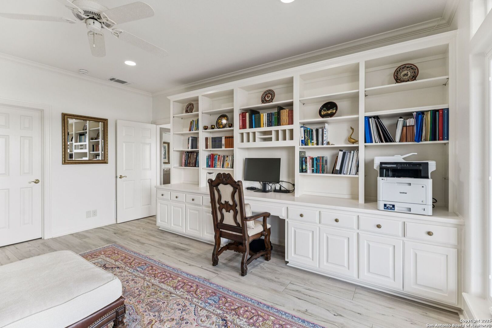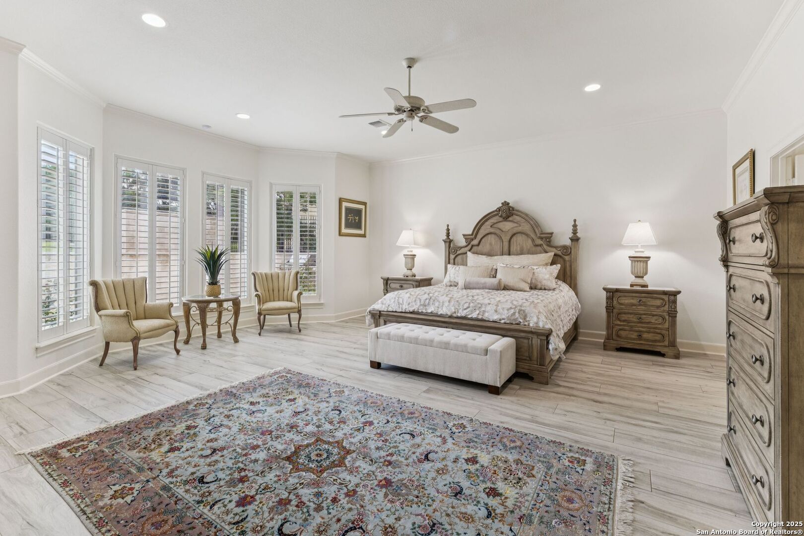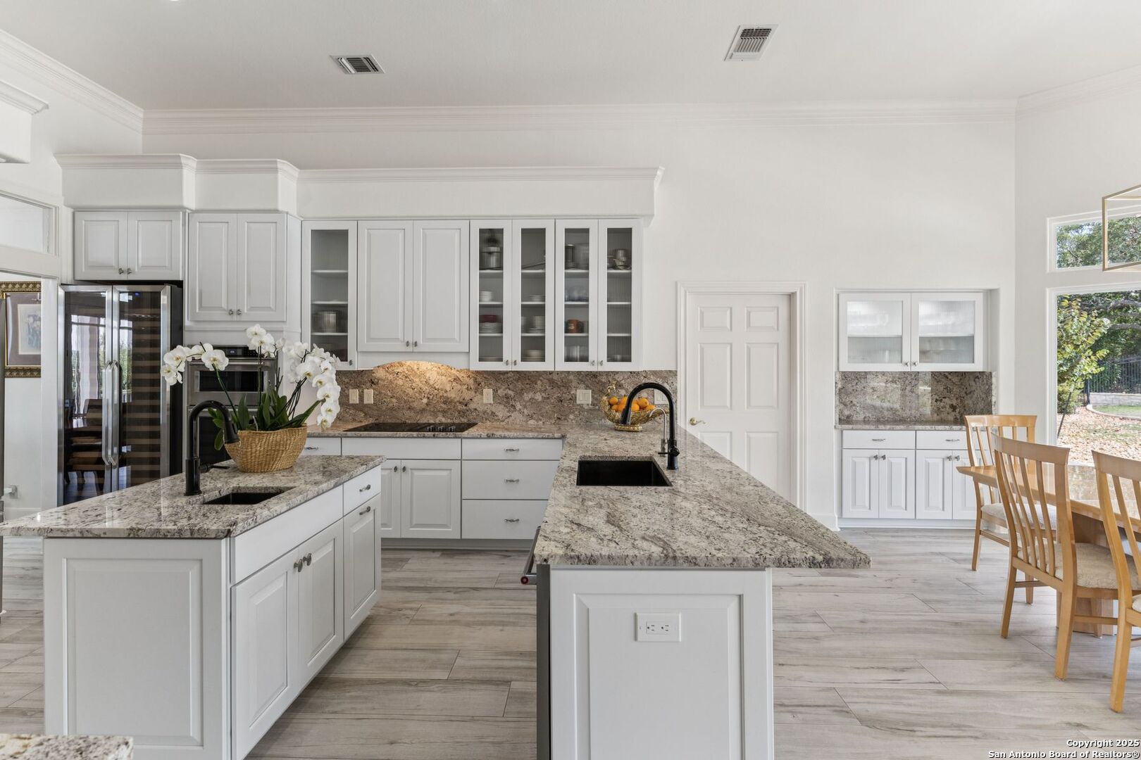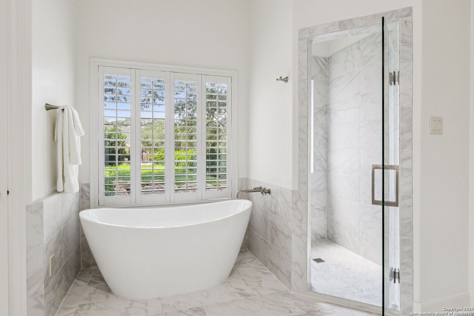 Welcome to this meticulously transformed home, perfectly situated in the heart of The Dominion. Designed for both grand entertaining and a private retreat, this residence blends modern sophistication with timeless elegance. Step inside to soaring ceilings, abundant natural light & immediate views of the outdoors. Walls of glass open seamlessly to a resort-style living space featuring an outdoor fireplace, covered patios & panoramic city views. Anchoring the property is an award-nominated 40' x 20' Cody lap pool with elegant travertine decking & dramatic lighting, a true center piece for entertaining day or night. The modern kitchen offers custom cabinetry, granite countertops & updated appliances, while Italian porcelain tile flooring flows throughout. Every bathroom has been elegantly redesigned with timeless finishes. Fresh paint, enhanced architectural lighting inside and out & energy-efficient Low-E Pella windows add comfort and peace of mind. Terraced balconies span over 700 square feet on two levels, providing the perfect setting for phenomenal views for sunset gatherings or quiet morning sunrises. A versatile 705 sq. ft. guest apartment with full bath, set privately above the garage, is ideal for family, an executive office, or an au pair suite. Designed by top-rated landscape architect Bronson Blue, the tree-lined grounds offer fabulous curb appeal and unmatched privacy, with direct adjacency to Camp Bullis & sweeping hilltop views. This is a rare opportunity to own a home that is move-in-ready, balancing prestige, craftsmanship & a lock-and-leave lifestyle in The Dominion.