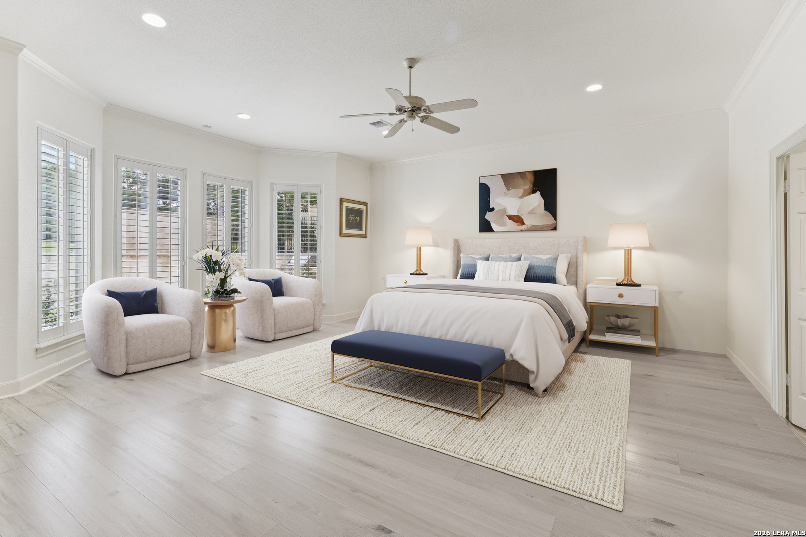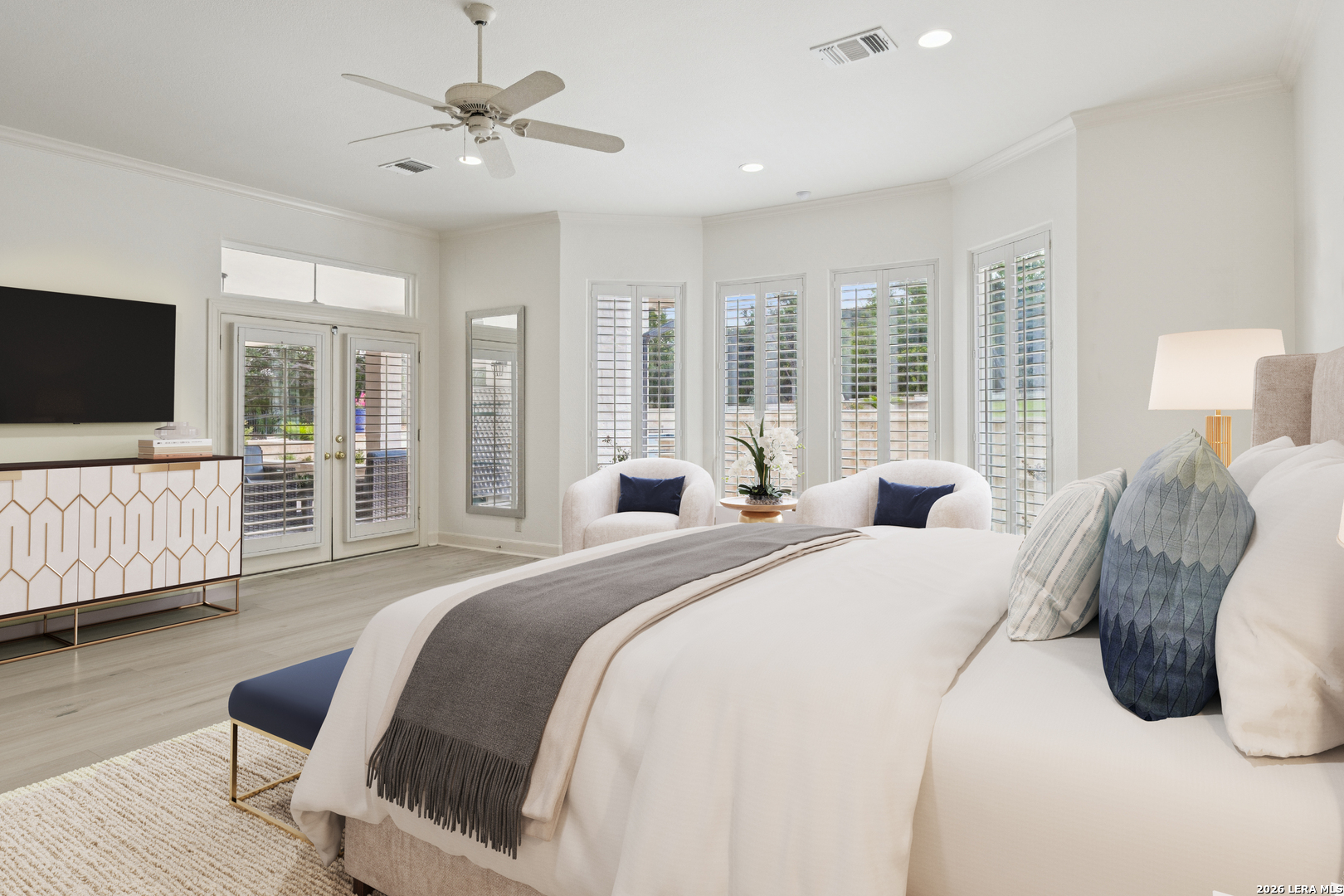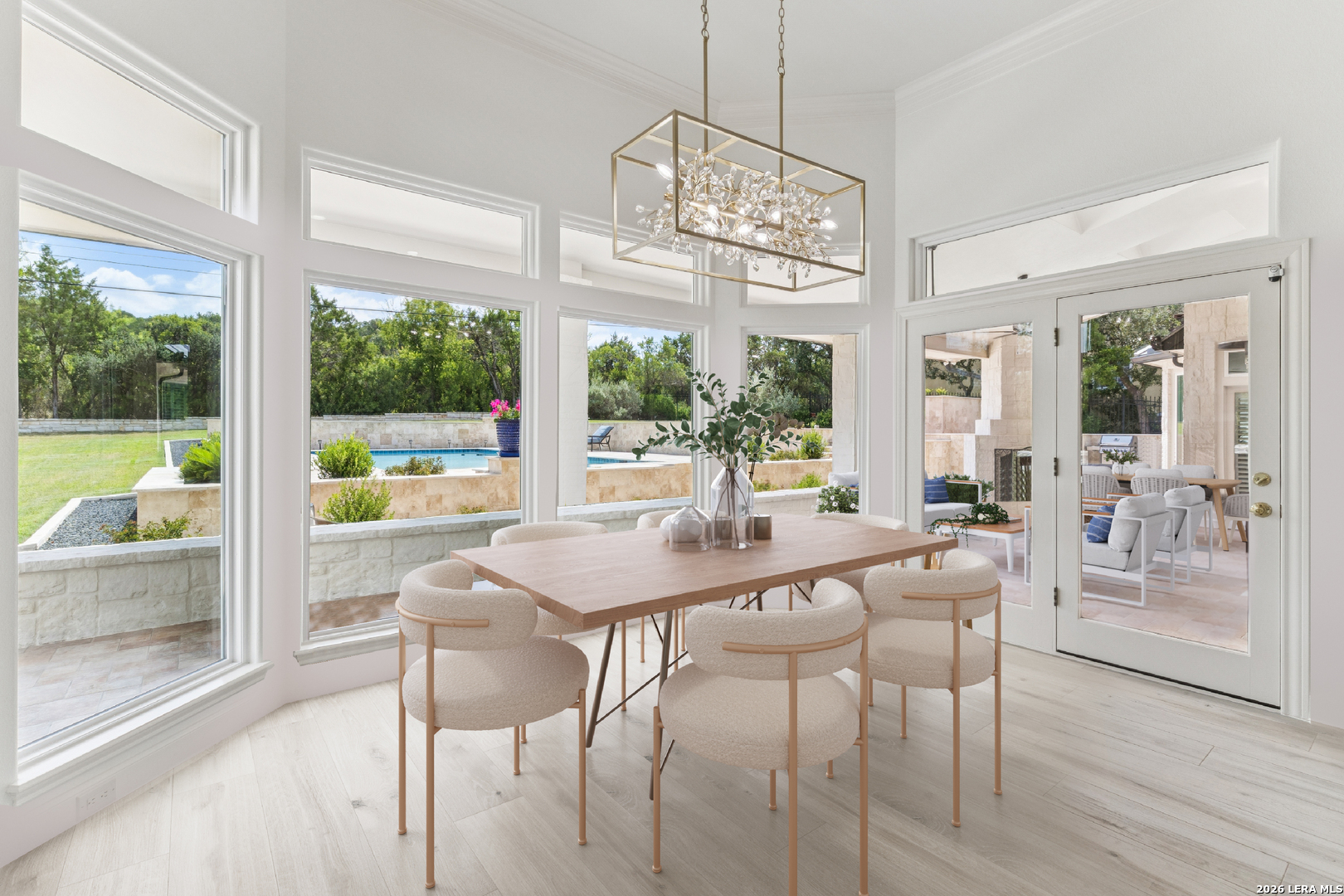 Welcome to this meticulously curated transitional home, perfectly positioned in the heart of The Dominion on a lush, half-acre lot. Designed to transition effortlessly from a sophisticated entertaining venue to a private retreat, the residence features soaring ceilings, Italian porcelain flooring, and walls of glass that frame immediate views of the resort-style grounds. The outdoor oasis is anchored by an award-nominated 40' x 20' Cody lap pool with travertine decking, dramatic architectural lighting, and an outdoor fireplace, all set against a backdrop of panoramic hilltop and city views. Professional landscaping by Bronson Blue ensures unmatched privacy, with the property backing directly to the serene landscape of Camp Bullis. The interior is equally impressive, with a great kitchen with floor-to-ceiling cabinetry, granite countertops, and a gas-range option ready behind the wall. Every bathroom has been thoughtfully recreated with simplistic finishes, complemented by fresh paint and energy-efficient Low-E Pella windows throughout. For those seeking versatility, a private & rarely found 705 sq. ft. guest apartment with a full bath sits above the garage, perfect for an executive office, gym, or multi-generational suite. With over 700 sq. ft. of terraced balconies for sunset gatherings and a layout that supports a "lock-and-leave" lifestyle, this home offers a rare balance of prestige, craftsmanship, and modern comfort.