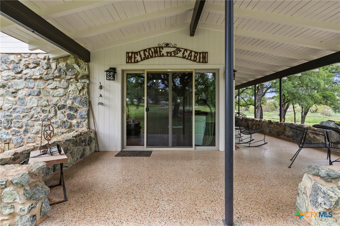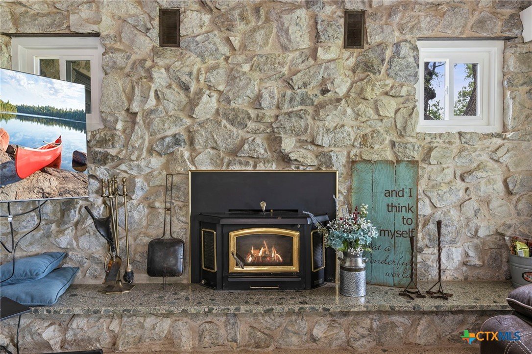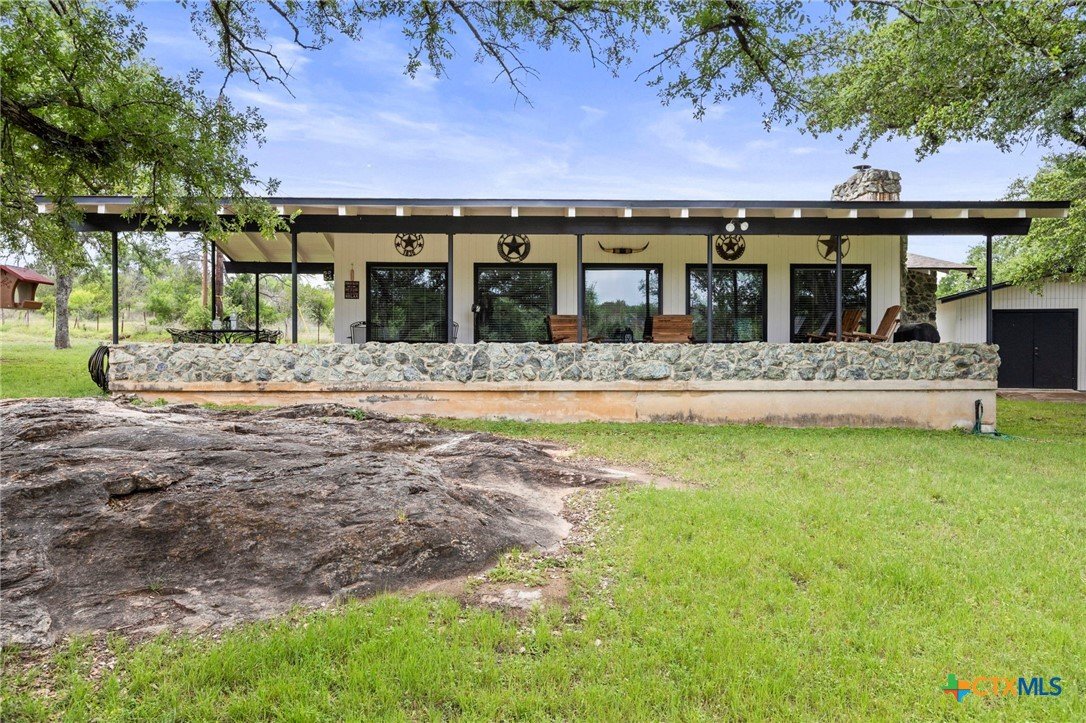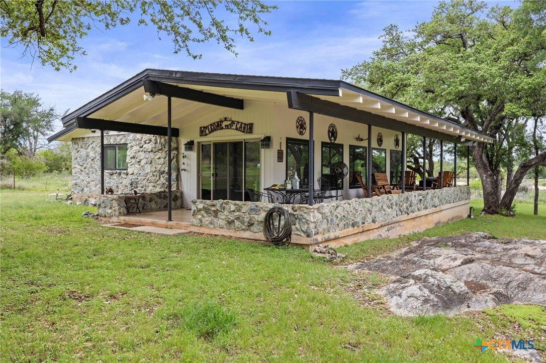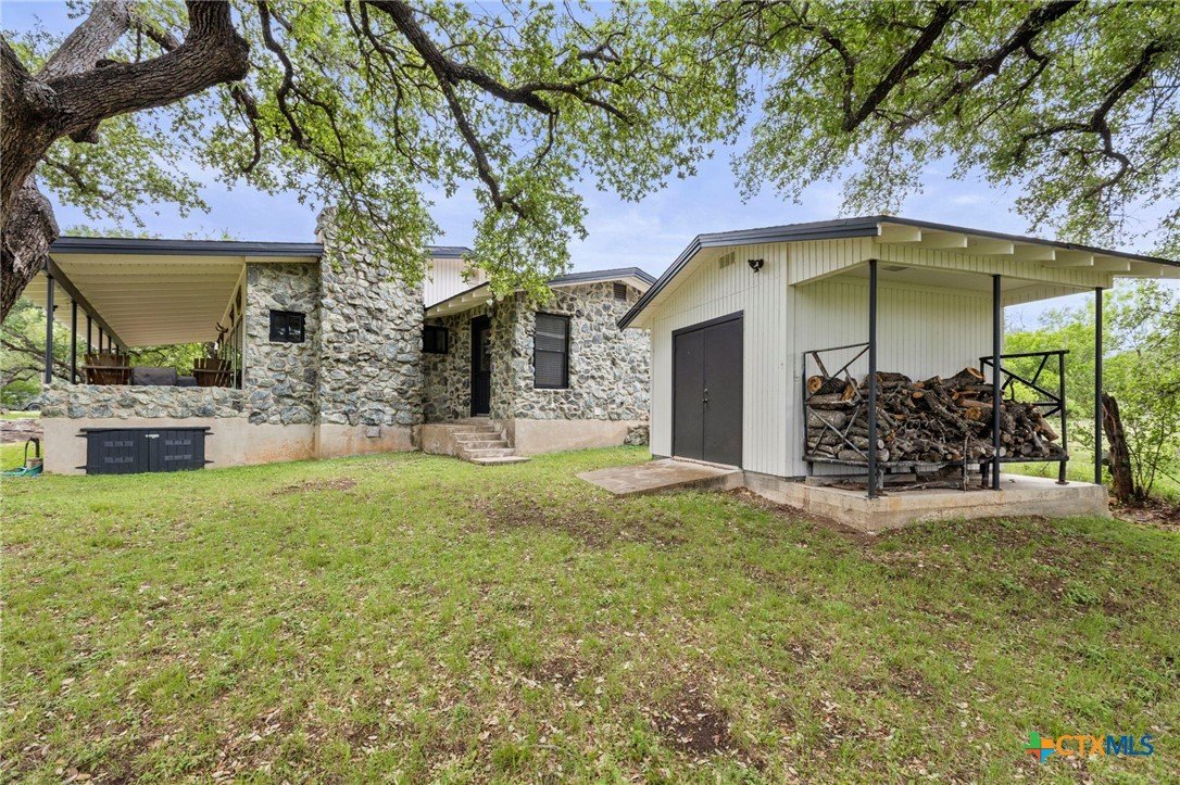 Tucked beneath towering live oaks on nearly an acre, this 2-bedroom, 2-bath stone cabin is your private retreat- with direct Sandy Creek frontage and neighborhood access to Lake LBJ just steps away. Step onto the expansive covered porch and you're immediately greeted by nothing but oak canopy, open sky, and the kind of quiet that's genuinely hard to find. Your nearest neighbor is a 1,200-acre working cattle ranch, so the peace and privacy here are real and not going anywhere. Sip your morning coffee while deer graze in the yard. Stretch out in a hammock under the oaks on a Sunday afternoon. Walk the beach-like shores of Sandy Creek and let the water run over your feet. This is a place where the pace of life slows down- and stays that way. The neighborhood has two boat launches and four parks, putting you on Lake LBJ in under a minute. Lake LBJ is a constant-level lake fed by the Colorado River, boatable year-round regardless of rainfall- perfect for wake surfing, water skiing, tubing, kayaking, fishing for bass and catfish, or cruising at sunset across 6,400 acres of Hill Country water. Ample room on the property to store a boat trailer, jet skis, or a pontoon. The home has been thoughtfully refreshed inside and out- fresh paint through the entire interior, freshly painted exterior, and all windows and doors recently replaced. Inside, the cabin is full of character- terrazzo floors, a dramatic stone fireplace, and warm wood-beam ceilings. The kitchen features sage cabinets and brass hardware against crisp new walls, and the open living and dining area flows naturally to the porch. A detached storage shed and covered firewood storage round out the property. Low POA dues + property taxes, and move-in ready condition make this one easy to say yes to. Whether you're looking for a full-time residence, a weekend escape, or a short-term rental investment, this property checks every box: privacy, nature, and one of the best lakes in Texas right at your doorstep.