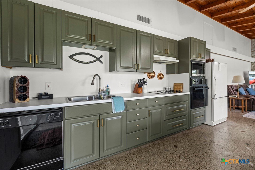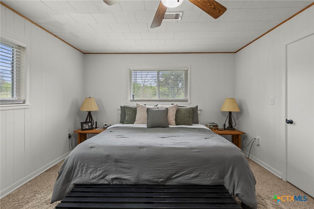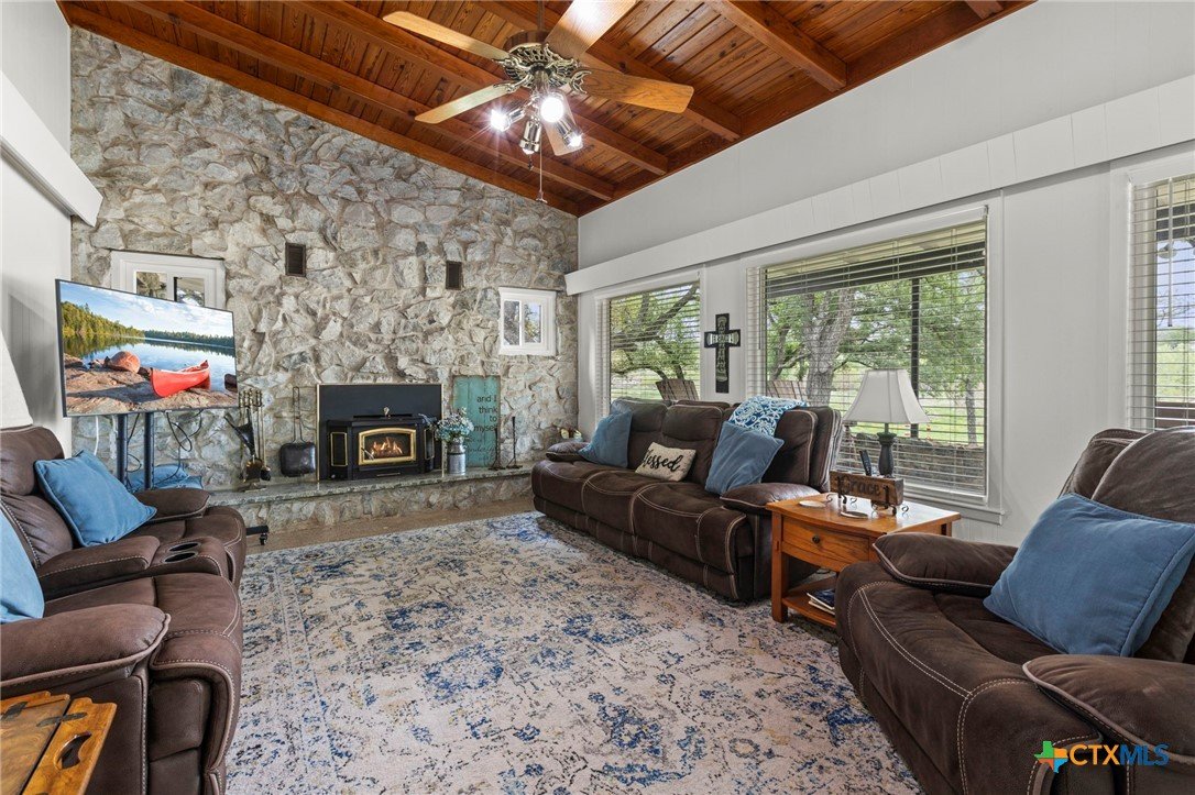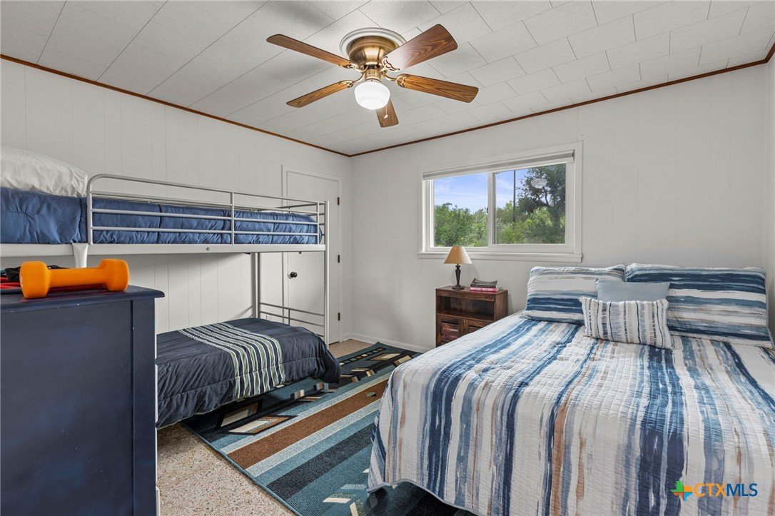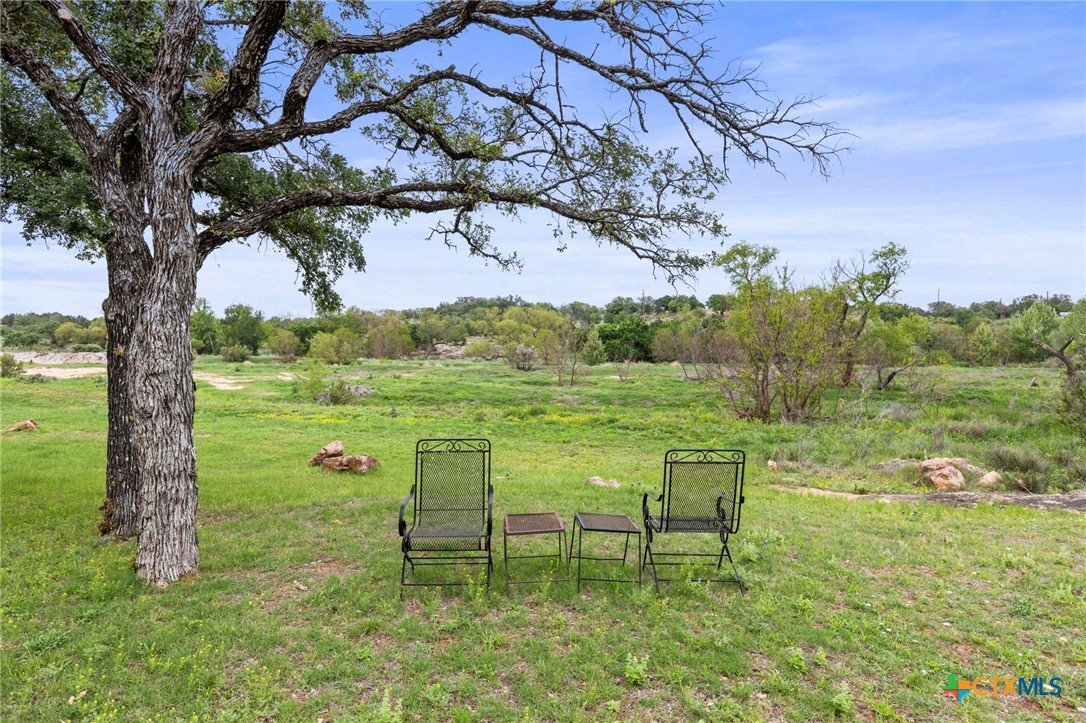Tucked beneath towering live oaks on nearly an acre, this 2-bedroom, 2-bath stone cabin is your private retreat- with direct Sandy Creek frontage and neighborhood access to Lake LBJ just steps away. Step onto the expansive covered porch and you're immediately greeted by nothing but oak canopy, open sky, and the kind of quiet that's genuinely hard to find. Your nearest neighbor is a 1,200-acre working cattle ranch, so the peace and privacy here are real and not going anywhere. Sip your morning coffee while deer graze in the yard. Stretch out in a hammock under the oaks on a Sunday afternoon. Walk the beach-like shores of Sandy Creek and let the water run over your feet. This is a place where the pace of life slows down- and stays that way. The neighborhood has two boat launches and four parks, putting you on Lake LBJ in under a minute. Lake LBJ is a constant-level lake fed by the Colorado River, boatable year-round regardless of rainfall- perfect for wake surfing, water skiing, tubing, kayaking, fishing for bass and catfish, or cruising at sunset across 6,400 acres of Hill Country water. Ample room on the property to store a boat trailer, jet skis, or a pontoon. The home has been thoughtfully refreshed inside and out- fresh paint through the entire interior, freshly painted exterior, and all windows and doors recently replaced. Inside, the cabin is full of character- terrazzo floors, a dramatic stone fireplace, and warm wood-beam ceilings. The kitchen features sage cabinets and brass hardware against crisp new walls, and the open living and dining area flows naturally to the porch. A detached storage shed and covered firewood storage round out the property. Low POA dues + property taxes, and move-in ready condition make this one easy to say yes to. Whether you're looking for a full-time residence, a weekend escape, or a short-term rental investment, this property checks every box: privacy, nature, and one of the best lakes in Texas right at your doorstep.