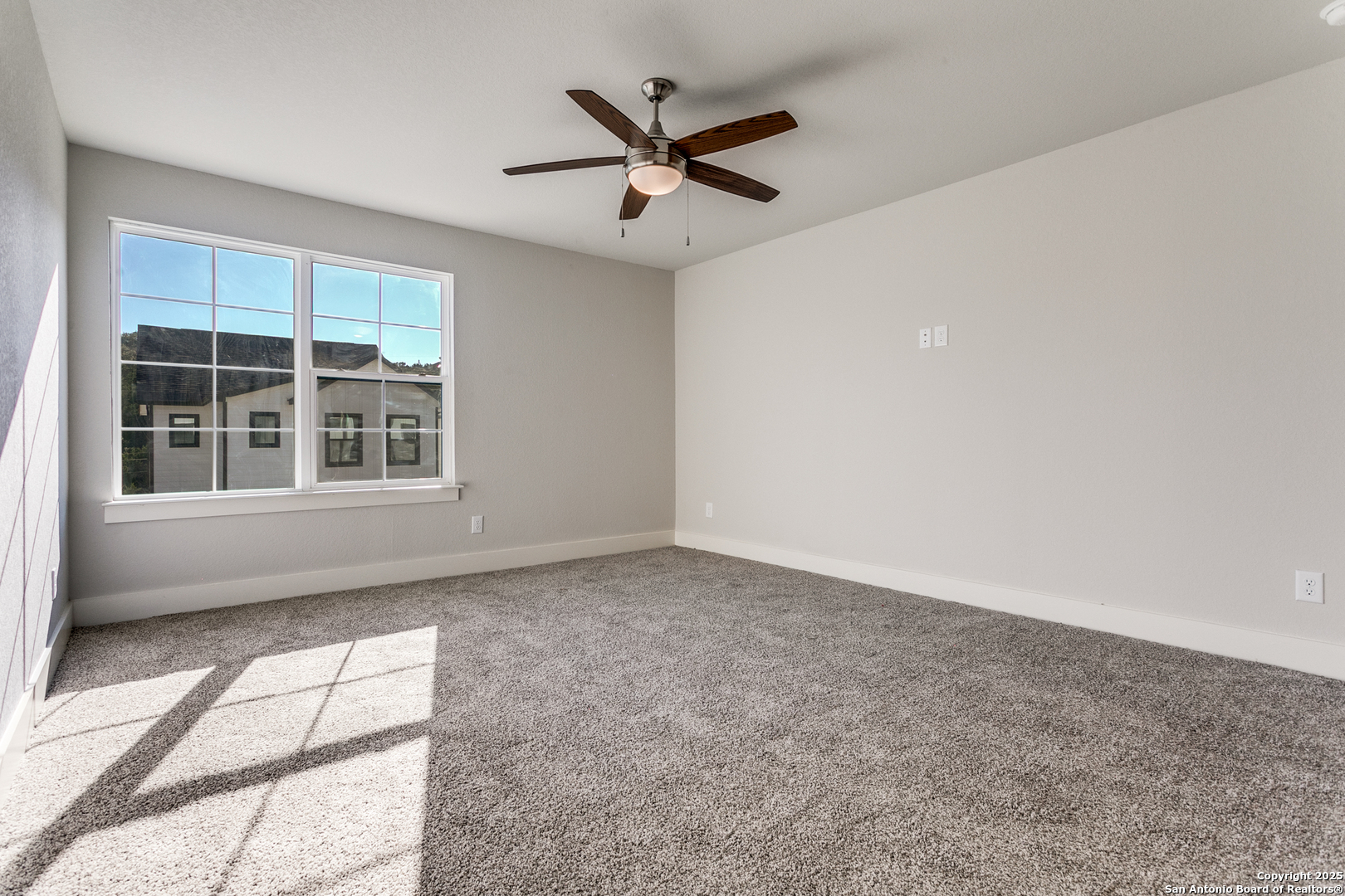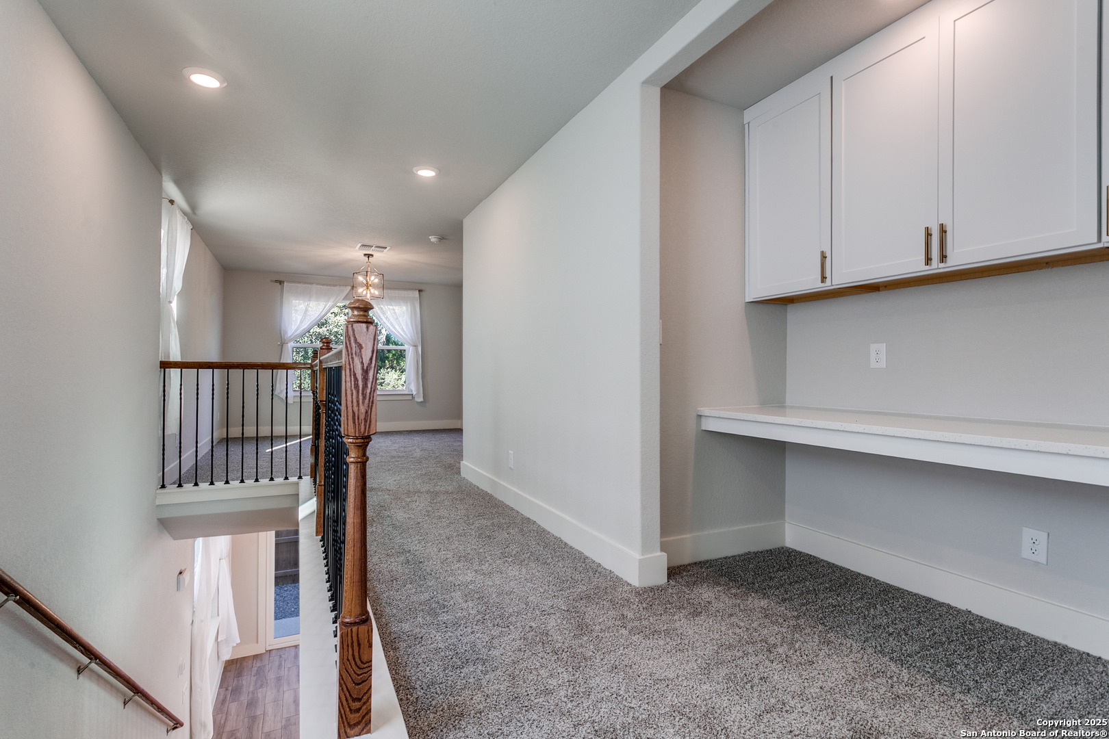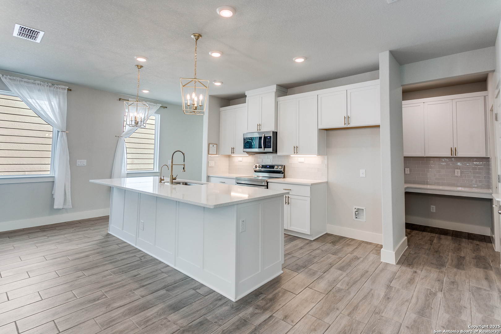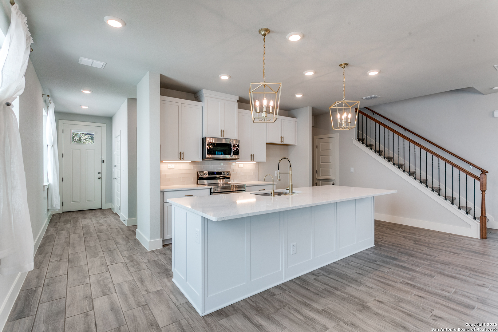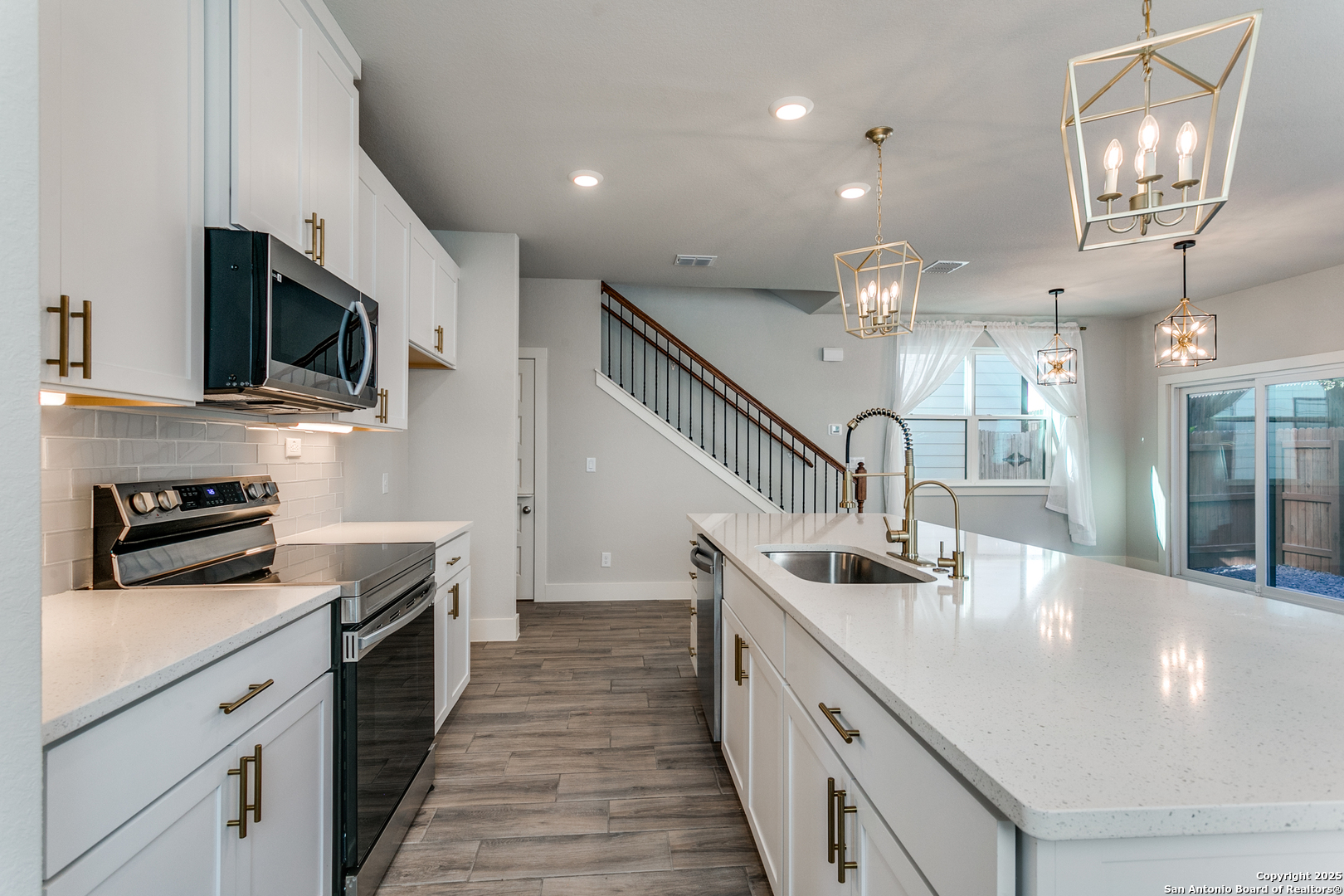 Situated in a quiet gated community near UTSA, La Cantera, and The Rim, 16011 Babcock Rd features 3 spacious bedrooms, 2.5 bathrooms, and a 2-car garage. Step inside to a bright and airy open-concept layout with wood-look tile flooring, sleek finishes, and a gourmet kitchen with quartz countertops, stainless stove, microwave and dishwasher. A large island for entertaining. The upstairs primary suite includes a walk-in closet and dual vanity bathroom, while the two secondary bedrooms are ideal for guests, family, or a home office. Enjoy a private backyard retreat that is perfect for winding down or entertaining friends.