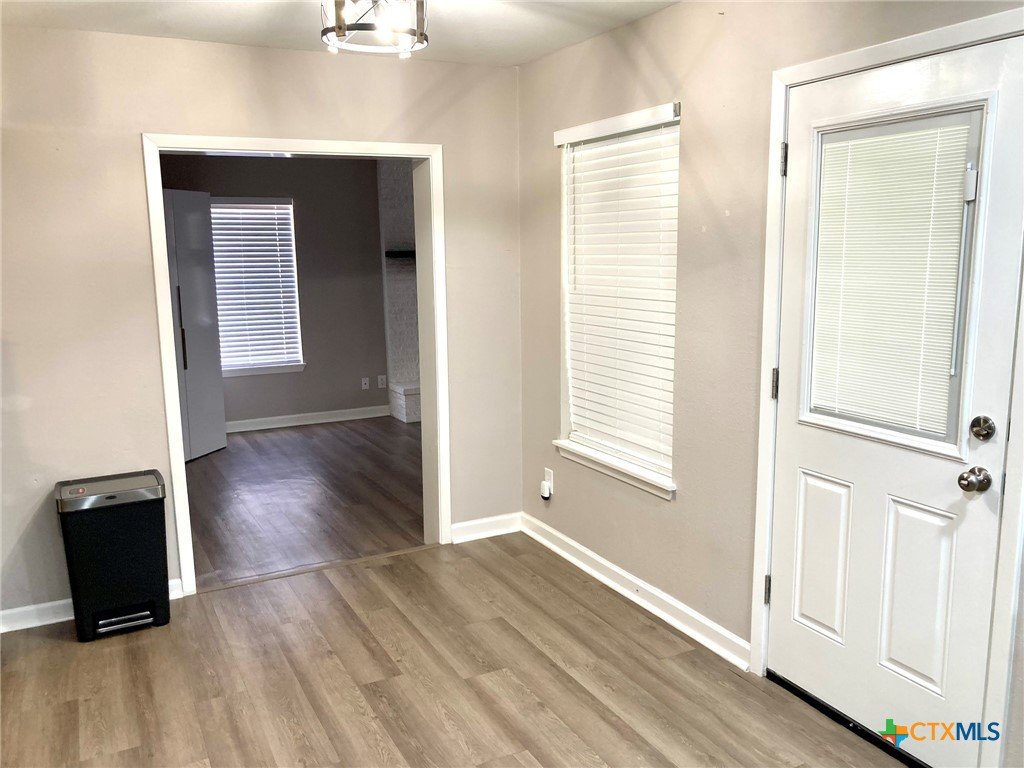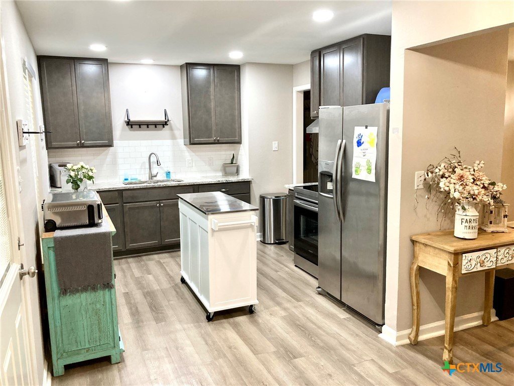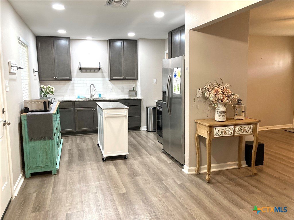 Adorable and completely updated 2 bedroom, 1 bath home with an additional flex room with fireplace, that could be used as a 2nd living area, 3rd bedroom or game room. Features include vinyl plank flooring, carpet, new light and plumbing fixtures, 30 year roof and windows installed in 2024, fresh interior paint and an updated electrical panel. Enjoy relaxing on the large covered patio with a spacious back yard and wood privacy fence. Please do not pet the cat, he is a little finicky. Island in kitchen does not convey.