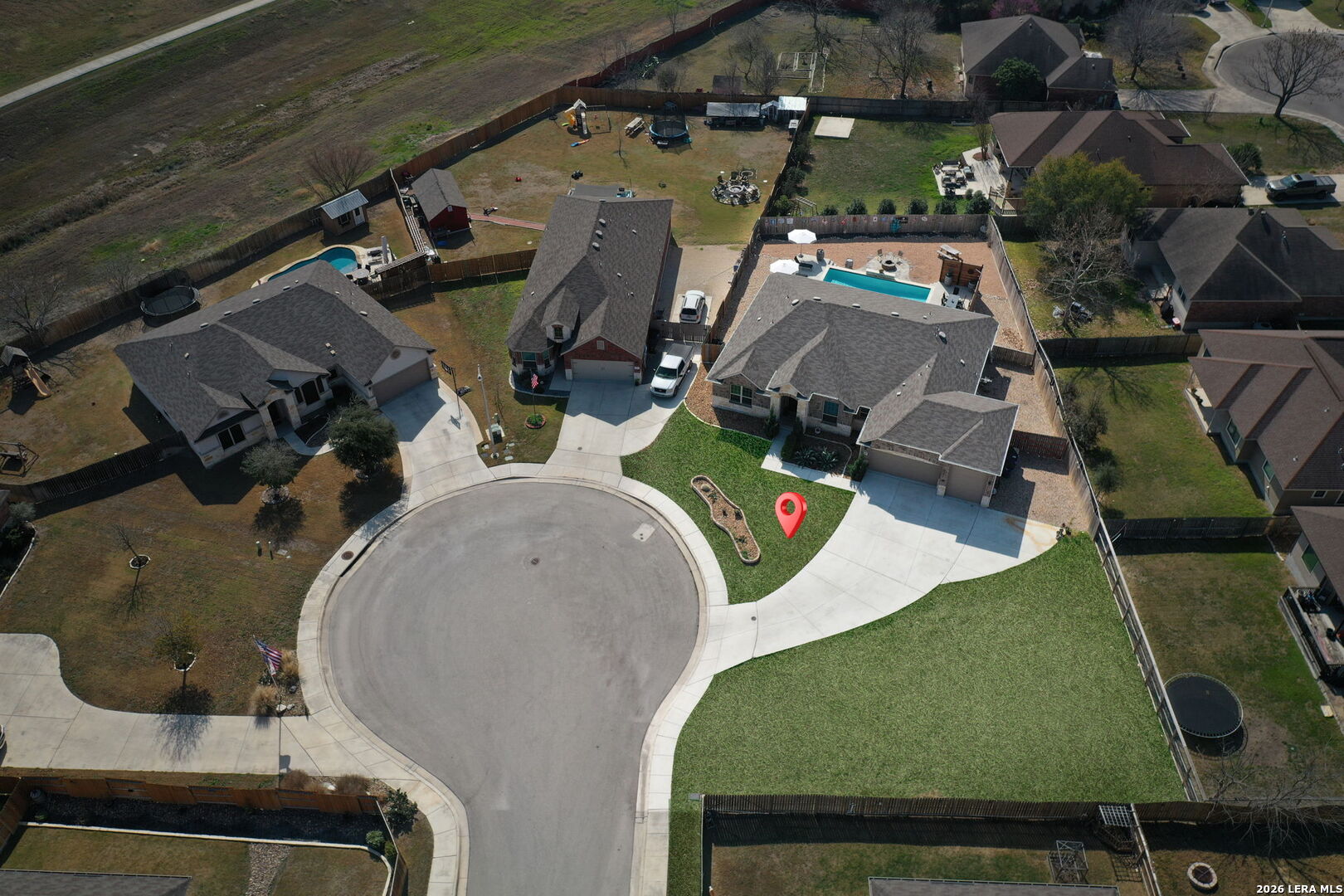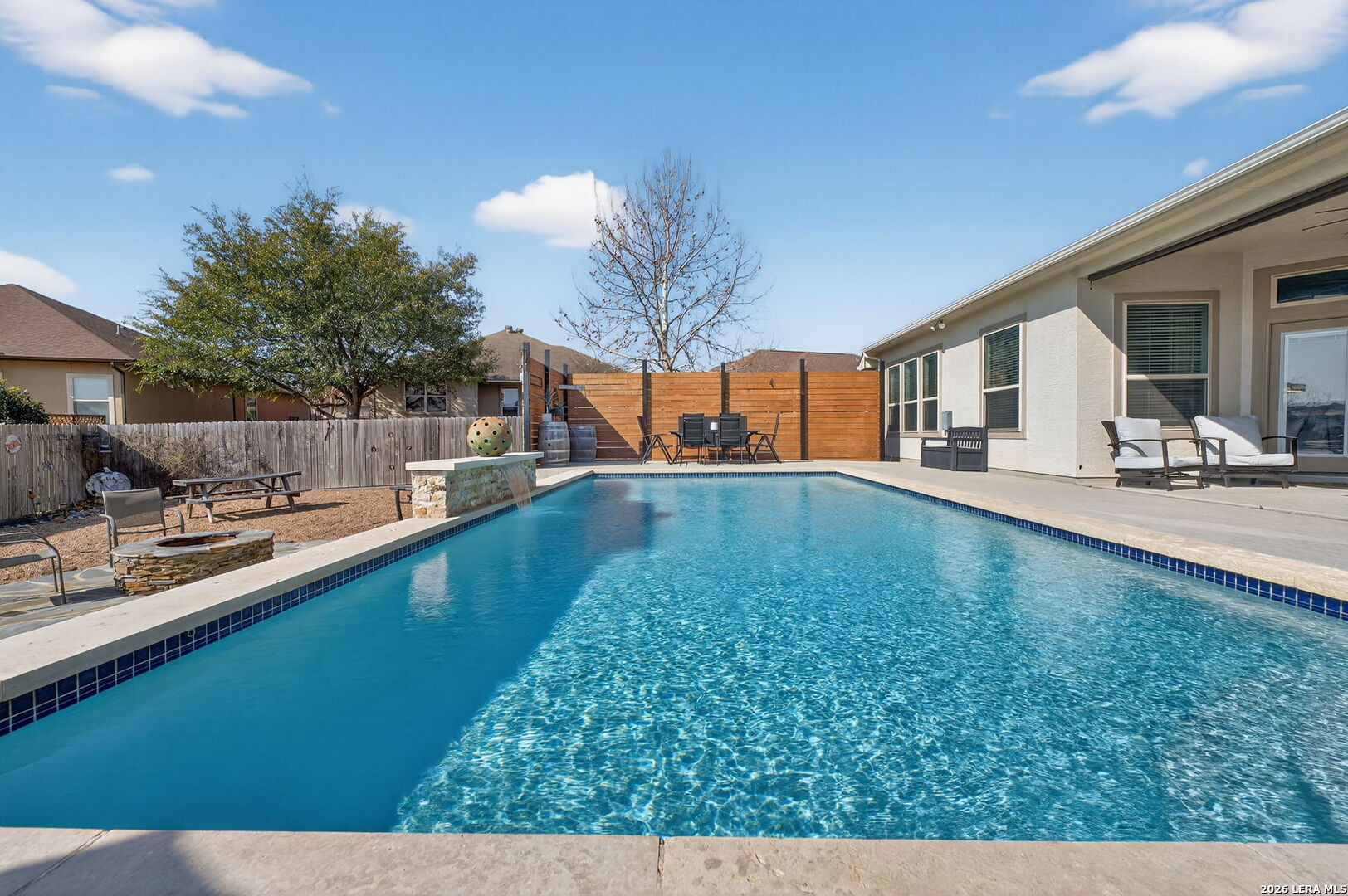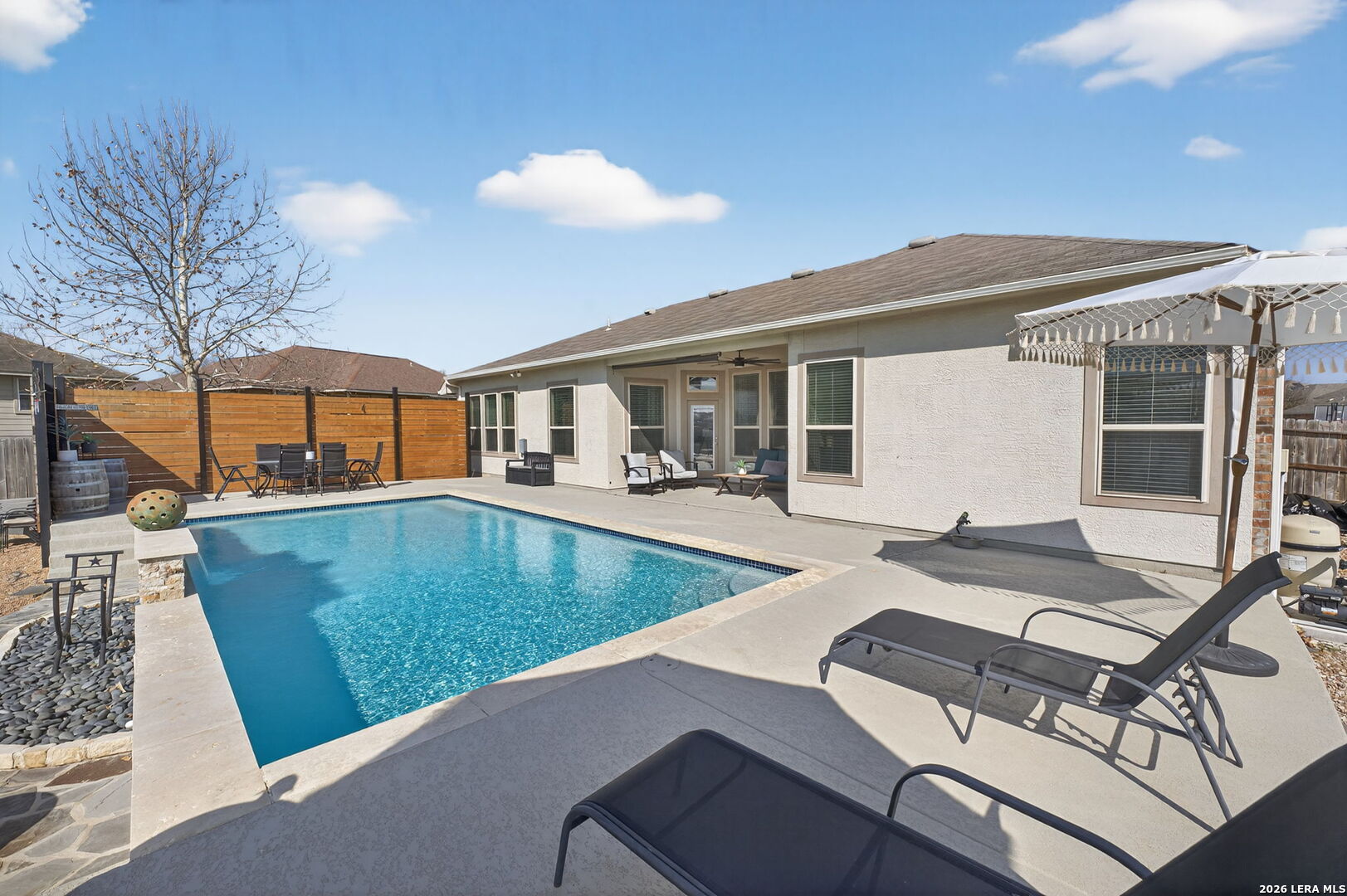 Located on a quiet cul de sac at 1608 Alvin Cir in New Braunfels, this beautifully maintained single story home offers an open layout, modern finishes, and a backyard MASSIVE designed for entertaining. The exterior features a combination of brick and stone with mature landscaping and a spacious driveway leading to a three car garage and garage bay that is taller in height, making it ideal for storing a boat, RV, or oversized vehicle. The property is NOT located in an HOA, providing additional flexibility for owners. The home has had only one owner and still carries approximately two years remaining on the foundation warranty, offering additional peace of mind. Inside, the home welcomes you with tall ceilings and a bright entry that flows into an open living space. Wood look tile flooring runs throughout the main living areas, creating a clean and durable finish. The living room opens directly to the kitchen and dining area, making the space ideal for everyday living or hosting guests. The kitchen includes granite countertops, a large center island, stainless steel appliances, dark cabinetry, and ample counter space for cooking and entertaining. The primary suite features tray ceilings, large windows that bring in natural light, and a spacious bathroom with dual vanities, granite counters, a large walk in shower, and generous storage. Additional It has a Secondary Ensuite perfect for a mother-in-lawlaw suite, bedrooms provide flexible space for guests, guests, or a home office. Step outside and the backyard becomes the highlight of the property. The outdoor space includes a covered patio, an in ground pool with a water feature, an extended pool deck for seating and dining, and a custom fire pit area perfect for relaxing evenings. The yard also includes a dedicated dog run and plenty of space to enjoy the outdoors while maintaining privacy. Conveniently located near shopping, dining, and major routes connecting New Braunfels to San Antonio and Austin, this home combines comfort, functionality, and outdoor living in one inviting property. Few minutes from 46 Lake Dunlap, and 10 minutes from downtown new Braunfels this is an incredible property in a neighborhood that rarely has inventory