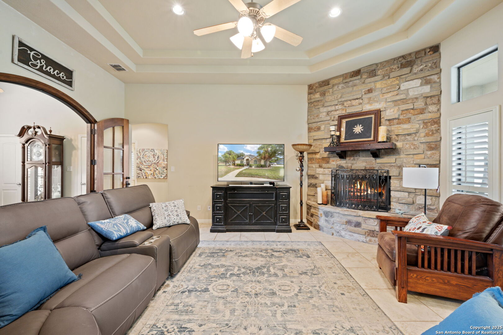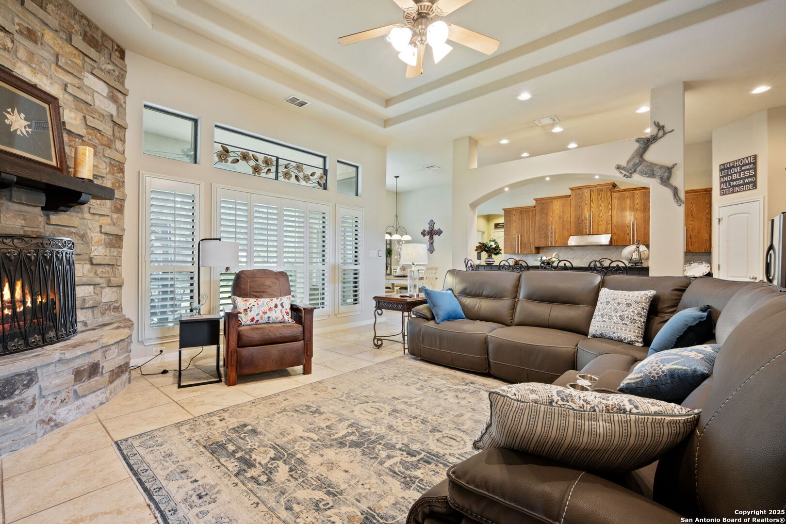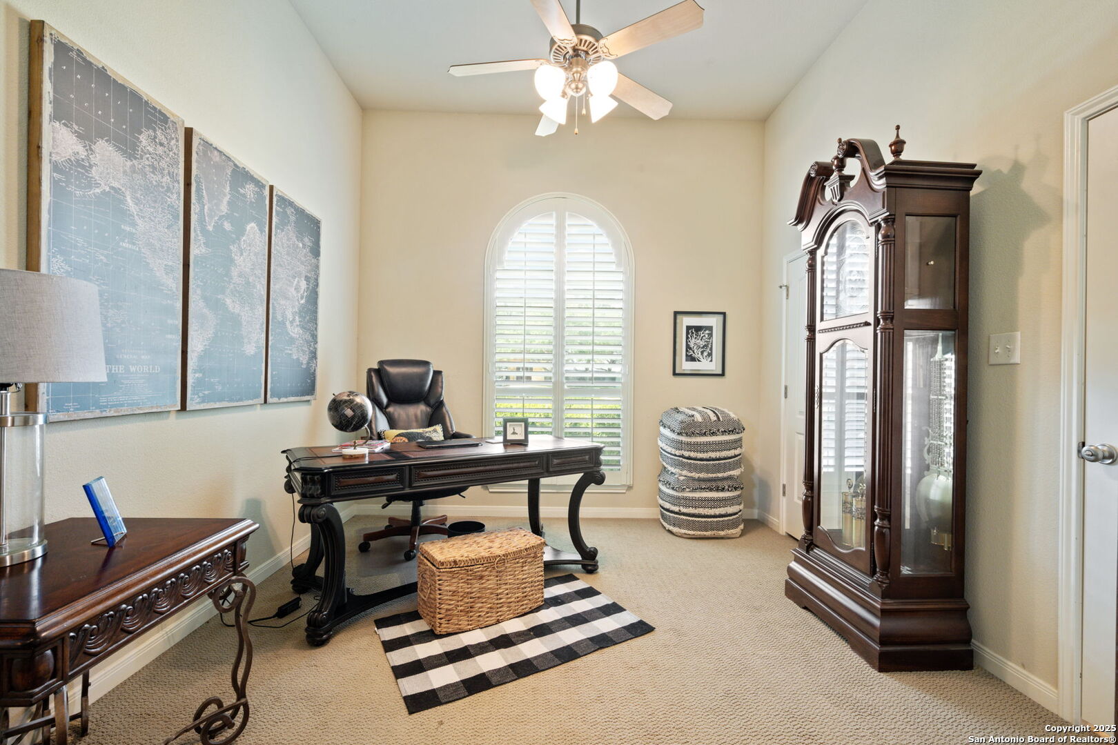 Stunning Rock and Stucco Home in a Picturesque Neighborhood Welcome to your dream home! This beautiful rock and stucco residence is nestled on an expansive landscaped lot, offering the perfect combination of elegance and comfort. With three/four spacious bedrooms and two stylish baths, this home is designed for modern living and entertaining. As you approach the property, you'll be captivated by its charming exterior, featuring a blend of rich rock and smooth stucco. 50 year transferable roof warrant!!!! The well-maintained landscaping enhances the overall ambiance, welcoming you into your serene oasis. Step inside to discover an inviting environment with high ceilings and abundant natural light filtering through plantation shutters. The open-concept layout fosters a sense of flow, perfect for both relaxation and gatherings. The heart of the home, this stunning kitchen boasts gleaming granite countertops and comes complete with all appliances, making meal preparation a delight. The spacious utility room offers added convenience, keeping everything organized and within reach. For those who work from home or simply need a quiet space to focus, the exquisite office features glass doors and a fancy window, providing an inspiring and peaceful atmosphere to enhance productivity. Gather around the beautiful fireplace in the living room, creating a warm and inviting space for family and friends. This area seamlessly connects to the heart of the home, making it perfect for entertaining or enjoying quiet family evenings. Escape to your private backyard oasis, complete with a covered patio ideal for alfresco dining, a cozy firepit for chilly nights, and a meticulously maintained sprinkler system to ensure the lush landscape remains vibrant year-round. This is a space designed for unforgettable summer gatherings and peaceful evenings under the stars. The attached two-car garage offers plenty of storage and parking space, ensuring your vehicles are sheltered from the elements. Storage unit in back yard doesn't convey with the property......