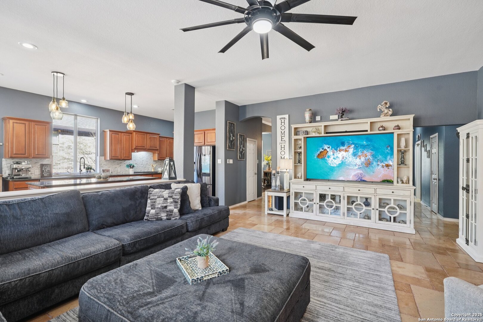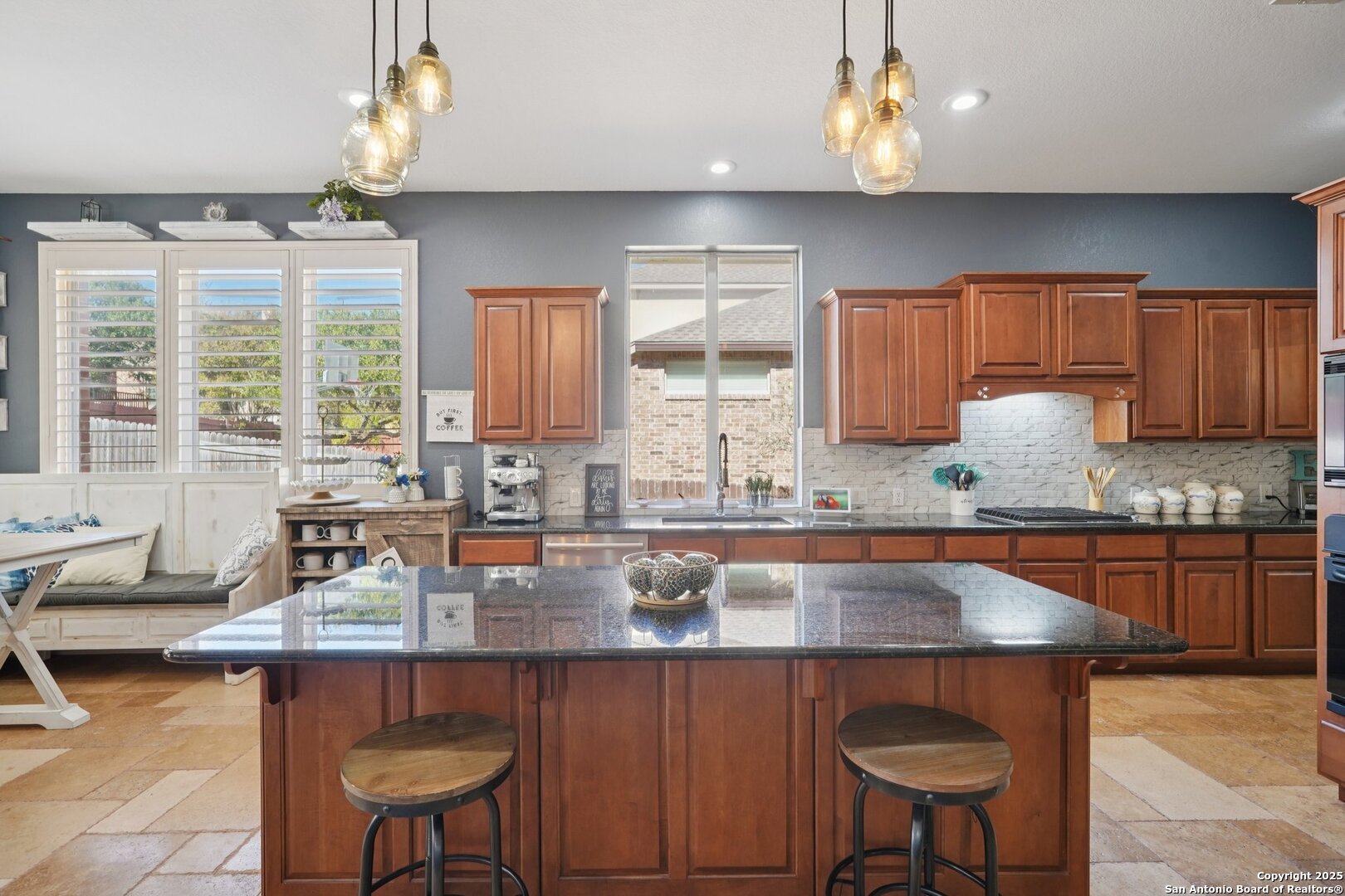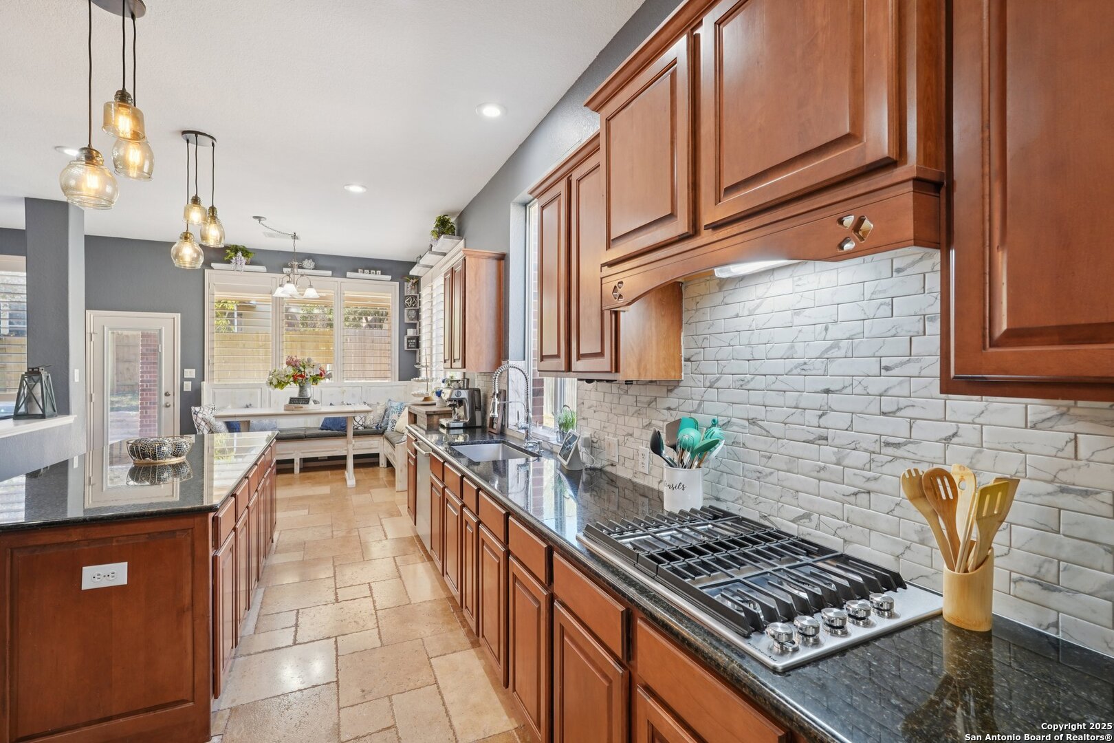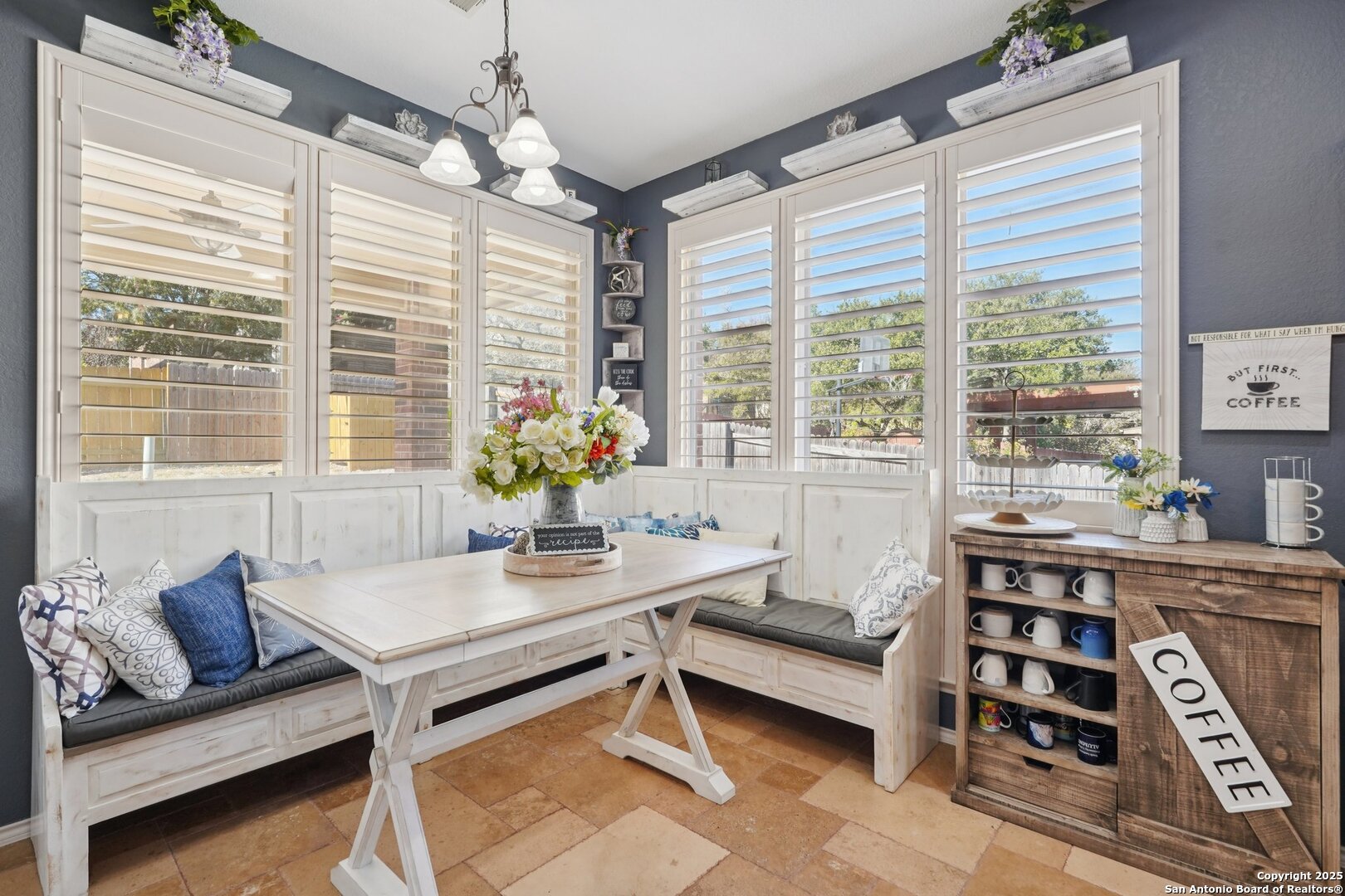 Escape to this serene gated community of The Hills at Sonoma Ranch with amazing neighborhood amenities. You'll love the curb appeal of this gorgeous single-story Highland home with mature trees and 4 sides brick/stone exterior. This open floor plan comes with high ceilings, tons of natural light, luxurious upgrades, and room for everyone. Host all the best gatherings with plenty of indoor/outdoor living space, including an island kitchen with gas cooktop, built-in breakfast table, granite counters, walk-in pantry, and separate dining room with wood flooring. Unwind in your spacious primary suite featuring a spa-like bath with a walk-in shower, jetted tub, dual granite vanities, and a roomy walk-in closet. Cozy up by the fireplace, relax in your soothing hot tub, or enjoy backyard BBQ's and evenings by the firepit. 3 additional bedrooms are split from the primary suite for extra privacy. The 2nd bathroom includes a double vanity with granite and your guests have access to a half bath. Excellent location with easy access to 1604 and I-10, Shops at La Cantera, The Rim, Six Flags, UTSA, two HEB's, Costco, shopping, dining, and entertainment right at your fingertips. This spectacular home is move-in ready and includes the hot tub, water softener, and custom breakfast table with bench.