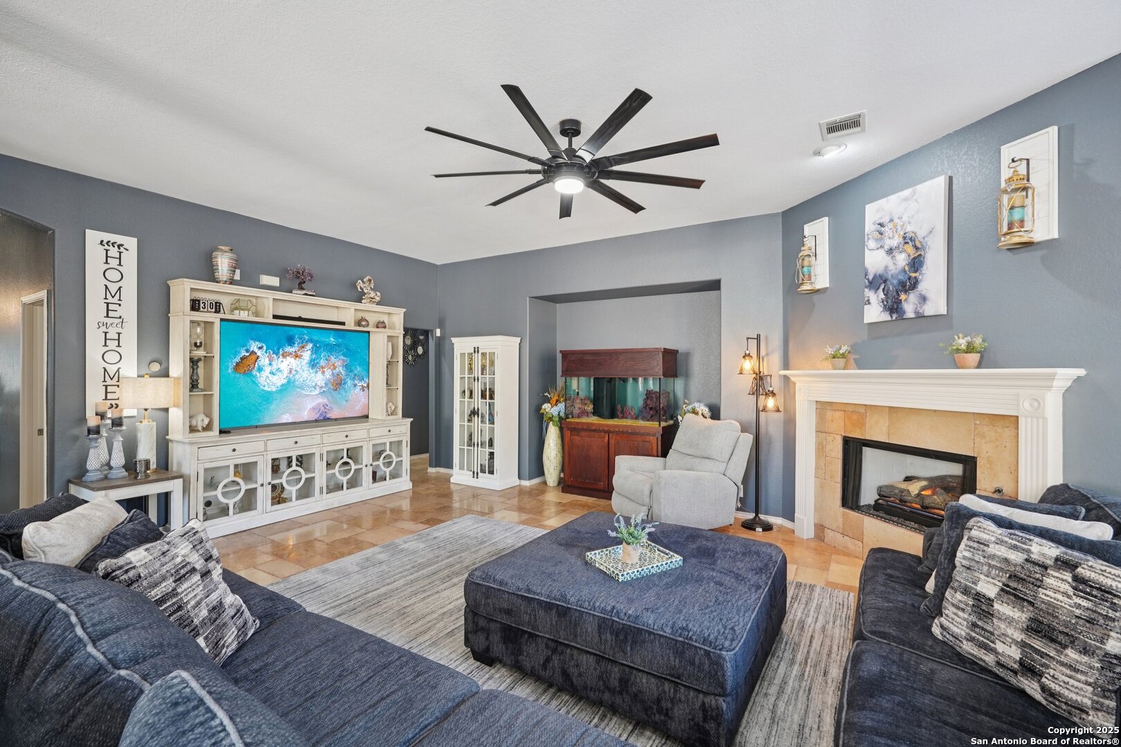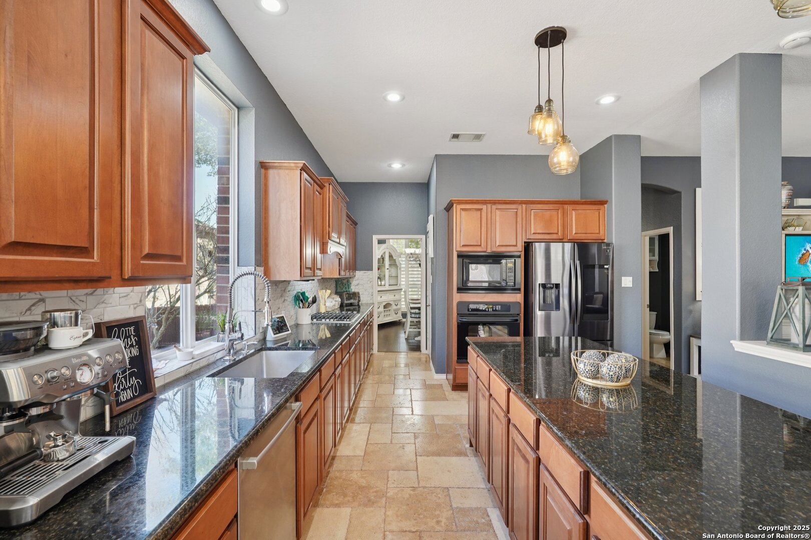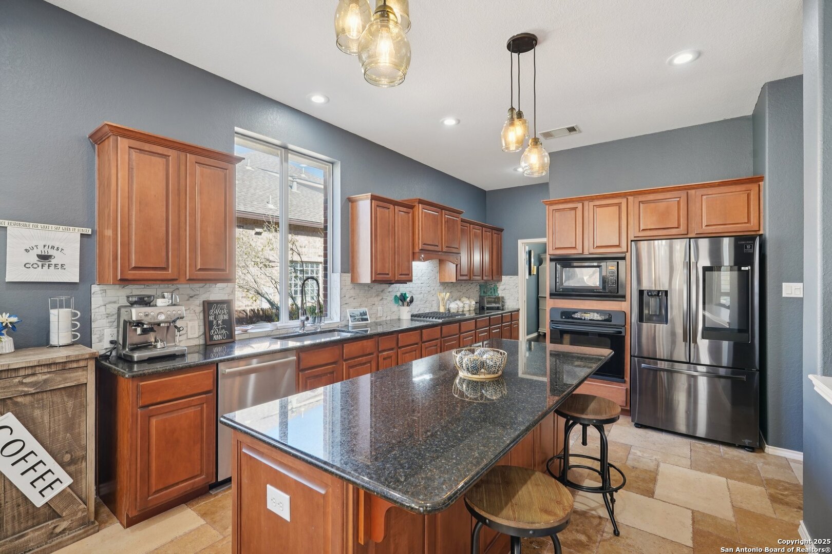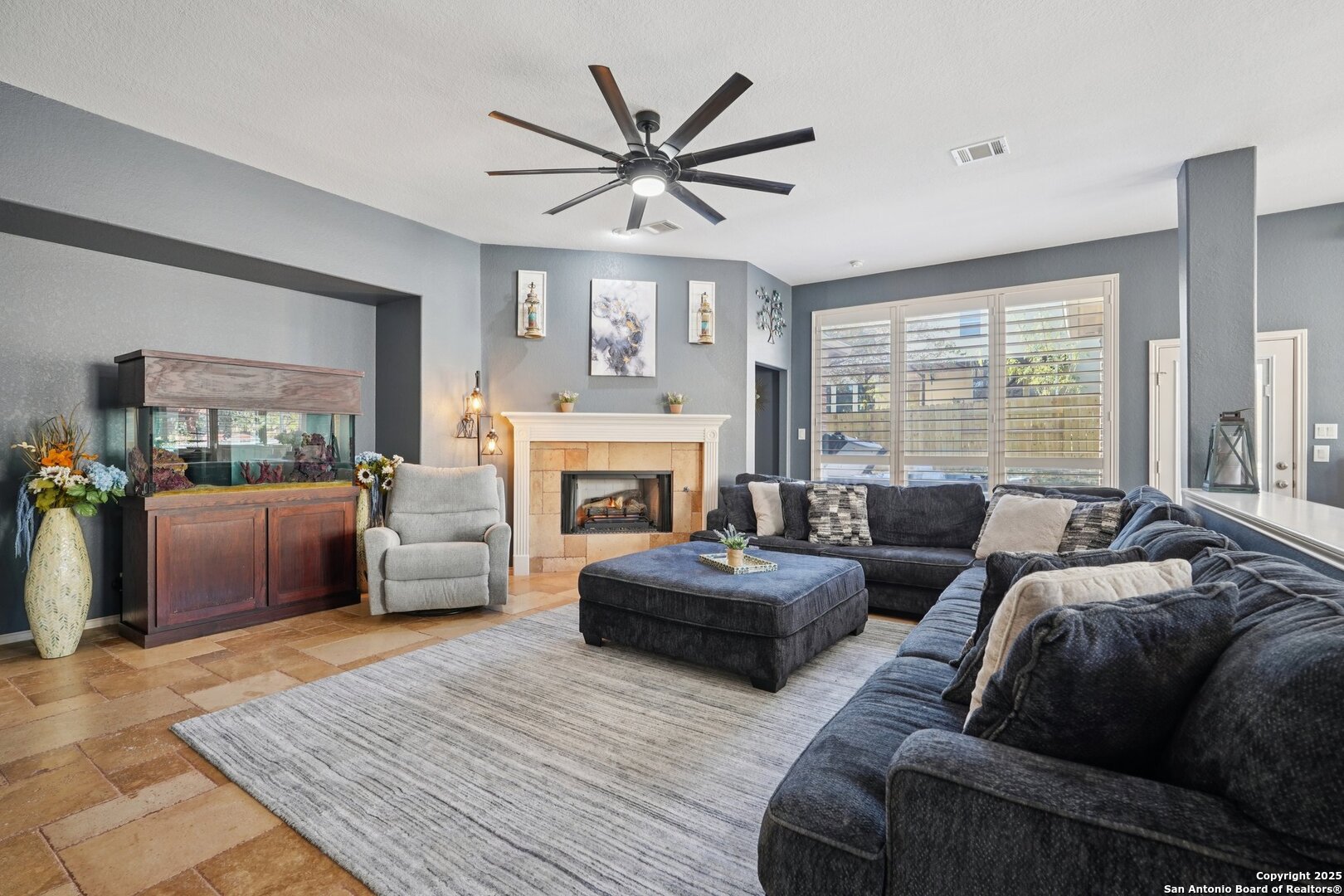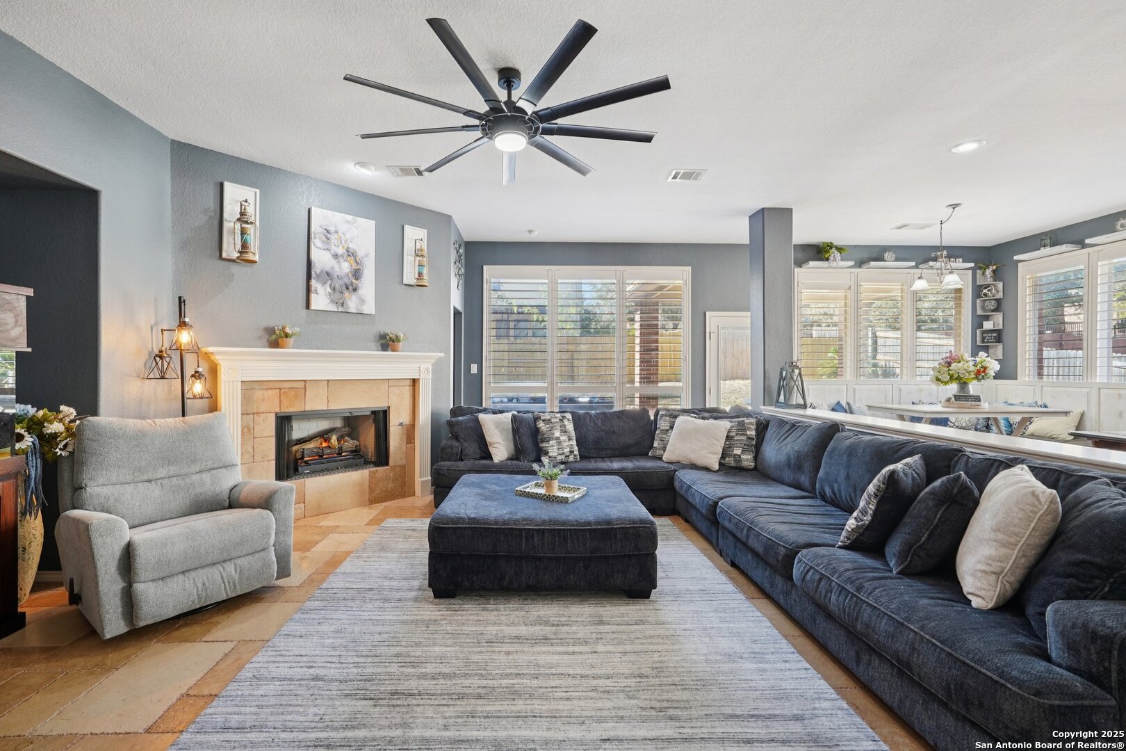 Escape to this serene gated community of The Hills at Sonoma Ranch with amazing neighborhood amenities. You'll love the curb appeal of this gorgeous single-story Highland home with mature trees and 4 sides brick/stone exterior. This open floor plan comes with high ceilings, tons of natural light, luxurious upgrades, and room for everyone. Host all the best gatherings with plenty of indoor/outdoor living space, including an island kitchen with gas cooktop, built-in breakfast table, granite counters, walk-in pantry, and separate dining room with wood flooring. Unwind in your spacious primary suite featuring a spa-like bath with a walk-in shower, jetted tub, dual granite vanities, and a roomy walk-in closet. Cozy up by the fireplace, relax in your soothing hot tub, or enjoy backyard BBQ's and evenings by the firepit. 3 additional bedrooms are split from the primary suite for extra privacy. The 2nd bathroom includes a double vanity with granite and your guests have access to a half bath. Excellent location with easy access to 1604 and I-10, Shops at La Cantera, The Rim, Six Flags, UTSA, two HEB's, Costco, shopping, dining, and entertainment right at your fingertips. This spectacular home is move-in ready and includes the hot tub, water softener, and custom breakfast table with bench.