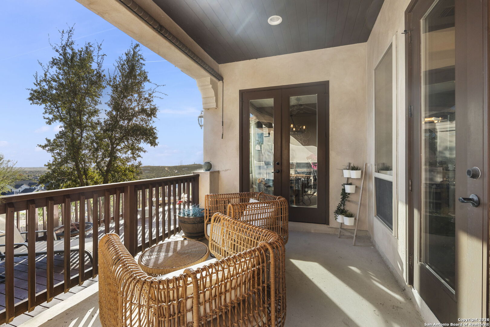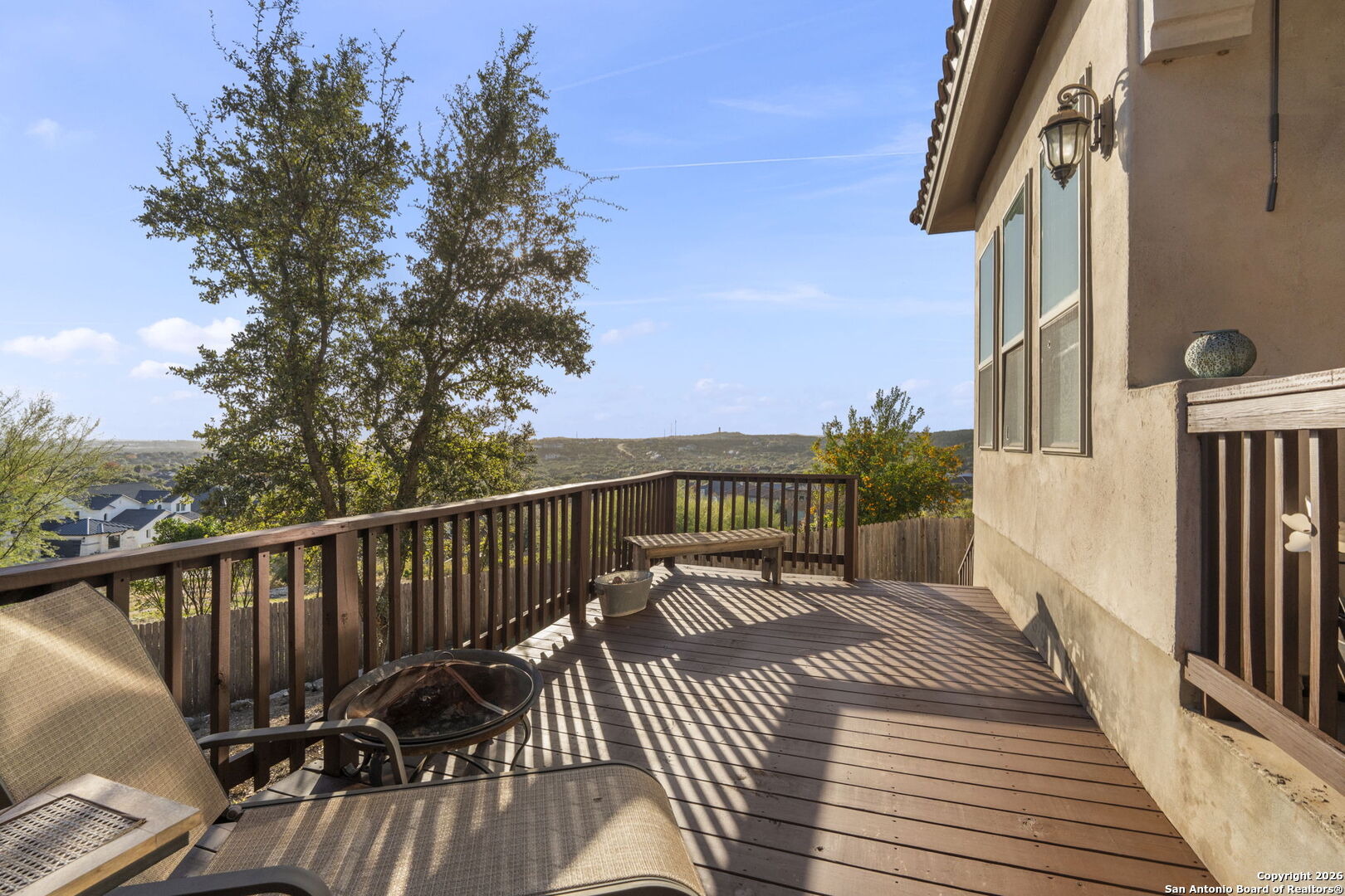 Elegance and Views welcome you home to your Hacienda inspired home. Courtyard entry with a private entrance to the casita attached with a private bedroom, closet and full bathroom perfect for guests or someone needing a little privacy. Step inside and take in the grand spiral staircase. Private study with double doors, wood floors, built in shelving and a window overlooking front courtyard. Entertain and enjoy dinners in your formal dining room. Spacious and cozy Living room accented with wood beams with a fireplace and built in bookshelves on each side with natural light and doors out to your back patio. Decorative iron door to wine storage wall. Kitchen with an abundance of cabinets and counter space, gas cooking, bar stool seating, large pantry with a breakfast nook off to the side. Walk in pantry and desk nook near garage entrance. Beautiful wood doors guide you inside the primary bedroom with wood beam ceiling accent, wood floors, ceiling fan, private entry and plenty of space for larger furniture and a door off primary to back patio. Soak in your garden tub, private walk in shower behind the tub with double vanities and a walk in closet. Take in the beauty of the staircase to the 2nd floor where you have a perfect spot for art or statement piece. Game room upstairs with some of the most beautiful views of the city off the balcony. Watch the city's fireworks from your balcony. Additional living space area off the game room with a full wet bar and storage closet. 2 additional bedrooms upstairs with their own private bathrooms, walk in closets and no carpet in this home! Step outside onto your covered patio with an outdoor kitchen and area for furniture and the freshly painted deck that offers plenty of room to enjoy the views from your yard or simply relax or entertain. House sits on .27 acres.Gated community and minutes to La Cantera, UTSA,USAA and medical.