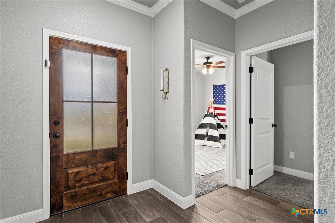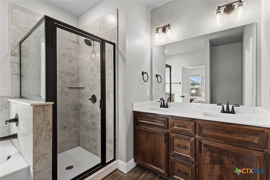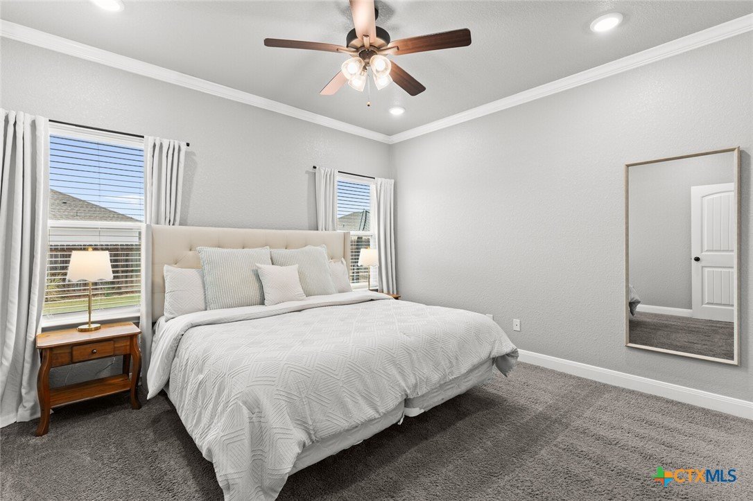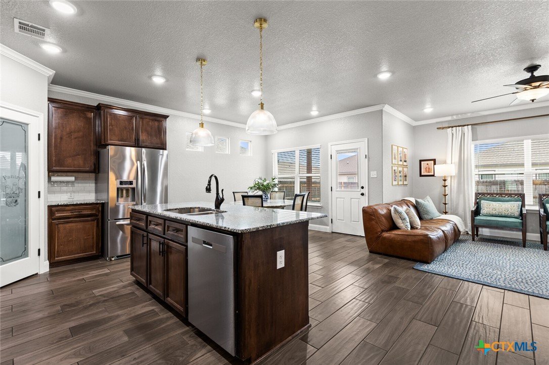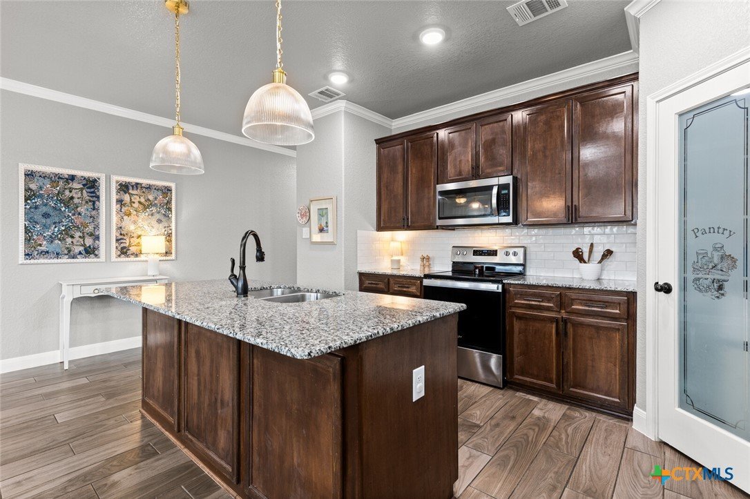 THIS POPULAR JERRY WRIGHT HOMES FLOOR PLAN IN PRAIRIE RIDGE IS A CRAFTSMAN-INSPIRED BEAUTY OFFERING STANDOUT CURB APPEAL WITH ITS IMMACULATE LANDSCAPING & A STRIKING BRICK & STONE EXTERIOR! Once inside & past the attractive solid wood front door, a welcoming entry opens to a desirable split-bedroom layout—perfect for a private office, study, gaming room, or guest bedroom tucked away from the main living areas. Crown molding throughout the main living areas adds an elevated touch, and durable ceramic tile runs through the home with cozy carpet in the bedrooms only. The open, island kitchen is a showstopper with rich dark wood cabinetry, granite countertops, subway tile backsplash, stainless steel appliances, and stylish pendant lighting over the island workspace—plus a spacious corner pantry. The dining area offers easy access to the backyard for seamless indoor/outdoor entertaining. The owner’s suite is a true retreat featuring a deep cultured marble garden tub, separate ceramic tile shower, and a luxury-height double vanity. Unwind on the covered back patio overlooking a north-facing backyard complete with privacy fencing and sprinkler system. Conveniently located within walking distance to Temple ISD’s Fine Arts Academy at Sampson-Howard Elementary—don’t miss this one! Ideal possession is end of May - June time frame.