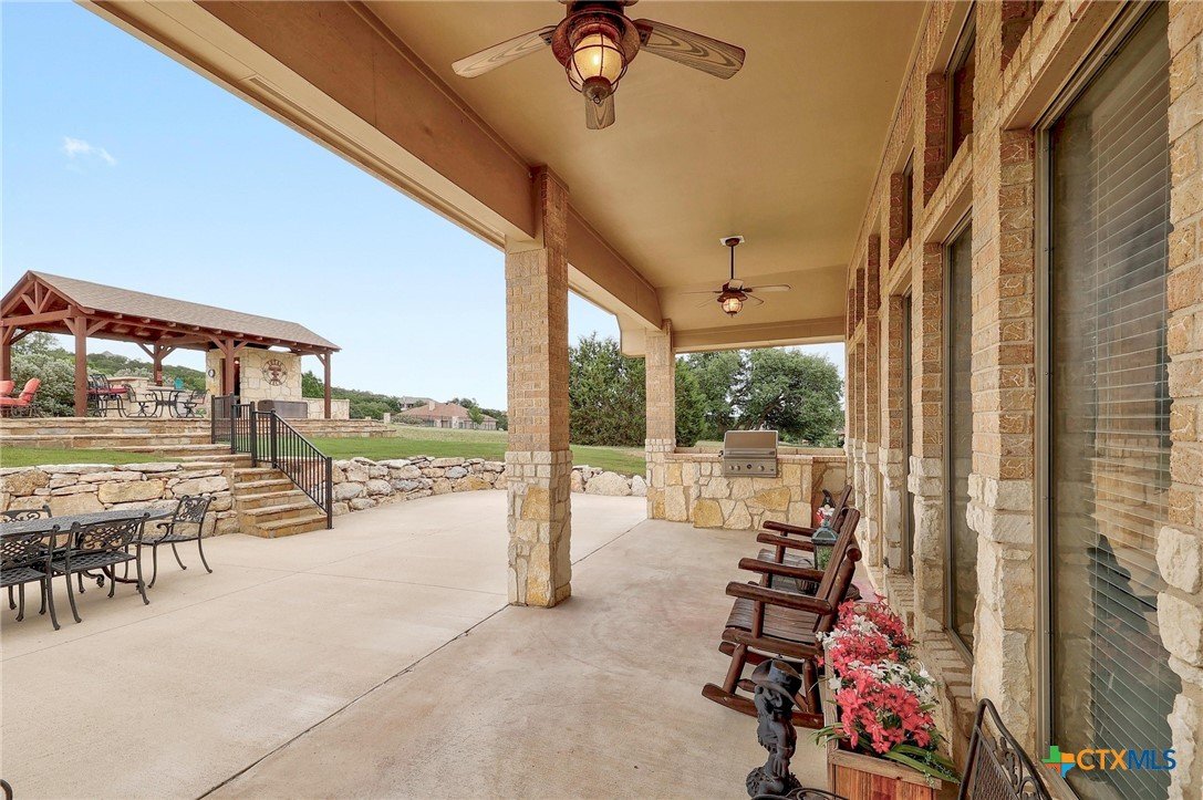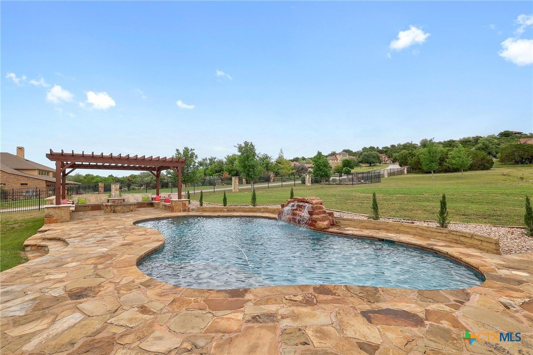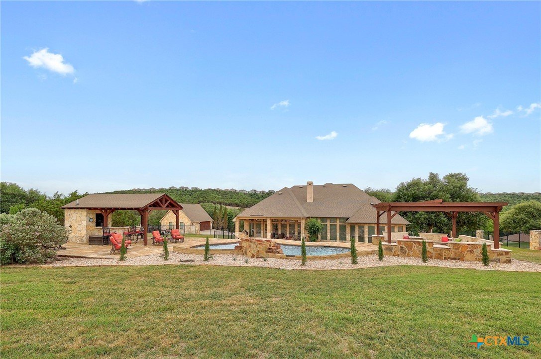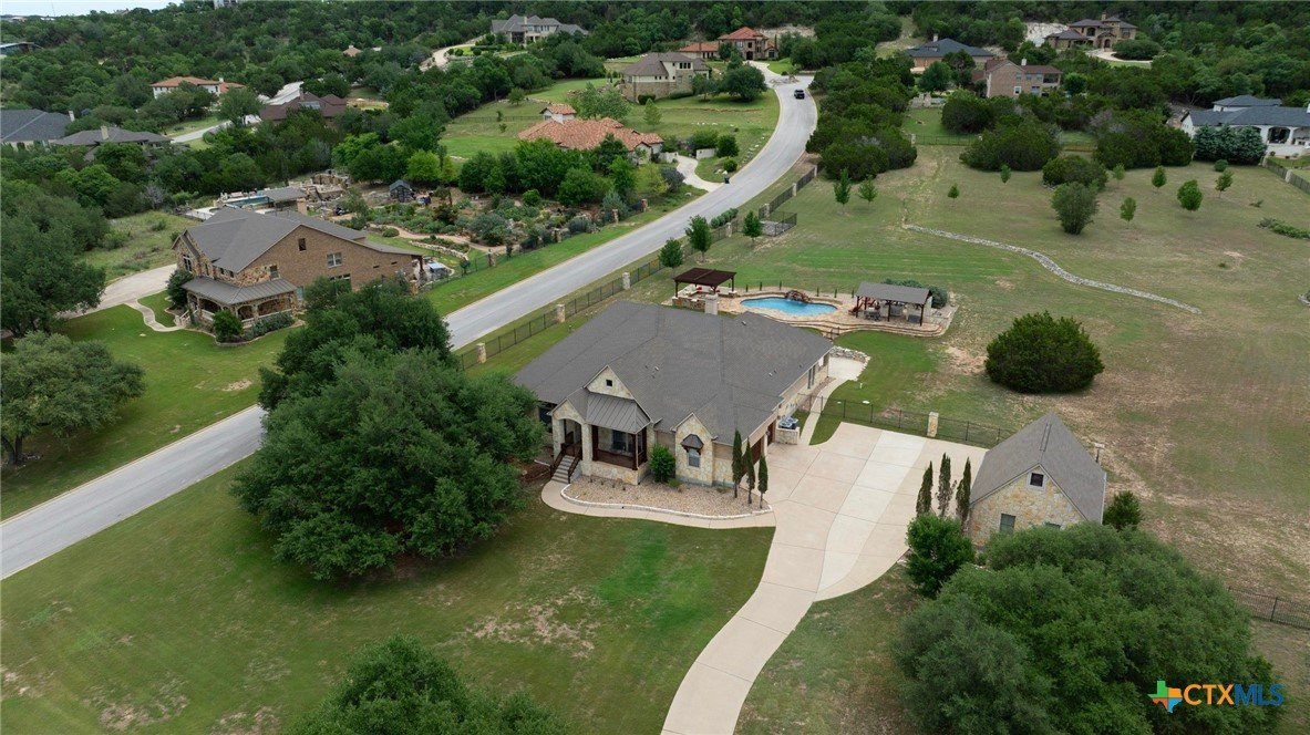 This breathtaking and spacious residence is ideally located on 4.42 beautiful acres within a beautiful Hill Country gated community. Step into the grand foyer, where towering ceilings create an inviting atmosphere that makes you feel right at home. You'll be welcomed by a spacious office adorned with French doors, while the foyer guides you toward the breathtaking formal dining room featuring elegant wood floors. The first living area awaits, offering versatility as a formal living area or game room. As you round the corner, you'll be welcomed by a spacious great room featuring 12-foot ceilings, a stunning gas fireplace, and an abundance of natural light streaming in from the floor-to-ceiling wall of windows. The spacious great room and kitchen blend seamlessly, creating an ideal environment for entertaining or maintaining connections while cooking. The primary suite boasts over 800 square feet of space, offering stunning views of the backyard. Additionally, there is a guest suite complete with its own private ensuite. Experience the outdoor paradise featuring a covered rear patio equipped with a built-in gas grill, a stunning pool adorned with a fountain, and a cabana that includes a wet bar, bath, and outdoor shower. Enjoy the spacious entertainment area under a large pergola, complete with stone benches and a gas firepit. The entire back of the property is secured by a 6' wrought iron fence, enhanced by custom white stone pillars that beautifully complement the home’s design. The property boasts stunning landscaping, adorned with numerous oak trees and 18 maple trees that burst into vibrant colors each Fall. Furthermore, there is an additional two-car garage equipped with a storage loft, perfect for stowing away your off-season belongings. For equestrian enthusiasts, the Homeowners Association (HOA) permits property owners to keep a horse on the estate, thanks to the ample size of the property. New roof, gutters and vents replace November 20025